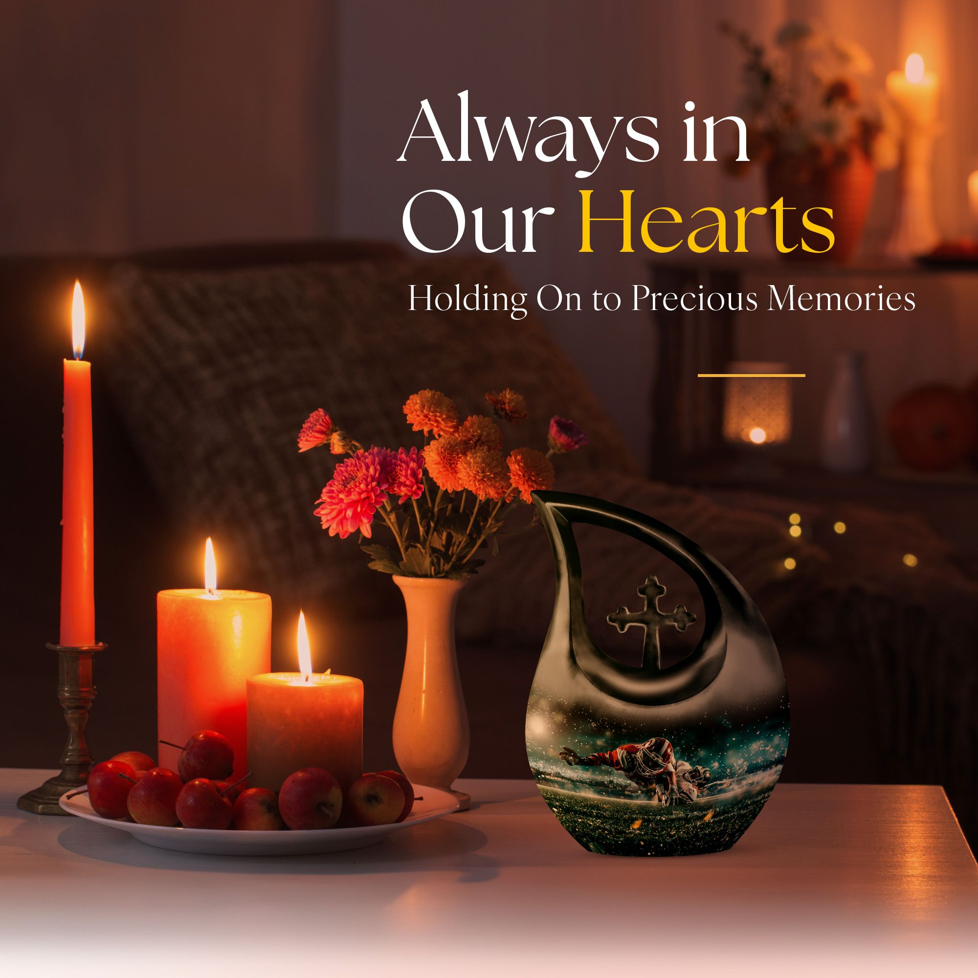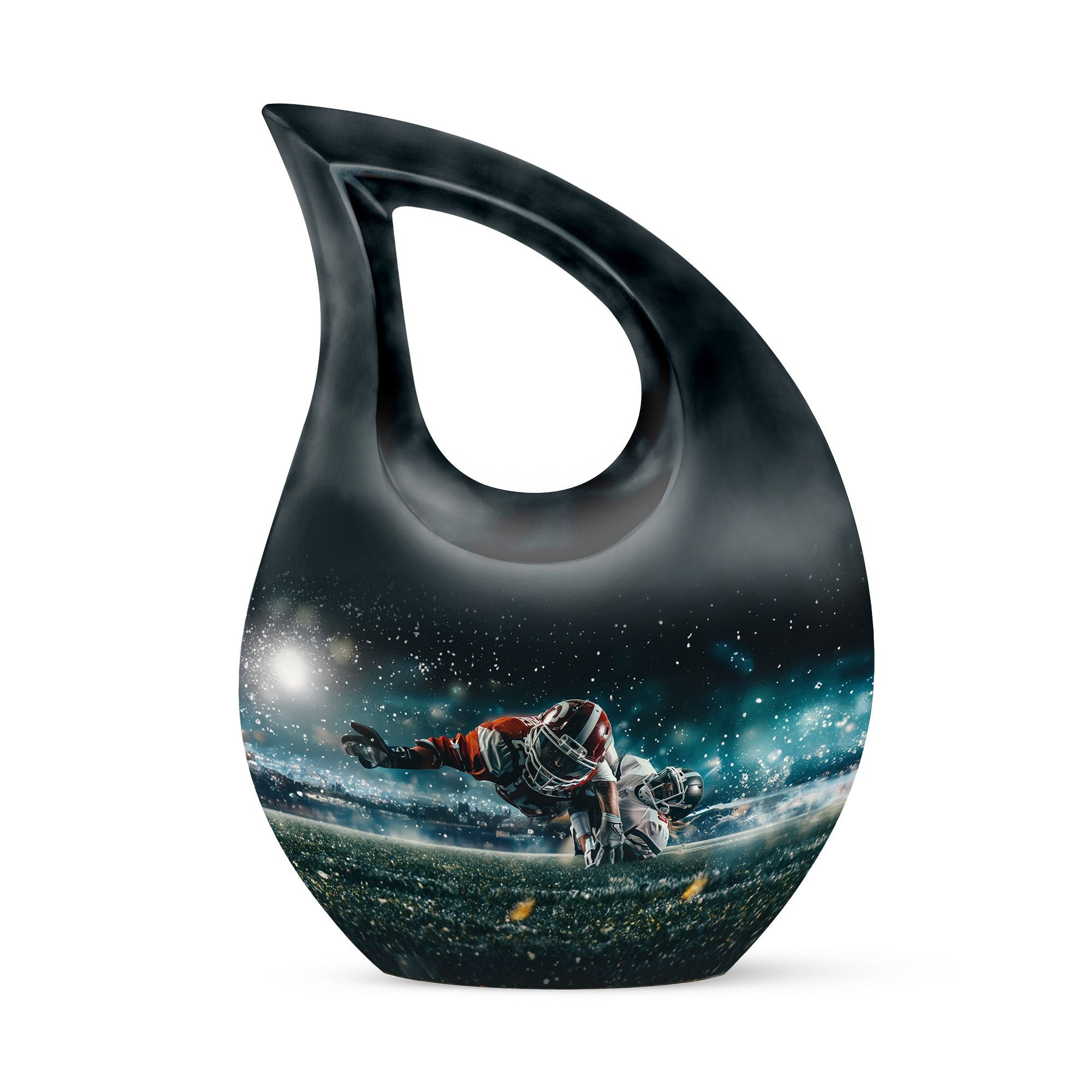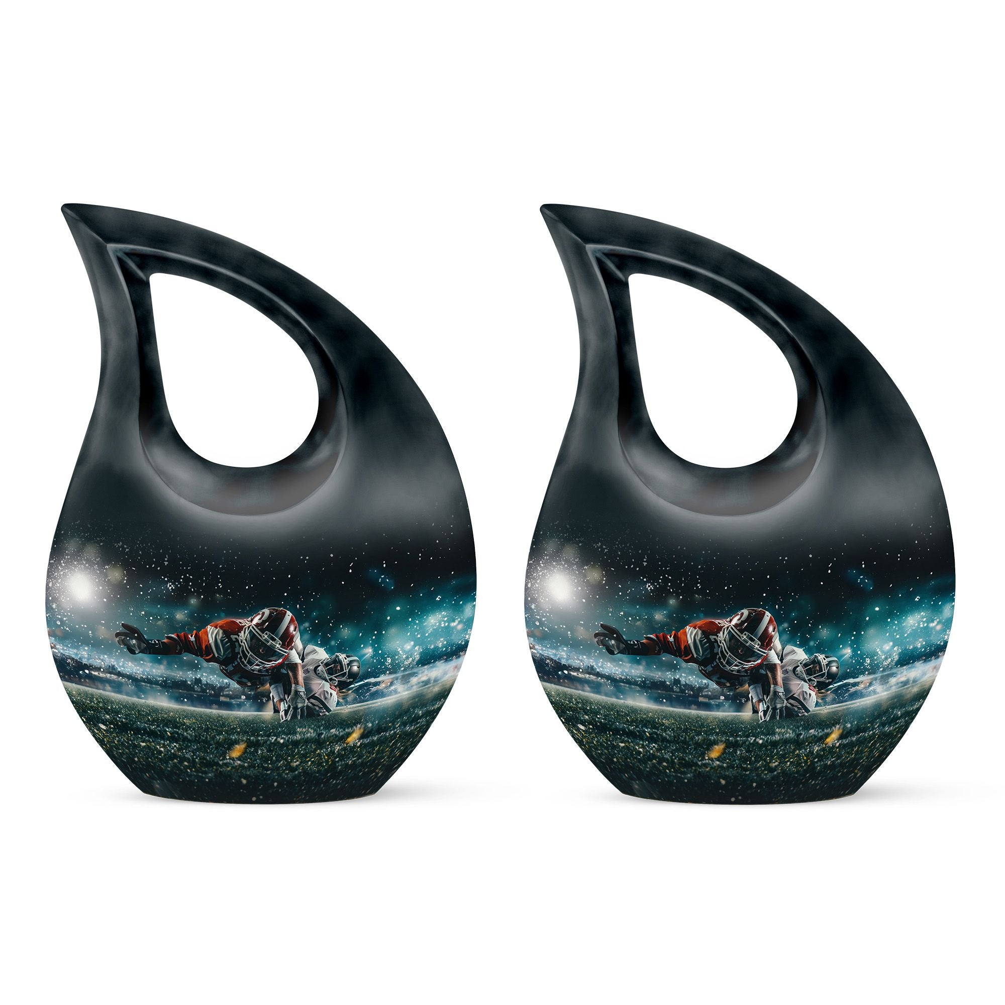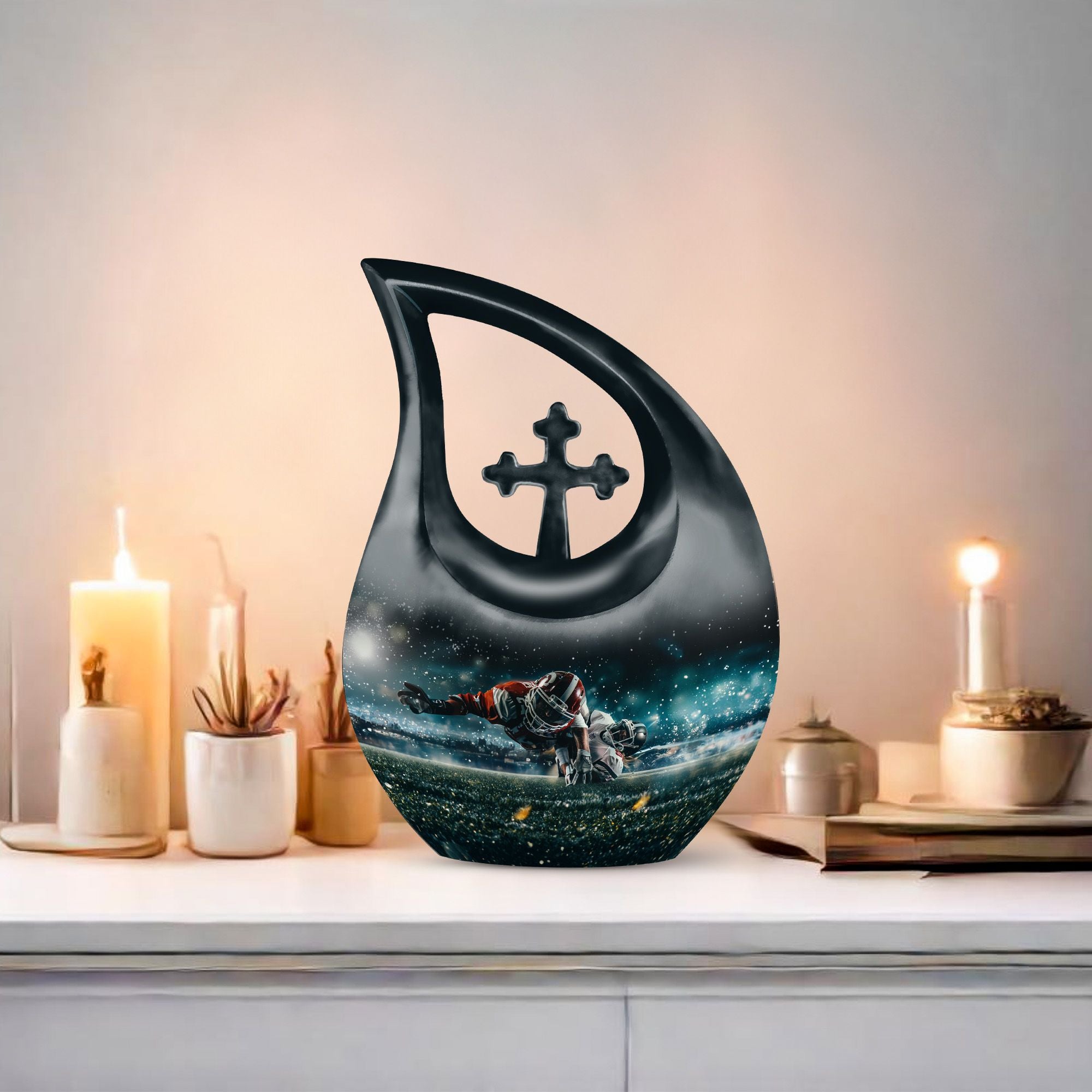 Evoke the sweet memories of your loved ones with our 10-inch Custom Mom Urn. Crafted with eloquence and authenticity, its aluminium build ensures durability and longevity, offering a permanent tribute to the one who means the world to you. It's a Footboll themed urn, featuring an ethereal Cross Drop URN design, speaking volumes of elegance and style in one sweeping glance. The urn weighs a sturdy 3.3 pounds, and stands at an impressive 10 inches in height. It boasts a capacity of 200 cubic inches, adequate to hold the ashes securely. As an added touch of respect, we provide a velvet pouch for the containment of ashes. There is also an option to personalize your tribute with engraved names, making this urn an essential pick for Memorial Ceremony Supplies. The keywords - Footboll Urn, Custom Mom Urn, Remembrance Urns For Ashes, Urns For Angels, Modern Urns For Ashes highlight its uniqueness and purpose, ensuring easy accessibility in your search.