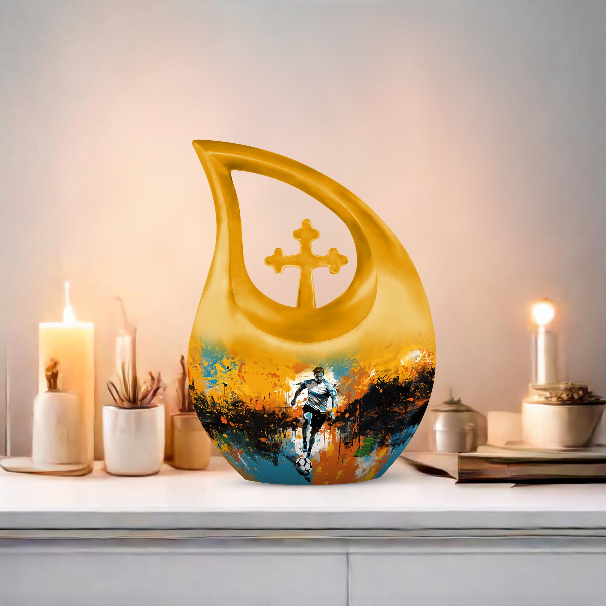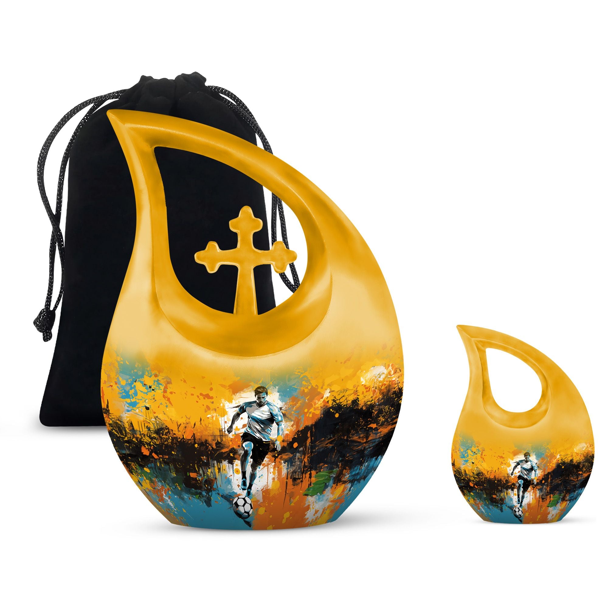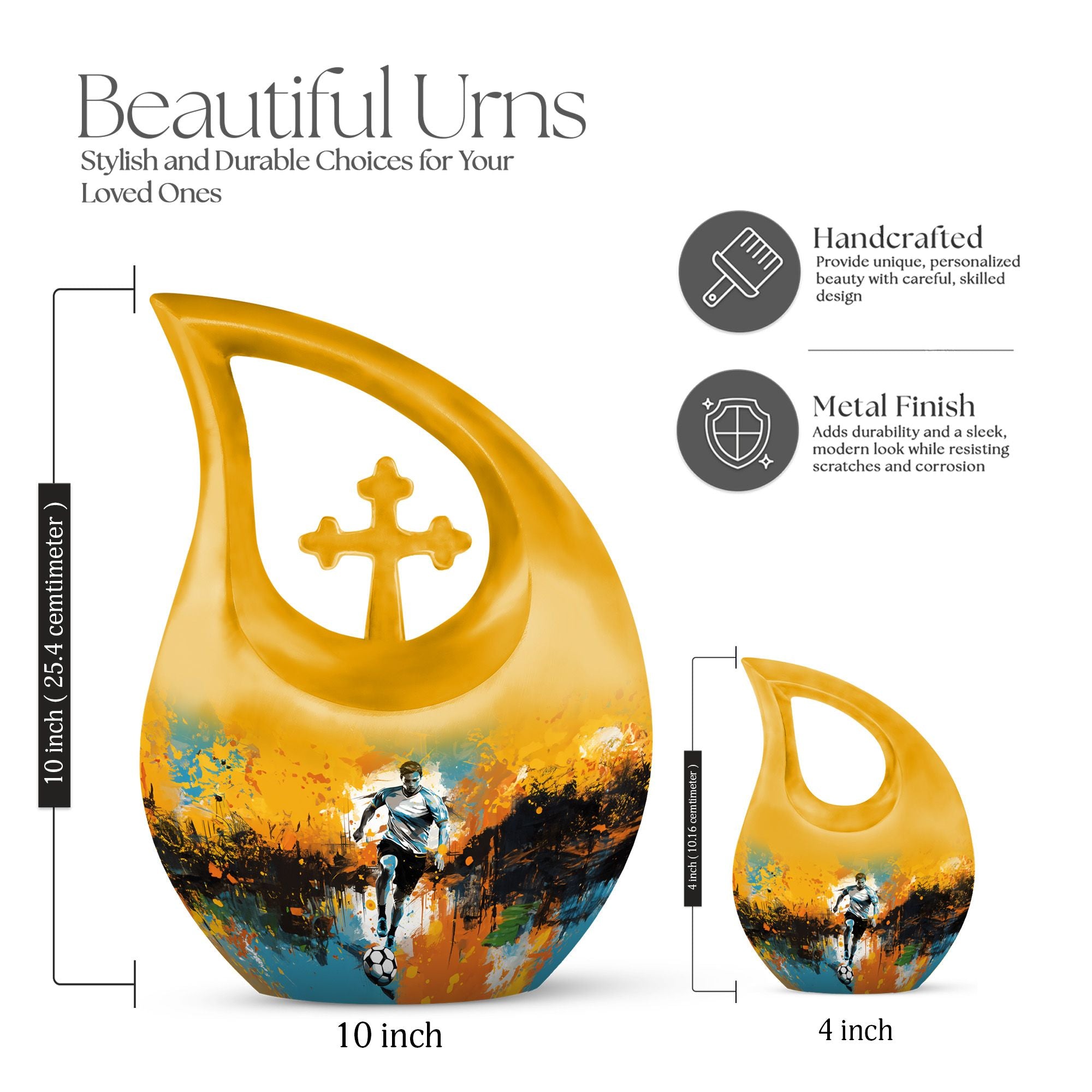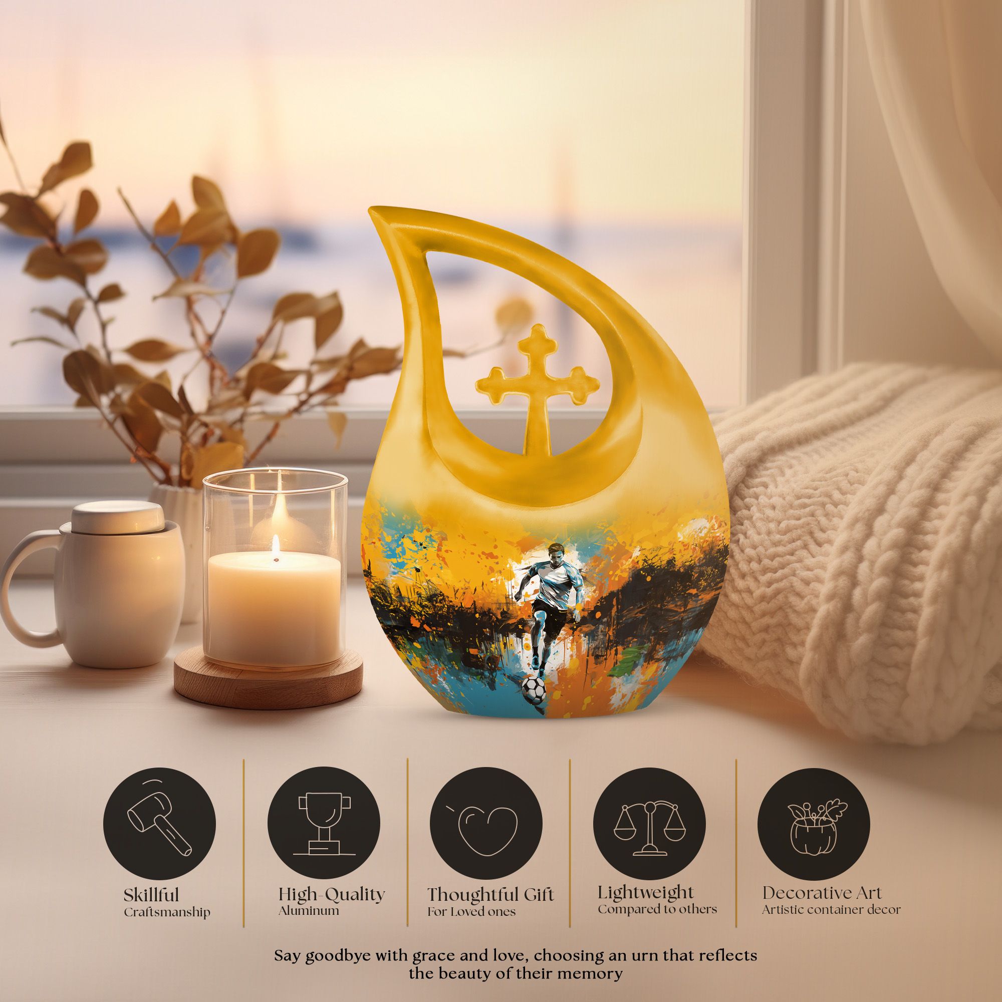 Features:• Material: Aluminium• Dimensions: Height 10 inches• Capacity: 200 cubic inches• Lid: Secure screw-top lid• Design: Football/Soccer-themed memorial artwork• Use: Adult Male Cremation