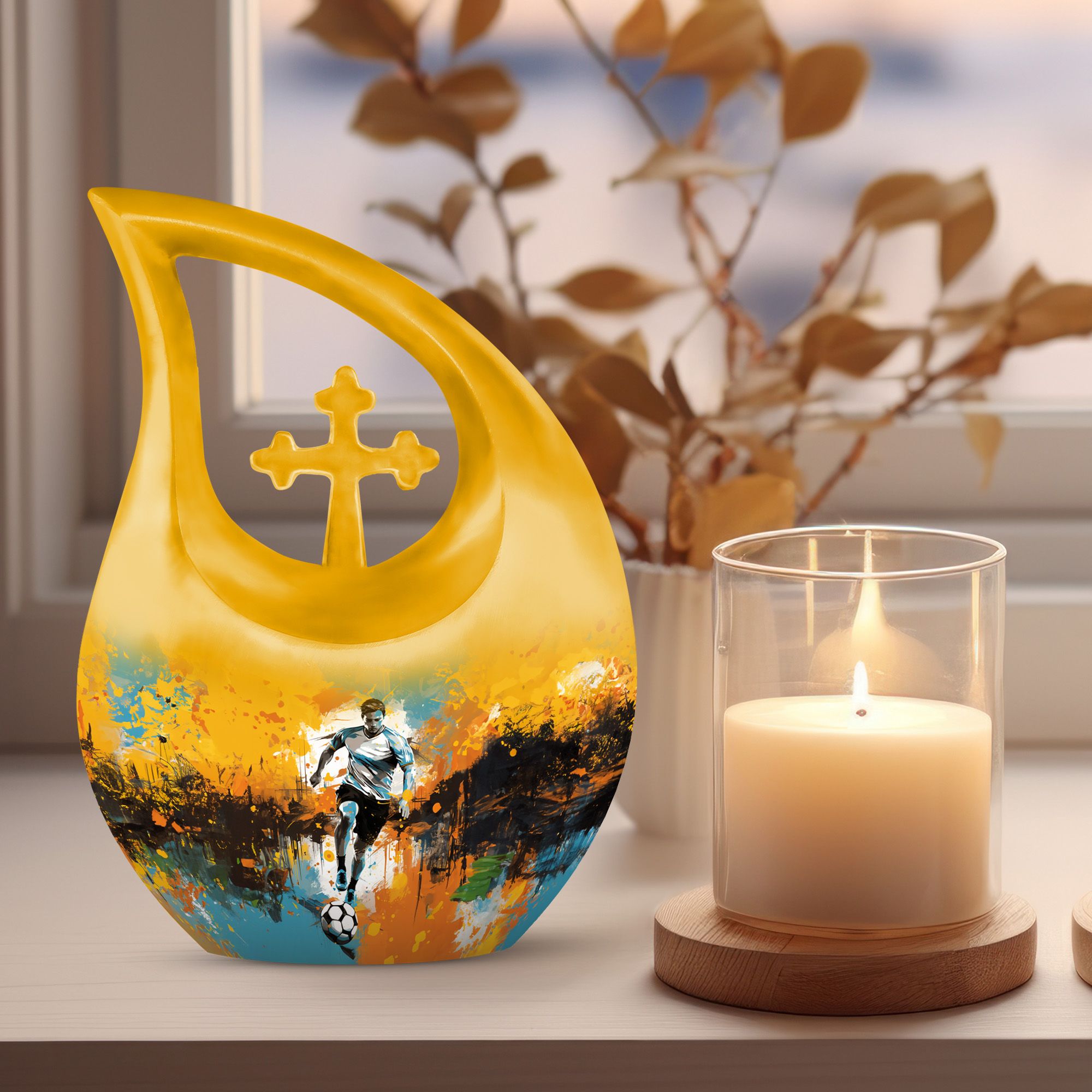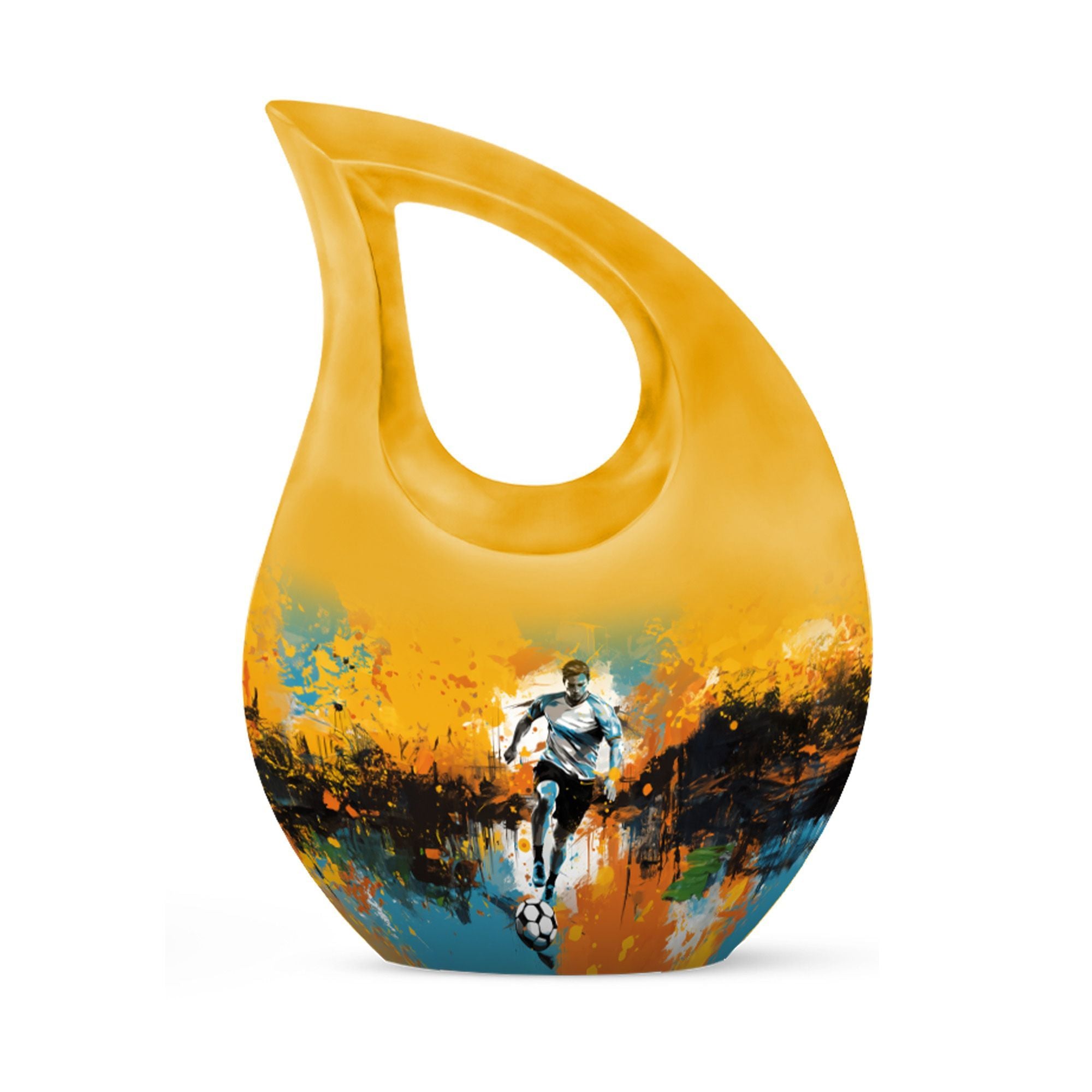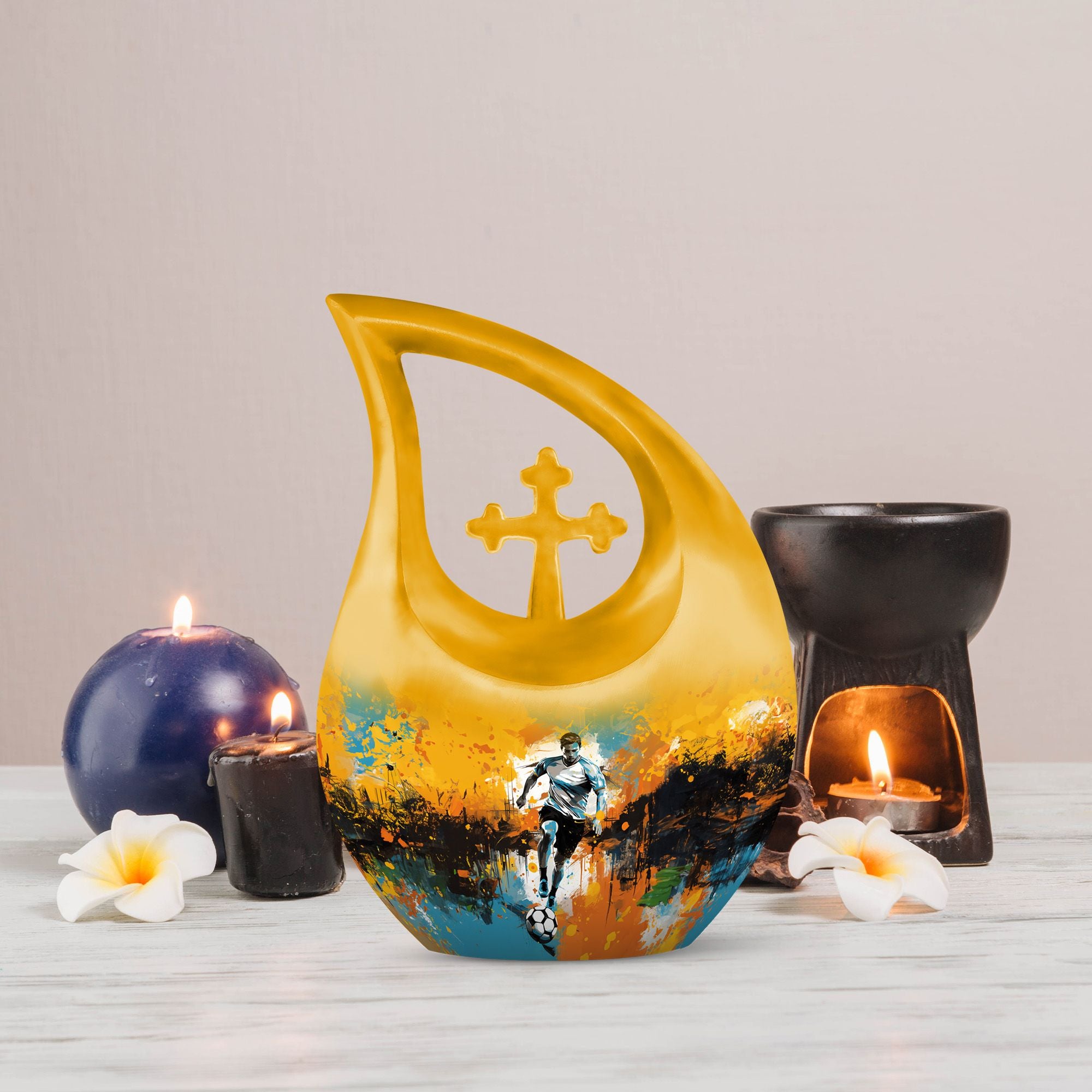 Features:• Material: Aluminium• Dimensions: Height 10 inches• Capacity: 200 cubic inches• Lid: Secure screw-top lid• Design: Football/Soccer-themed memorial artwork• Use: Adult Male Cremation