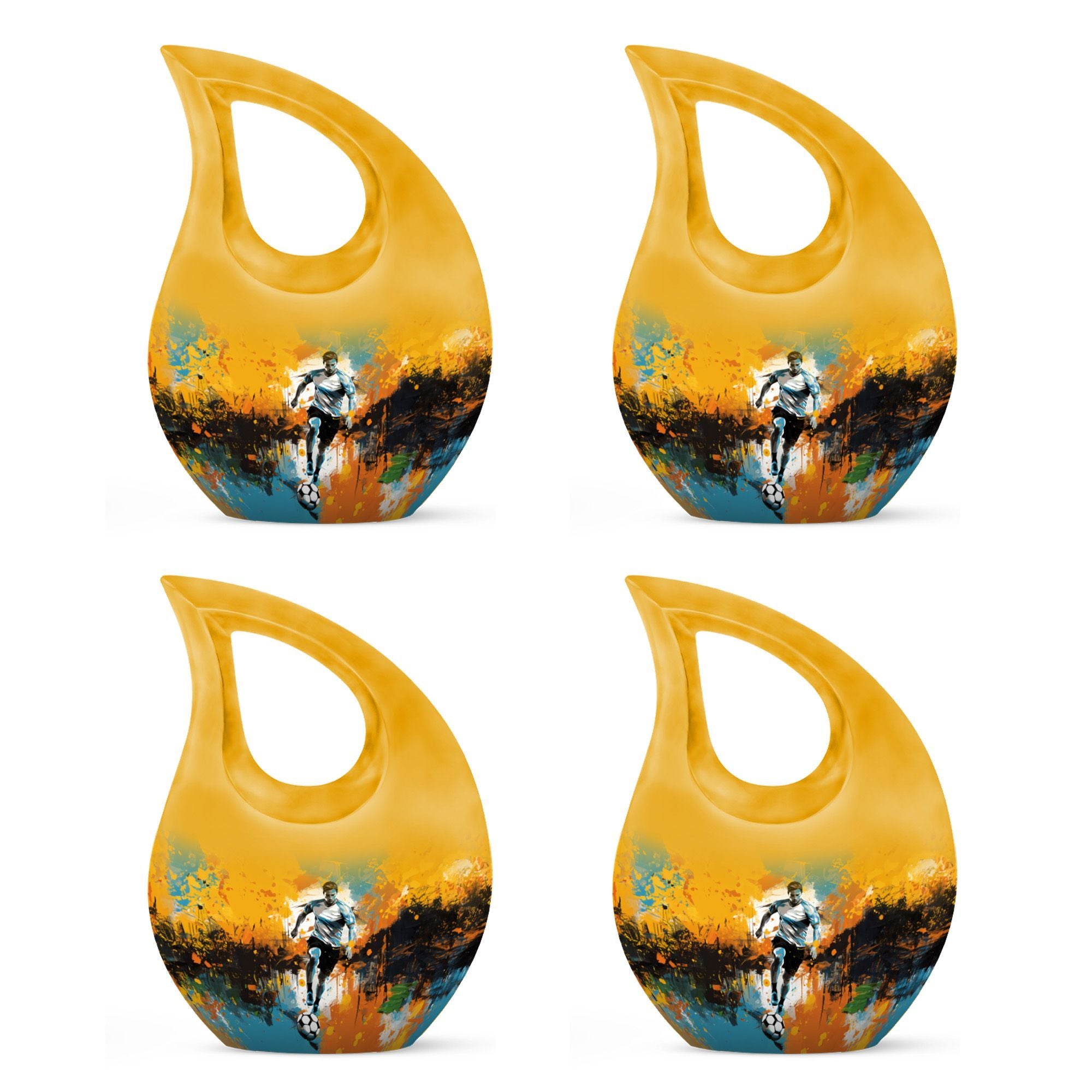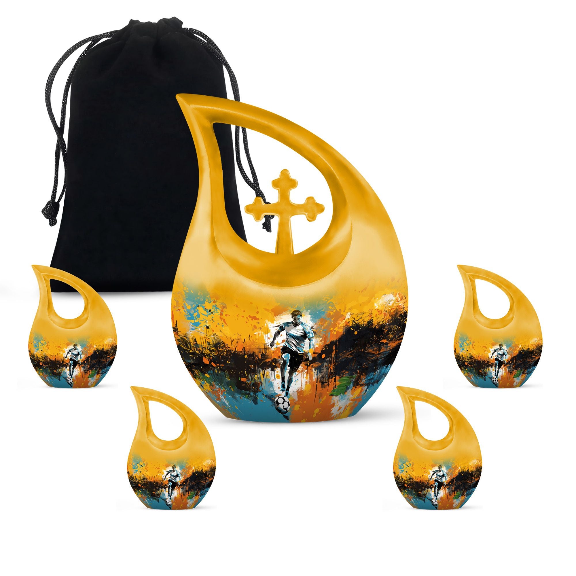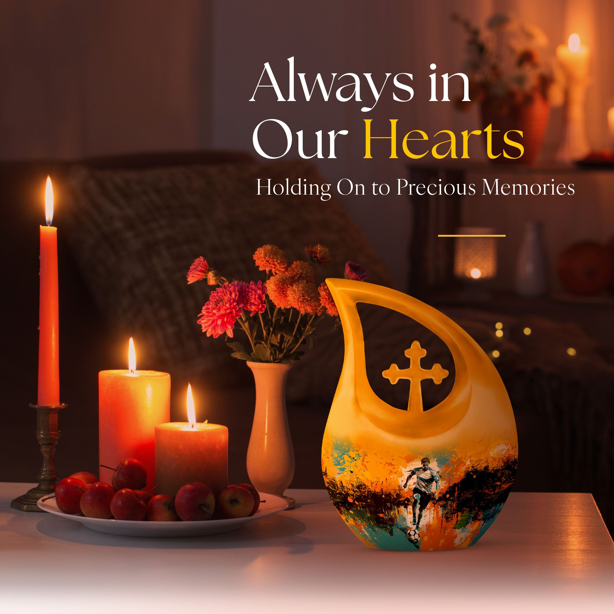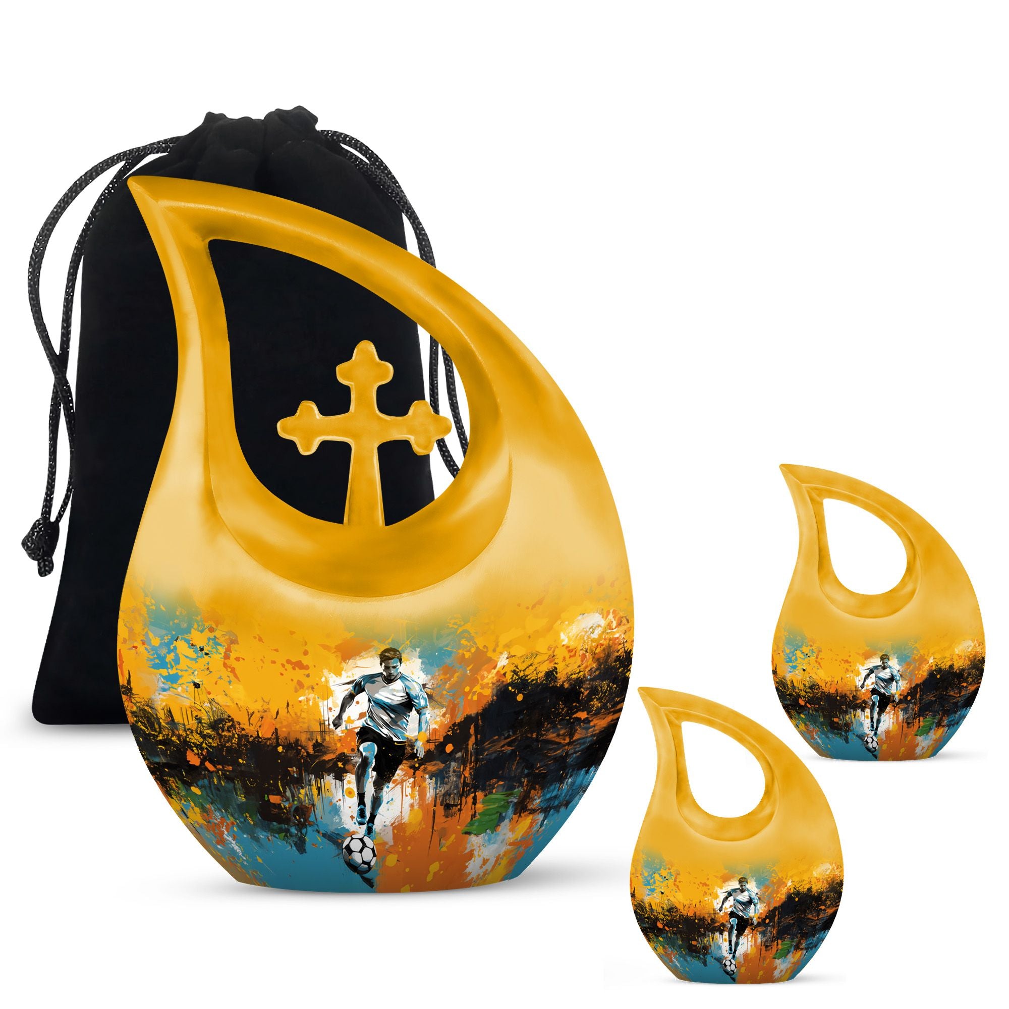 Features:• Material: Aluminium• Dimensions: Height 10 inches• Capacity: 200 cubic inches• Lid: Secure screw-top lid• Design: Football/Soccer-themed memorial artwork• Use: Adult Male Cremation