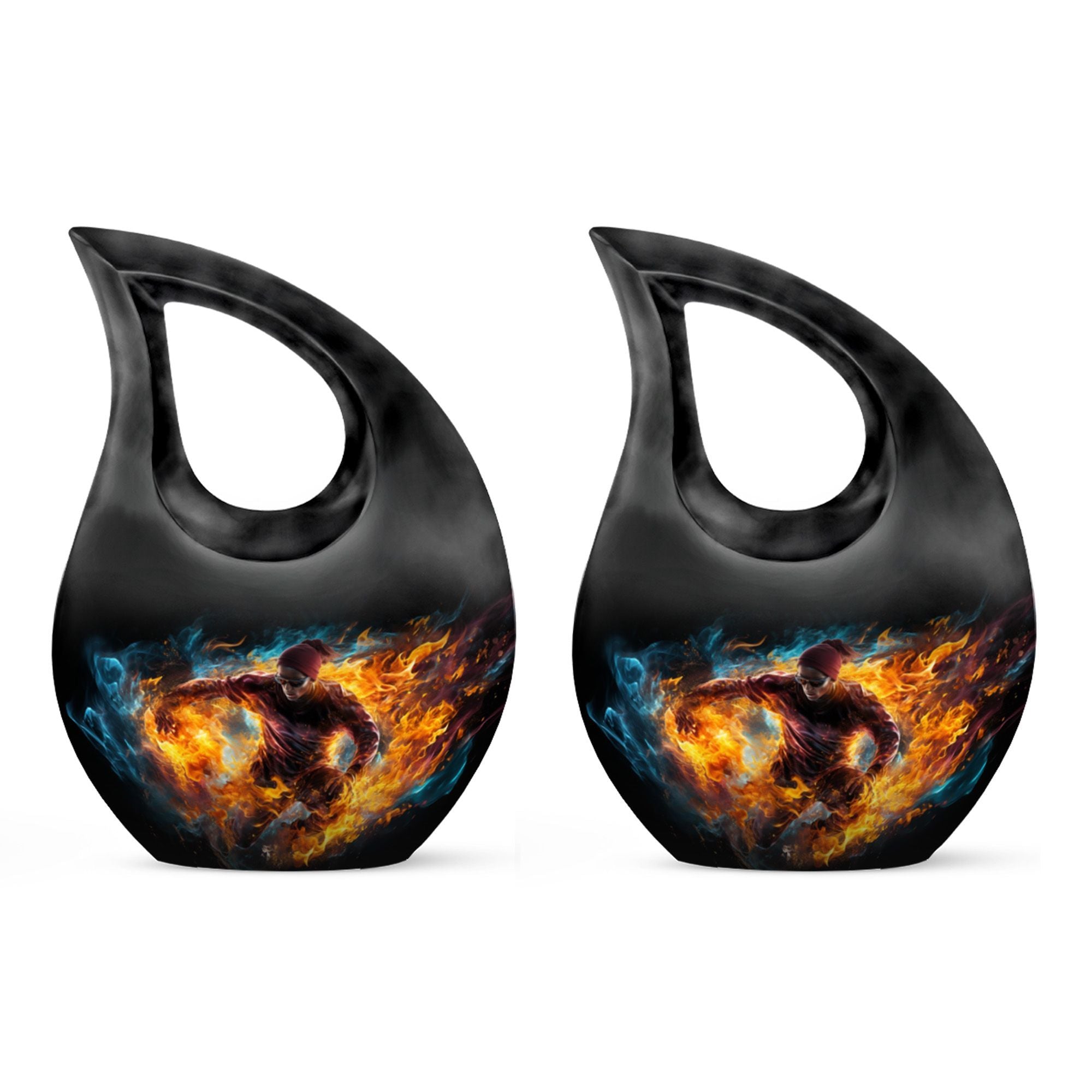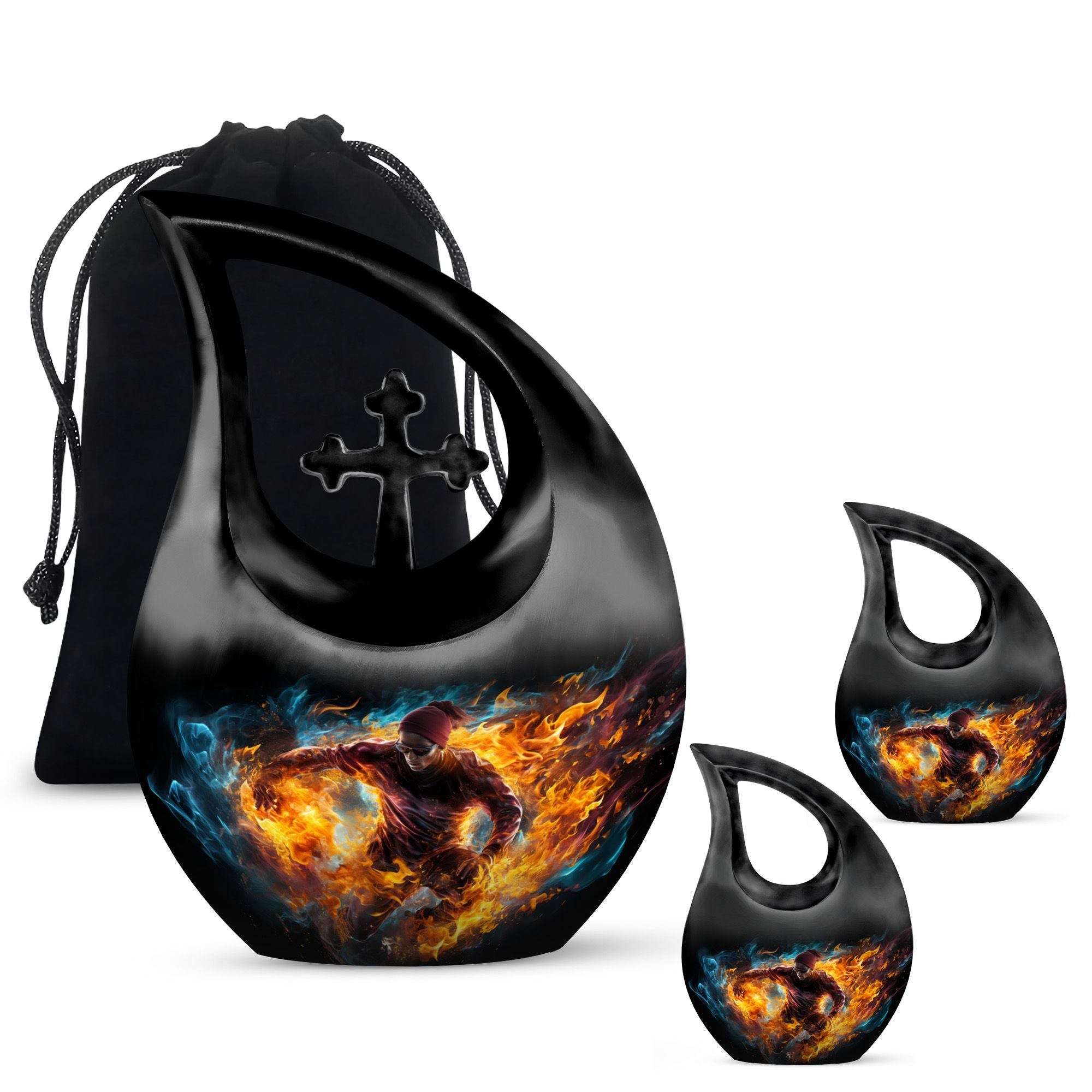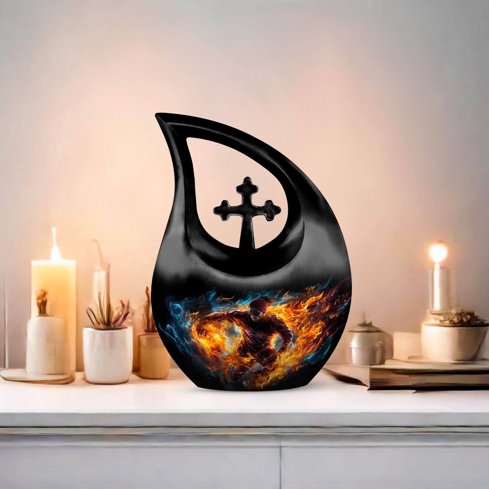 Honor the memory of your departed loved one with our Football Urn, an elegant and tasteful choice within the realm of memorial urns. Lovingly crafted from durable aluminium, this urn features a striking 'Cross Drop' theme, inspired by the shared passion and love for football. At 10 inches in height and with a capacity of 200 cubic inches, this large urn is perfect for holding the remains of someone cherished. It is lightweight yet sturdy, weighing in at just 3.3 pounds. We also offer personalization by engraving names on the urn, making it a truly unique and personal memorial piece. As part of our package contents, the urn comes encased in a delicate velvet pouch, ensuring the safe containment of ashes. Explore choices beyond regular Pet Urns or Personalized Urns, switch to our Nice Urns for Ashes; this urn combines function and fashion, bringing a unique twist to memorial ceremony supplies. Keywords: Beautiful Cremation urns, Personalized urns for human ashes.