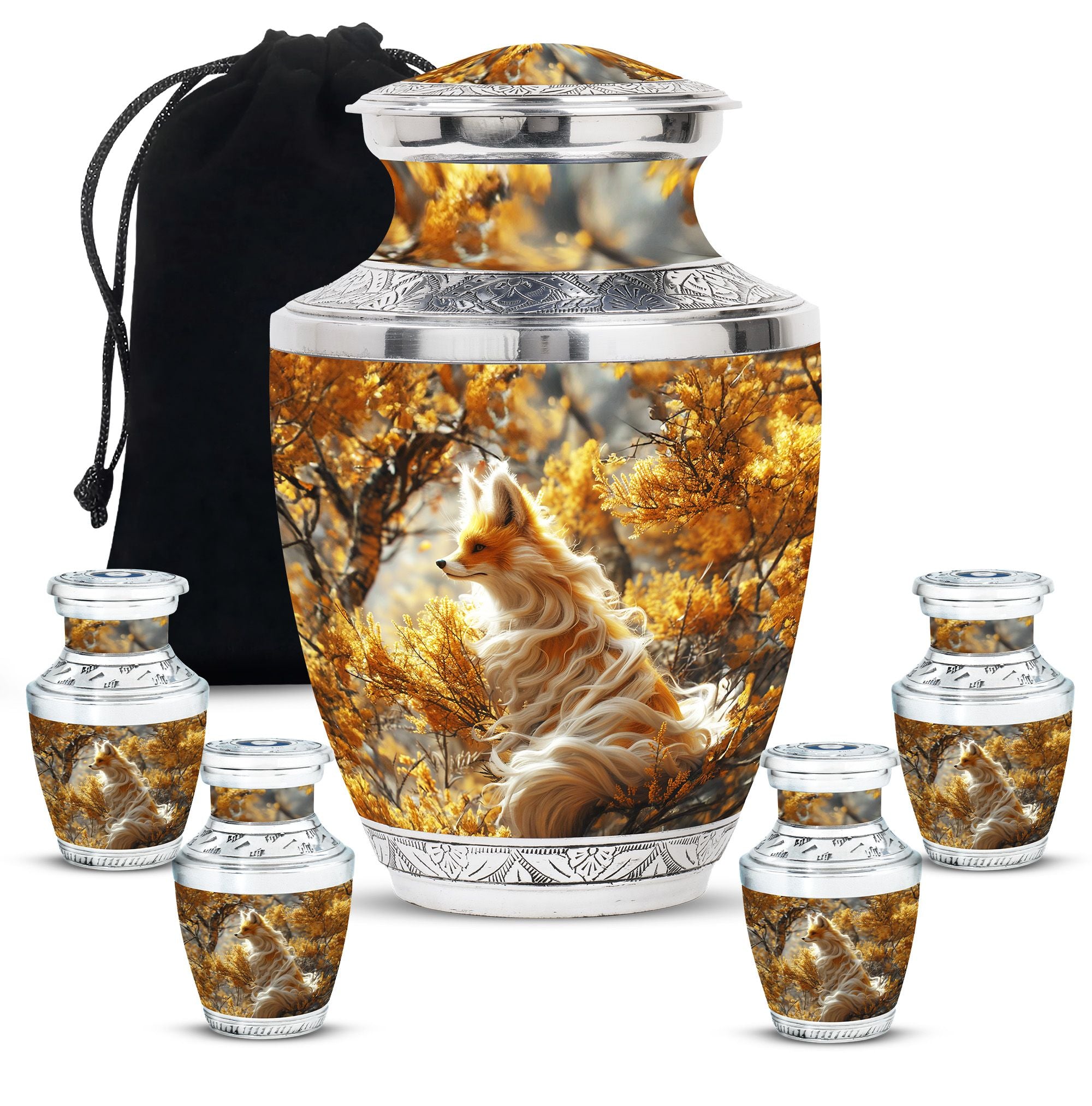 Expertly crafted from durable aluminum, the set features one full-size urn and several small keepsake urns for sharing among family. The detailed fox motif symbolizes wisdom, protection, and guidance, making this set more than just a vessel—it’s a symbol of eternal remembrance. The large cremation urn holds up to 200 cubic inches, making it suitable as a large human ashes urn or urn for ashes adult male large, while the matching keepsake urns allow loved ones to hold a small portion of remains close. Each piece is finished with a secure screw-top lid, ensuring safety and peace of mind.