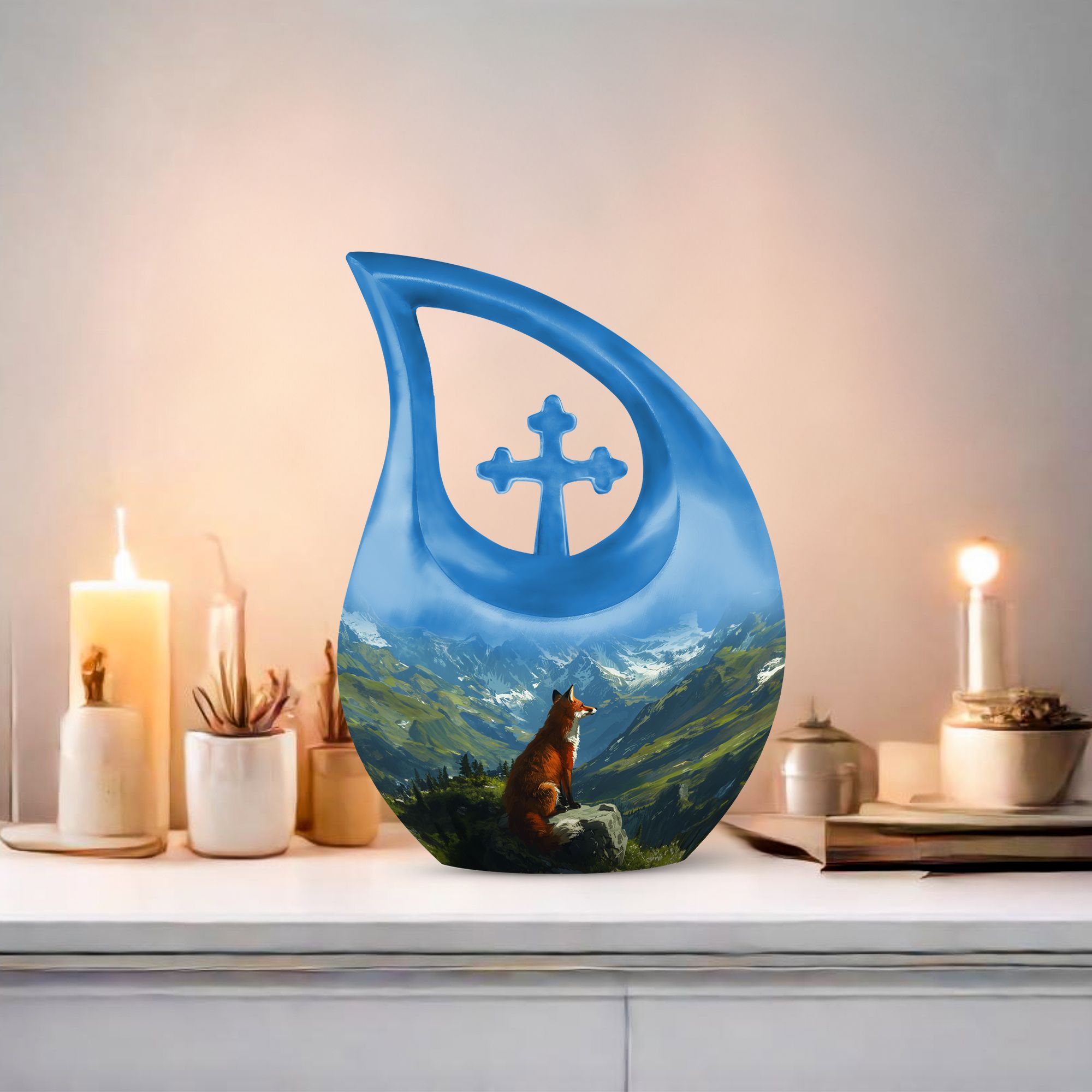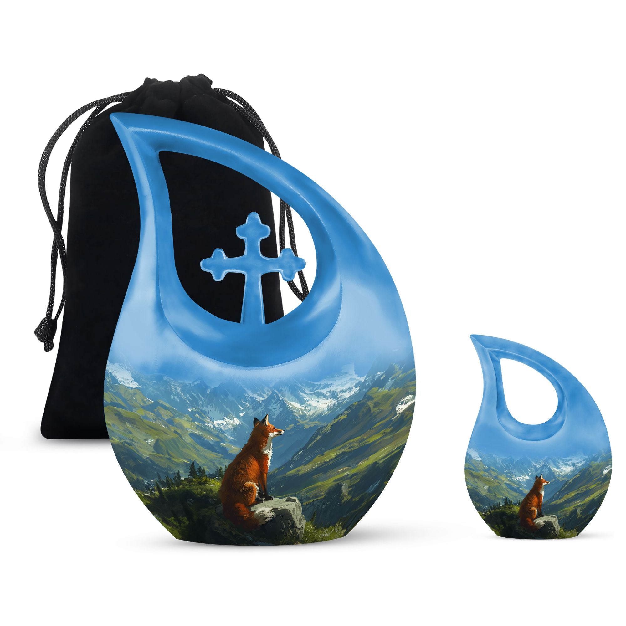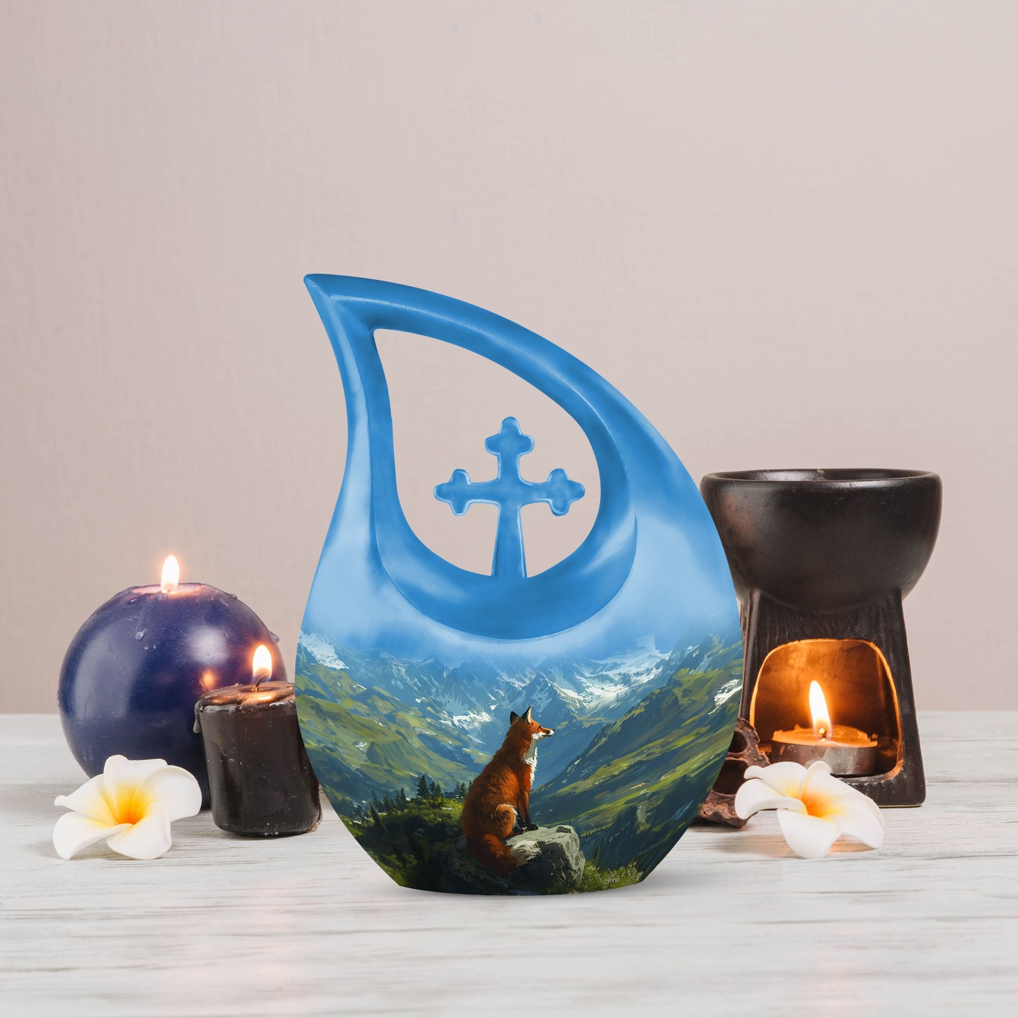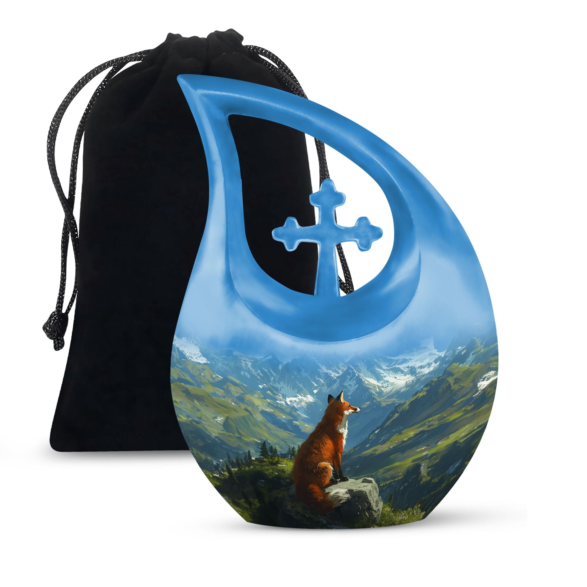 Elevate your tribute to your departed loved ones with this 10-inch Fox Urn. This large cremation urn, meticulously crafted from high-grade Aluminium, stands at an expressive height of 10 inches and can hold up to 200 cubic inches of remains, ideal for human ashes. Appealing to the eye and touch, the Fox themed urn sports a compelling Cross Drop pattern, a design metaphor for eternal love and timeless memories. With its accompanying velvet pouch, it securely guards your loved one's ashes, ensuring they continue to be a part of your life. What's more, this urn offers the option of personalization with engraved names, giving it a unique, thoughtfully-tailored touch. Weighing a substantial 3.3 pounds, this urn is durable and designed to last. Ideal for memorial ceremonies, this product is an affordable choice among burial urns. So take solace in this beautiful, lasting vessel, uniquely designed for your journey of remembrance.