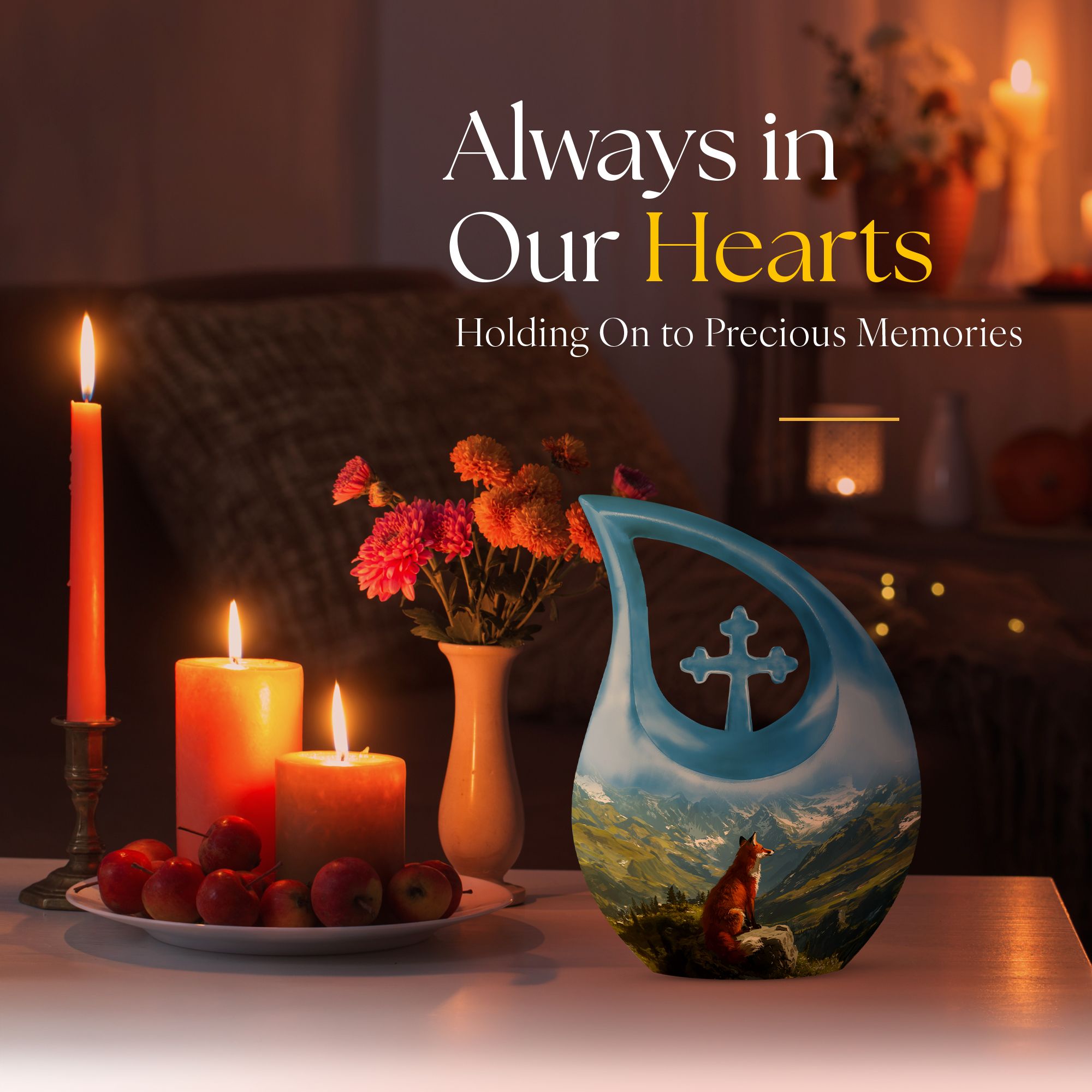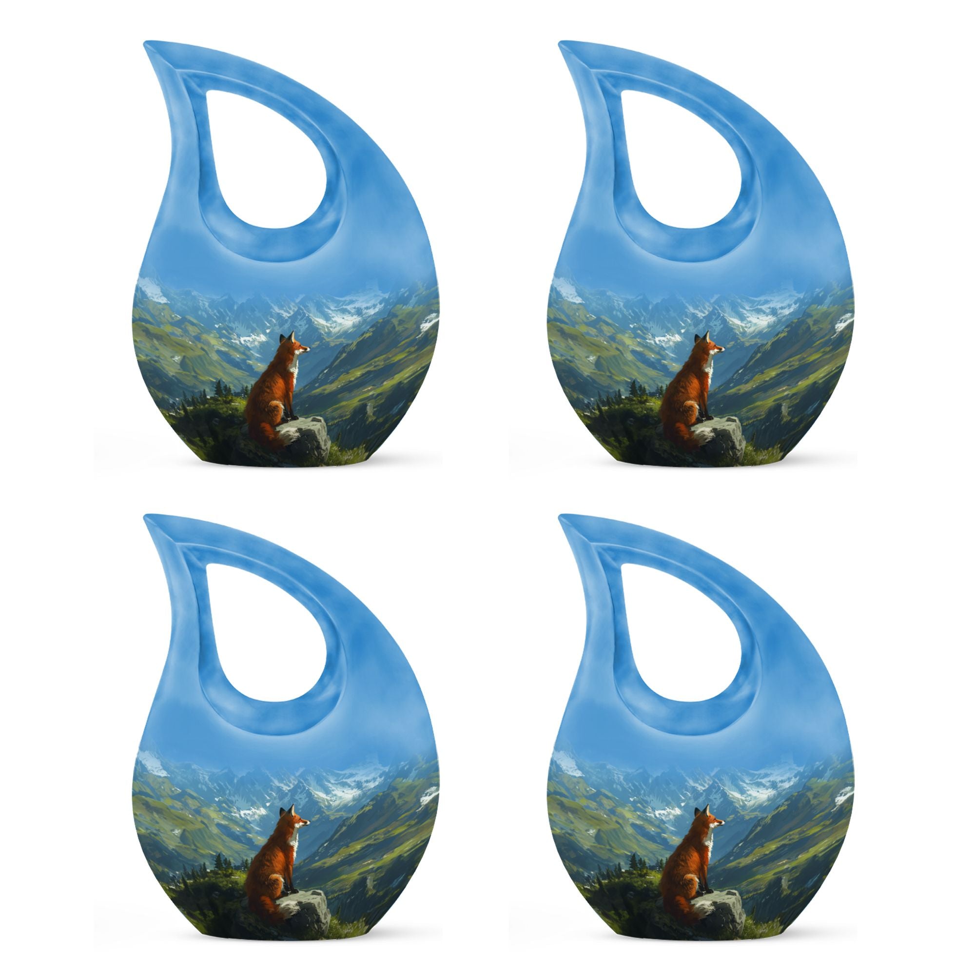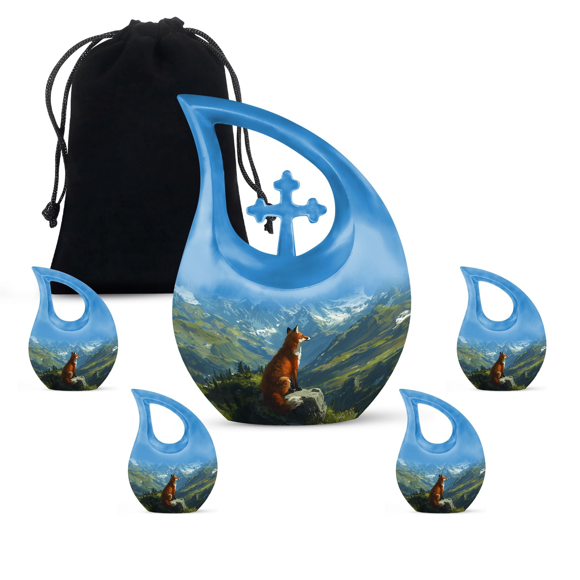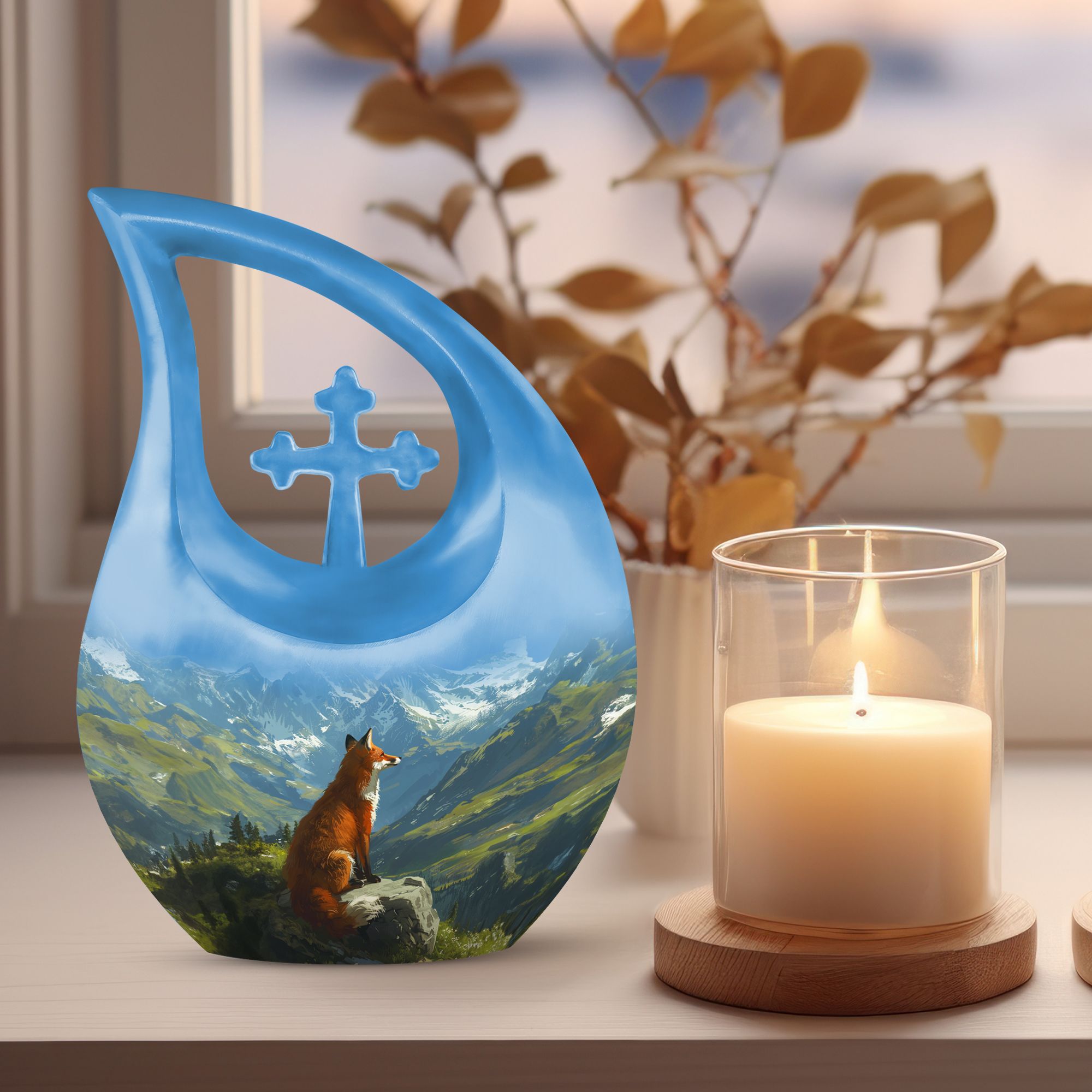 Elevate your tribute to your departed loved ones with this 10-inch Fox Urn. This large cremation urn, meticulously crafted from high-grade Aluminium, stands at an expressive height of 10 inches and can hold up to 200 cubic inches of remains, ideal for human ashes. Appealing to the eye and touch, the Fox themed urn sports a compelling Cross Drop pattern, a design metaphor for eternal love and timeless memories. With its accompanying velvet pouch, it securely guards your loved one's ashes, ensuring they continue to be a part of your life. What's more, this urn offers the option of personalization with engraved names, giving it a unique, thoughtfully-tailored touch. Weighing a substantial 3.3 pounds, this urn is durable and designed to last. Ideal for memorial ceremonies, this product is an affordable choice among burial urns. So take solace in this beautiful, lasting vessel, uniquely designed for your journey of remembrance.