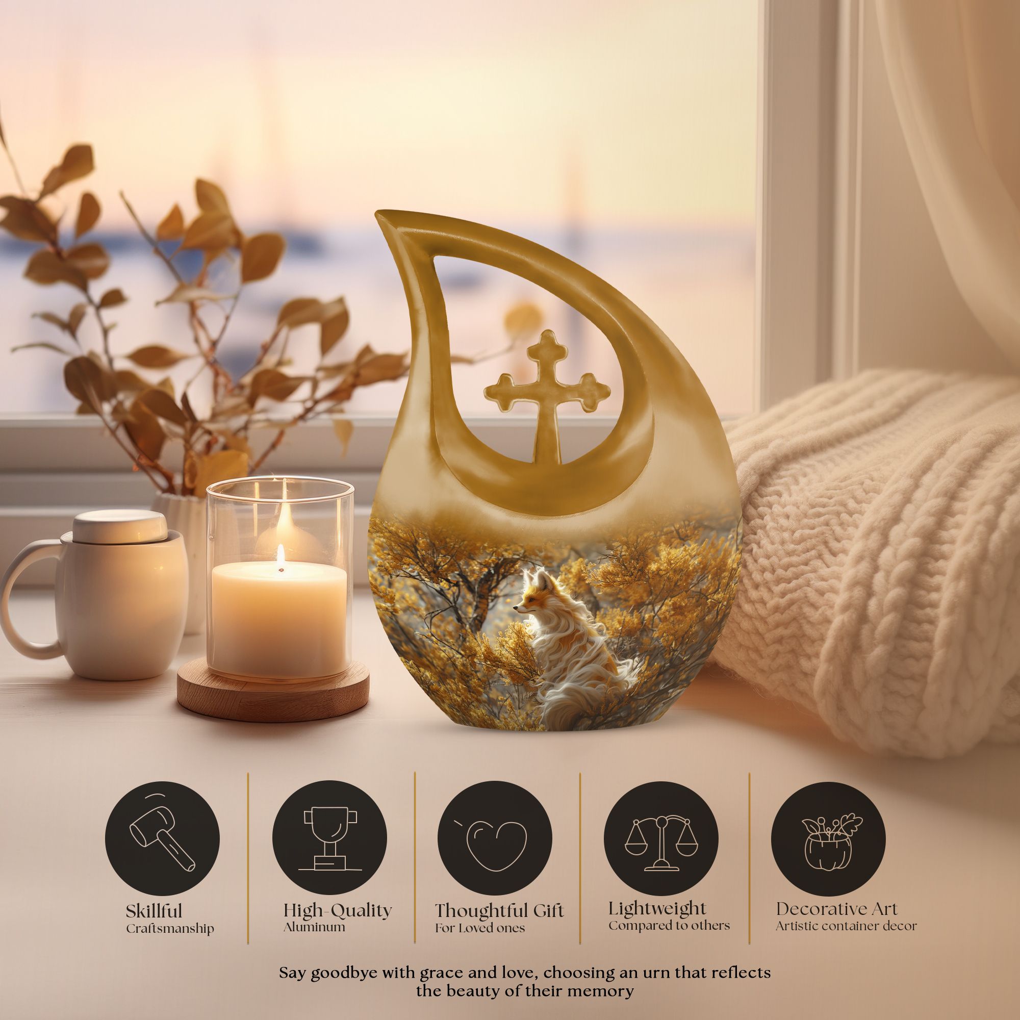 Pay a fitting tribute to your loved one with our Cross Drop Fox Urn, a distinctive masterpiece within the realm of memorial urns. Crafted with utmost precision from premium quality Aluminium, this Large Urn resonates the heartwarming theme of a Fox to provide a unique and enriching aesthetical appeal. With a commanding size of 10 inches and a weight of 3.3 pounds, our urn offers a generous capacity of 200 cubic inches to lovingly contain the cremated remains. Complementing its standout design, the urn comes nestled in a soft velvet pouch for secure containment of ashes. Vital for those seeking small urns or companion urns, the urn can be personalized with engraved names, making it an exclusive cremation keepsake. Whilst significantly different in its craftsmanship, our urn thoroughly embraces relevant keywords like Mini Urn, Mini Urns For Ashes, and Cremation Keepsakes, making it a perfect find for those seeking an uncommon yet purposeful ceremonial supply.