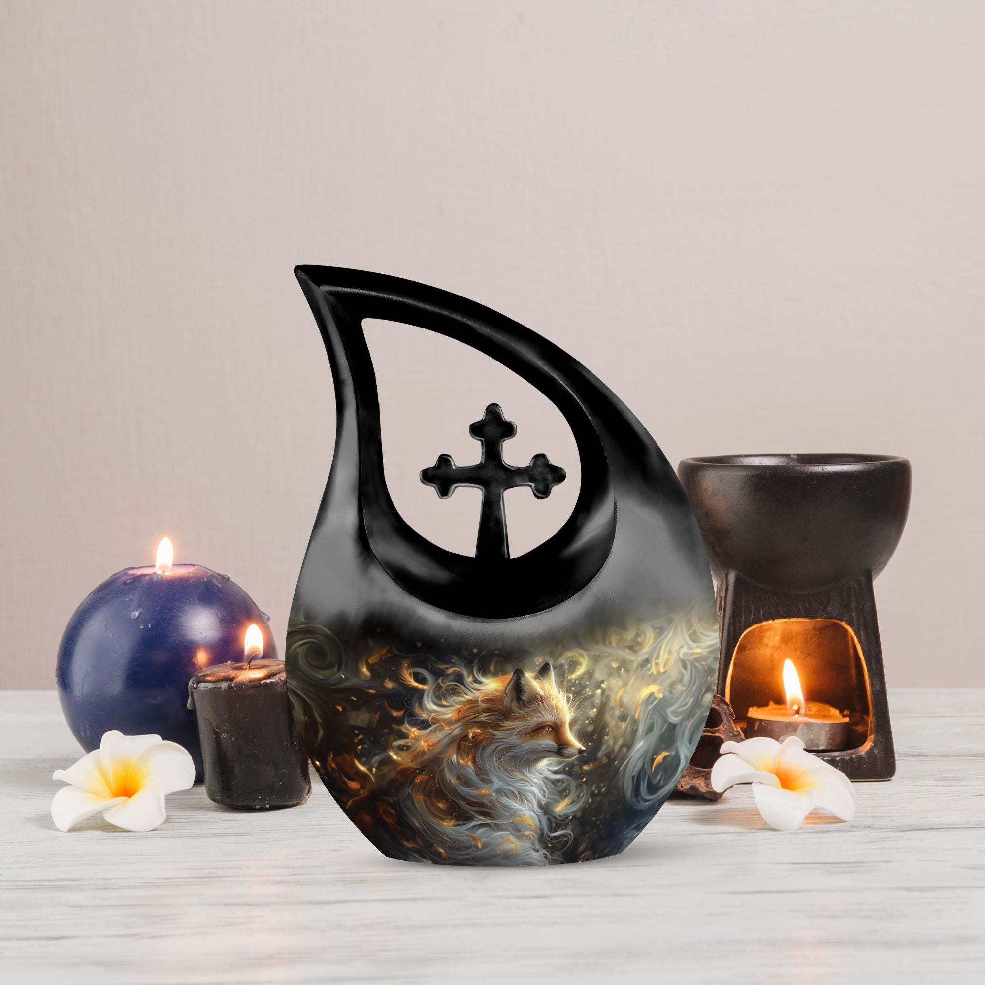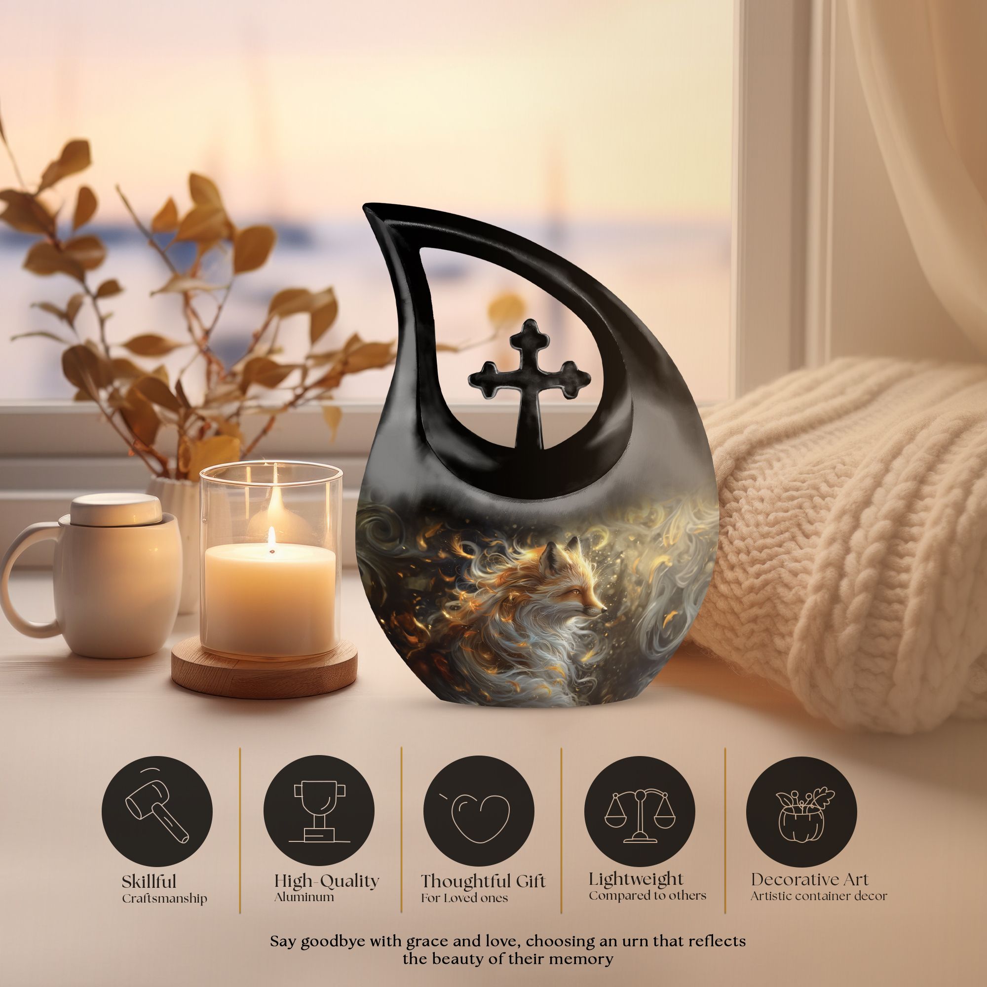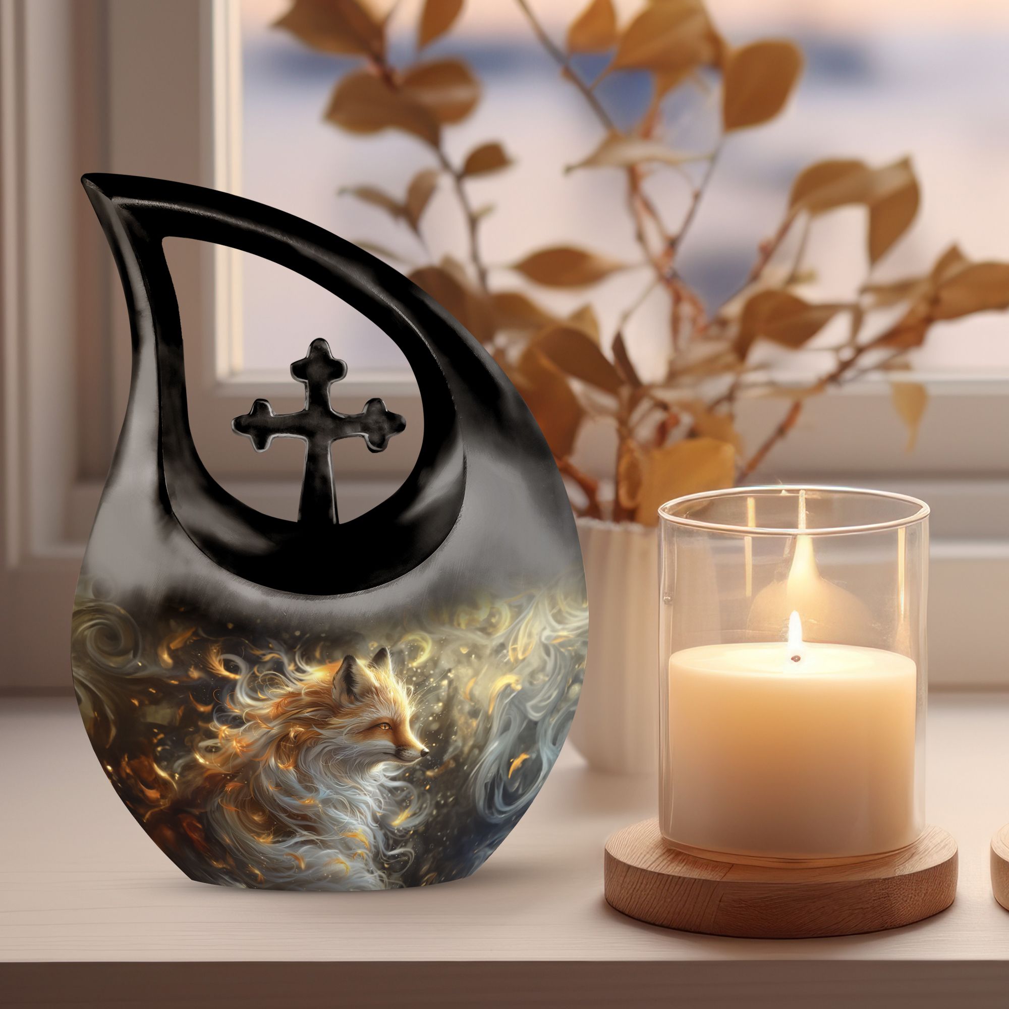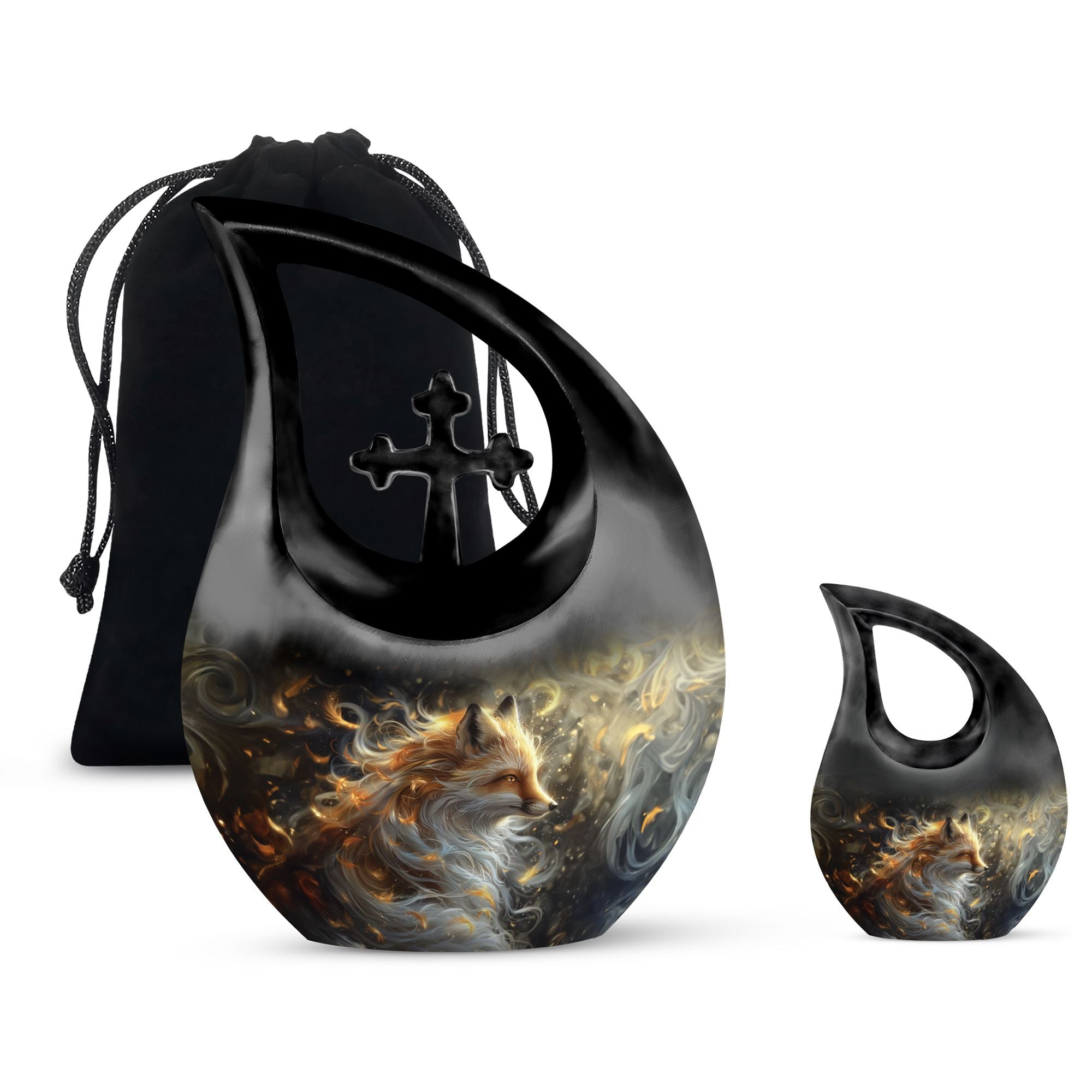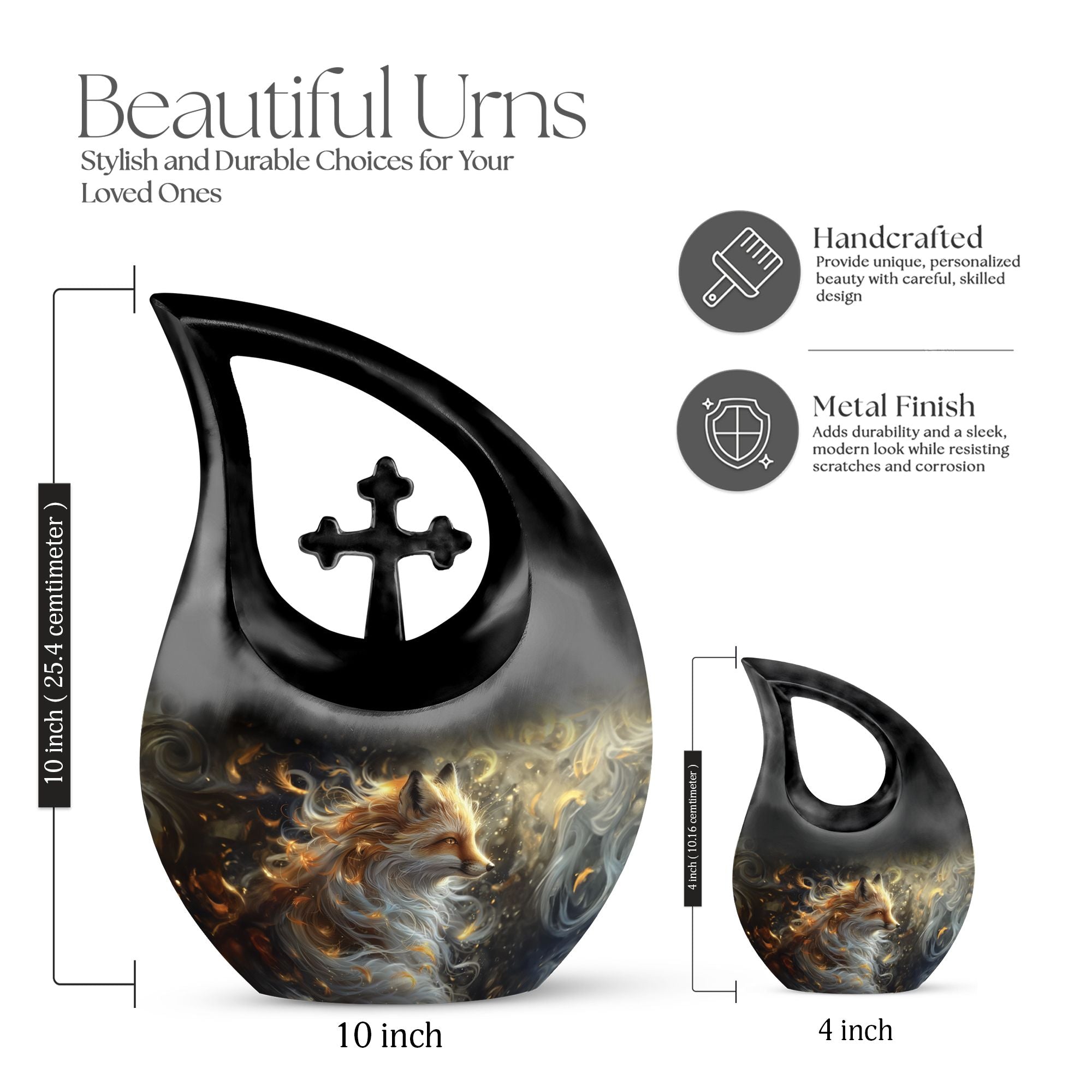 Presenting our exquisite Fox Urn, a highly sought-after urn vase of considerable size and capacity. This majestic piece stands at a regal height of 10 inches and can graciously hold up to 200 cubic inches of your beloved's ashes. Crafted meticulously from sturdy aluminium, this large urn weighs a solid 3.3 pounds, ensuring its dignified presence wherever it's placed. The intriguing Cross Drop urn design reflects the tranquility and solemnity fitting of a loving memorial. Your purchase includes a soft velvet pouch for containment and preservation of the ashes. Making this urn uniquely yours, we offer personalization options, where you can engrave names that will etch on the urn and your heart forever. Ideal for those hunting for memorial urns, this urn also serves as a perfect keepsake serving human ashes small or biodegradable urn. As an emblem of remembrance, our Fox Urn is a tranquil refuge for your precious memories.