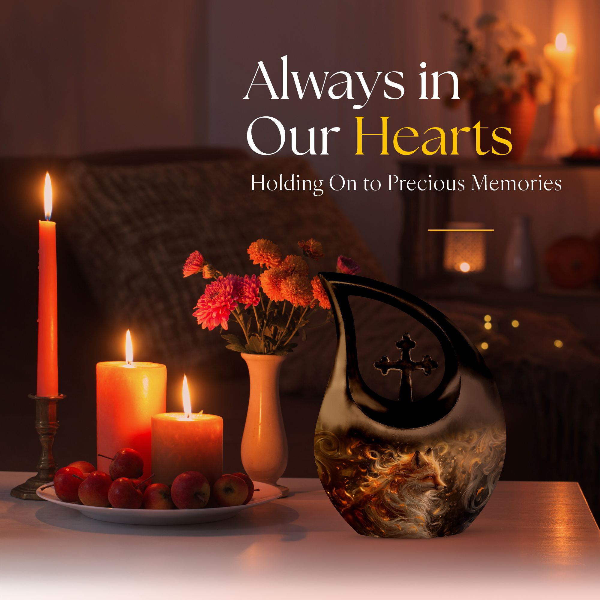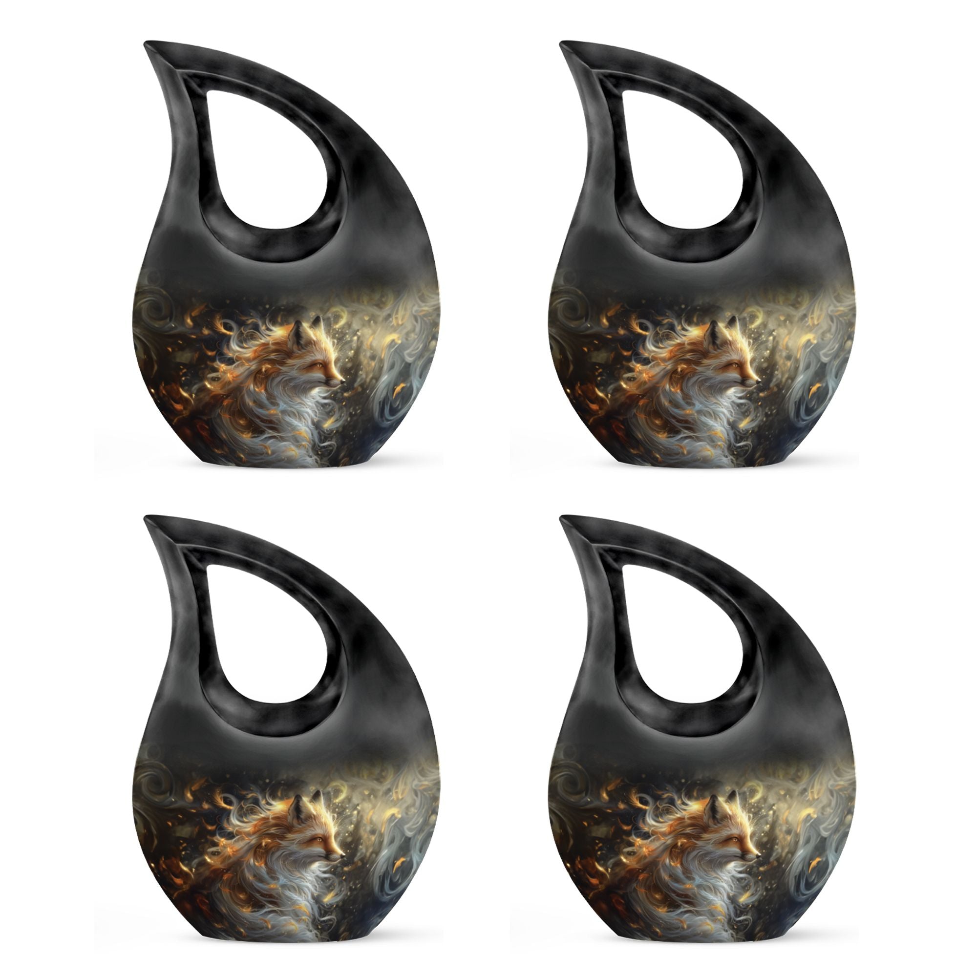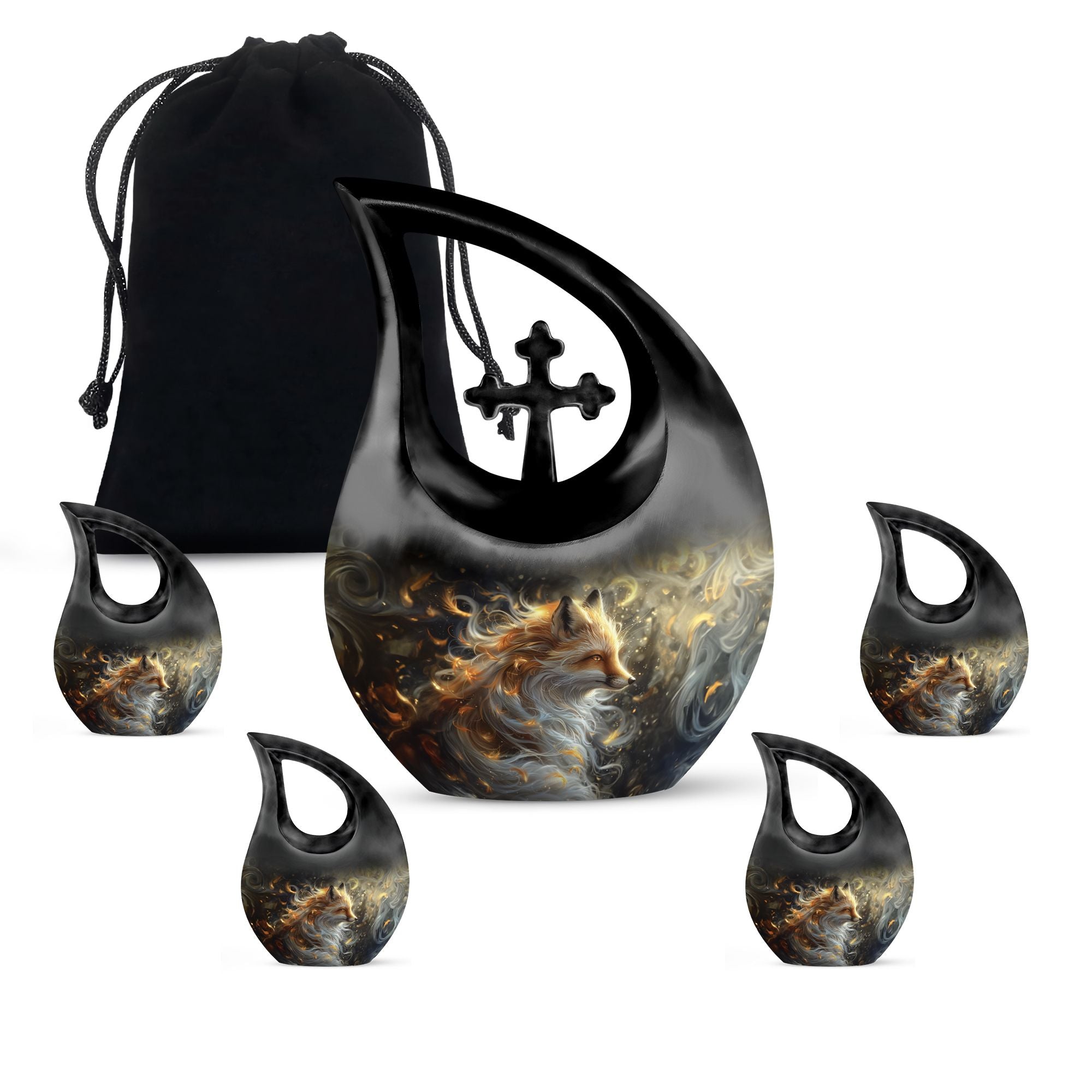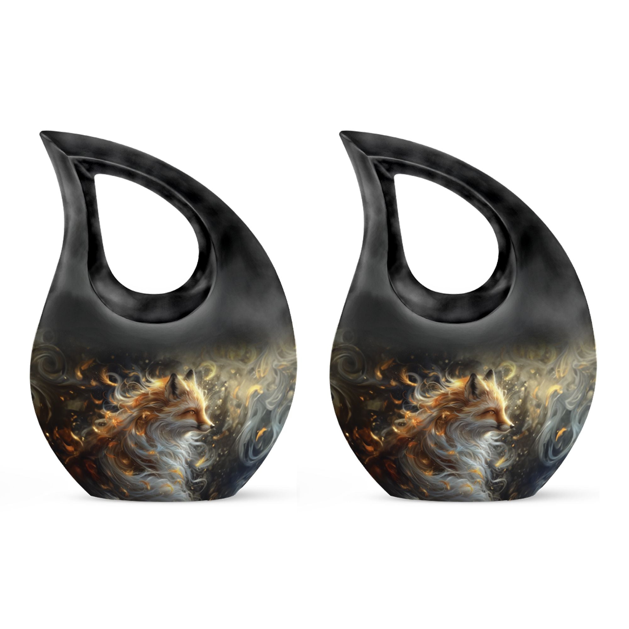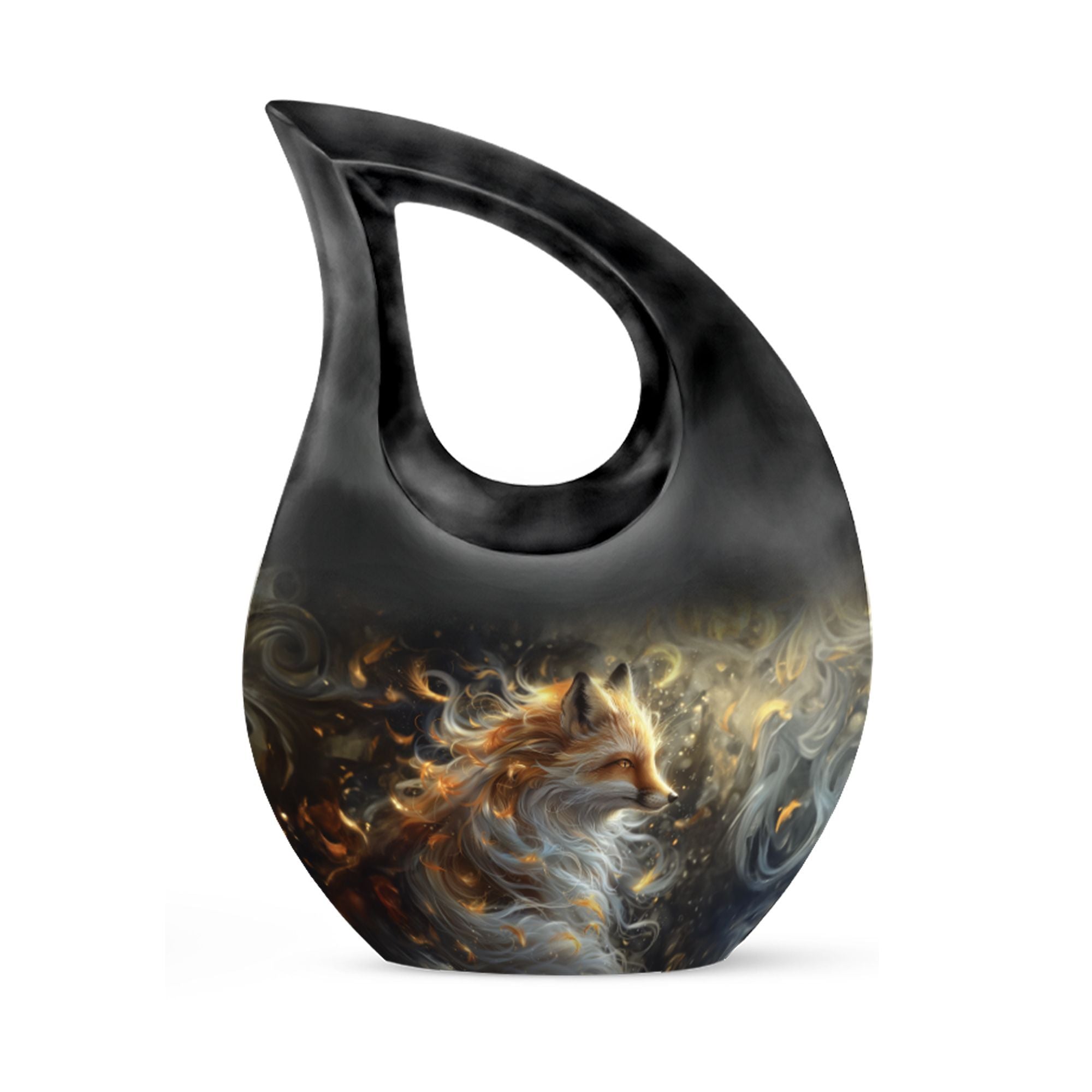 Presenting our exquisite Fox Urn, a highly sought-after urn vase of considerable size and capacity. This majestic piece stands at a regal height of 10 inches and can graciously hold up to 200 cubic inches of your beloved's ashes. Crafted meticulously from sturdy aluminium, this large urn weighs a solid 3.3 pounds, ensuring its dignified presence wherever it's placed. The intriguing Cross Drop urn design reflects the tranquility and solemnity fitting of a loving memorial. Your purchase includes a soft velvet pouch for containment and preservation of the ashes. Making this urn uniquely yours, we offer personalization options, where you can engrave names that will etch on the urn and your heart forever. Ideal for those hunting for memorial urns, this urn also serves as a perfect keepsake serving human ashes small or biodegradable urn. As an emblem of remembrance, our Fox Urn is a tranquil refuge for your precious memories.