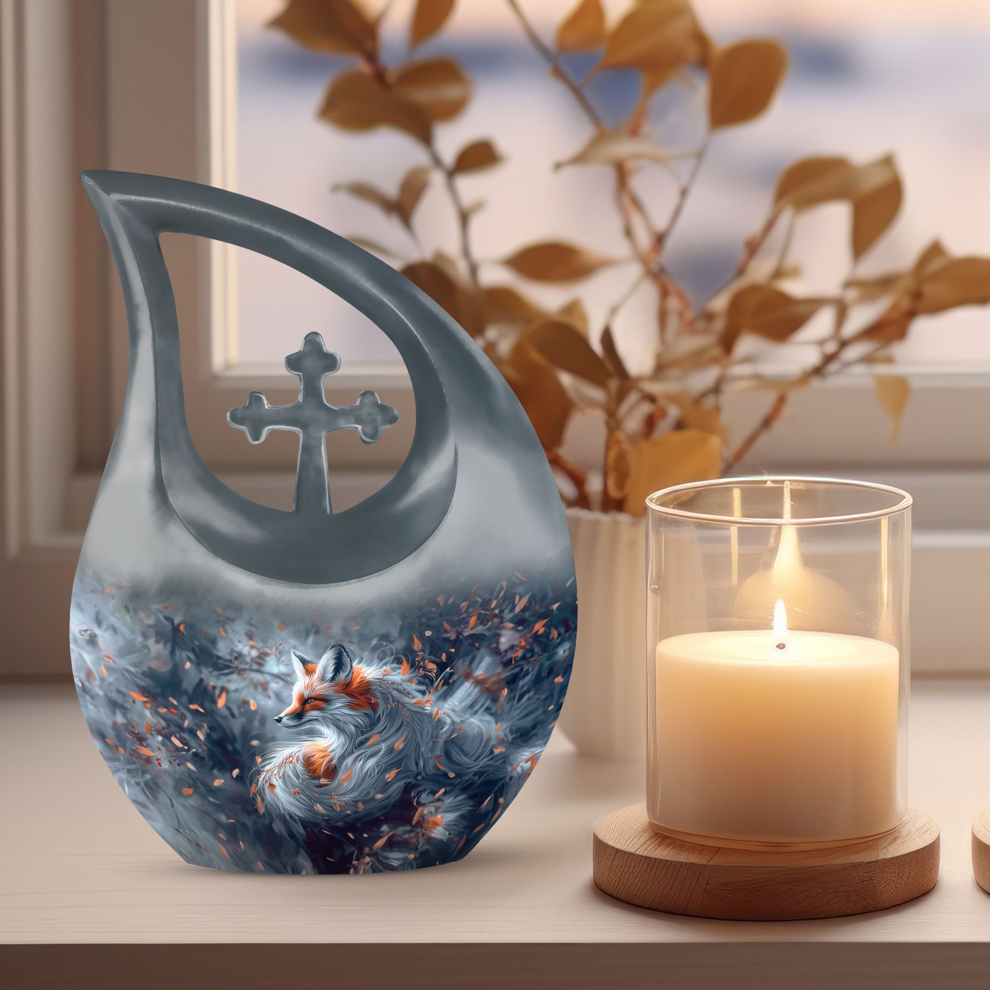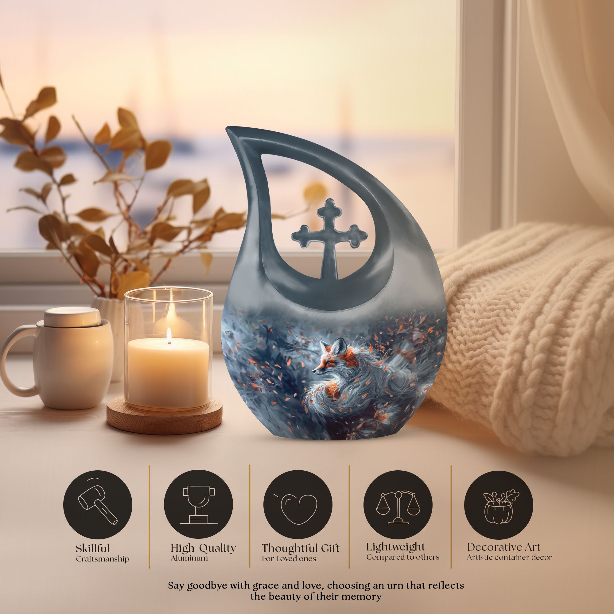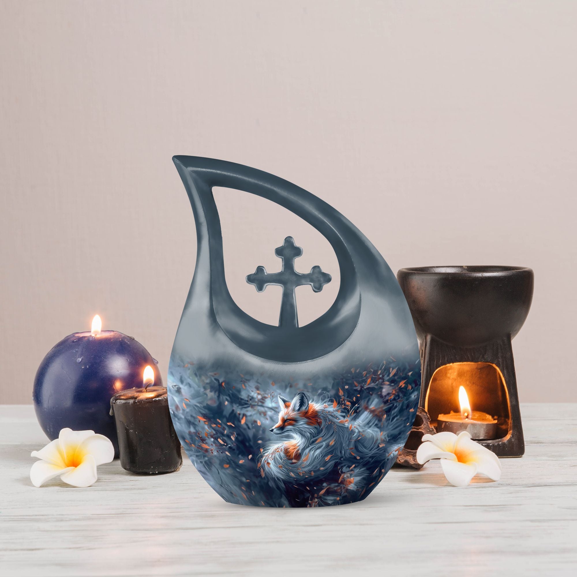 Experience the peace of mind that comes with our striking Large Aluminium Fox Urn. This urn for human ashes combines meticulous craftsmanship with a cross drop theme, presenting a touching tribute to your beloved one. An abbreviation of 10 inches in height and 200 cubic inches capacity, it comfortably houses the remnants of an adult human. This fox urn is feather light at 3.3 pounds, making it easily transportable. One unique factor of this memorial urn is the inclusive velvet pouch, providing an added layer of protection for the stored ashes. For a more personal touch, it can be etched with the name of the deceased, allowing for a more specific honouring. This product is particularly suited for those seeking pink urns for human ashes, urn for mom, butterfly urns for ashes or angel urn. Let this fox urn serve as a dignified final resting place.