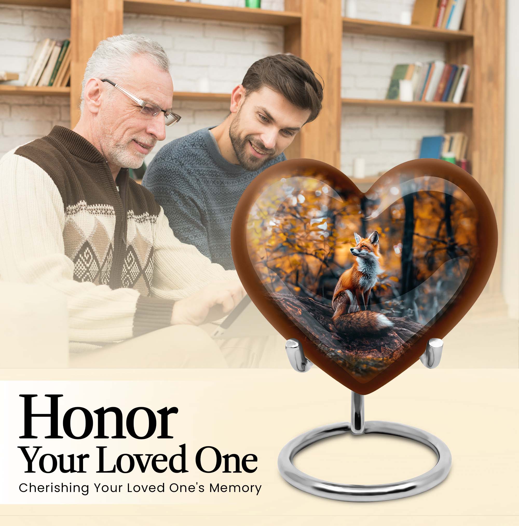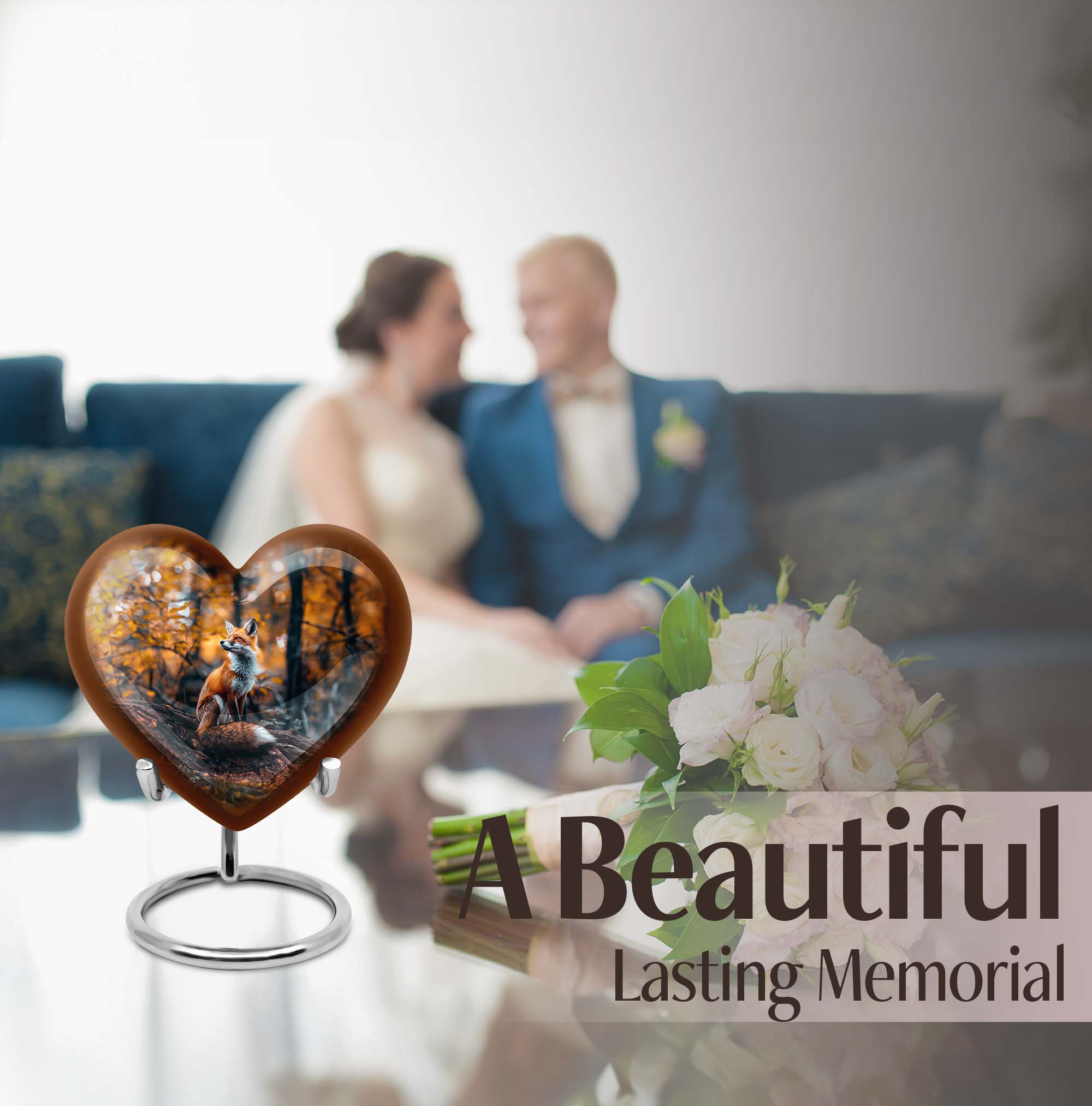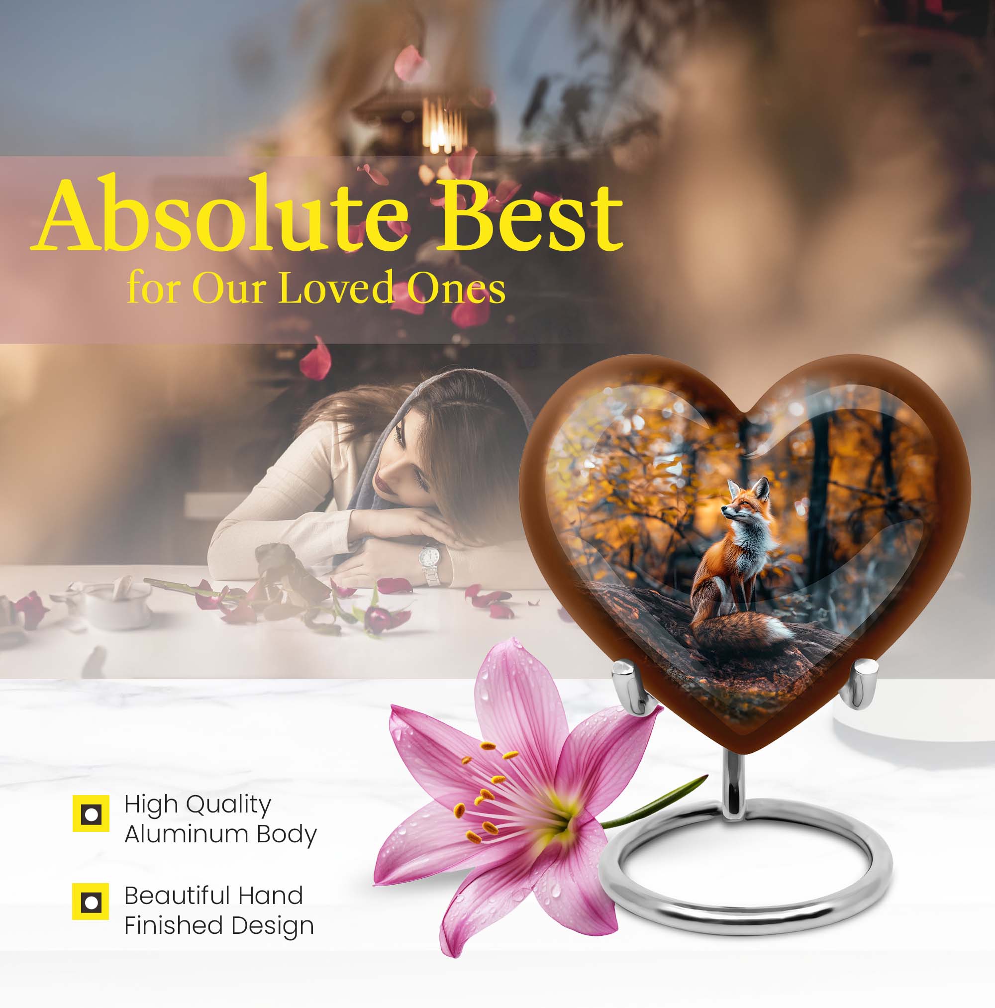 Embrace a gentle remembrance of your loved ones with this stunningly crafted fox urn, a symbol of tranquility and enduring love. Our large aluminium cremation urn stands at 10 inches, featuring a tasteful theme of a butterfly, subtly symbolizing the transformation of life. Enhanced by its optimal capacity of 200 cubic inches, this burial urn can respectfully house your cherished one's remains with utmost honor. Expertly weighing 3.3 pounds, this urn ensures stability and durability. It also does not overwhelm with its heft, providing ease of portability. Each cremation urn set comes, well protected, in a velvet pouch for the revered containment of ashes. We understand the importance of making the urn personal, so offer you the opportunity to personalize the urn with engraved names. Kindly refrain from specifying the design as it encapsulates our unique Heart Urn aesthetic. As you embark on your journey of remembrance, let our adult female elegant urn in porcelain be the perfect vessel to commemorate your loved one's life. Express your tribute in a profound way with these metal funeral urns for human ashes adult.