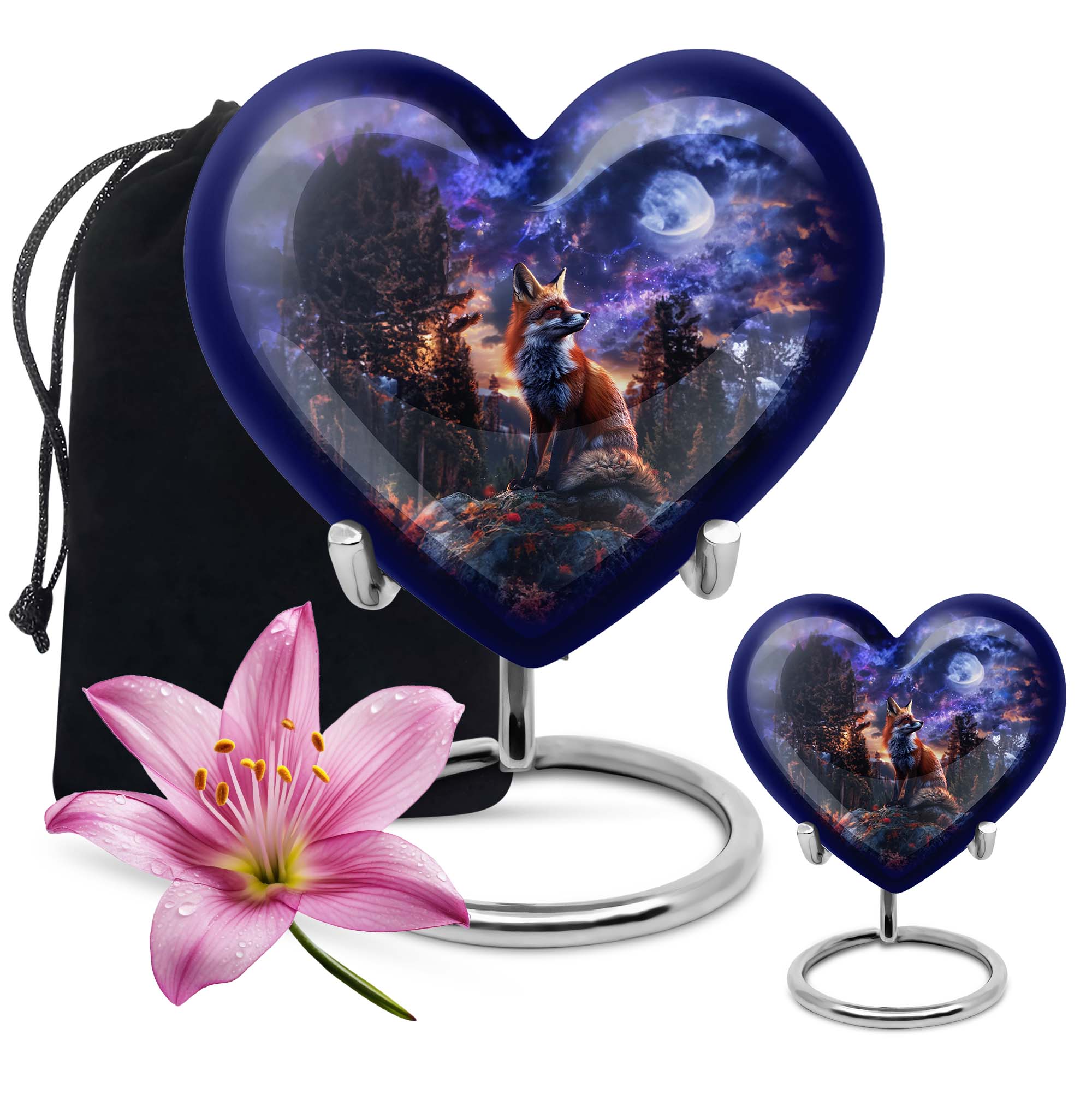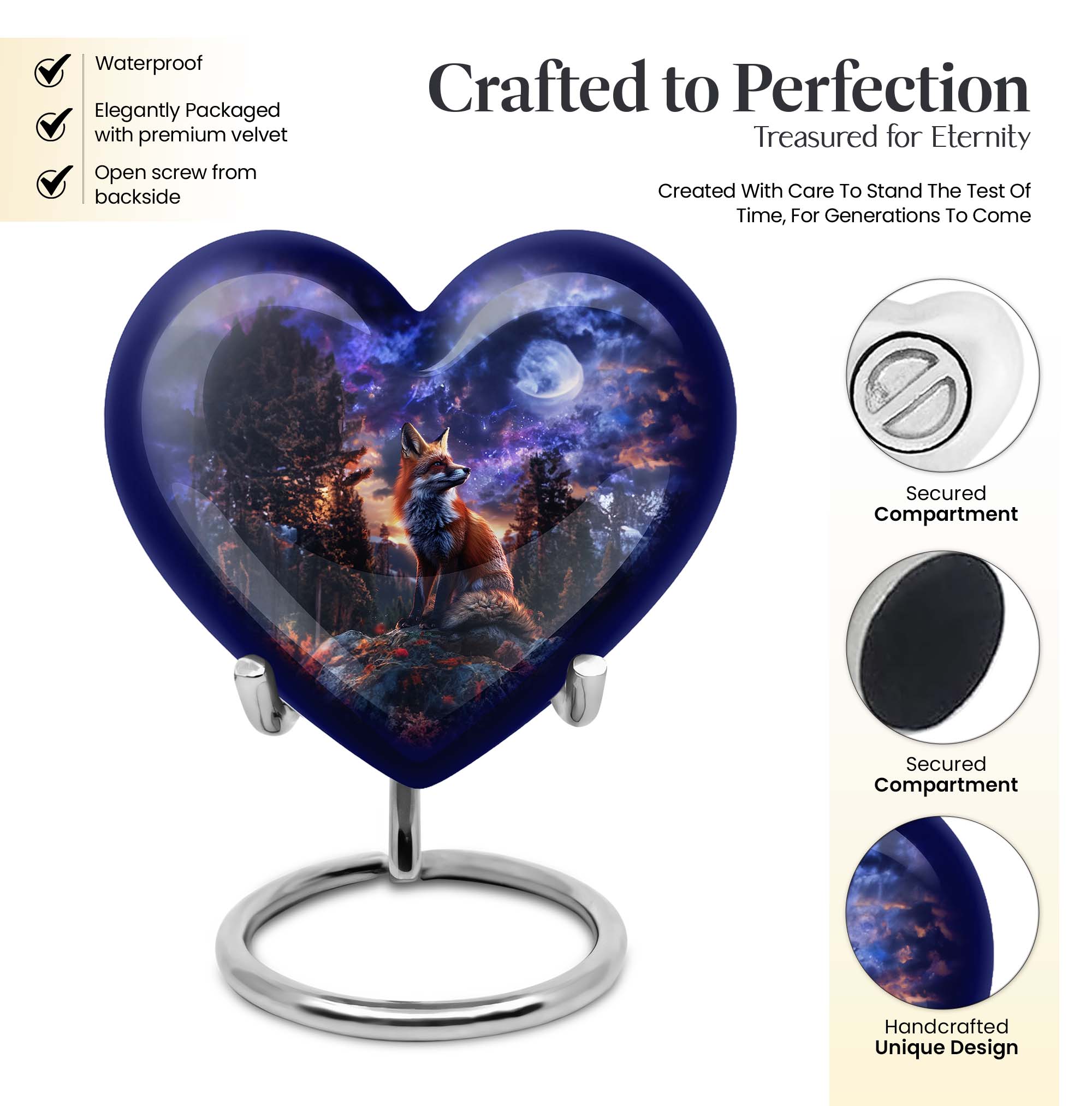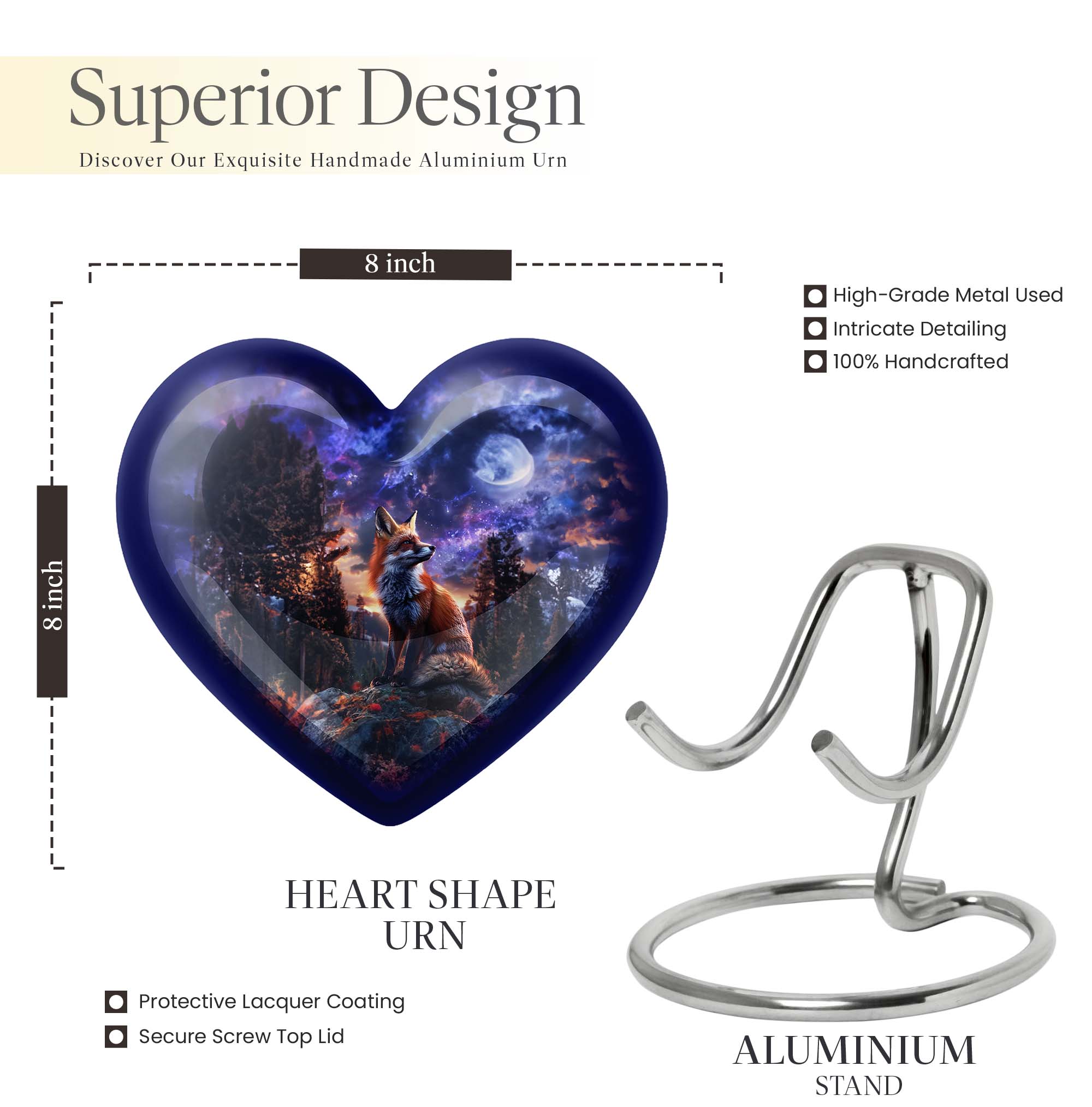 Discover solace and serenity with our exquisite Fox Urn, a large size and classically themed cremation medium urn for human ashes. Our heart urn elegantly stands 10 inches in height, shaped carefully from high-quality aluminum, giving it resilience and weight of 3.3 pounds. This cremation urn offers you ample space, with a capacity of 200 cubic inches, making it an ideal burial urn. The urn's unique butterfly theme enhances its emotional appeal, striking the perfect balance between solemnity and tranquility. Your purchase also comes beautifully inclusive of a velvet pouch providing secure containment for your cherished one's ashes. Enjoy the option to personalize this funeral urn with engraved names, adding a heartfelt touch to this memorial. Embrace the unmatched quality offered in our range of human cremation vessels, well-suited for those searching for thoughtfully shaped to-go containers. Unlike other cremation urns, ours is designed with great consideration for adults and seniors, easing the process of saying farewell to a dearly beloved.