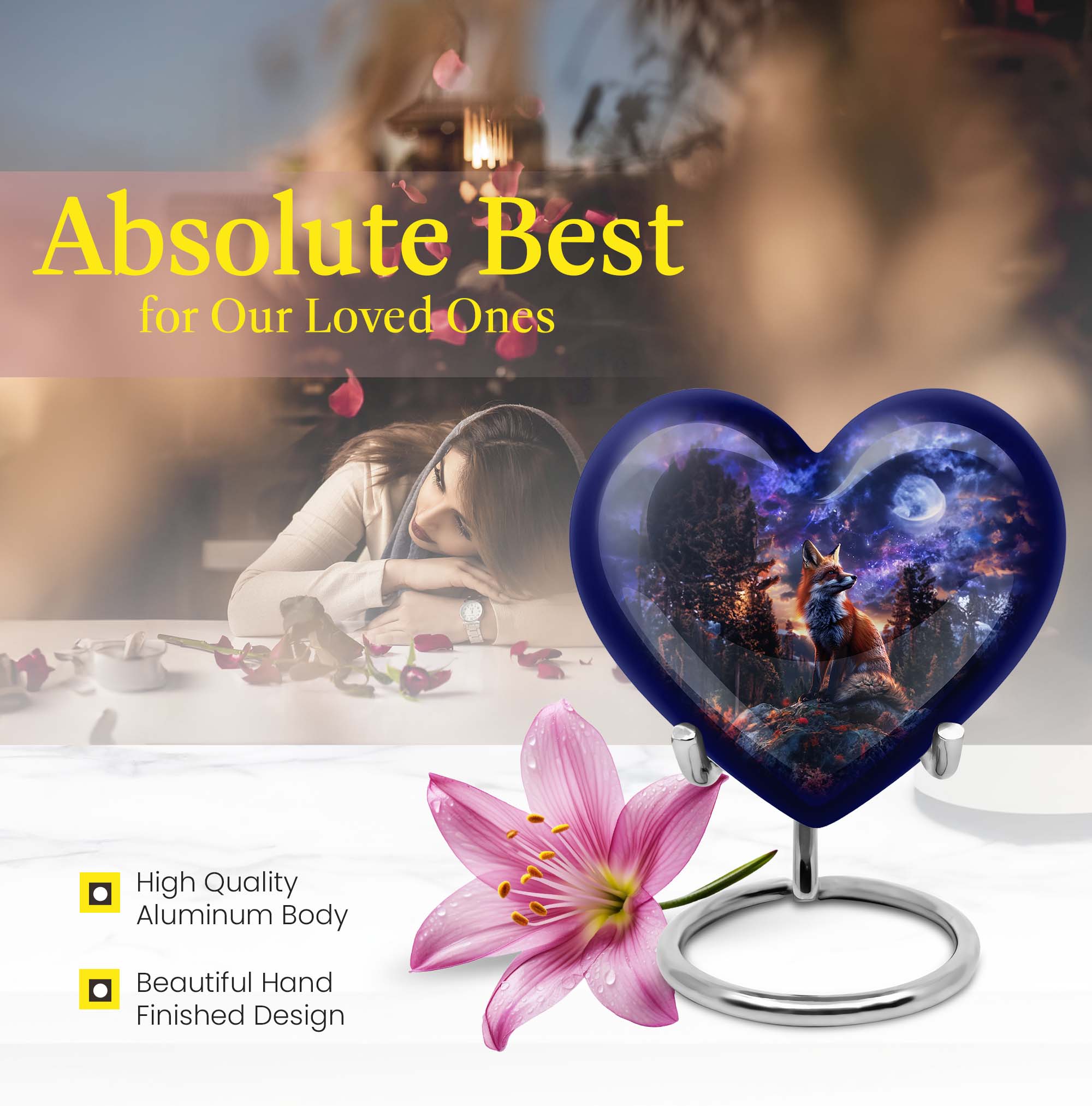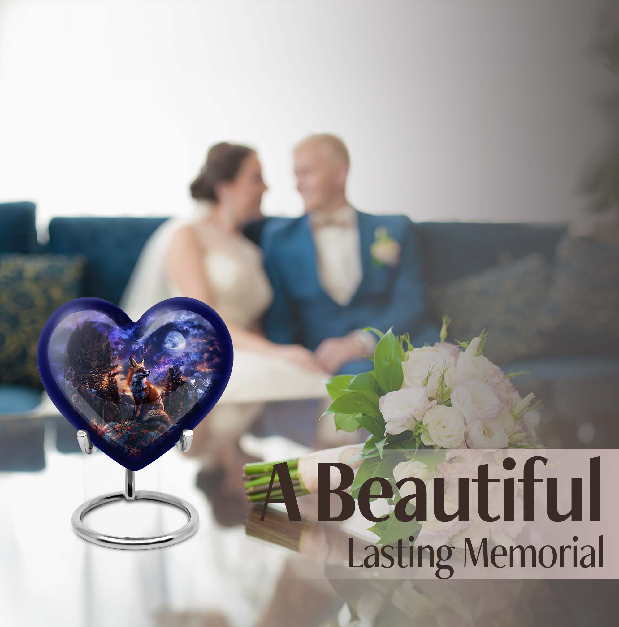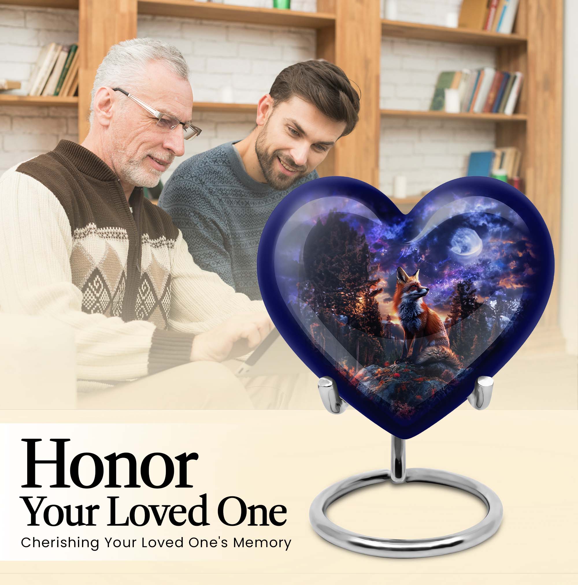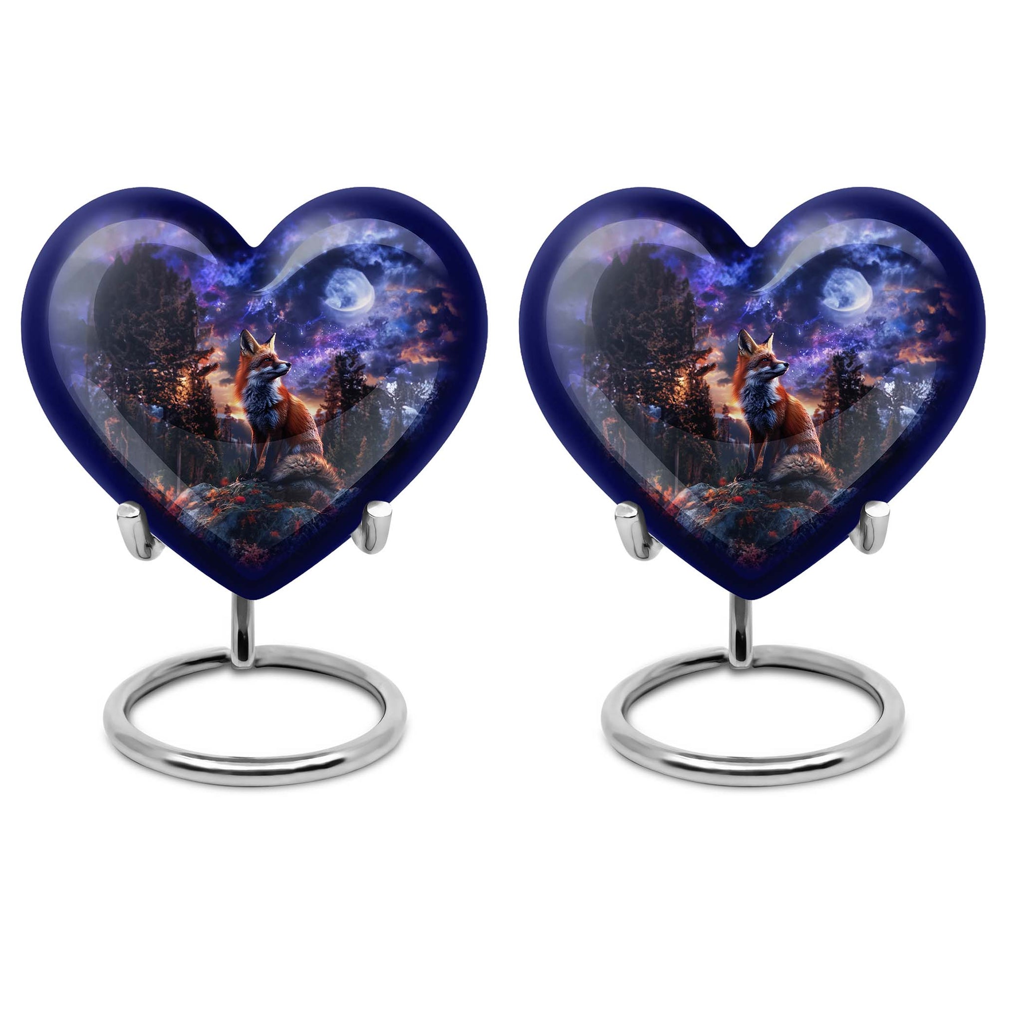Discover solace and serenity with our exquisite Fox Urn, a large size and classically themed cremation medium urn for human ashes. Our heart urn elegantly stands 10 inches in height, shaped carefully from high-quality aluminum, giving it resilience and weight of 3.3 pounds. This cremation urn offers you ample space, with a capacity of 200 cubic inches, making it an ideal burial urn. The urn's unique butterfly theme enhances its emotional appeal, striking the perfect balance between solemnity and tranquility. Your purchase also comes beautifully inclusive of a velvet pouch providing secure containment for your cherished one's ashes. Enjoy the option to personalize this funeral urn with engraved names, adding a heartfelt touch to this memorial. Embrace the unmatched quality offered in our range of human cremation vessels, well-suited for those searching for thoughtfully shaped to-go containers. Unlike other cremation urns, ours is designed with great consideration for adults and seniors, easing the process of saying farewell to a dearly beloved.