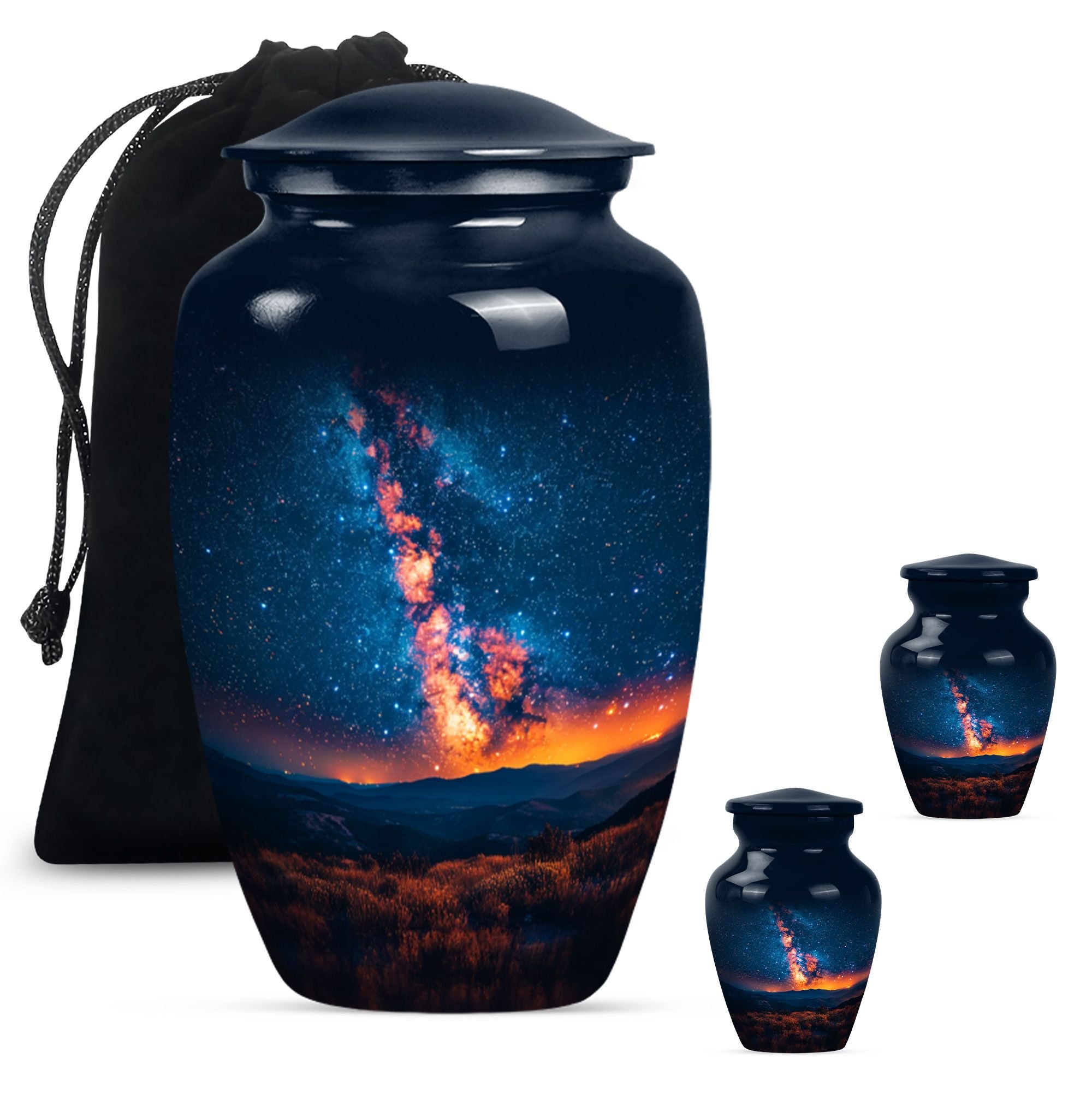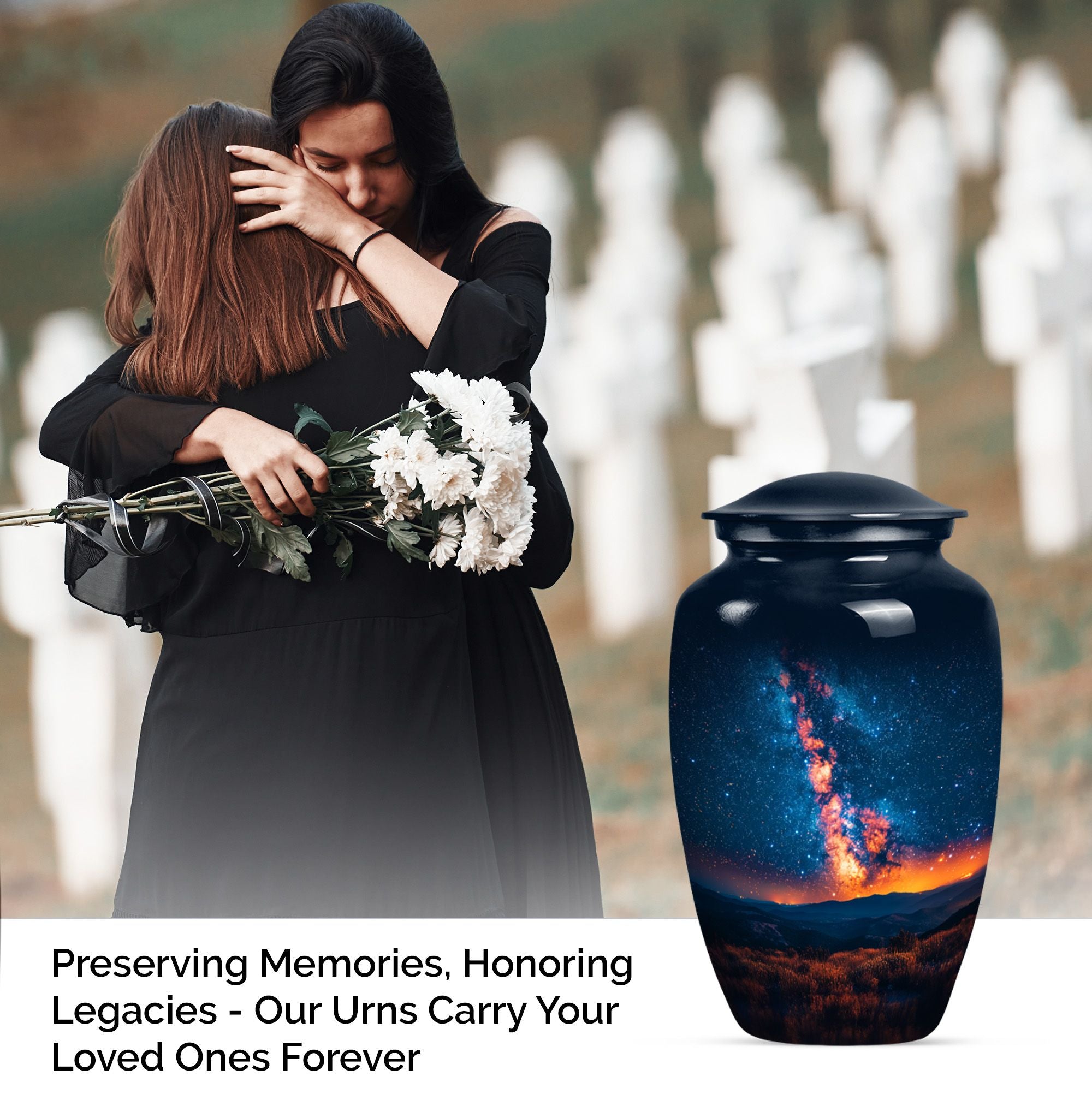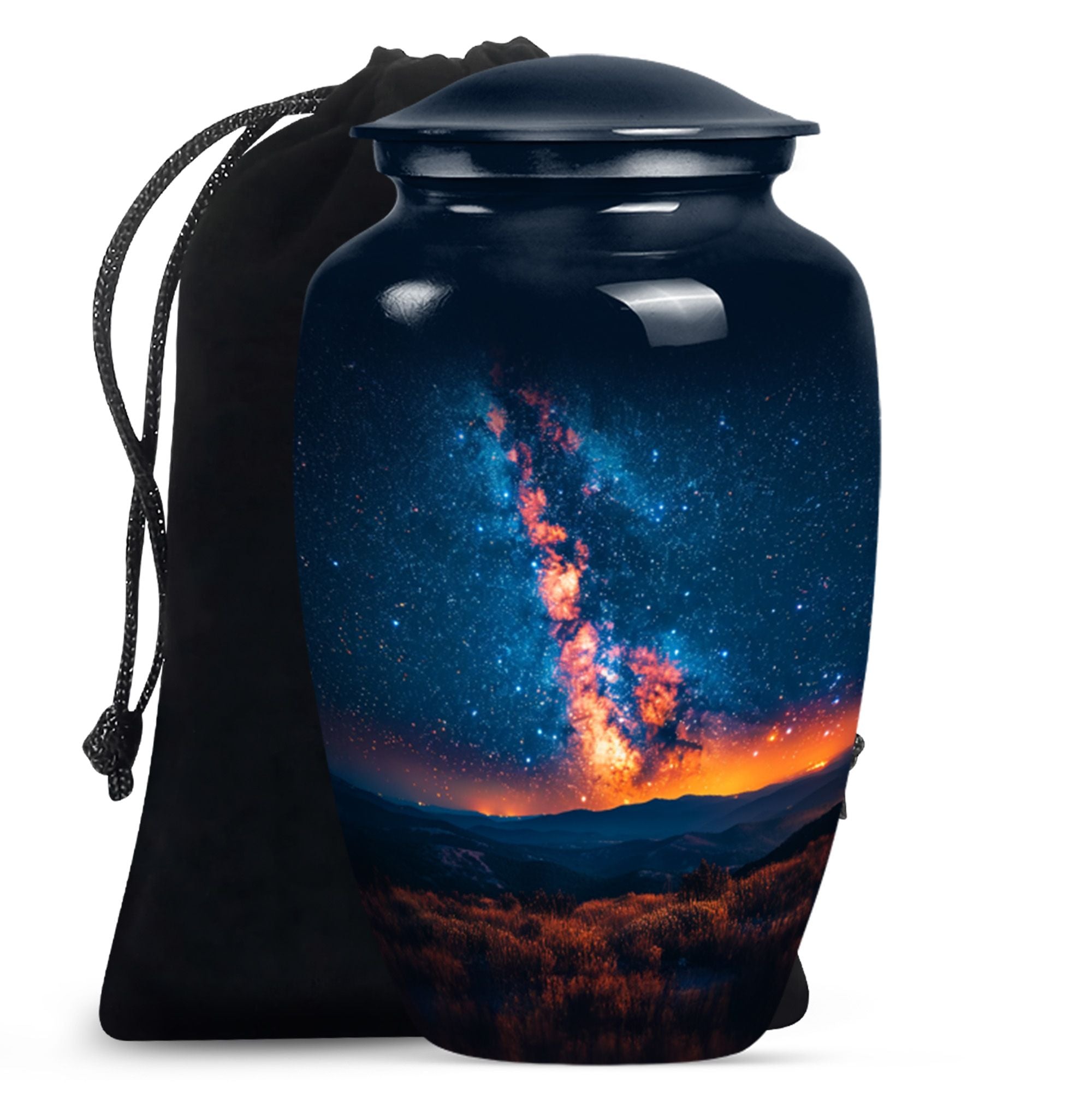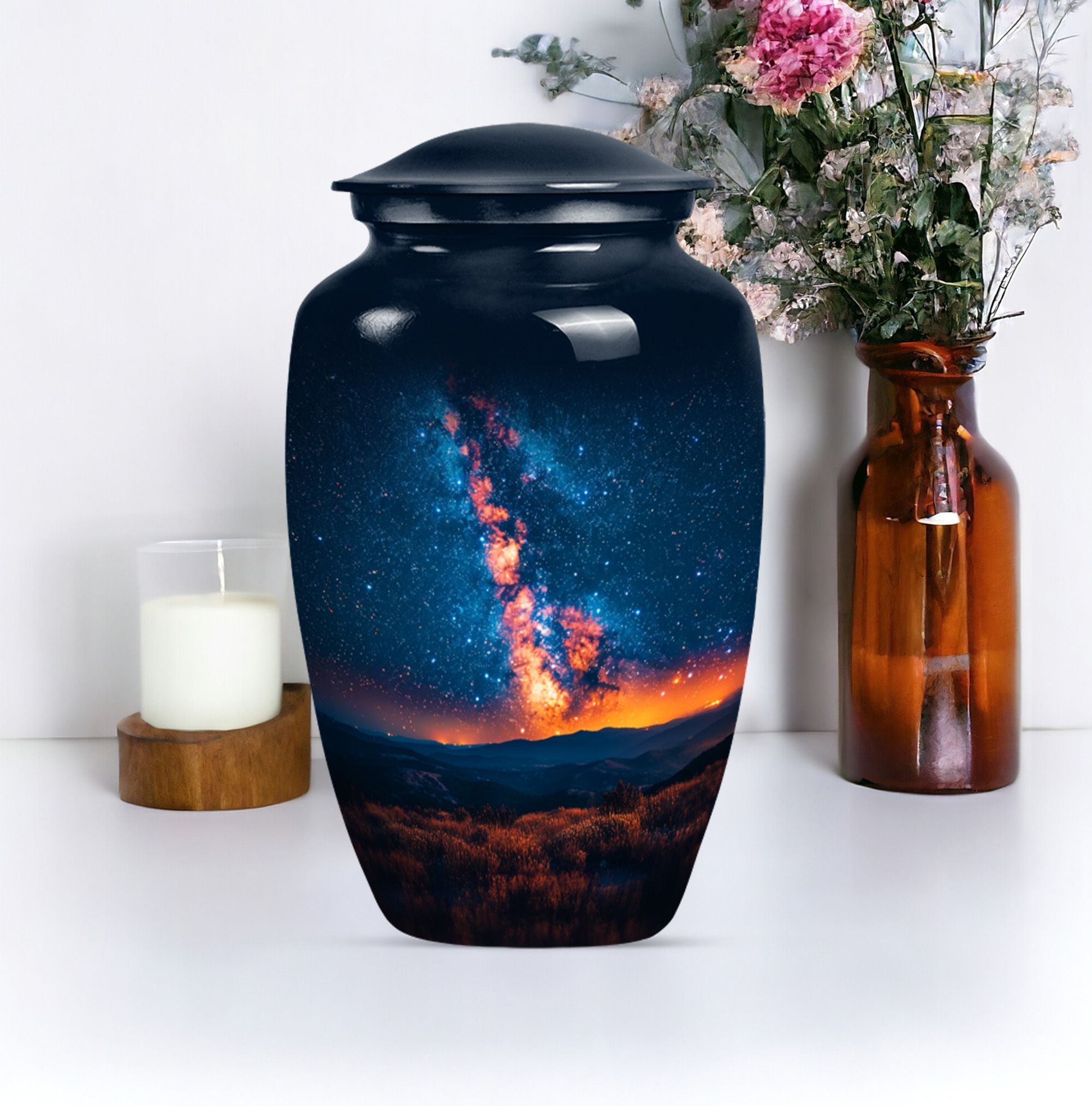 Eternalize the presence of your departed loved ones with our galaxy urn, exquisitely fashioned to cater for meticulously graceful memorial ceremonies. Our 10-inch large urn, meticulously crafted from premium-grade aluminium, beautifully embraces a classic urn theme with a modern abstract twist. The funeral decorative urn weighs a solid 3.3 pounds, and its considerable capacity of 200 cubic inches ensures a sufficient containment for ashes. Further enhancing the convenience factor, our product arrives complete with a plush velvet pouch, specifically designed for the secure containment of your loved ones' ashes. Recognizing the desire for a personalized memento, our urns offer you the opportunity to immortalize your loved one's name through engraving. With keywords such as 'Memorial urns for human ashes adult female', 'urn human adult male' or 'urns for cremation ashes mother', potential search queries by seniors and adults engaged in choosing high-quality ceremonial items can strategically lead them to our product. Procure this outstanding token of affection and remembrance, offering a sublime balance between traditional values and modern aesthetics.