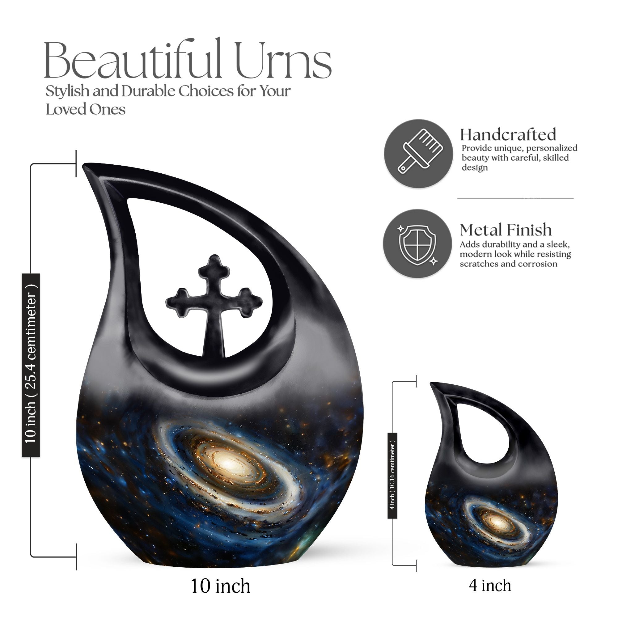 Handmade from durable aluminium, this urn displays a captivating galaxy pattern representing eternity, connection, and the vastness of love that remains. Its smooth finish and secure structure make it ideal for those searching for Adult Size Cremation Urns, a reliable Urn Cremation Keepsake, or coordinating Cremation Keepsake Urns for Human Ashes Adult. At 10 inches tall, it offers generous capacity while remaining visually elegant for home display or ceremony use.