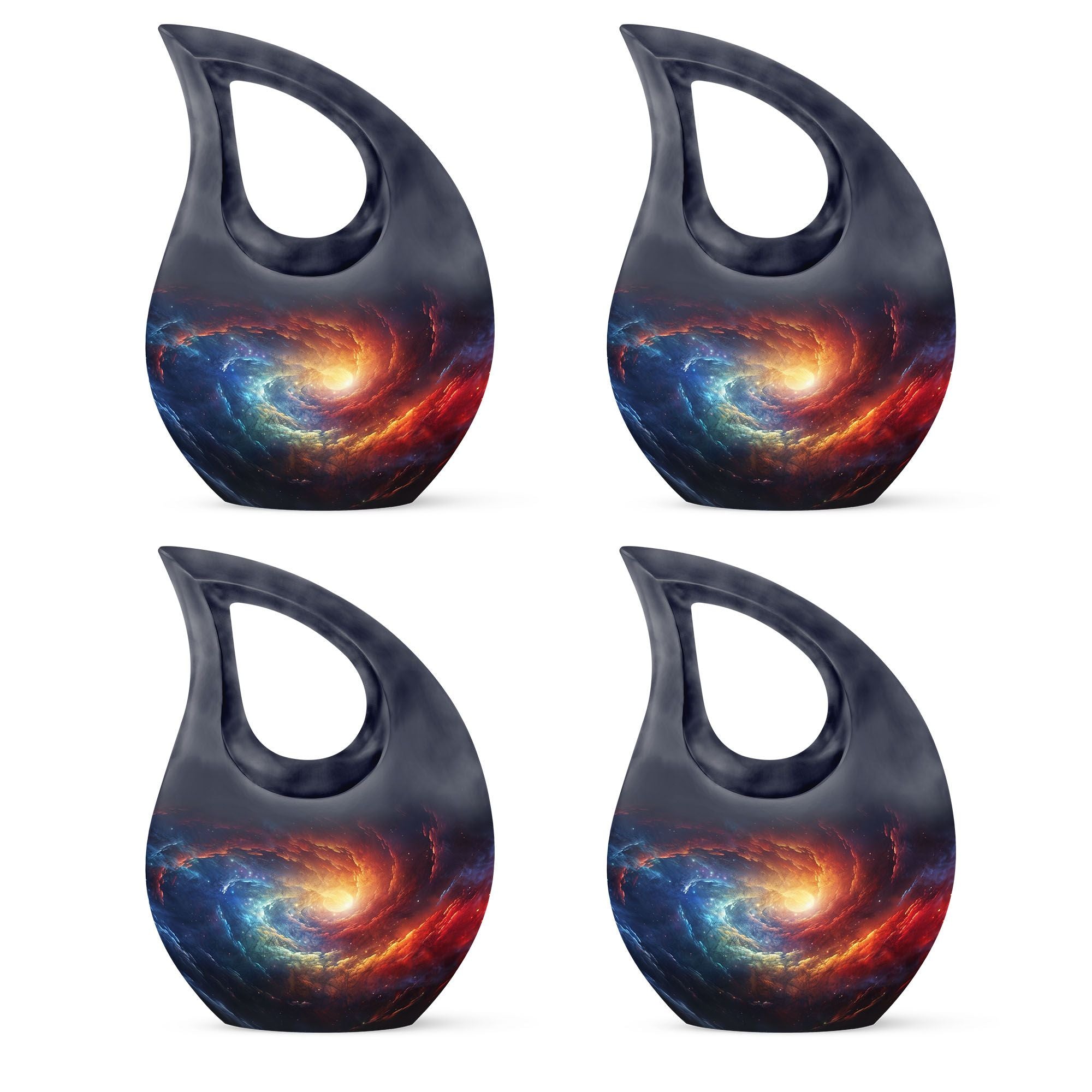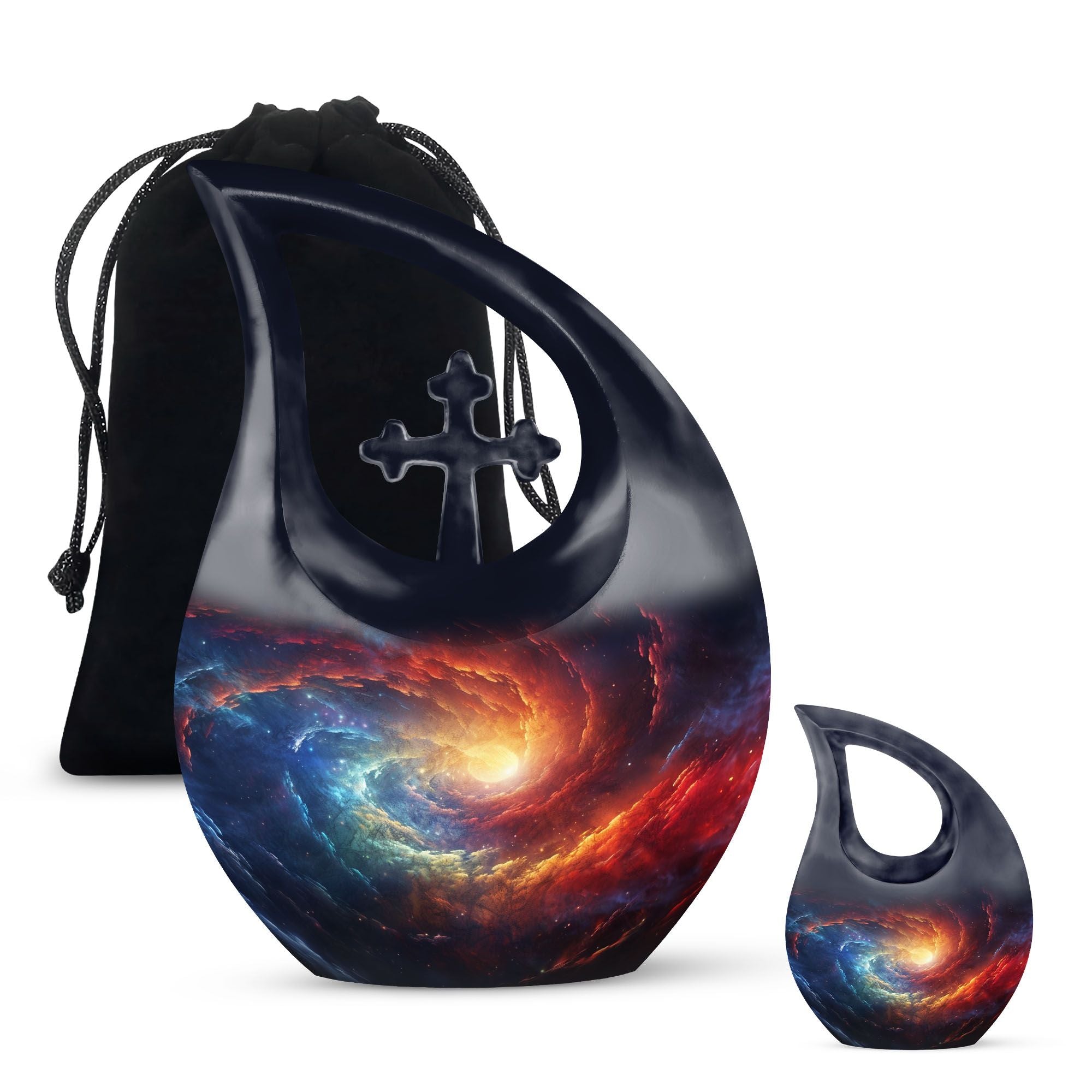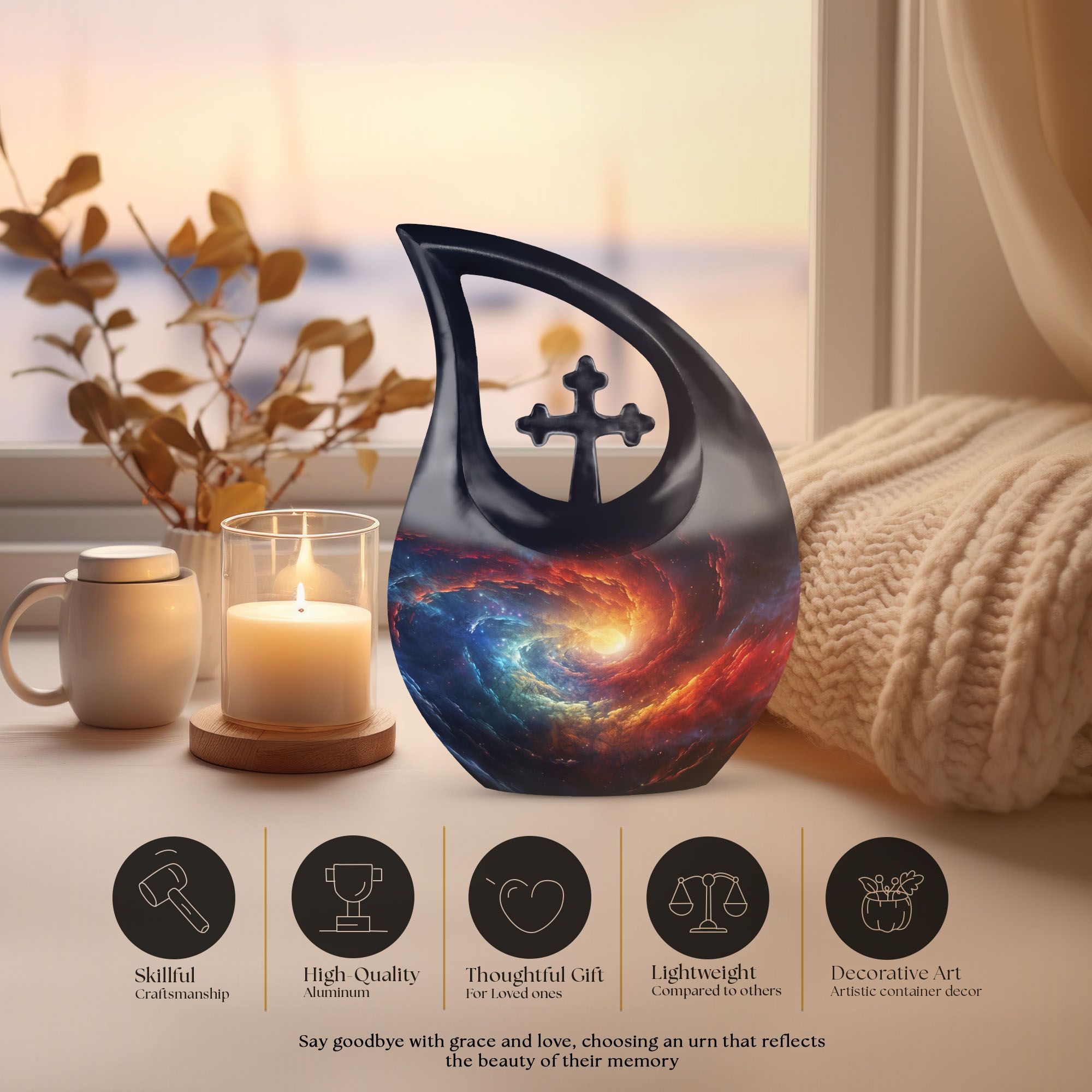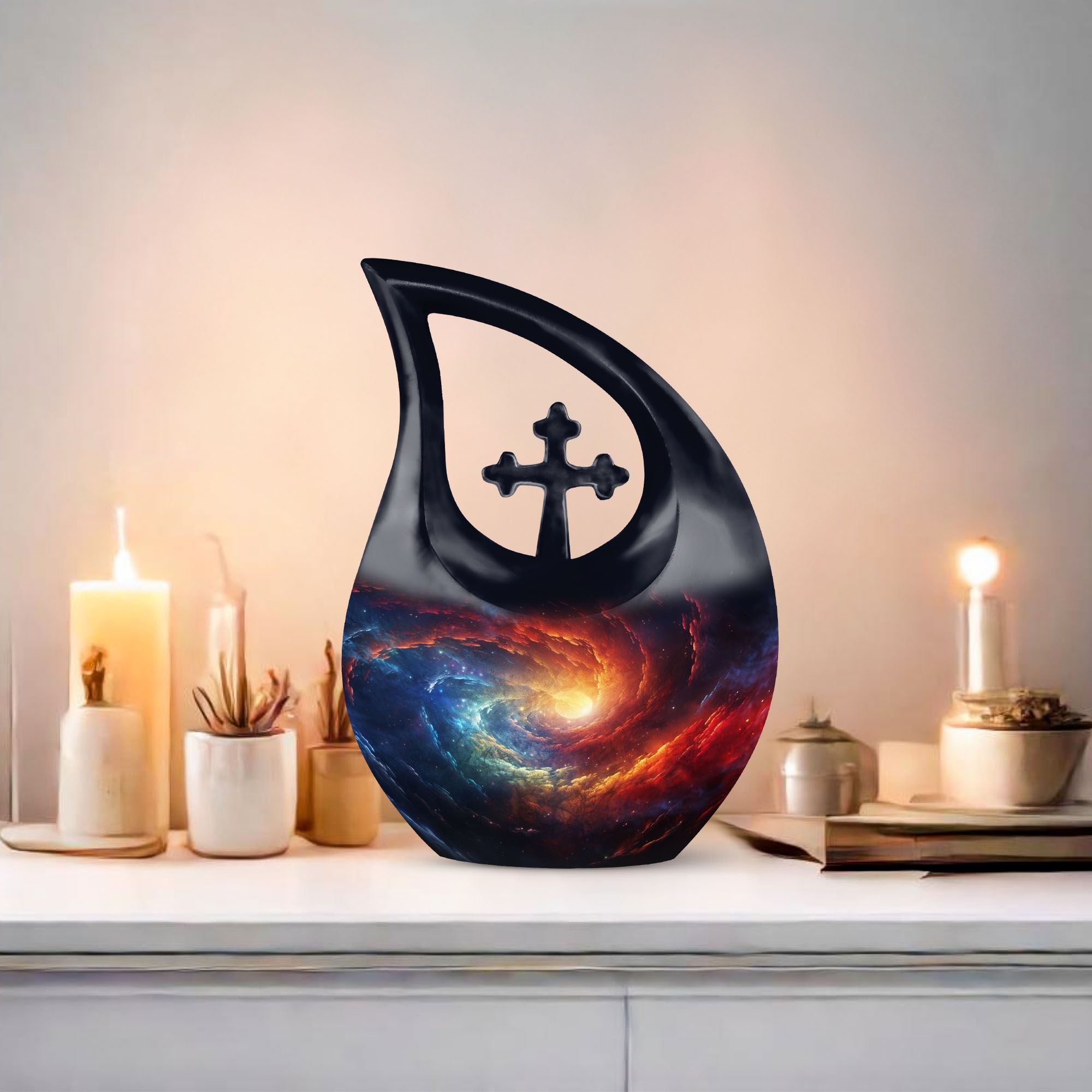 Crafted with profound attention to detail, our Galaxy Urn serves as a thoughtful and respectful keepsake, intended especially for adults and seniors pondering on purchases within the Memorial Ceremony Supplies category. This 10-inch, cross drop themed large urn stands out thanks to its captivating Galaxy theme. Skillfully crafted from robust, long-lasting aluminium, this piece carries a substantial capacity of 200 cubic inches. The urn measures 10 inches in height, and weighs around 3.3 pounds offering a blend of stability and elegancy. As an added thoughtful touch, we offer you the ability to personalize this urn with engraved names, making it an incredibly unique piece for your cherished ones. Coming with a luxurious velvet pouch for secure containment of ashes, this makes for an ideal choice amongst memorial urns. Start preserving precious memories with our affordable cremation and burial urn, serving an exceptional choice amongst small urns for human ashes and cremation keepsakes for the English-speaking audience.