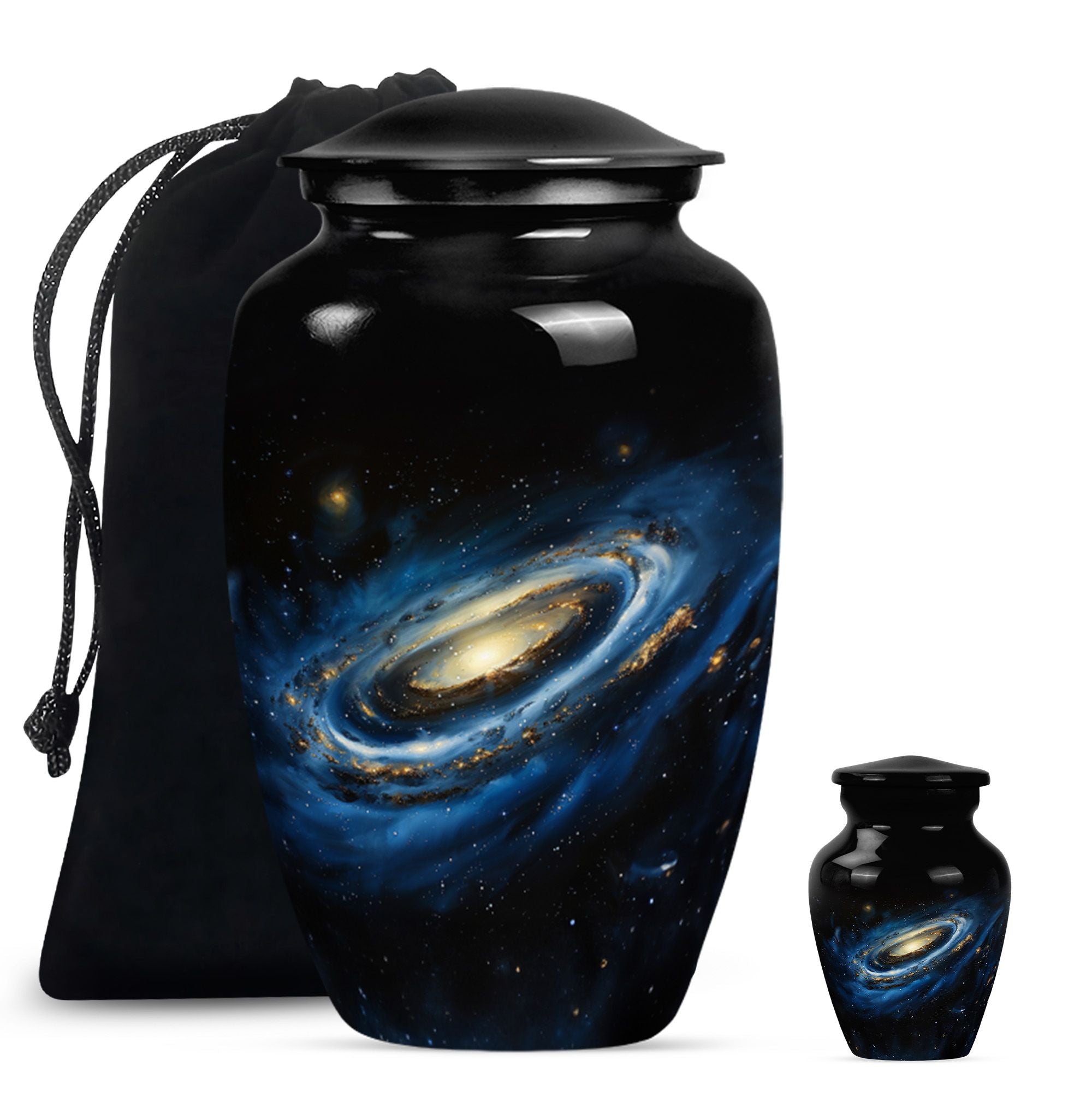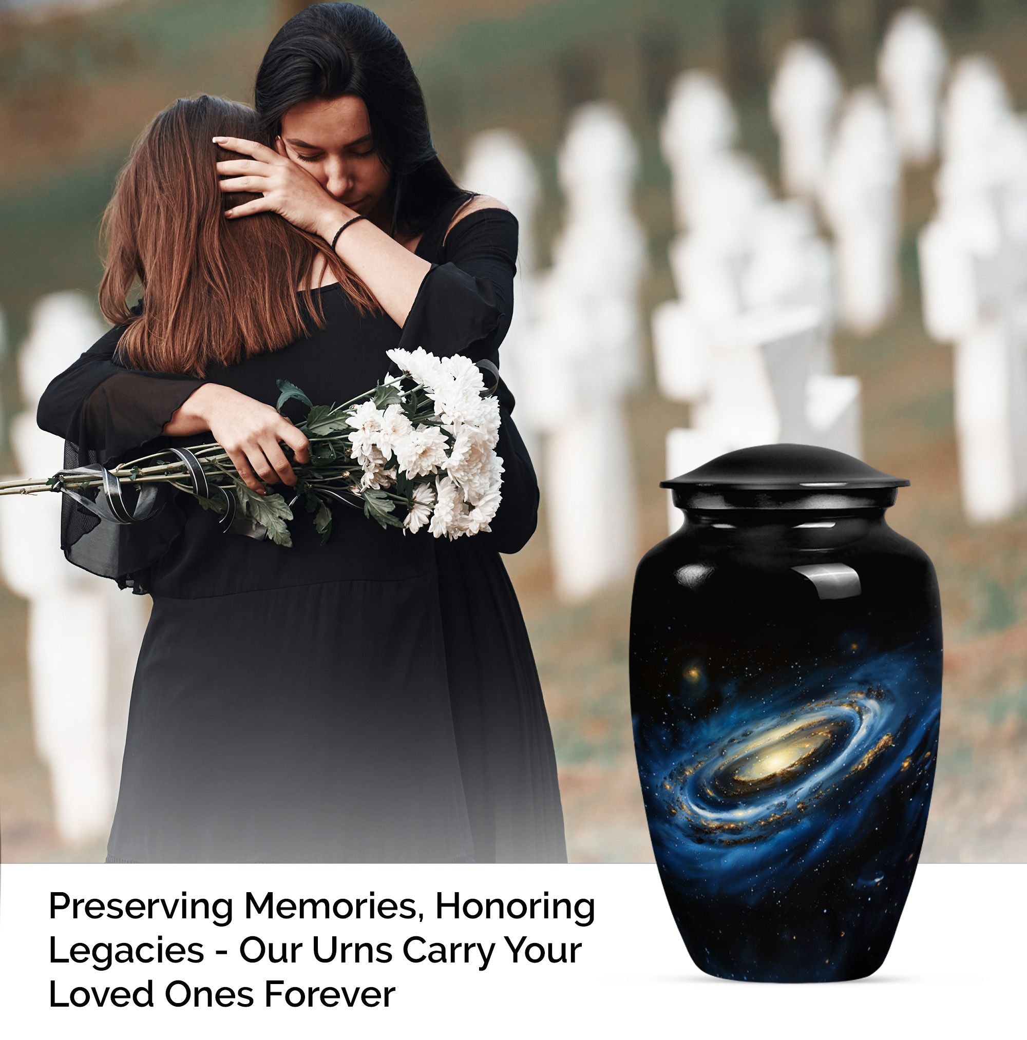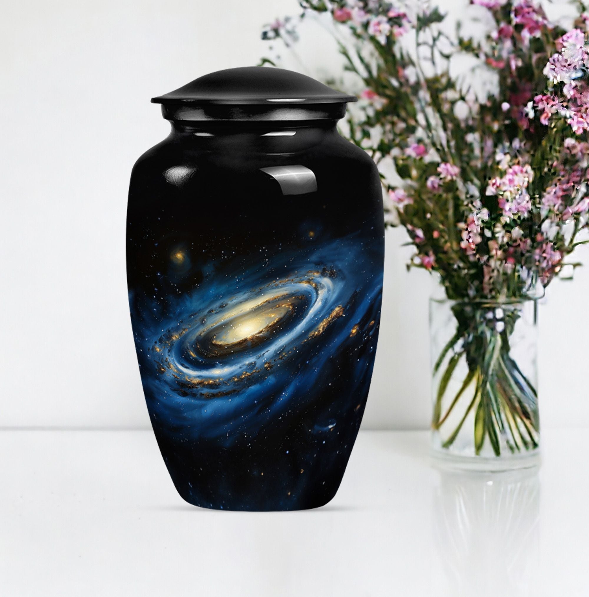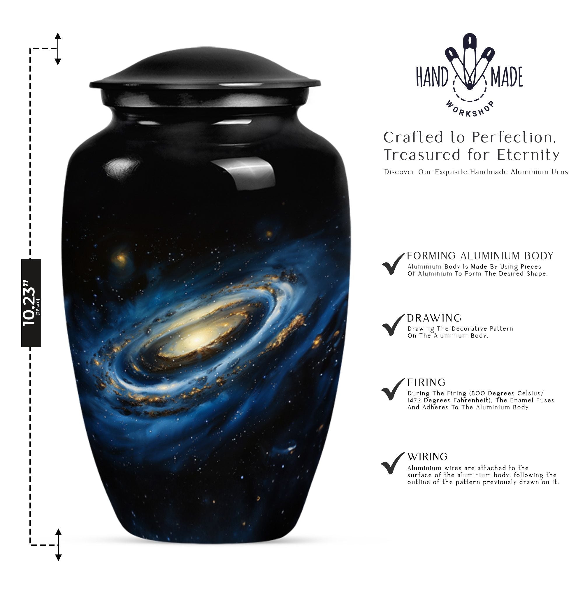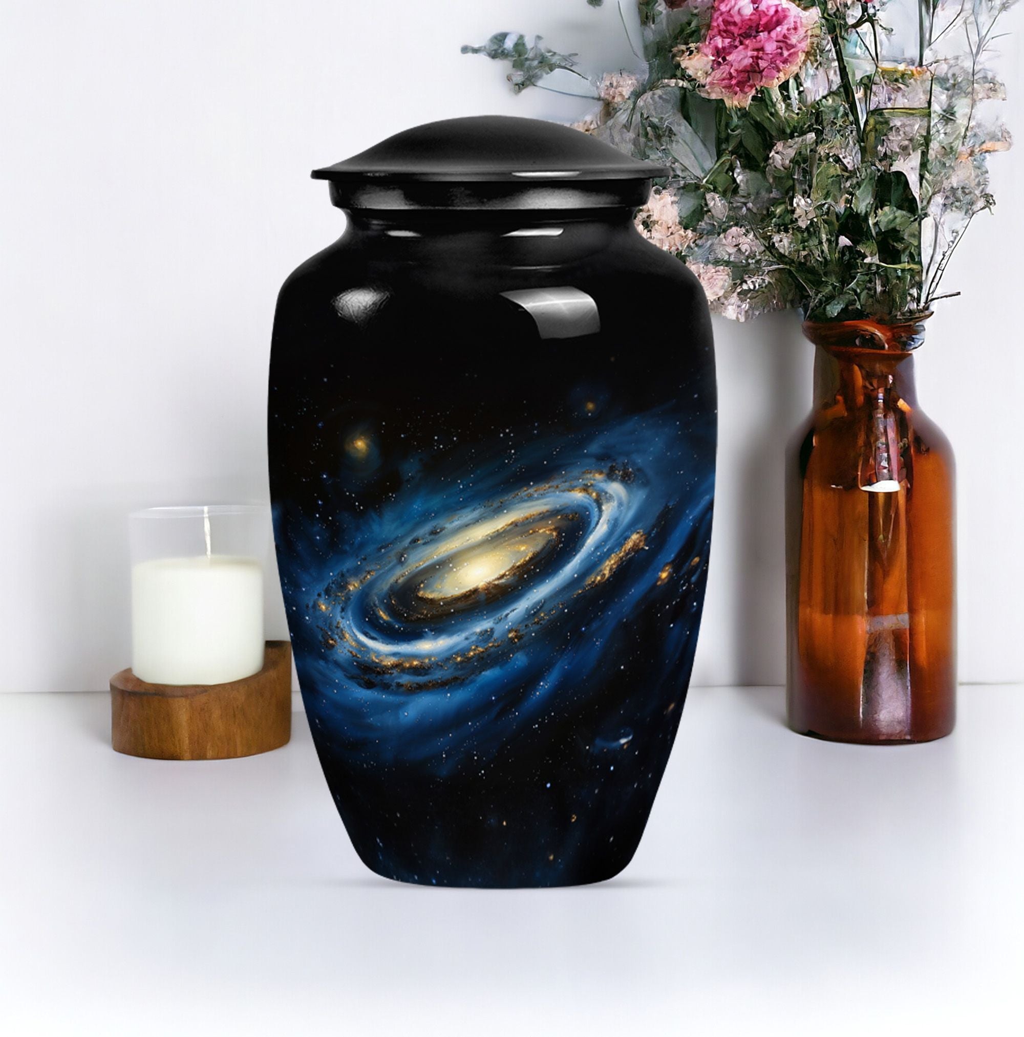 Introduce a sense of peace and serenity to a centenary rite with our Galaxy Urn. Crafted from robust aluminium, our majestic large urns serve as an elegant final resting place for the ashes of an adult. Measuring at ten inches in height with a capacity of 200 cubic inches, the Galaxy Urn is so much more than a mere memorial; it's a dignified reverence to the individual's spirit. It's weighty at 3.3 pounds, ensuring a steady placement. This cremation urn is delivered with a velvet pouch, providing a protective containment for the ashes. Personalize your Galaxy Urn with engraved names to create a unique and thoughtful memento. Boasting an abstract theme reminiscent of the vast cosmos, our funeral urns ideally celebrate a life well lived. With keywords like 'funeral urns for adult male dad', 'urn ash men', and 'memorial', our Galaxy Urn is more than a product; it's a companion during the harrowing journey of mourning.