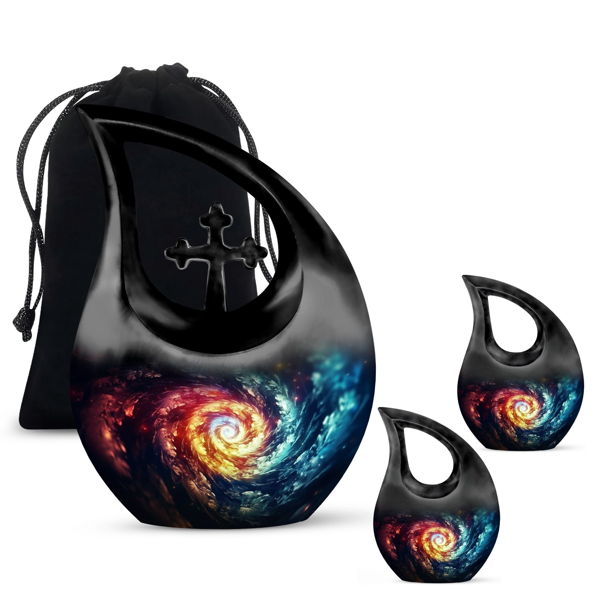 Crafted from durable aluminium, the full-size 10 inch urn showcases a swirling galaxy pattern illuminated with vibrant cosmic tones. Its generous capacity is perfect for those needing large urns for female & male, a dignified cremation urn adult male, or a graceful urn female adult option. The matching keepsake urns allow families to share ashes lovingly, making the set ideal for memorial ceremonies or home remembrance. A secure screw-top lid ensures long-term protection and peace of mind.