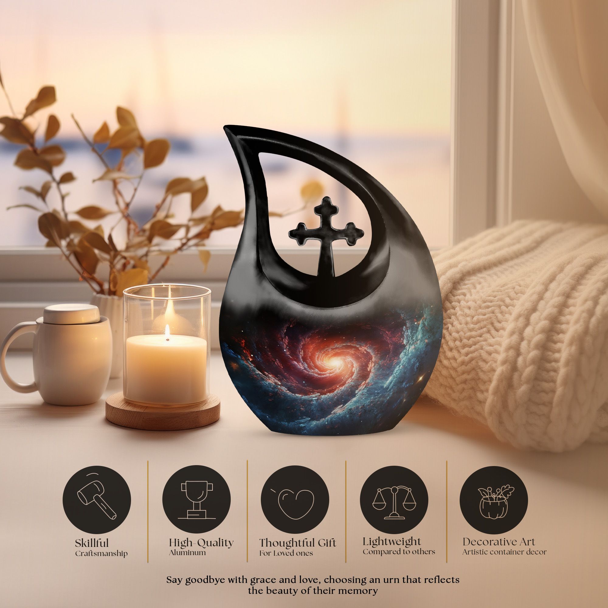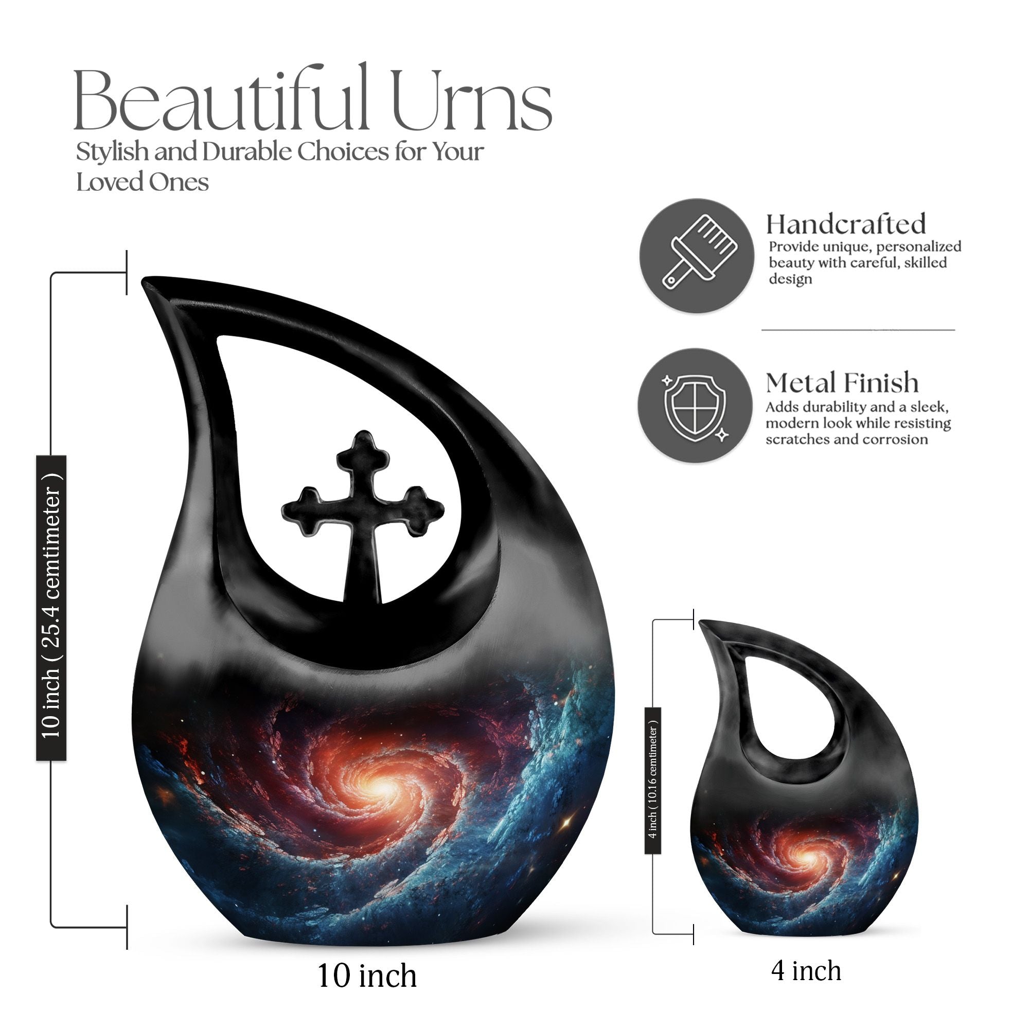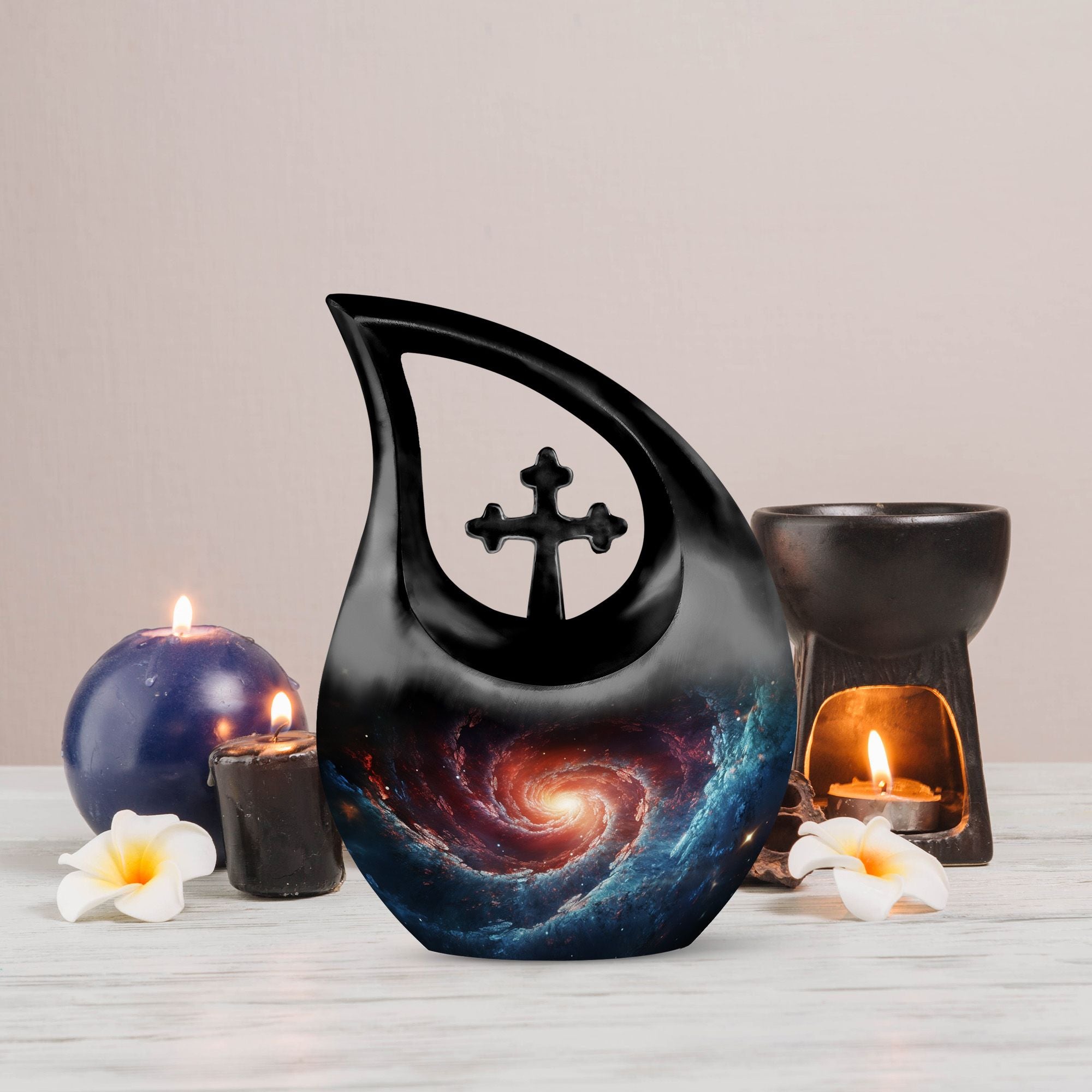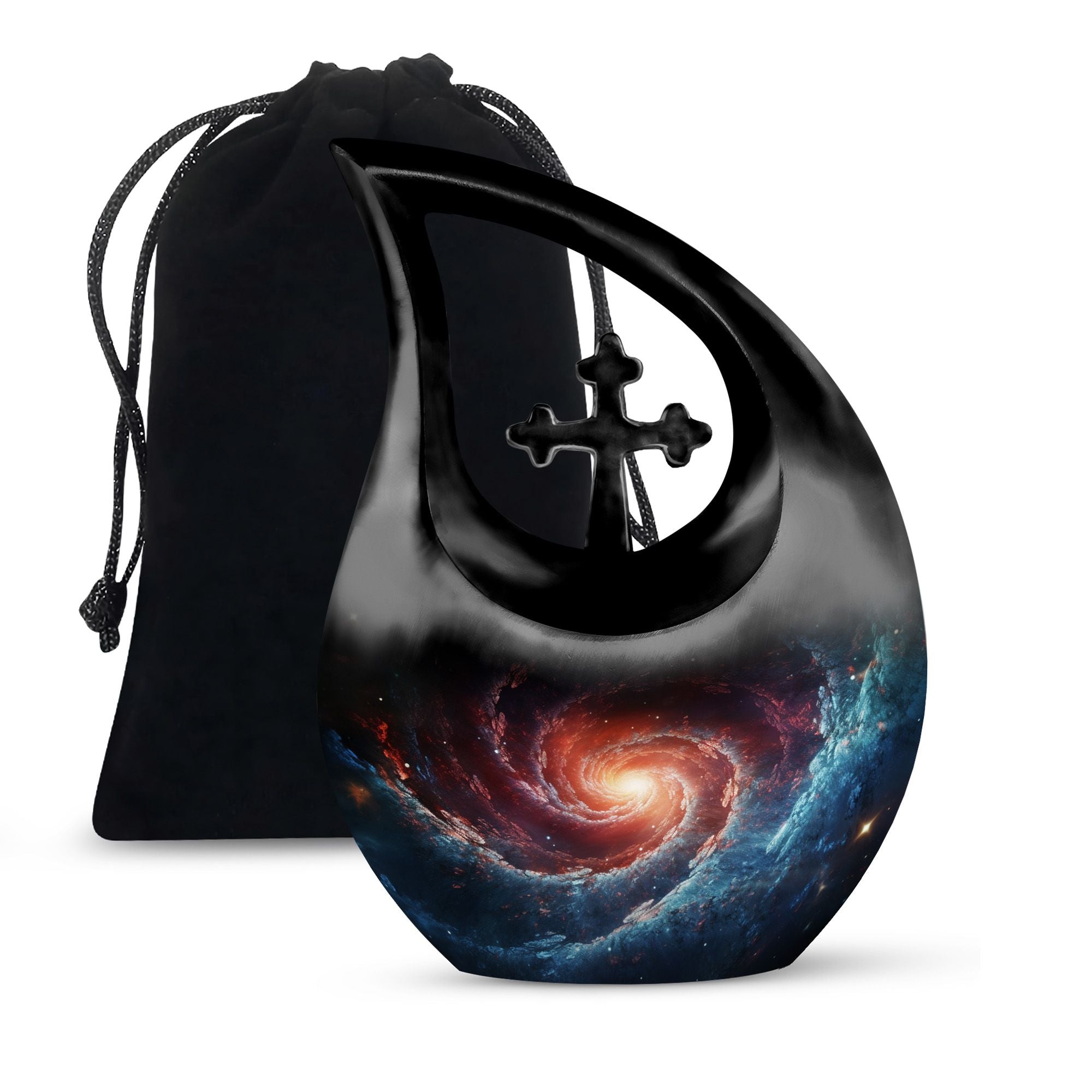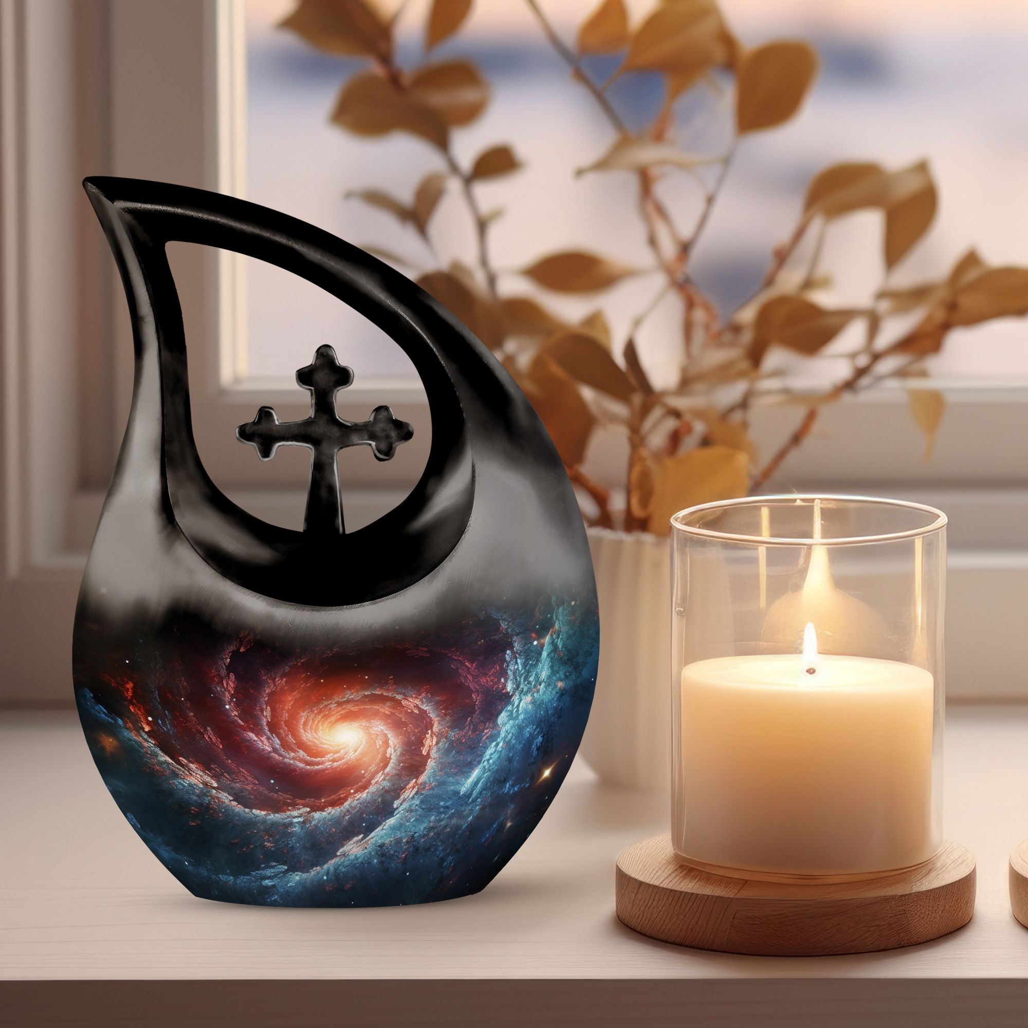 Honor your loved one with this Galaxy Spiral Themed Cremation Urn, a universe-inspired memorial symbolizing eternity, peace, and endless connection. Designed with compassion, it offers a meaningful tribute whether you need urns for human ashes women, funeral urns men, or a dignified burial urn men option.