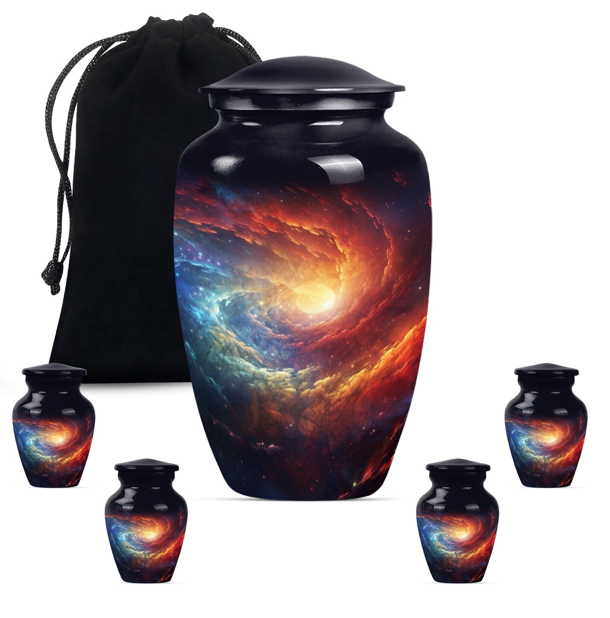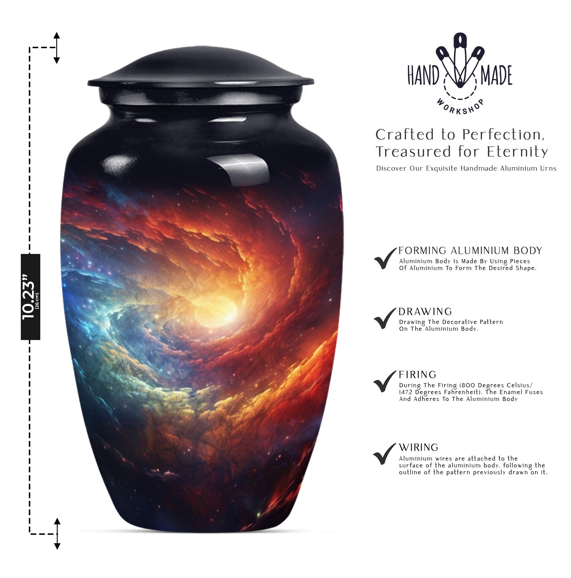 Experience a profound sense of peace and reassurance with our exclusive 10-inch Galaxy Urn, a supreme choice in memorial urns designed with utmost sensitivity and thoughtfulness. Majestically standing at 10 inches high and weighing 3.3 pounds, this substantial large urn is meticulously crafted from the finest aluminium. Its 200 cubic inches capacity generously contains the cherished ashes, gently cocooned within a velvet pouch provided in the package. Feel the calming resonance of the Purple Meadow theme bestowing solace during the time of loss. The jewel in the crown is the availability of personalizing this burial custom urn with engraved names, adding a deeply personal touch to this last tribute. Despite its impressive stature, this cremation dad urn, cratering to both men and women, subtly slides into its nook, leaving a lasting imprint of memories. This large urn with a classical design merges the worlds of strength, beauty, and remembrance, universally recognized among urns for human ashes. Please note, the design attribute is undisclosed.