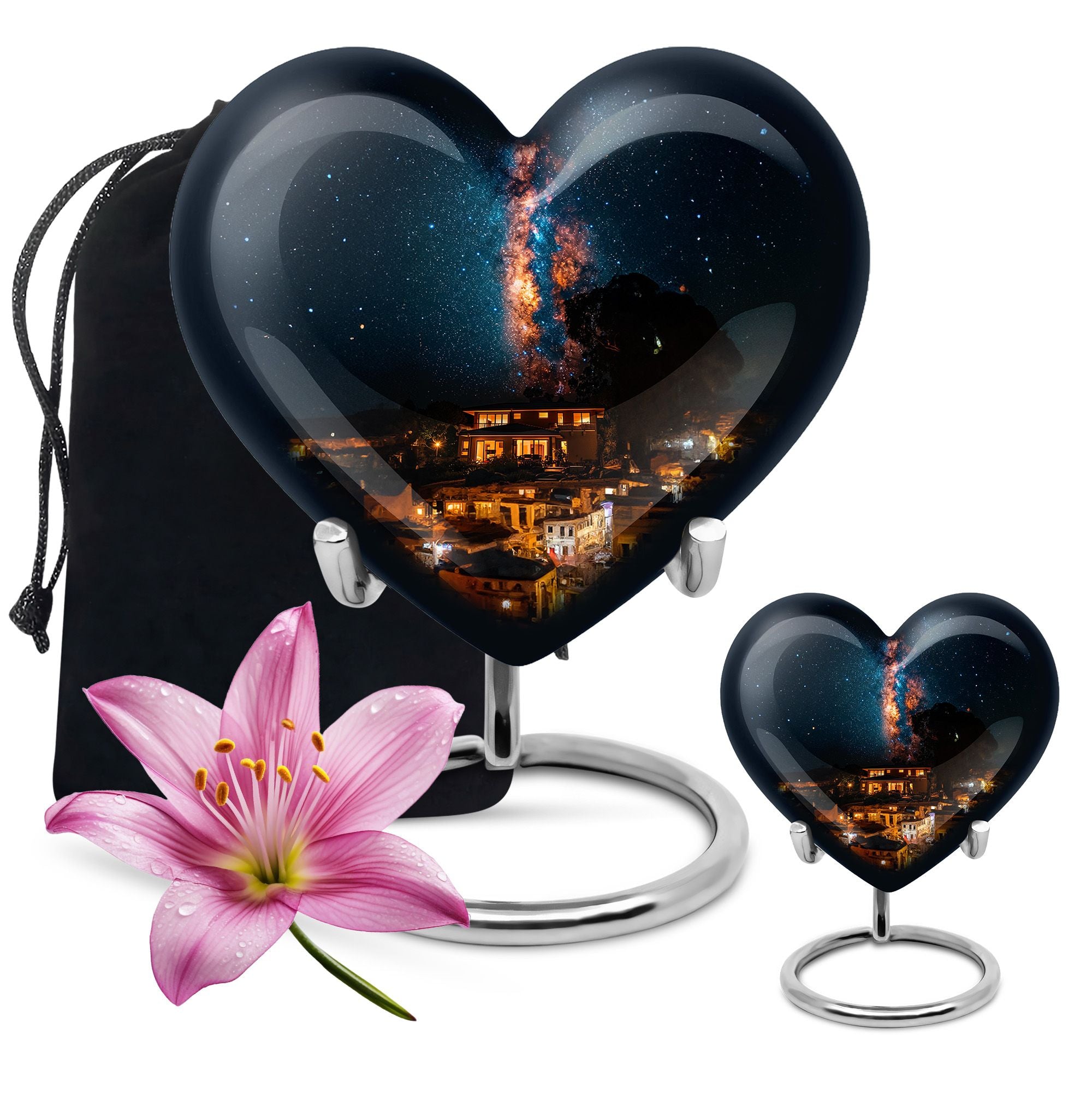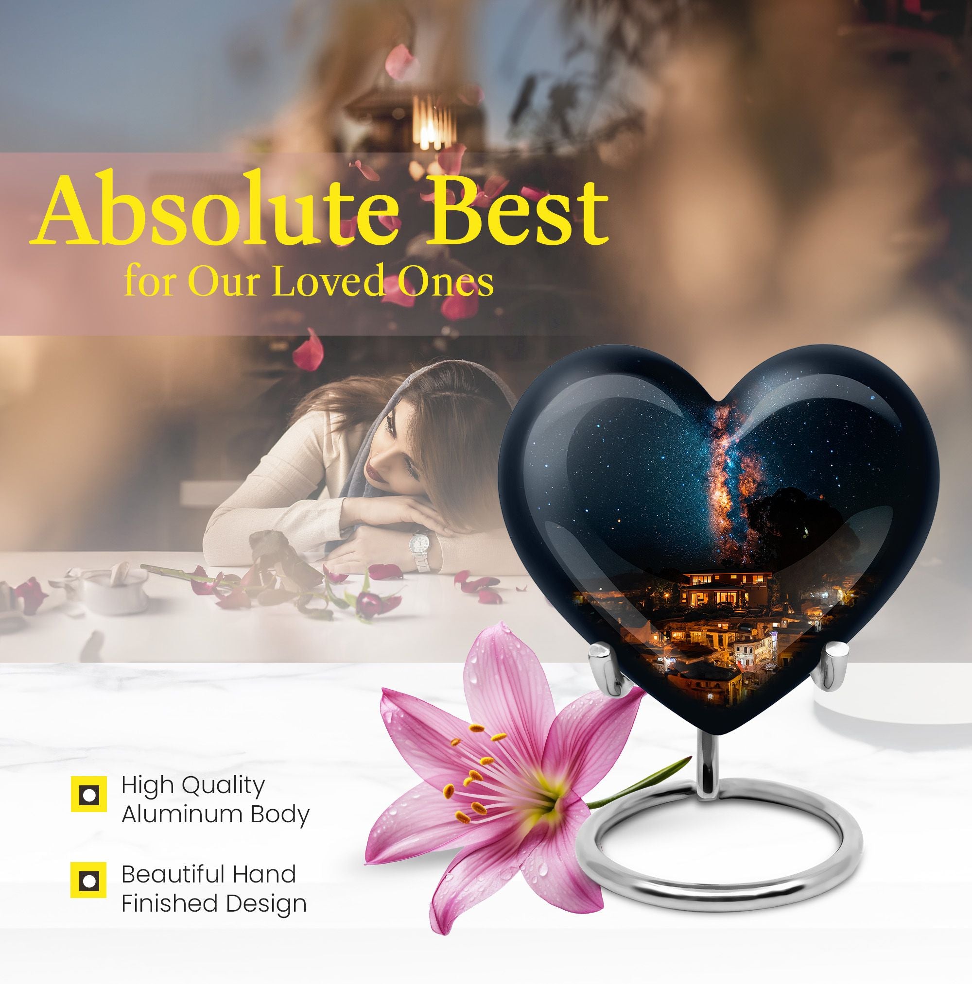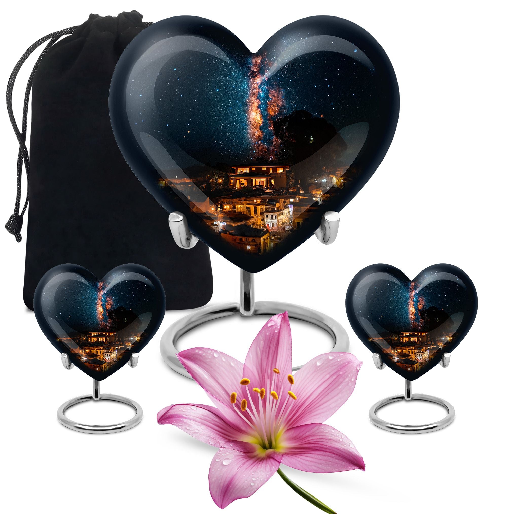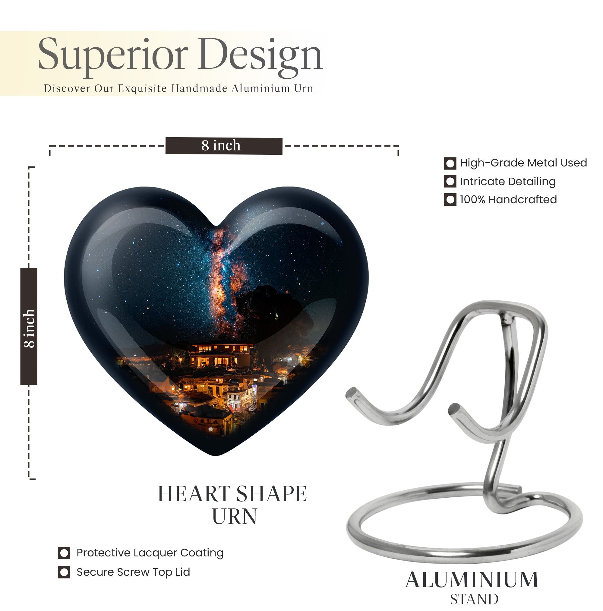 Embrace the symbolism of eternity with our Galaxy Urn, a compelling large urn rendered in high-quality aluminium. Towering at 10 inches in height and weighing 3.3 pounds, this cremation urns perfectly balances robustness with an air of celestial lightness. The capacity of 200 cubic inches assures ample space for human ashes, providing a cherished resting place for your loved one. An abstract theme furthers the uniqueness of this urn, making it a distinct choice among conventional funeral urns for women and men alike. The package also includes a velvet pouch for tasteful containment of ashes, fostering a sense of warmth and respect for your dear departed. With the option to personalize these urns with engraved names, you can make sure they serve as an enduring testament to the unique bond you shared. This cremation urn represents an exceptional choice for those seeking distinctiveness and peace in memorial ceremony supplies. Keywords: Galaxy Urn, cremation urn, funeral urns ashes, large urns, aluminium, heart urn.
