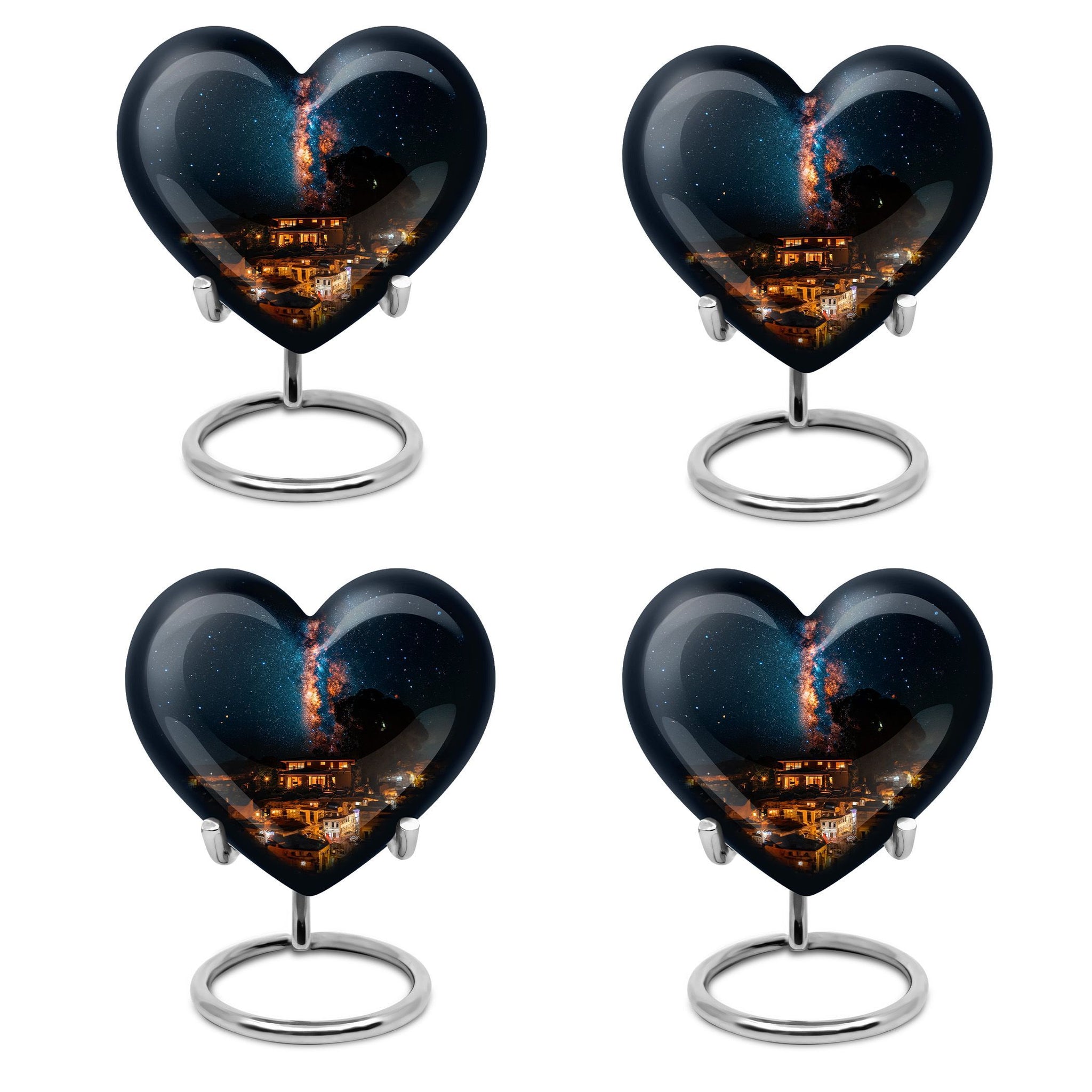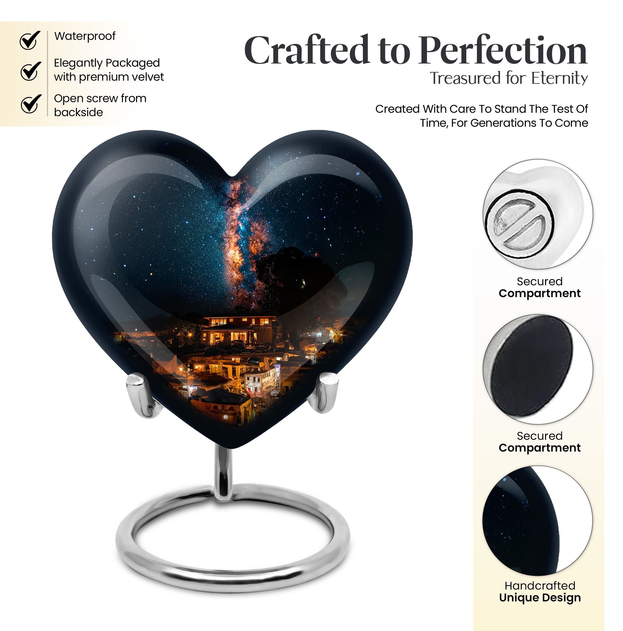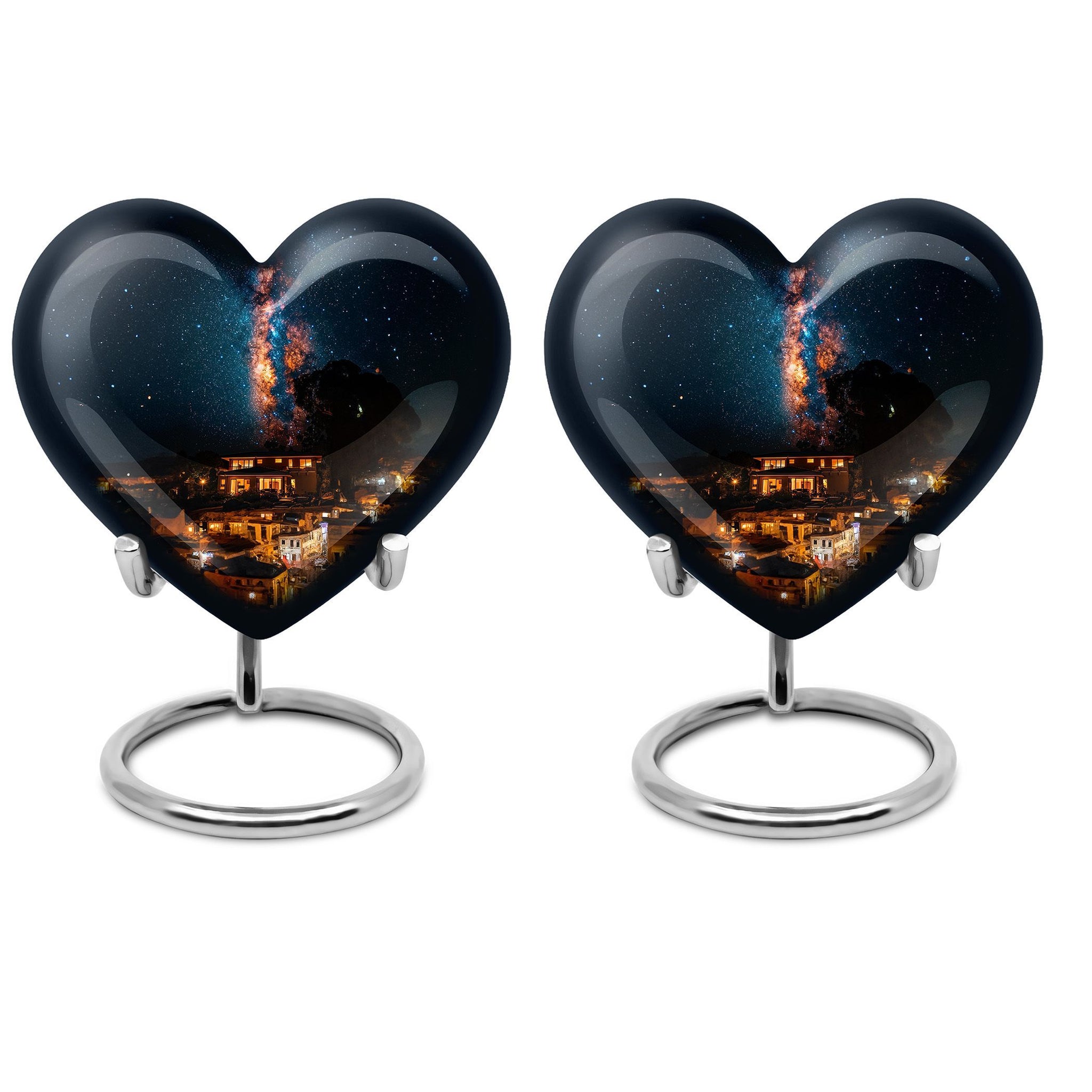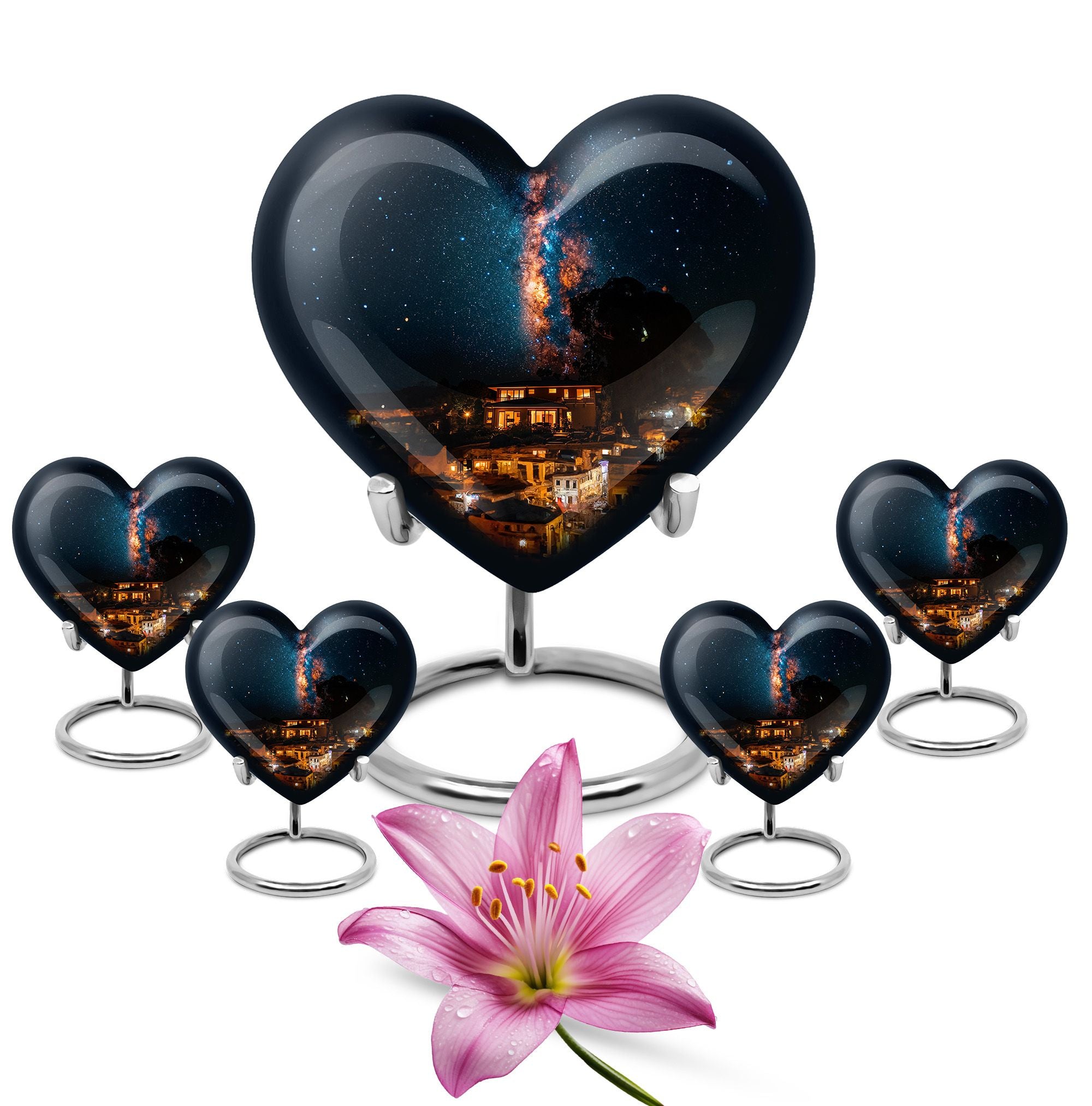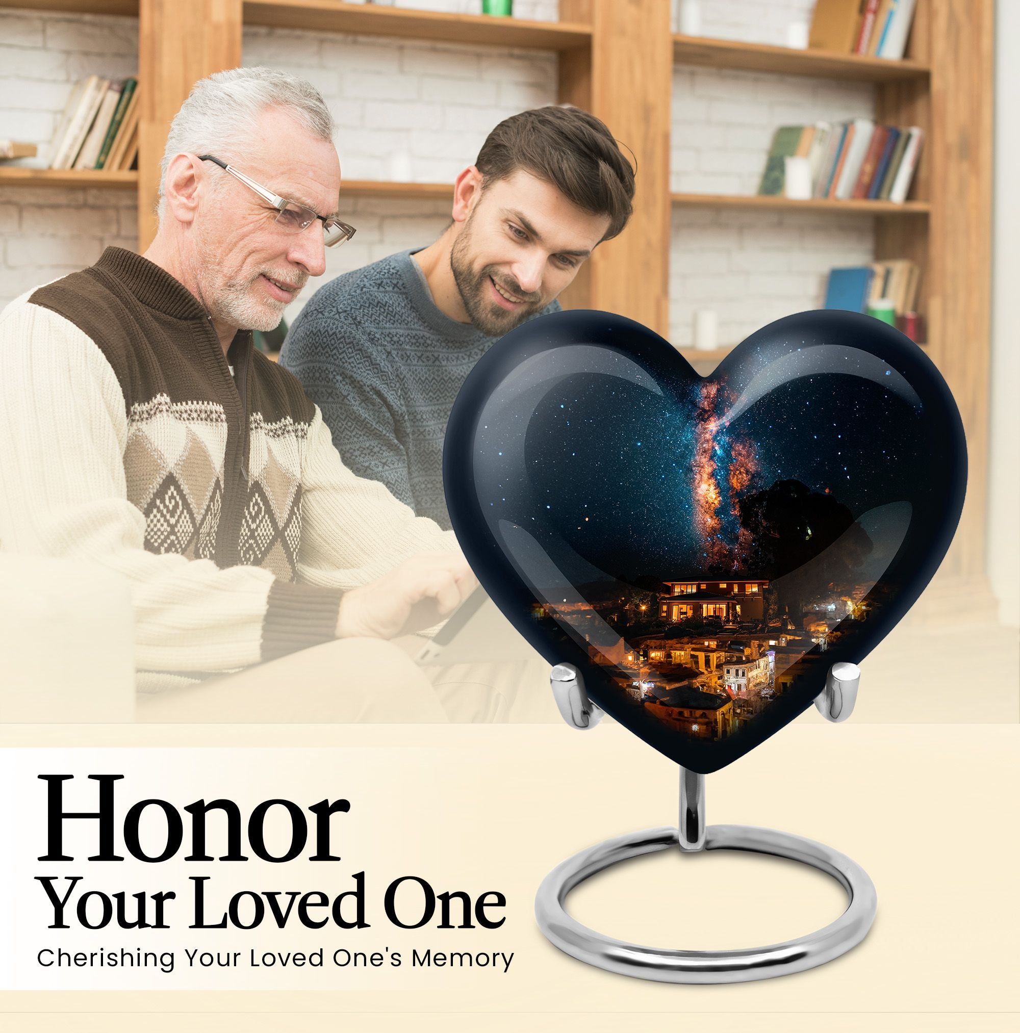 Embrace the symbolism of eternity with our Galaxy Urn, a compelling large urn rendered in high-quality aluminium. Towering at 10 inches in height and weighing 3.3 pounds, this cremation urns perfectly balances robustness with an air of celestial lightness. The capacity of 200 cubic inches assures ample space for human ashes, providing a cherished resting place for your loved one. An abstract theme furthers the uniqueness of this urn, making it a distinct choice among conventional funeral urns for women and men alike. The package also includes a velvet pouch for tasteful containment of ashes, fostering a sense of warmth and respect for your dear departed. With the option to personalize these urns with engraved names, you can make sure they serve as an enduring testament to the unique bond you shared. This cremation urn represents an exceptional choice for those seeking distinctiveness and peace in memorial ceremony supplies. Keywords: Galaxy Urn, cremation urn, funeral urns ashes, large urns, aluminium, heart urn.
