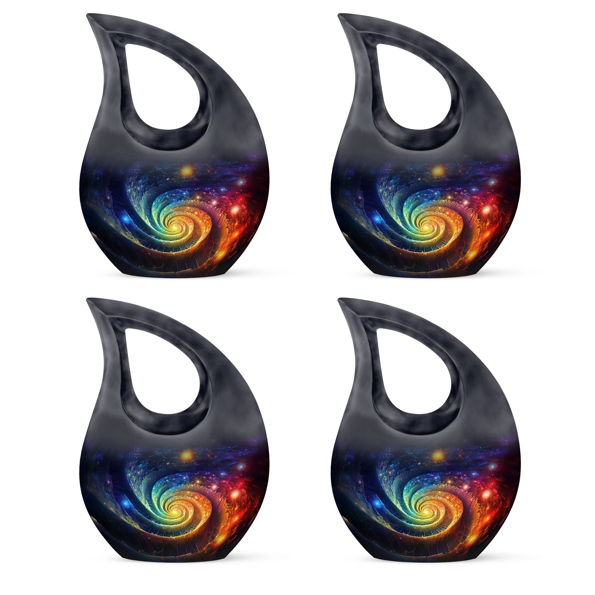 Immerse yourself in a tranquil expression of love and respect with our Galaxy Urn, a large embodiment of our cosmic journey's end. Crafted meticulously from high-grade aluminium, this cremation urn weighs a sturdy 3.3 pounds and features a scenic 'Cross Drop' theme that adds a serene touch to any memorial service. With its 200 cubic inch capacity, it is perfectly suited to uphold the ashes of your dearly departed, fitting seamlessly within the provided velvet pouch. This 10-inch urn allows for a heartfelt personal touch with the option for engraved names, making your tribute wholly unique. Our Galaxy Urn is more than a simple urn vase; it's a celestial testament to the once vibrant life it now holds. Excellently categorized under 'cremation urns for burial' and 'memorial urns', it's designed to reflect your eternal respect and affection. Despite its large size, it could still be considered as a part of 'small urns for human ashes'; thus, catering a wide-range of consumer needs. This artful, cosmic urn delights those seeking 'urns for human remains' or 'cremation urns for sale' and stands as a gentle reminder of our shared human experience.