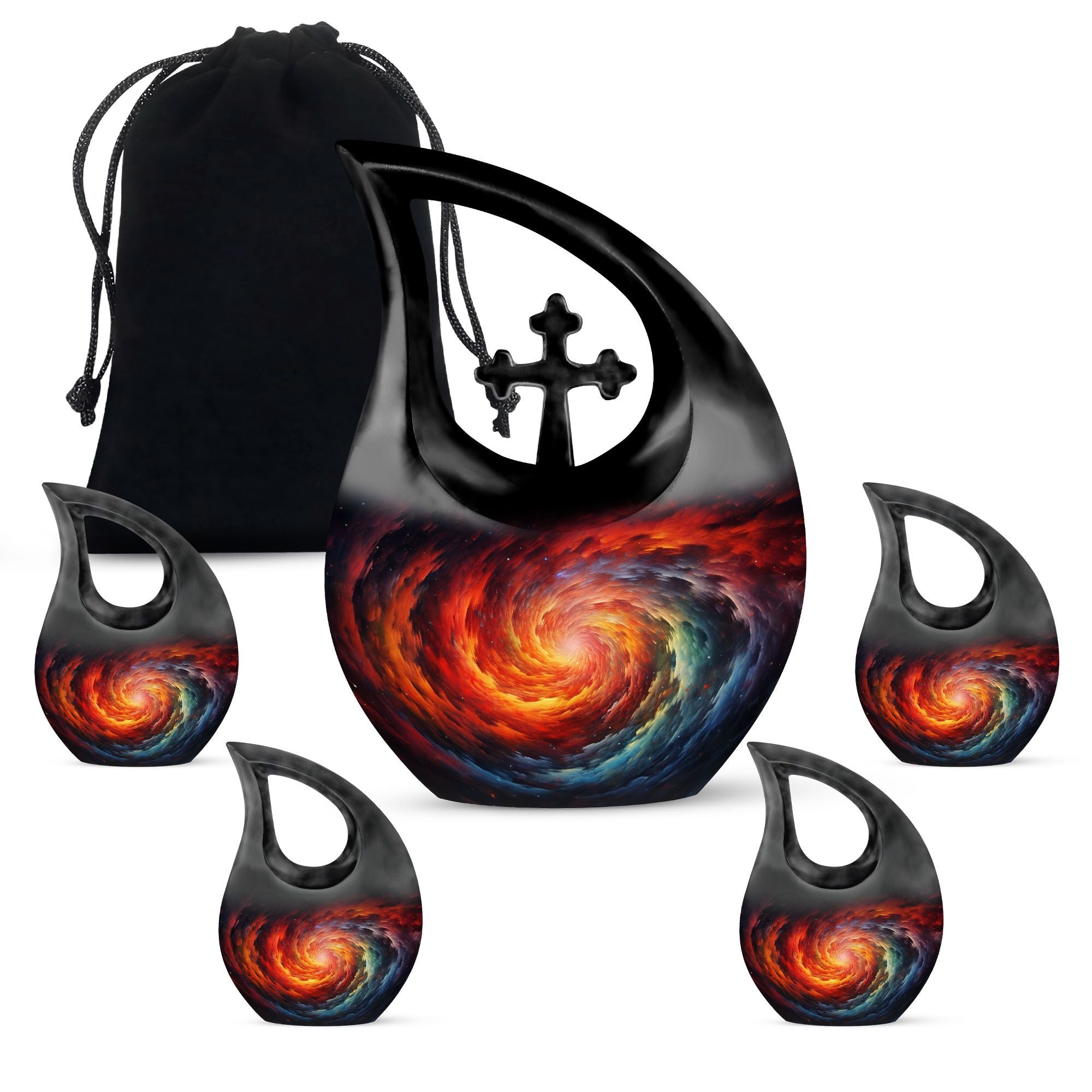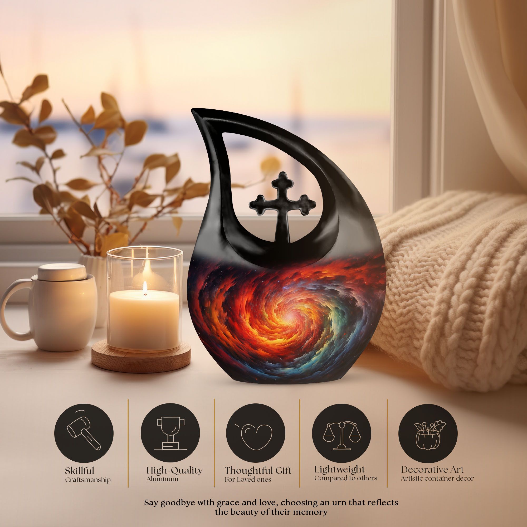 Immerse yourself in a world of serene tranquility with our enchanting Galaxy Urn. This unique cremation keepsake exudes an aura of profound resonance with a cross drop affixed to its front. Meticulously crafted from high-quality aluminum, this substantial large urn measures 10 inches and weighs 3.3 pounds, perfectly suited to cradle 200 cubic inches of ashes. The thoughtful capacity makes it an impeccable choice among Large Urns and keepsake urns for human ashes. Each unit comes with a velvety pouch to carefully contain your loved one's ashes, enhancing its emotional appeal for memorial ceremonies. Furthermore, we offer to personalize the urn with engraved names, turning it into a heartwarming tribute to your loved ones now resting in peace. If you're seeking superior cremation urns for sale or small urns for human ashes, look no further than our transcendent Galaxy Urn—a celestial home for your cherished memories.