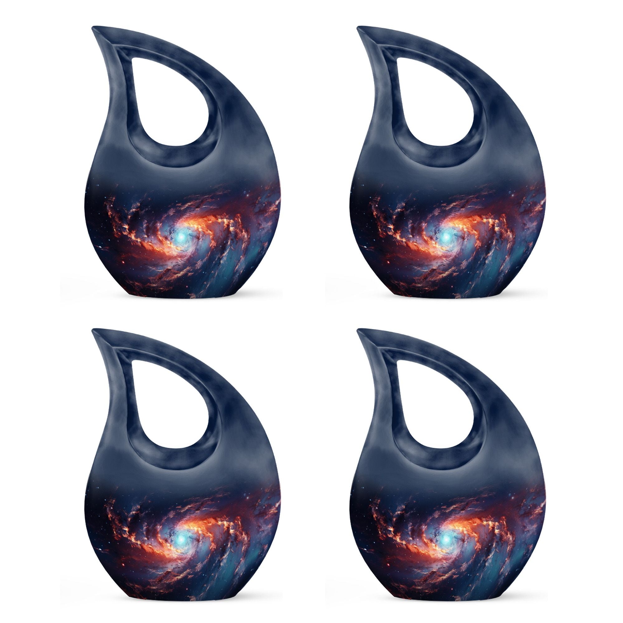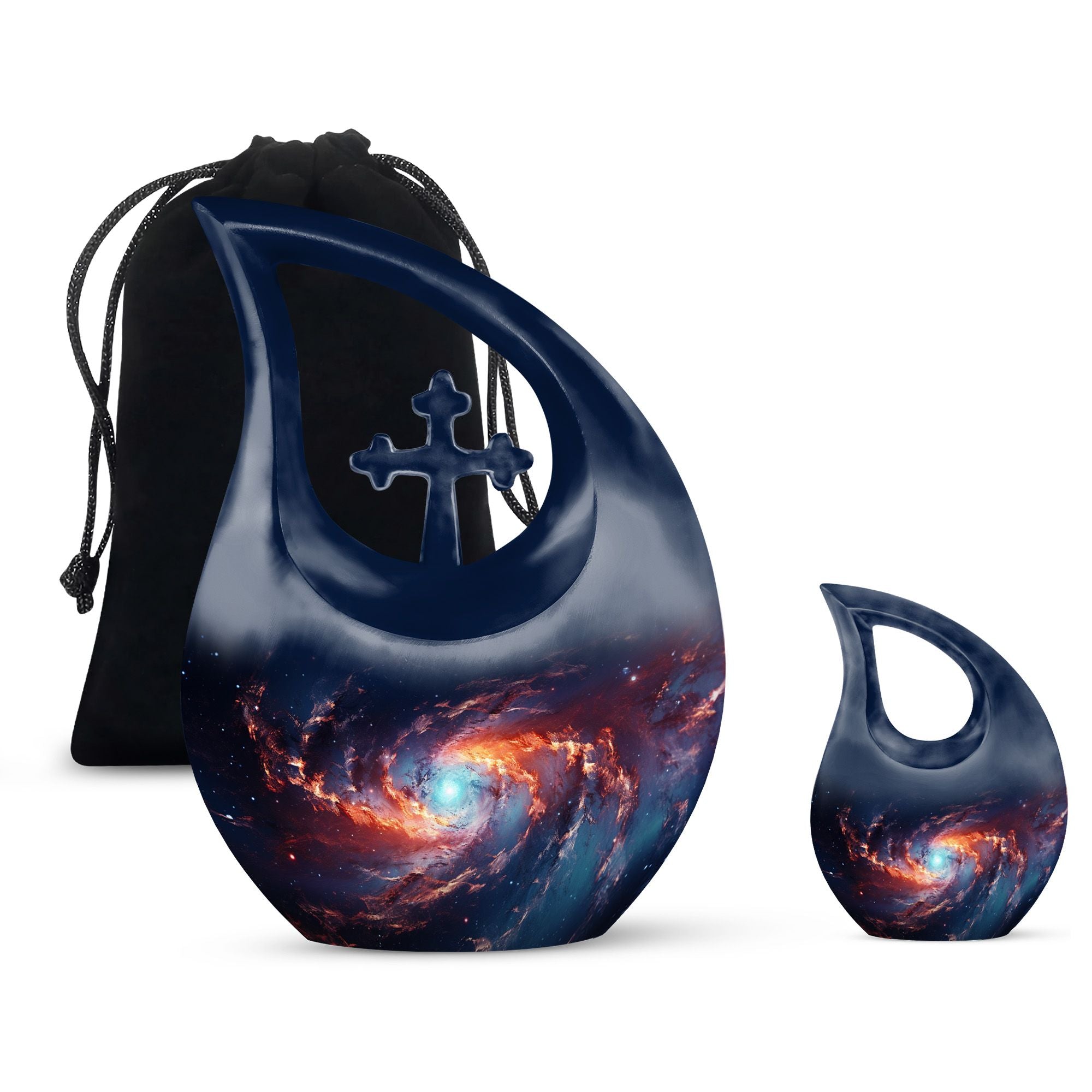 The Galaxy Swirl design is also suitable for ground placement, making it a thoughtful option for urn for burial in ground, burial urns for ground, urns for burial in ground, or cremation urns for burial. Families who wish to share ashes may choose complementing funeral keepsake urns for a unified memorial experience.