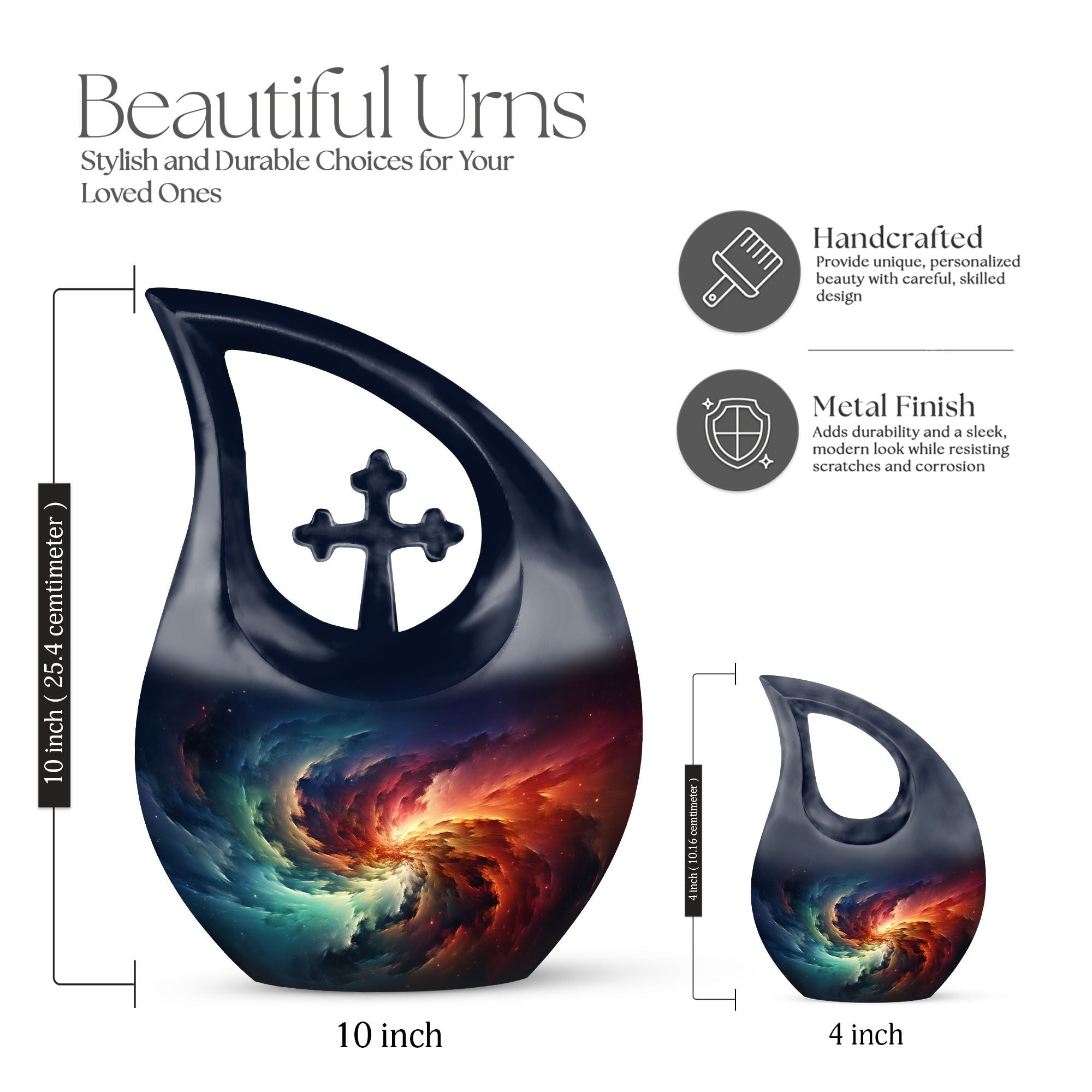 Expertly handcrafted from premium aluminum, this large decorative urn for human ashes features a luminous cosmic spiral pattern of deep purples, blues, and shimmering gold dust. The design radiates tranquility, while the polished finish adds elegance to any memorial display. Each urn for ashes for women or cremation urn for men includes a secure screw-top lid, ensuring ashes are kept safe and preserved with love.