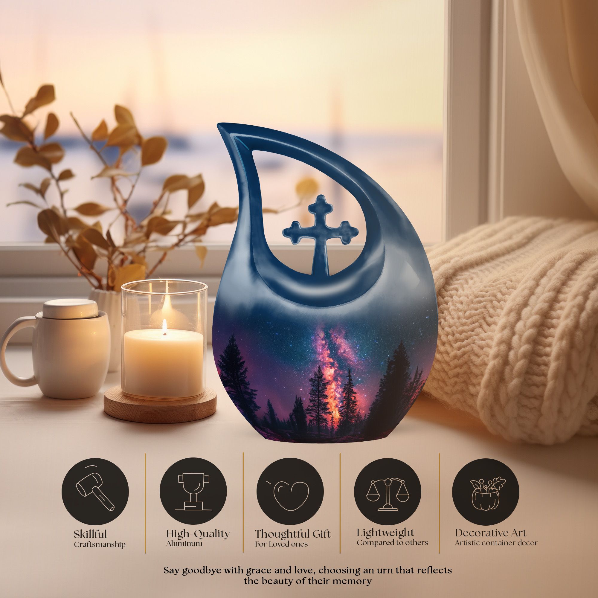 Crafted from durable aluminium, this 10 inch urn features a luminous galaxy pattern in deep blues and violets, symbolizing eternal connection. Its secure construction ensures long-term protection, making it suitable for those seeking adult urns for human ashes women, urn for men & women, or ashes keepsake for men to accompany the main vessel. Families who prefer to share ashes will find it pairs perfectly with mini small urns for men or a mini urn for ashes for women, as well as keepsakes for women used to create multiple remembrance spaces.