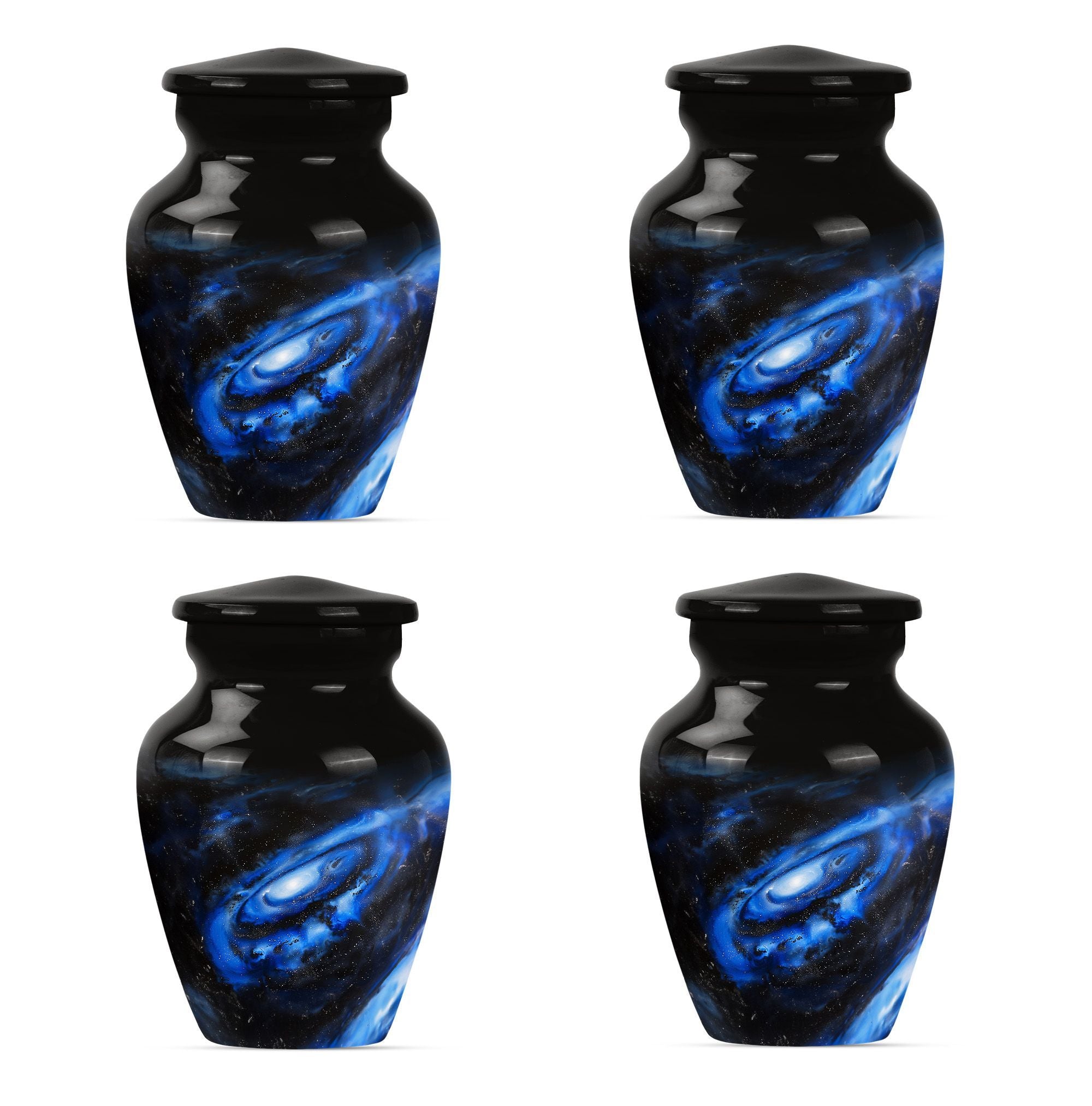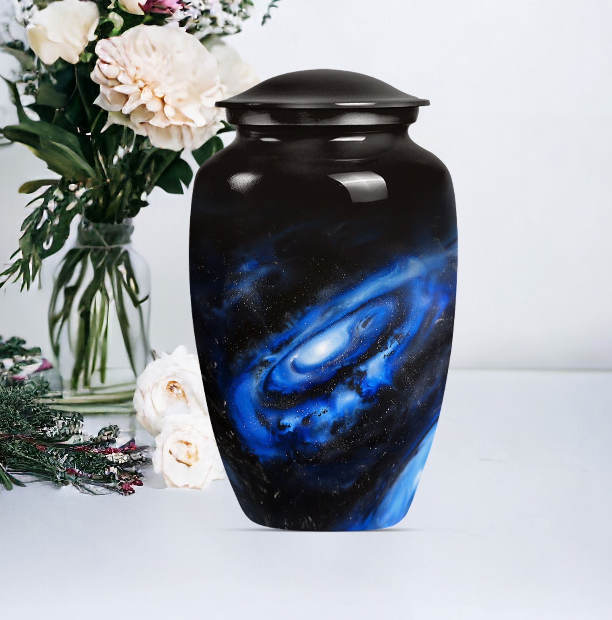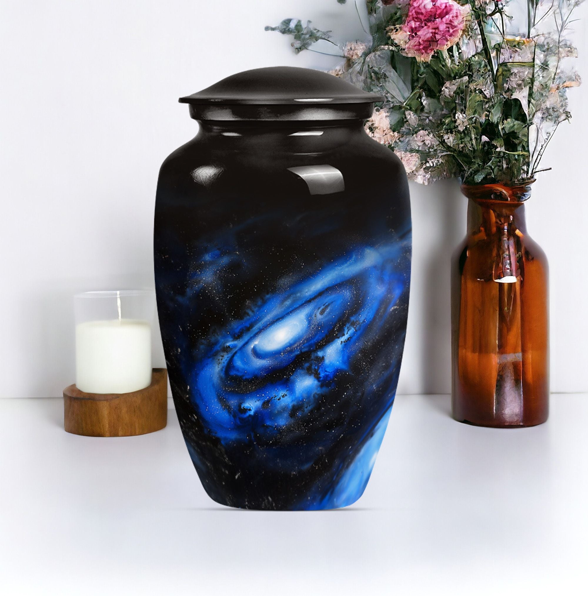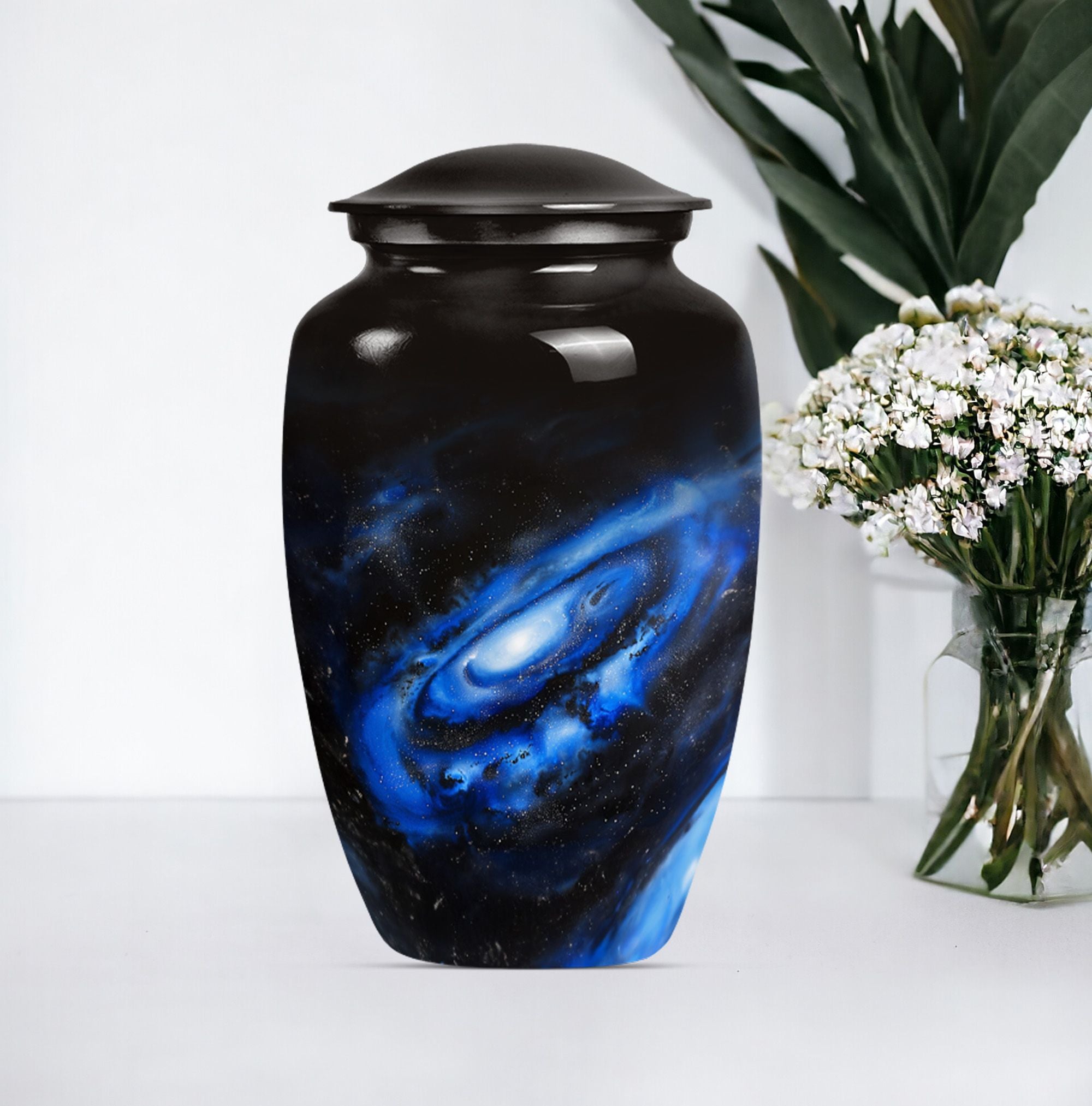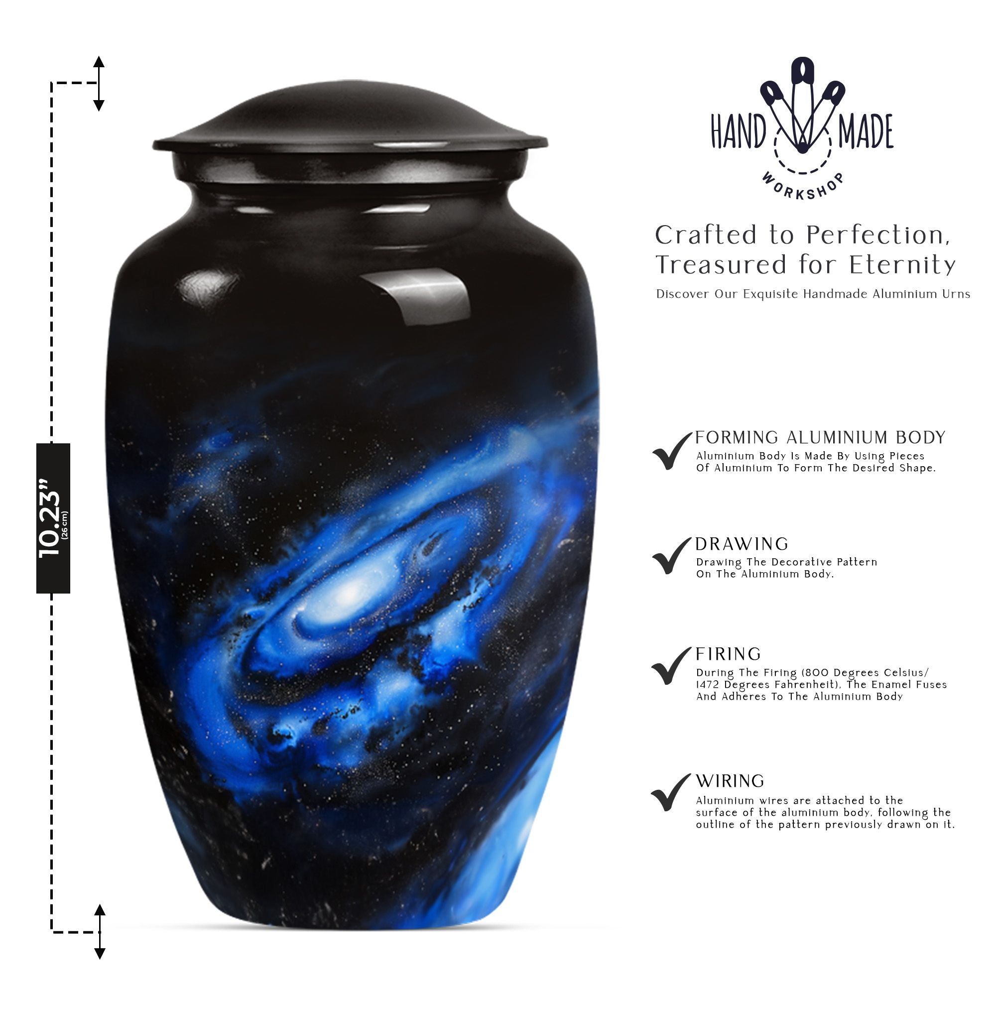 Our captivating Galaxy Urn offers a unique and endearing way to revisit memories of your cherished ones. Sized at a substantial 10 inches, it's perfect choice for a funeral urn for ashes for women or urns for adult males. Crafted from high-quality aluminium, the weight of this sizeable urn is a robust 3.3 pounds, reflecting the substance and grandness of the memories it protects. This cremation urn offers a generous capacity of 200 cubic inches and comes with a velvet pouch for convenient containment of ashes. The theme transcribes to a serene 'Purple Meadow', complementing the classic urn style and providing an atmosphere of tranquil remembrance. We also offer customization options, allowing you to personalize with engraved names, adding a heartfelt touch to this burial urn. This purchase includes more than just a box; it provides comfort and a timeless keepsake. Please note: our large urns are not just memorial ceremony supplies, they're treasured mementos designed to respect and honor your loved ones.