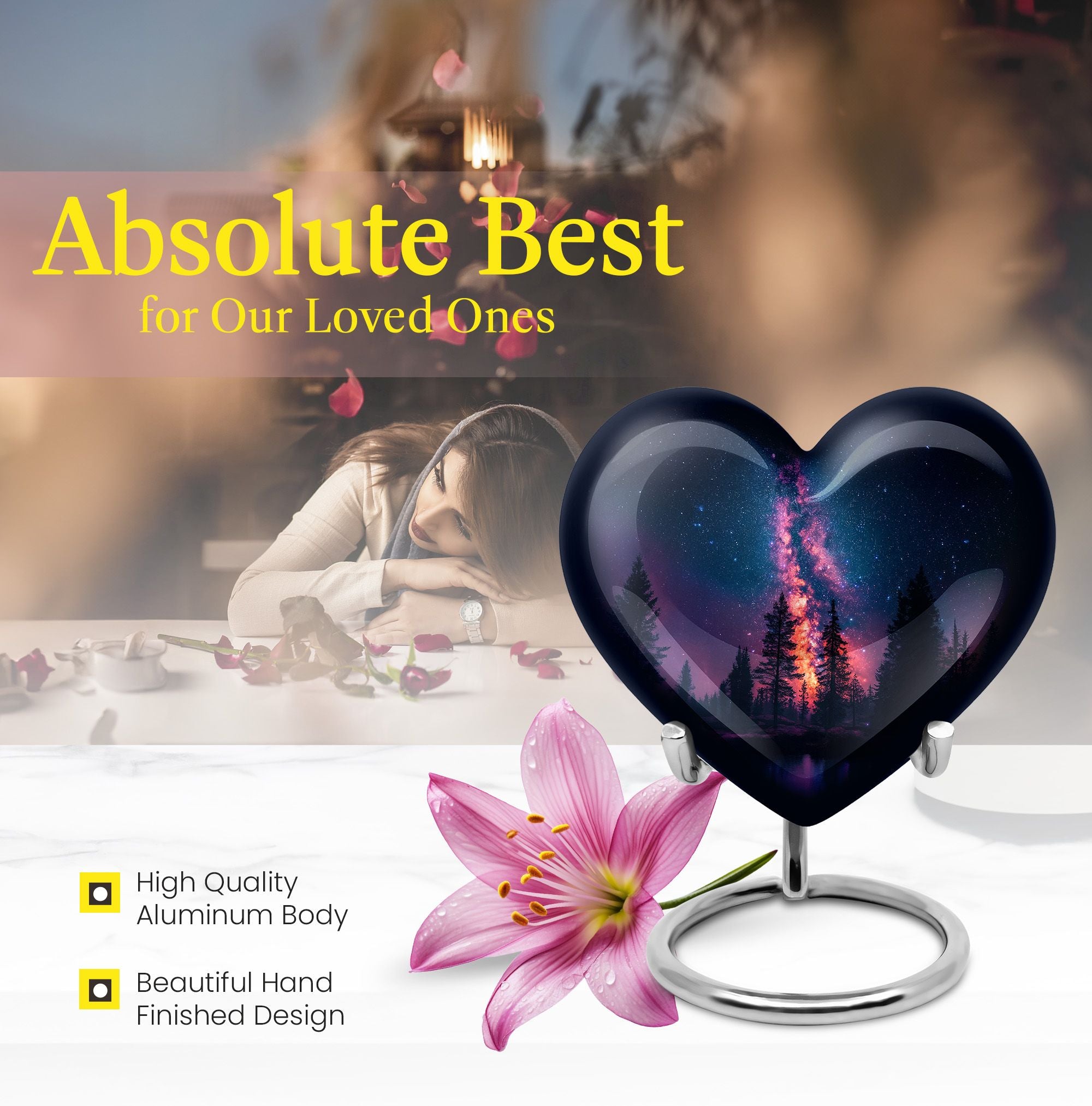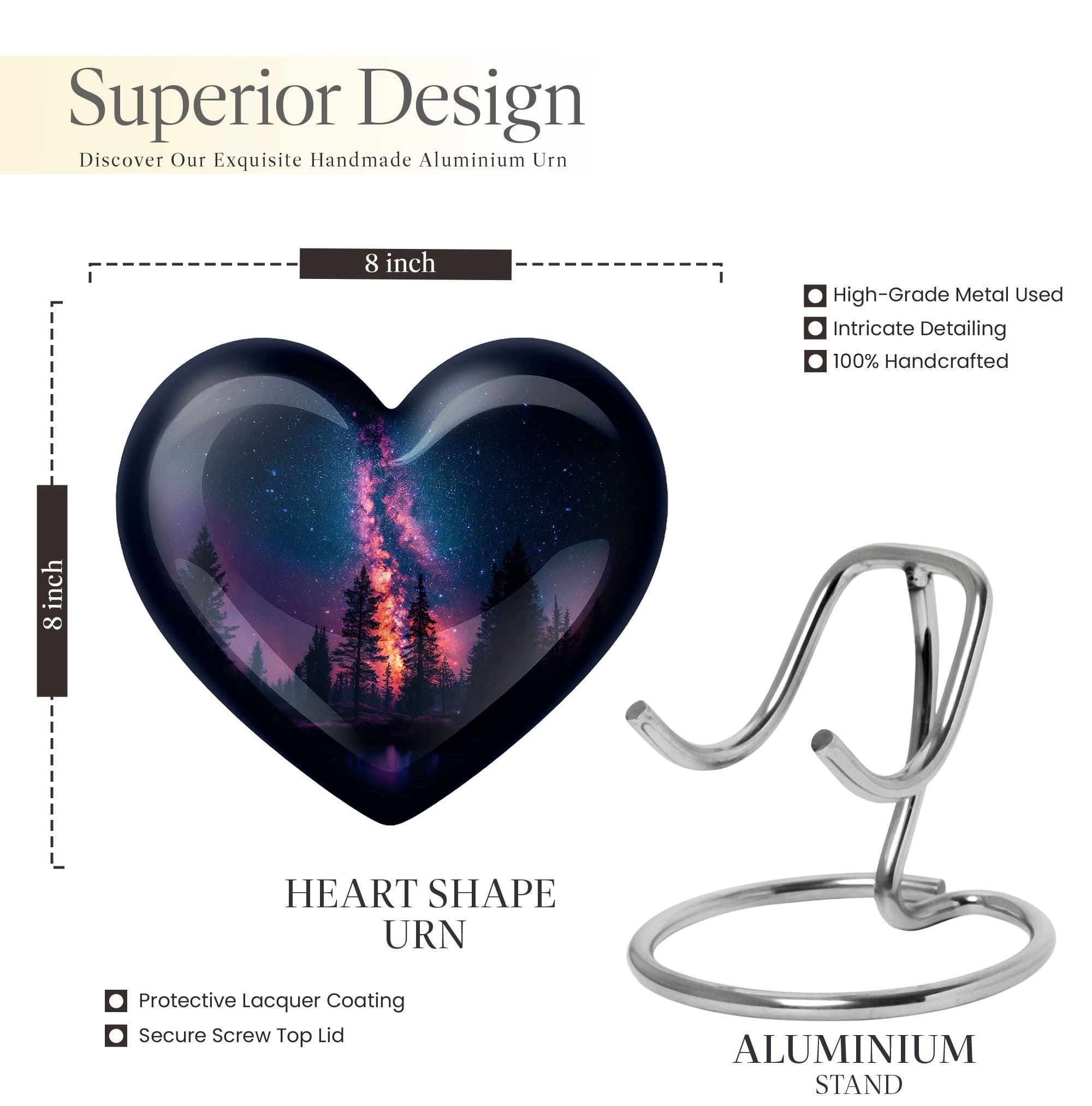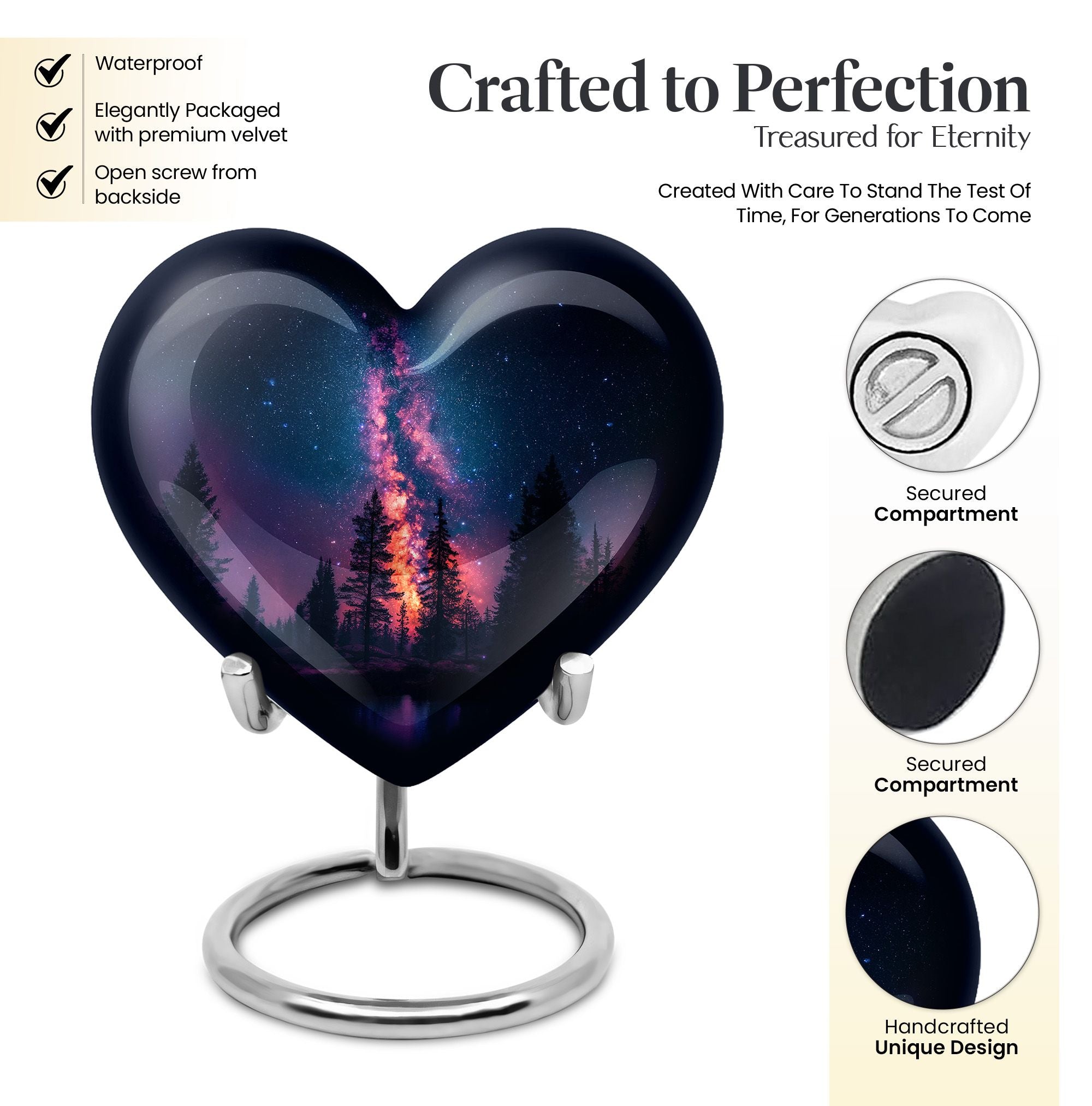 Discover the heartfelt elegance of our 10-inch Galaxy Urn, an exquisite choice for memorial ceremony supplies. Crafted from durable aluminium, this 'Large Urns' category piece resonates with an abstract theme, blurring the line between sentimentality and art. Weighing a solid 3.3 pounds, our cremation funeral urn secures your treasured ashes flawlessly. Moreover, it has a 200 cubic inch capacity, ensuring a generous containment for your loved one's remains. Personalize this urn with engraved names for an added layer of uniqueness. Its compact dimensions, 10 inches in height, make it suitable for various memorial displays. Upon your purchase, this cremation urn comes with a velvet pouch for secure ashes containment, providing an added layer of respect for your loved one's remains. As a standout in funeral decorative urns, our conventional Galaxy Urn captures the essence of human urn ashes delicately. Remember, nothing is ordinary when to comes to commemorating special lives!