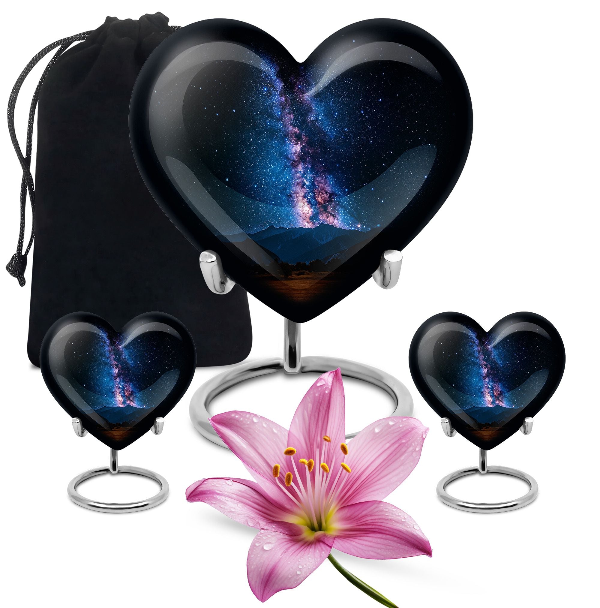 Experience a heartfelt way to remember your loved ones with our Galaxy Urn. This 10-inch large urn has a unique abstract theme, crafted meticulously from aluminium ensuring durability and longevity. Weighing in at 3.3 pounds, this cremation urn is large enough to hold up to 200 cubic inches of ashes. Not just an urn, but a piece of art resonating with the affection you hold for the departed. Each urn comes with a velvet pouch offering a dignified containment for the ashes. As an added touch, personalize your urn with engraved names, giving it an even more profound meaning. Ideal for both male and female ashes, this funeral urn will serve as a beautiful memory for a lifetime, instead of just an urn for ashes. Get your Galaxy Urn today - an apt tribute for the immense love you hold.