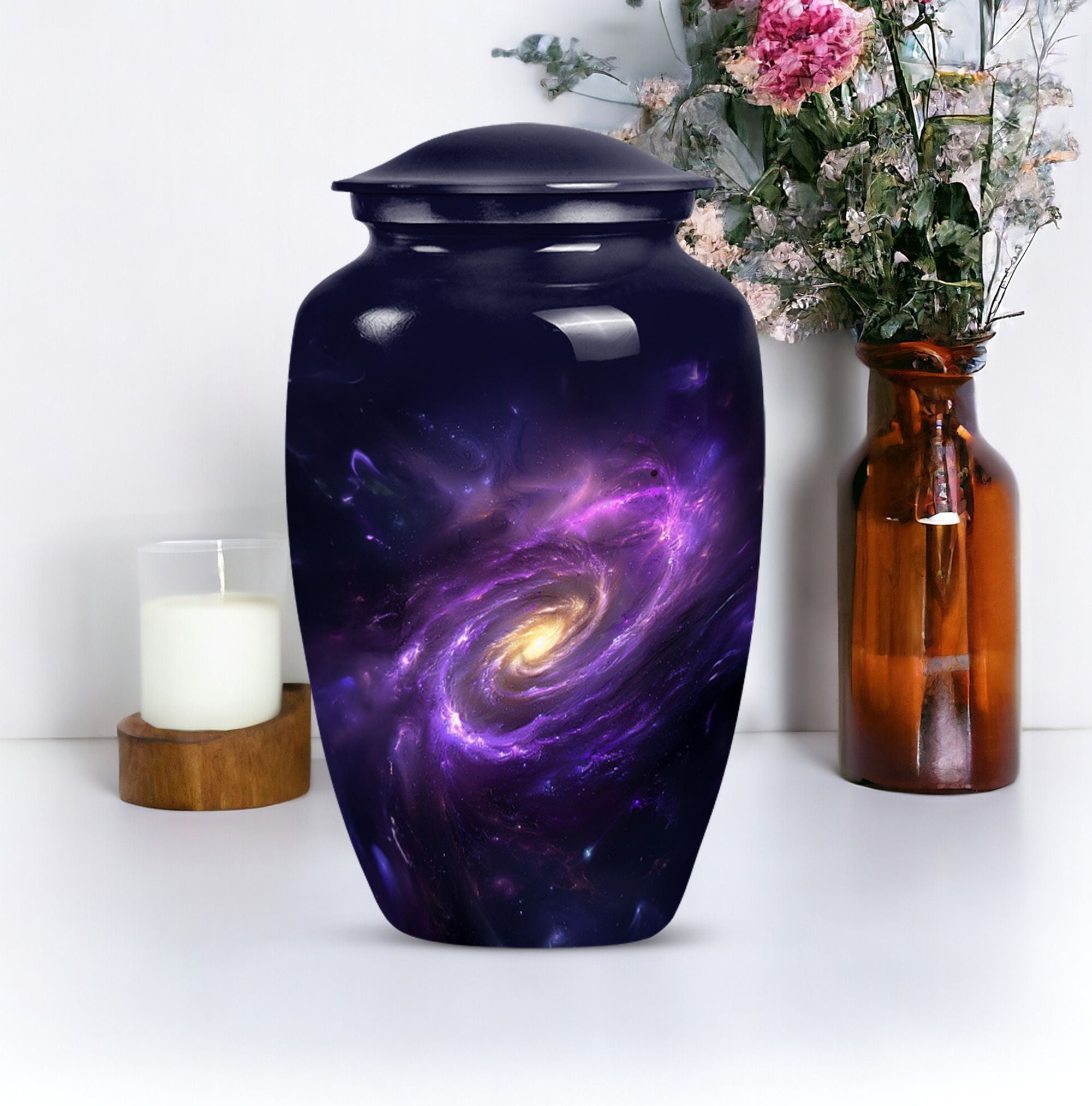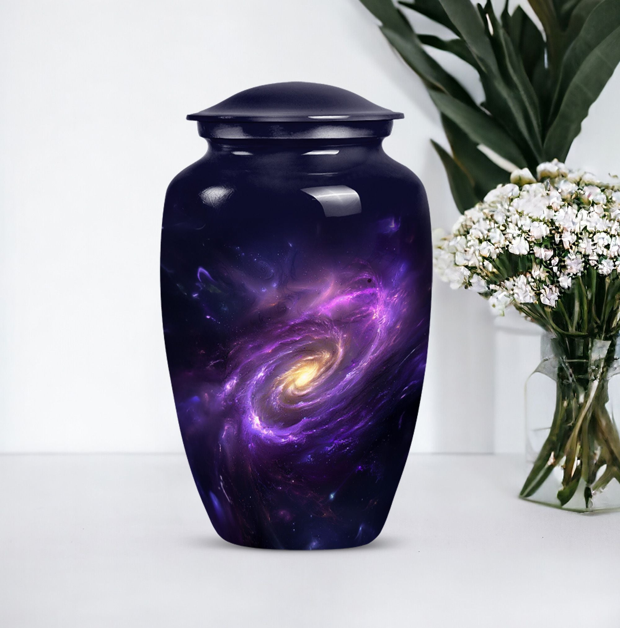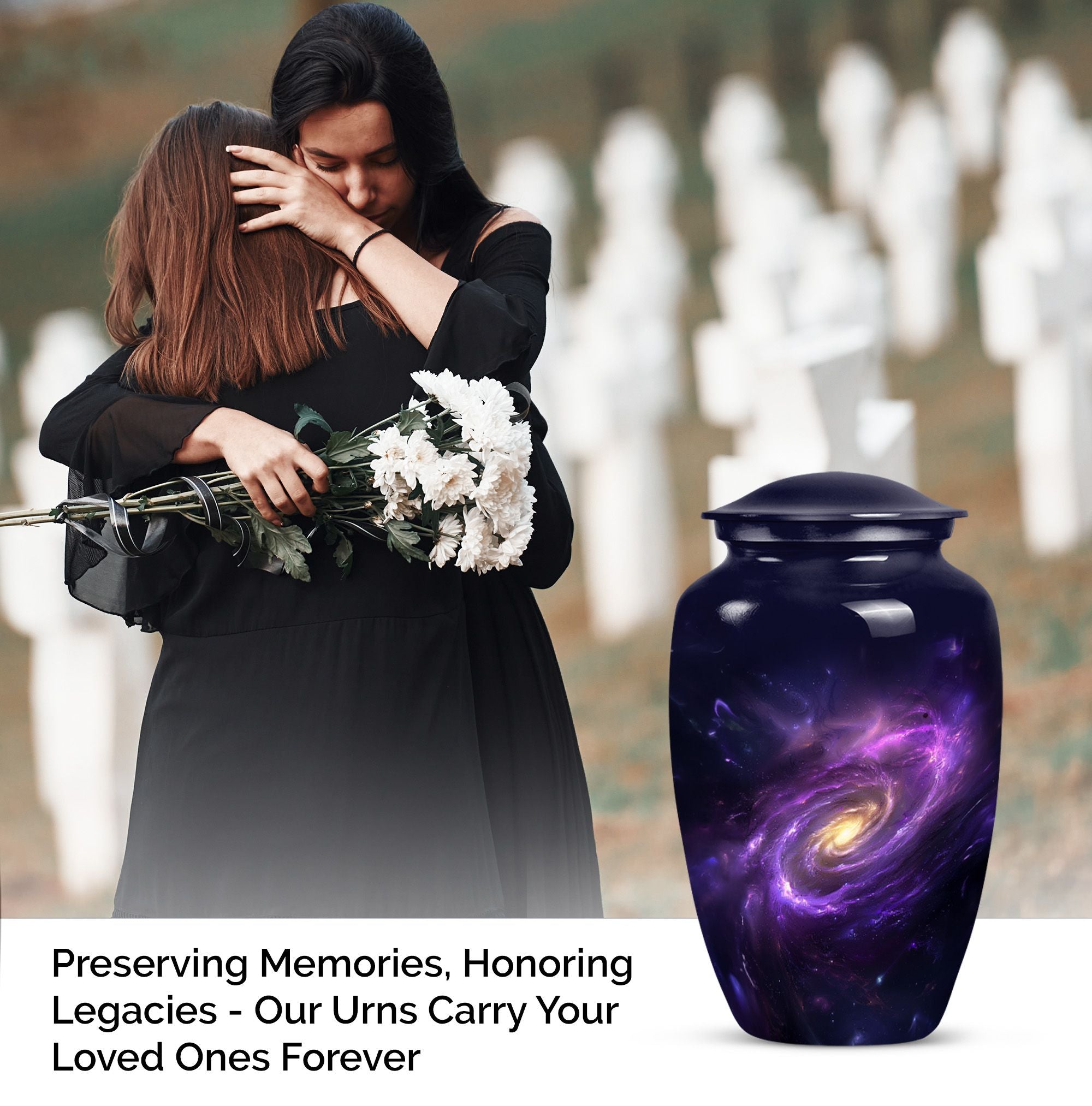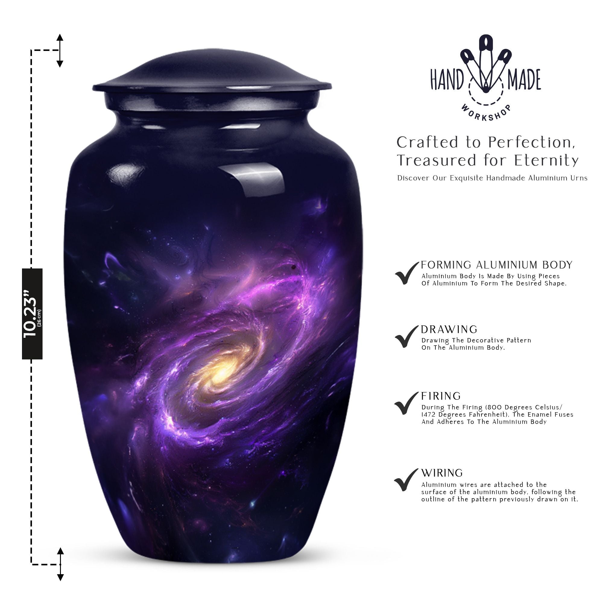 Honor your loved ones with a tangible memory that transcends time - our large 'Glaaxy Urn.' Assembled with meticulous craftsmanship, this tribute urn shines with long-lasting aluminum material. Sized at 10 inches, this cremation urn intricately blends a delicate 'Purple Meadow' theme, rendering it the perfect memorial urn for adults, whether male or female. Weighing just 3.3 pounds and possessing a volume capacity of 200 cubic inches, this urn is large enough to hold the ashes safely. Each purchase includes a soft, stylish velvet pouch for containment of the precious ashes. We respect the individuality and uniqueness of your journey, allowing personalization with the names of your beloved. These companion urns for two adults commingle the ashes of your loved ones, keeping their togetherness eternal. With our unique 'Purple Meadow' theme urn, you keep the memory of your loved ones passionately alive. Note: The 'Classic Urn' design is not a part of this product.