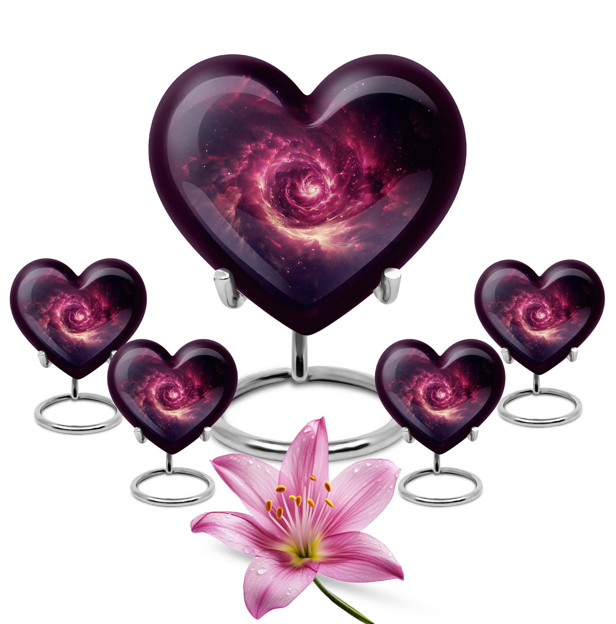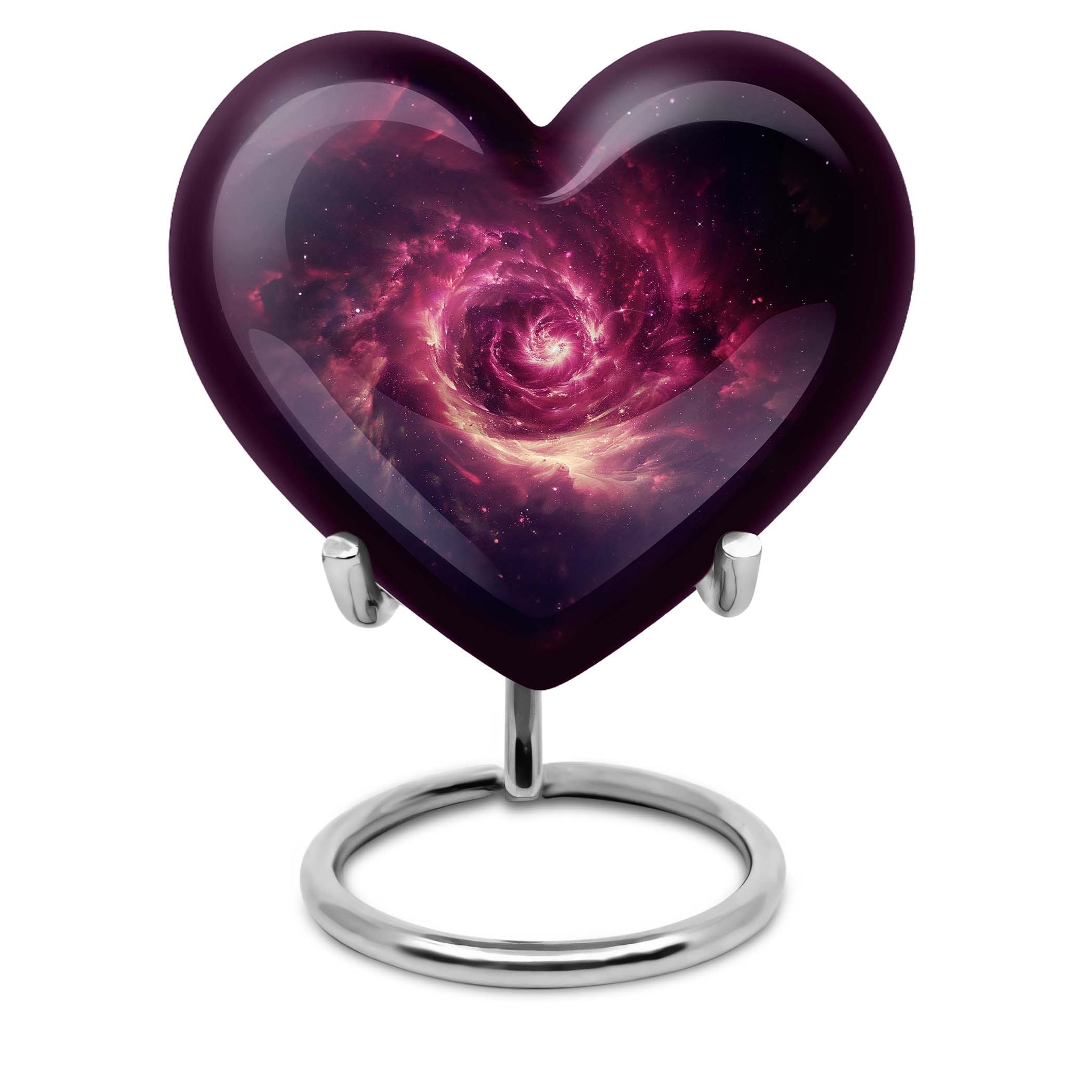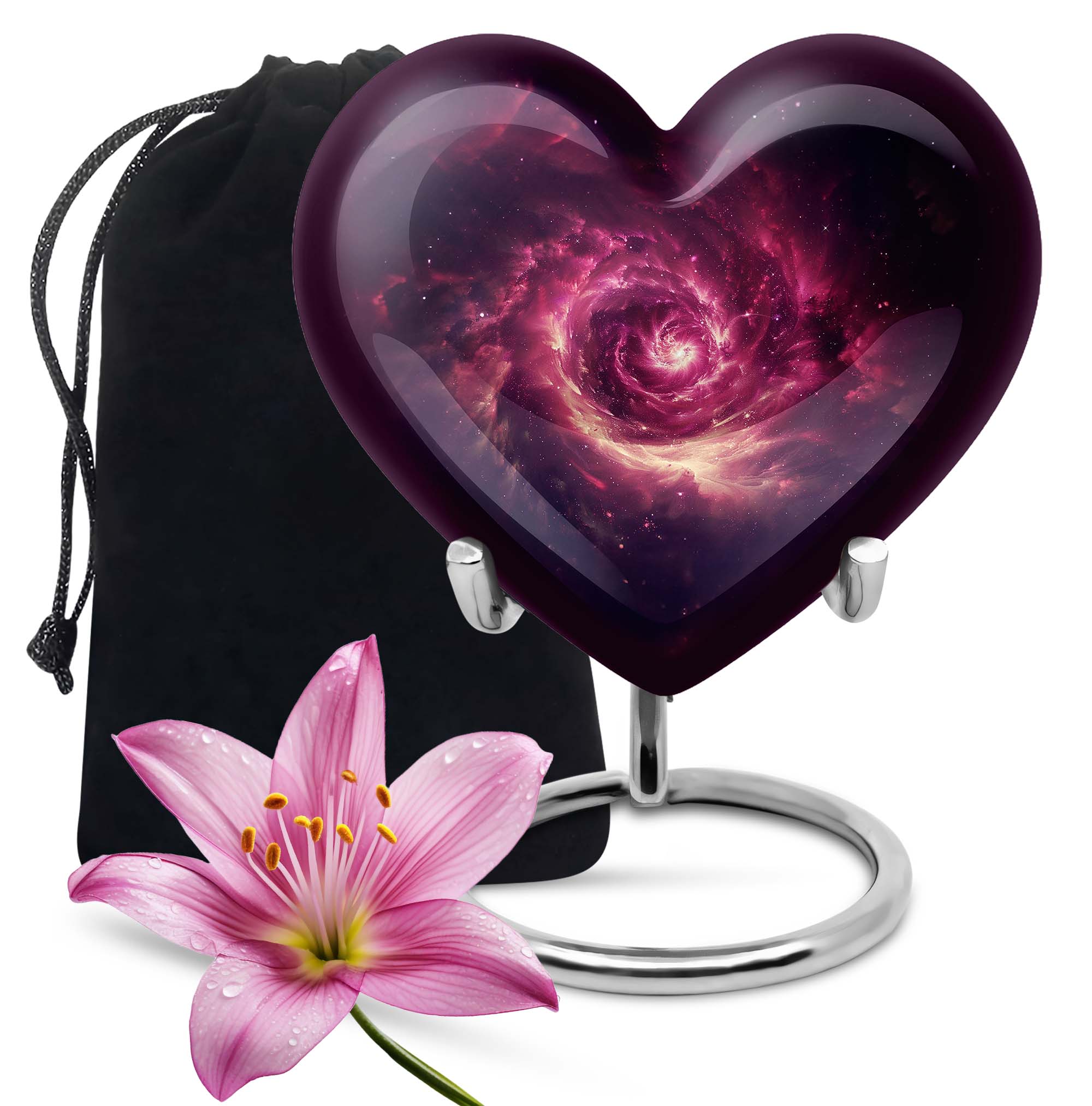The Purple Meadow, a majestic symbol of love, is beautifully captured in the meticulously crafted 10-inch Galaxy Urn, an ideal memorial urn for women ashes. With its artistry meticulously formed in aluminum, this urn is both substantial and attractive. Weighing 3.3 pounds, it is robust and durable, the type that stands the testament of time - just like your loved one's abiding presence in your heart. Its sizeable capacity of 200 cubic inches accommodates the ashes securely. This large urn's design heralds a heart motif, symbolic of the love and memories treasured. It comes complete with a velvet pouch for containment of ashes, further adding to its appeal and practicality. Personalize this cremation urn by engraving names, thus ensuring a unique and enduring tribute. Uncommon in its class, our urn for Ground Burial combines elegance and affordability. Its allure is perfect for well-considered selections amongst women urns, urns for human ashes, or metal urns for human ashes adult female.