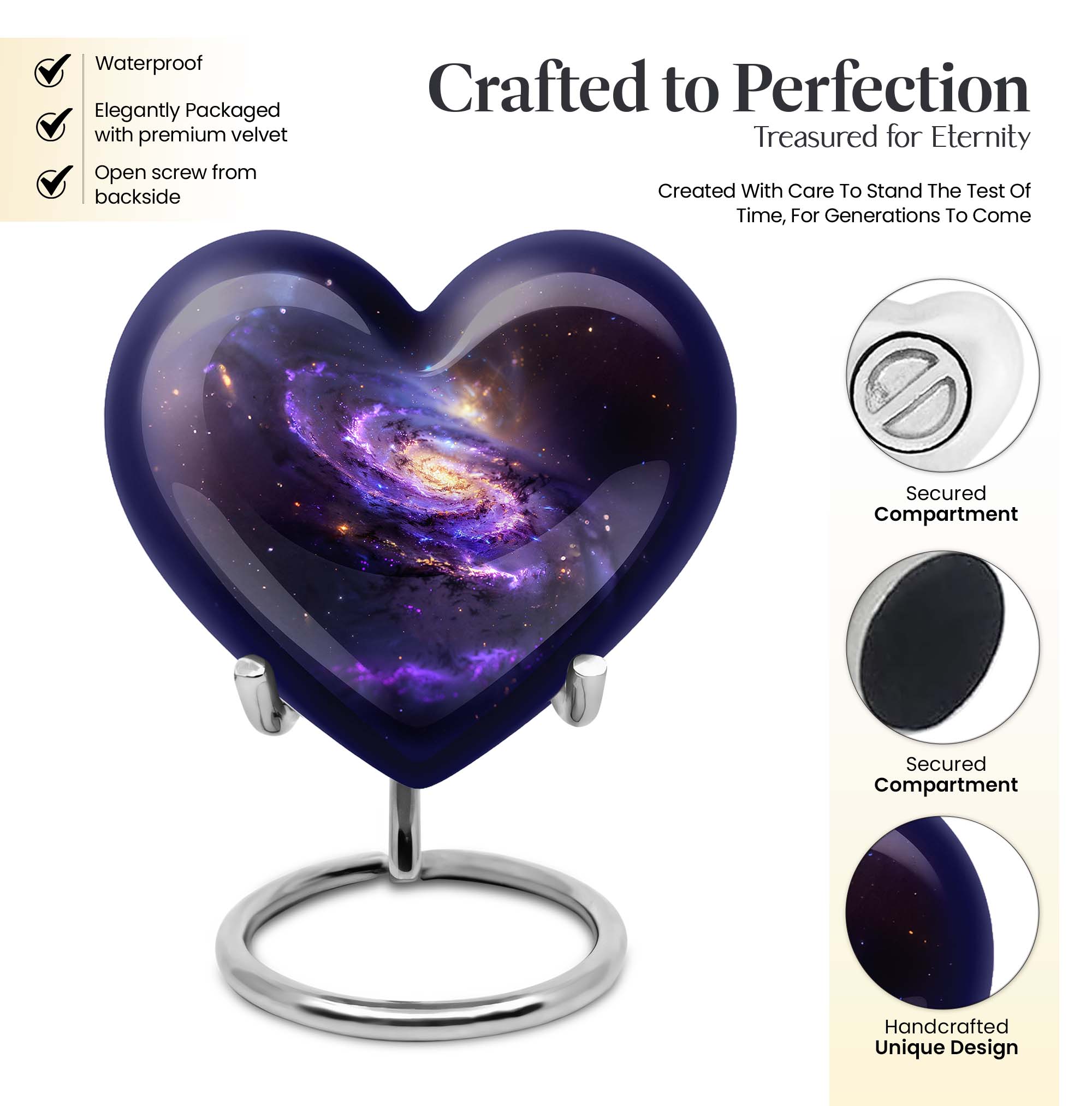 Discover instant serenity with our heart-inspired Galaxy Urn, an ideal memorial funeral urn for your loved one's last rest. Crafted from robust aluminium, this large urn asserts its longevity while maintaining a captivating abstract theme. The 10-inch-sized urn efficiently contains up to 200 cubic inches of ash, ensuring no memento gets left behind. With a considerate weight of 3.3 pounds, transporting it becomes hassle-free, providing flexibility to fit into any memorial or ceremonial plan. The urn comes exquisitely packed in our velvet pouch, keeping the ash safely encapsulated. To add a personal touch to the farewell, we offer customization - engrave names to etch your dear ones onto this timeless keepsake. Whether seeking funeral urns for burial or human ash urns, this product elegantly fits the purpose creating a respectful tribute. It's not just an urn, but a beacon of enduring love.