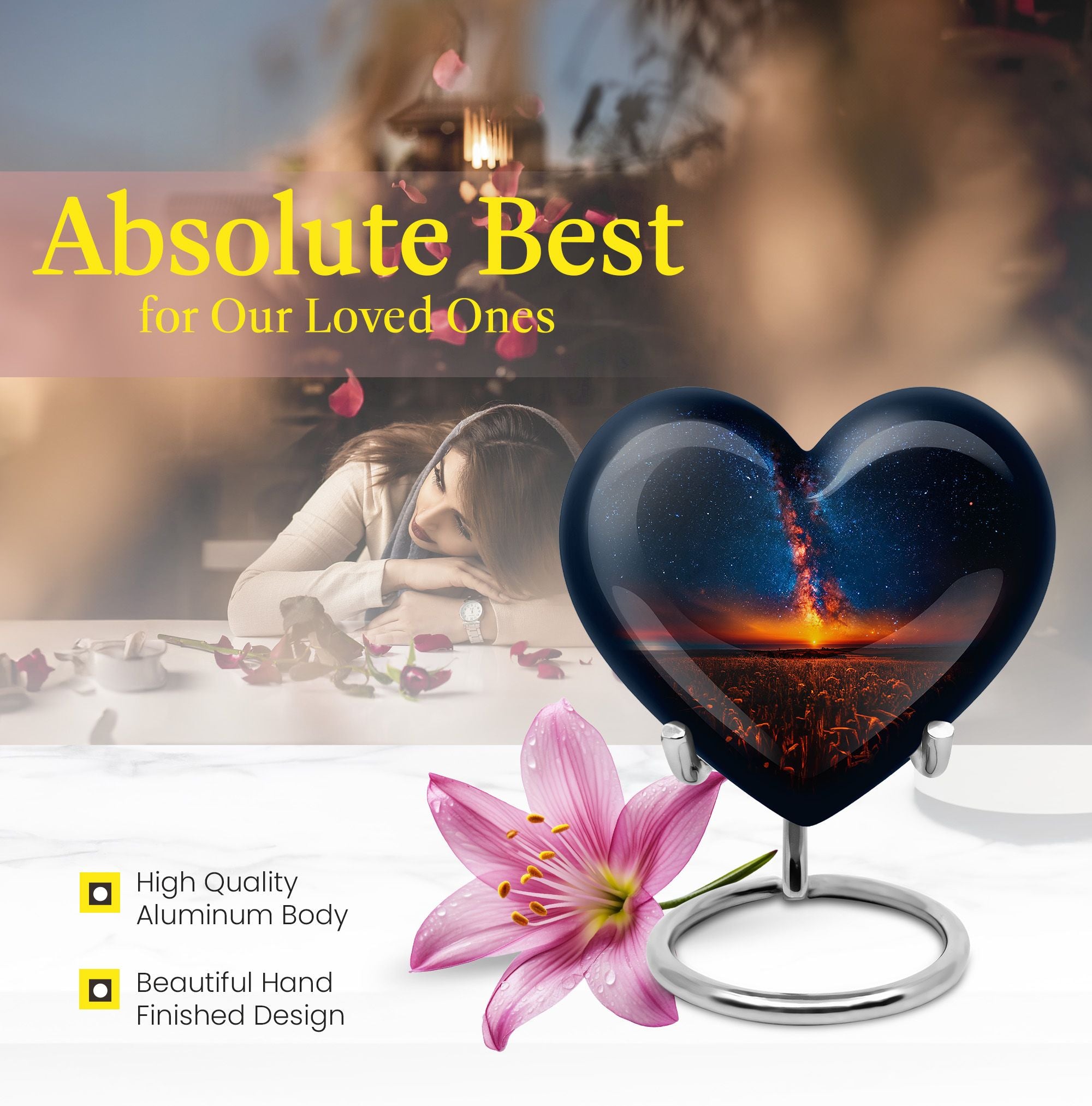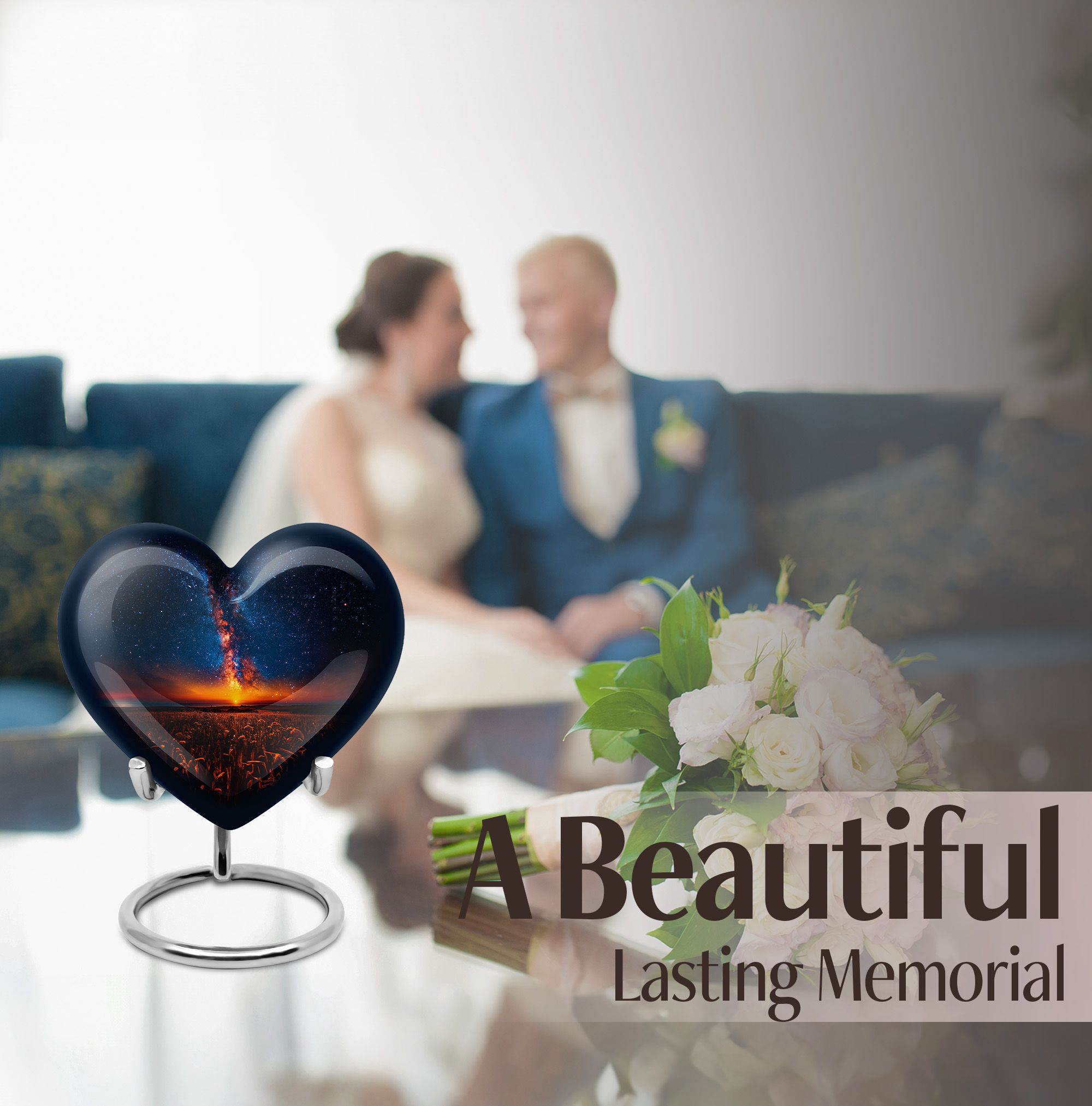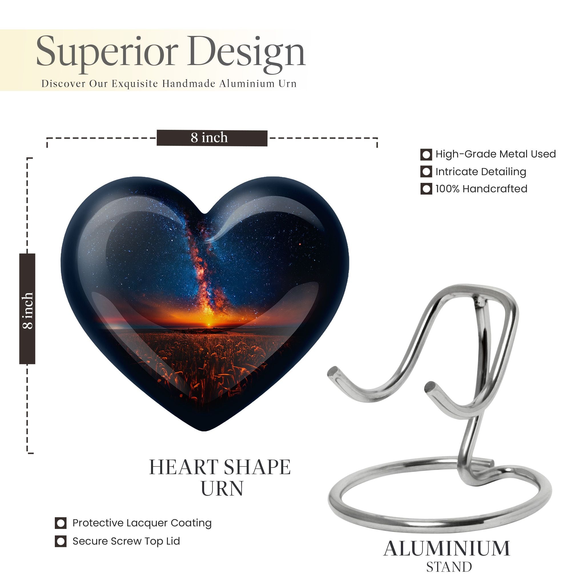 The Galaxy Urn, an exquisitely crafted memorial urn, offers a unique way to cherish your loved ones forever. Exemplifying abstract art with a heart shape, this stunning piece is perfect for those in search of cremation medium urns for human ashes. It stands at a size of 10 inches, substantial enough to hold up to 200 cubic inches of ashes. Each urn weighs 3.3 pounds and is made of sturdy, high-quality aluminium, ensuring that they can withstand time as a lasting tribute. Alongside its striking design, each urn offers customization, providing an option to engrave your beloved ones' names. Included with each urn is a delicate velvet pouch, providing a soft and secure containment for the ashes. This large urn echoes love in its design, capturing a sense of warmth and personal connection. Ideal for burials, this urn offers a heartfelt way to remember and honour your loved ones and creates a legacy that stands the test of time.