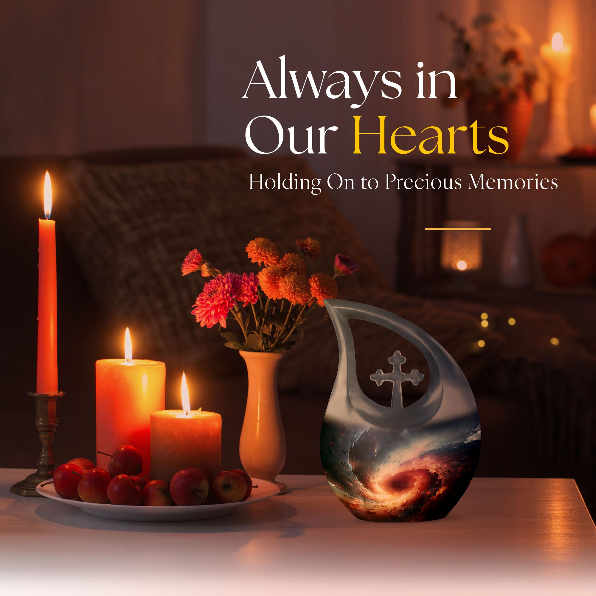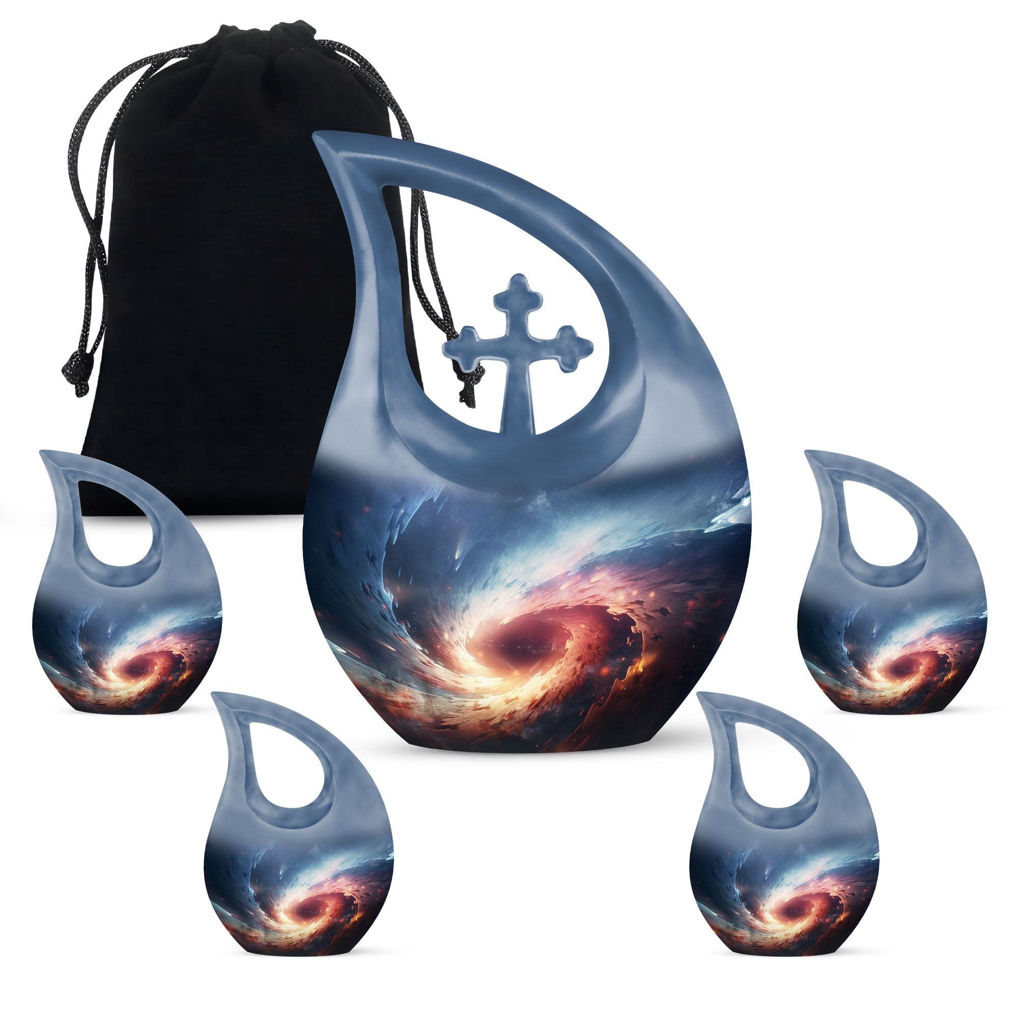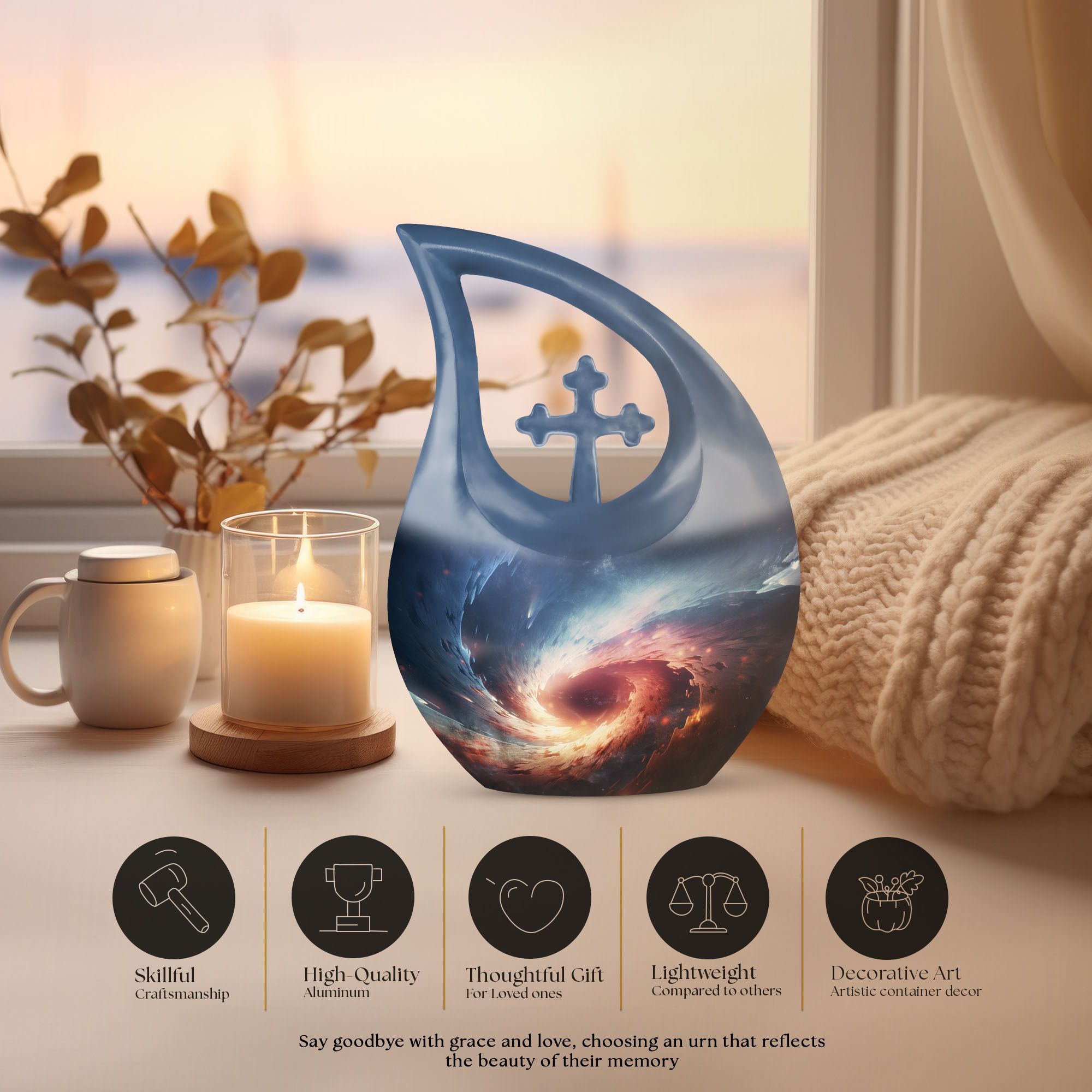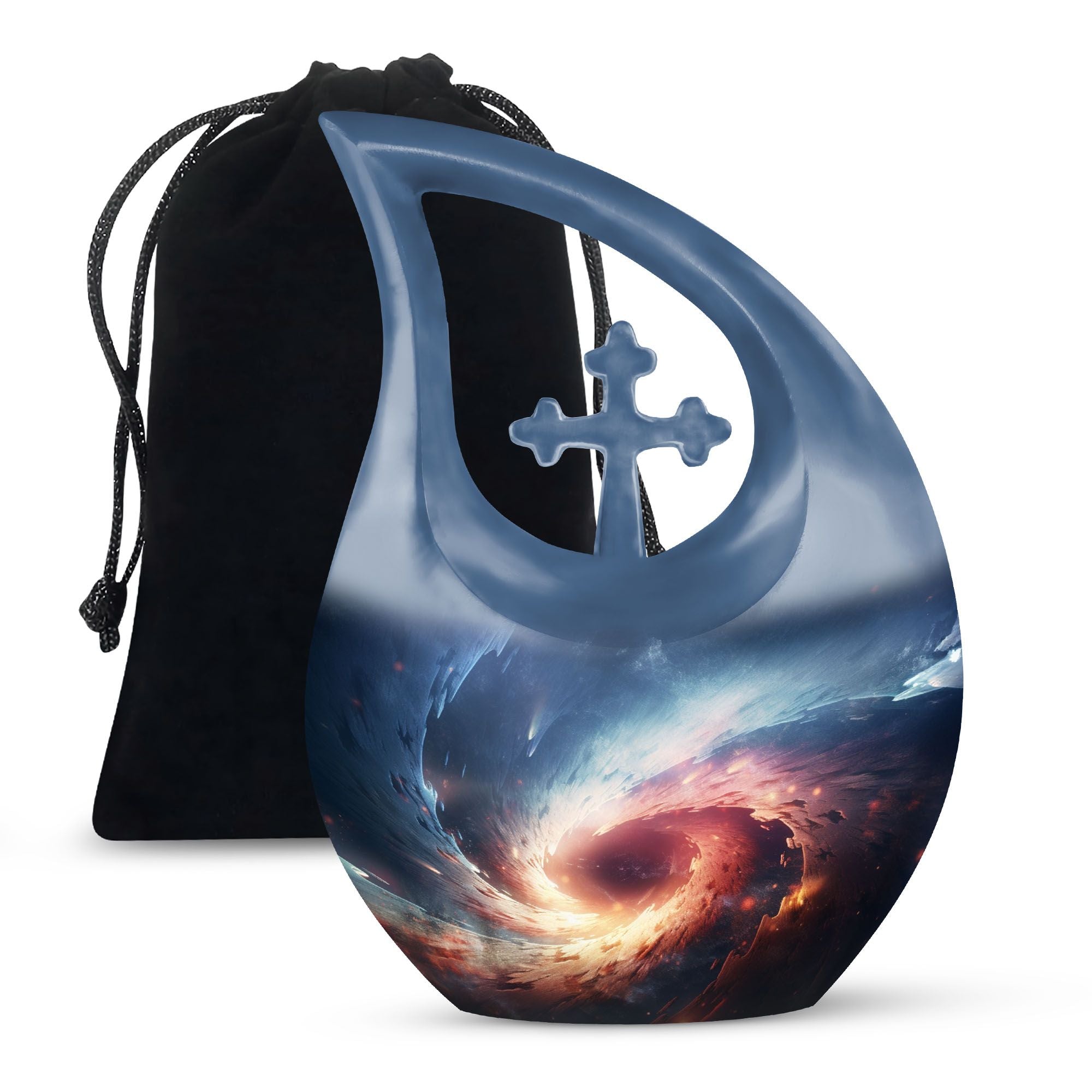 Immerse yourself in the dazzling cosmic artistry of our meticulously crafted, 10-inch Galaxy Urn. Designed with a space-inspired theme, it’s a testament to the eternal continuum where life transcends and remains ever alive in our memories. This 'Cross Drop' symbolizes a divine haven where your loved one's essence is nestled. Made of sturdy aluminium, it weighs 3.3 pounds and can comfortably hold up to 200 cubic inches of ashes. This large urn seamlessly combines durability with elegance, offering a heartwarming way to respect and memorialize. A velvet pouch is provided to securely contain the ashes, adding an extra layer of protection and reverence. The personal touch of customized engraving adds a heartfelt sentiment, making it even more personal. Experience peace and solace with our range of cremation urns, echoing the love you shared. With a passion for serving those navigating through their grief journey, we provide affordable urns for ashes, tailored to deliver comfort, and solace. Our Galaxy Urn doesn't just stand as an urn for human ashes, but a beacon of unwavering love.