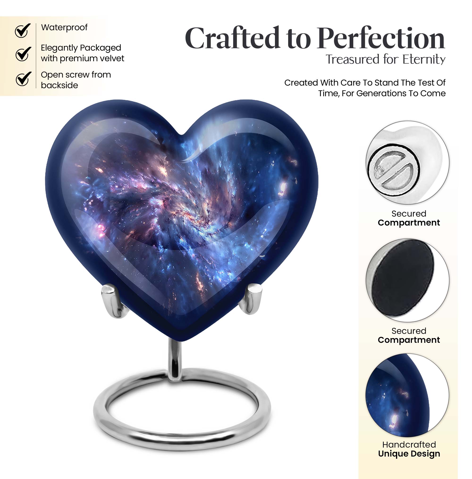 Introducing our uniquely exquisite Purple Meadow Heart Urn, a poignant choice for commemorating your dear ones. Crafted from toughened aluminum, this 10-inch tall, large burial urn is designed to securely store up to 200 cubic inches of ashes, making it an essential item in your collection of memorial ceremony supplies. The robust construction weighing 3.3 pounds, confirms its enduring nature. Enhancing its significance, you can personalize this cremation urn with engraved names, extending an intimate touch to the memorial. Further, it comes along with a velvet pouch, ensuring delicate containment of the ashes. The Purple Meadow theme adds a serene touch, adding to its beauty. This galaxy urn stands as an emblem of love and memories you cherish, representing the bond you shared. Although it's a perfect choice for female adults, it has the capacity to serve as a dual urn for adult males and females. This metal urn is appropriate for in-ground burial but can also serve as a home memorial. Offer a striking tribute to your loved ones with this distinguished, one-of-a-kind urn.