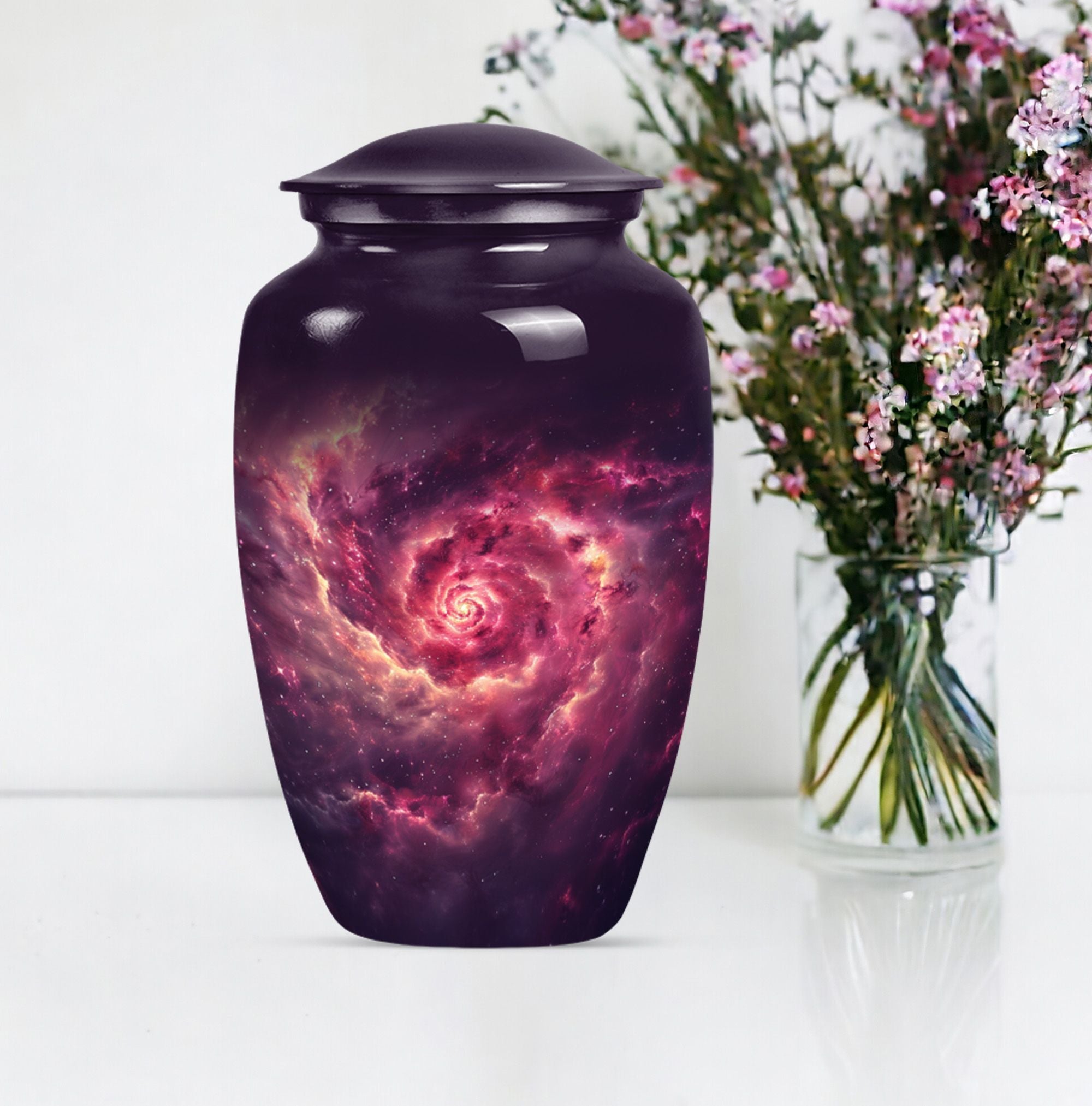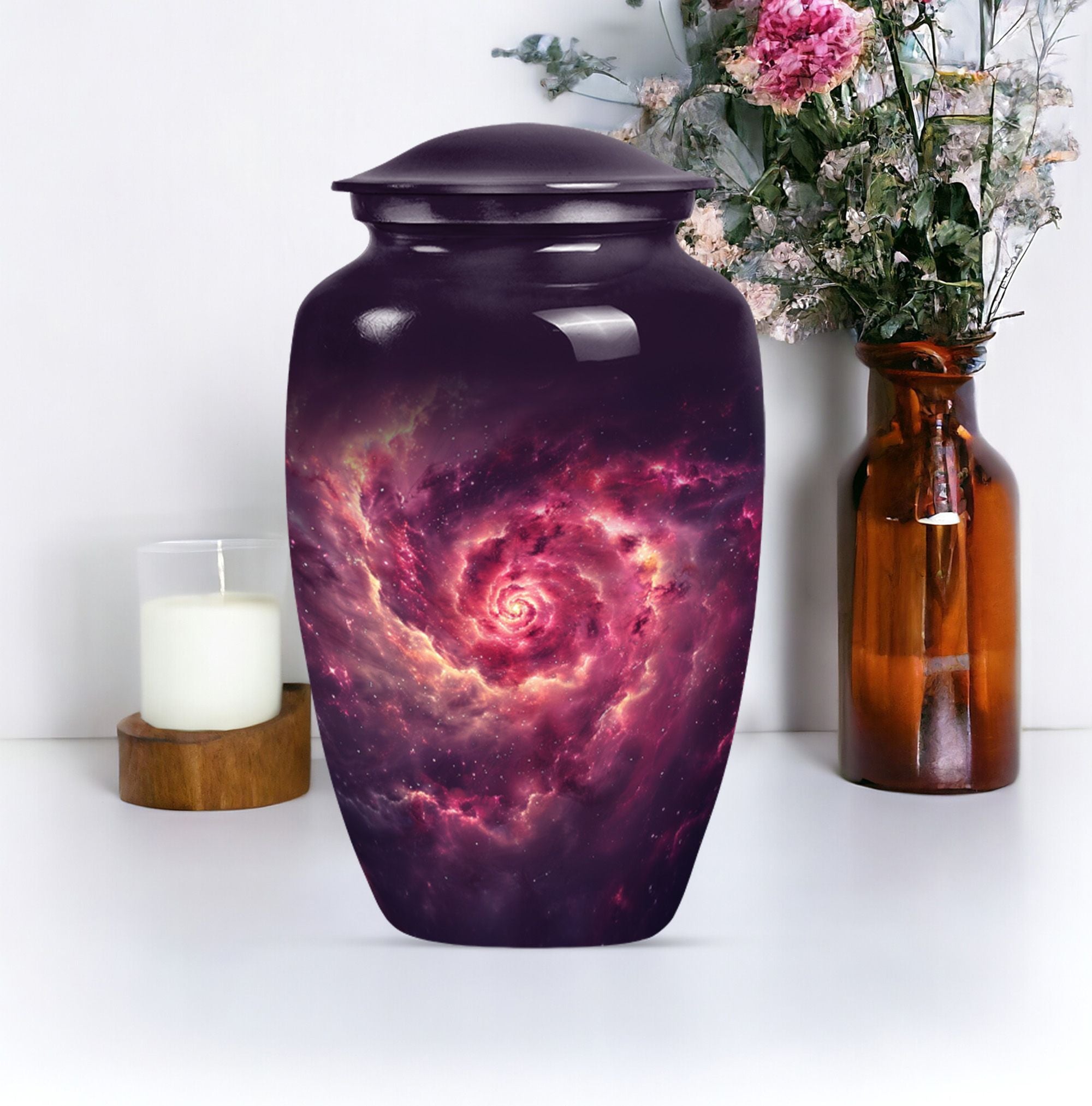 Immerse in solace and remembrance with the elegant and meaningful Galaxy Urn. This large urn, standing at a stately 10-inch height, is painstakingly sculpted, offering a potent symbol of enduring homage. With a capacity of 200 cubic inches, it can respectfully hold the ashes of an adult, unequalled in its grandeur. We offer a distinct characteristic with the urn's abstract theme - an expressive interpretation of the circle of life. The urn is fabricated from robust aluminium, ensuring its integrity over time, symbolizing an eternal memory. Each unit includes an exquisite velvet pouch for tasteful containment of ashes. Justifying its weight of 3.3 pounds, the dimension manifests its dignified build and the weighty sentiment it signifies. For a personalized touch reflecting your endearing memories, we offer the option to engrave your loved one's name unto the urn. Cultivate peace and remembrance with the Galaxy Urn and celebrate the precious life journey of your loved ones. Our inventory is geared towards men and women, catering both to their aesthetic inclinations. This urn serves as a definitive choice for burial cremation for adults' ashes. Keywords: Galaxy Urn, memorial urns, women's cremation urns, Cremation urns for men, cremation urn for human ash, urns for human ashes adult.