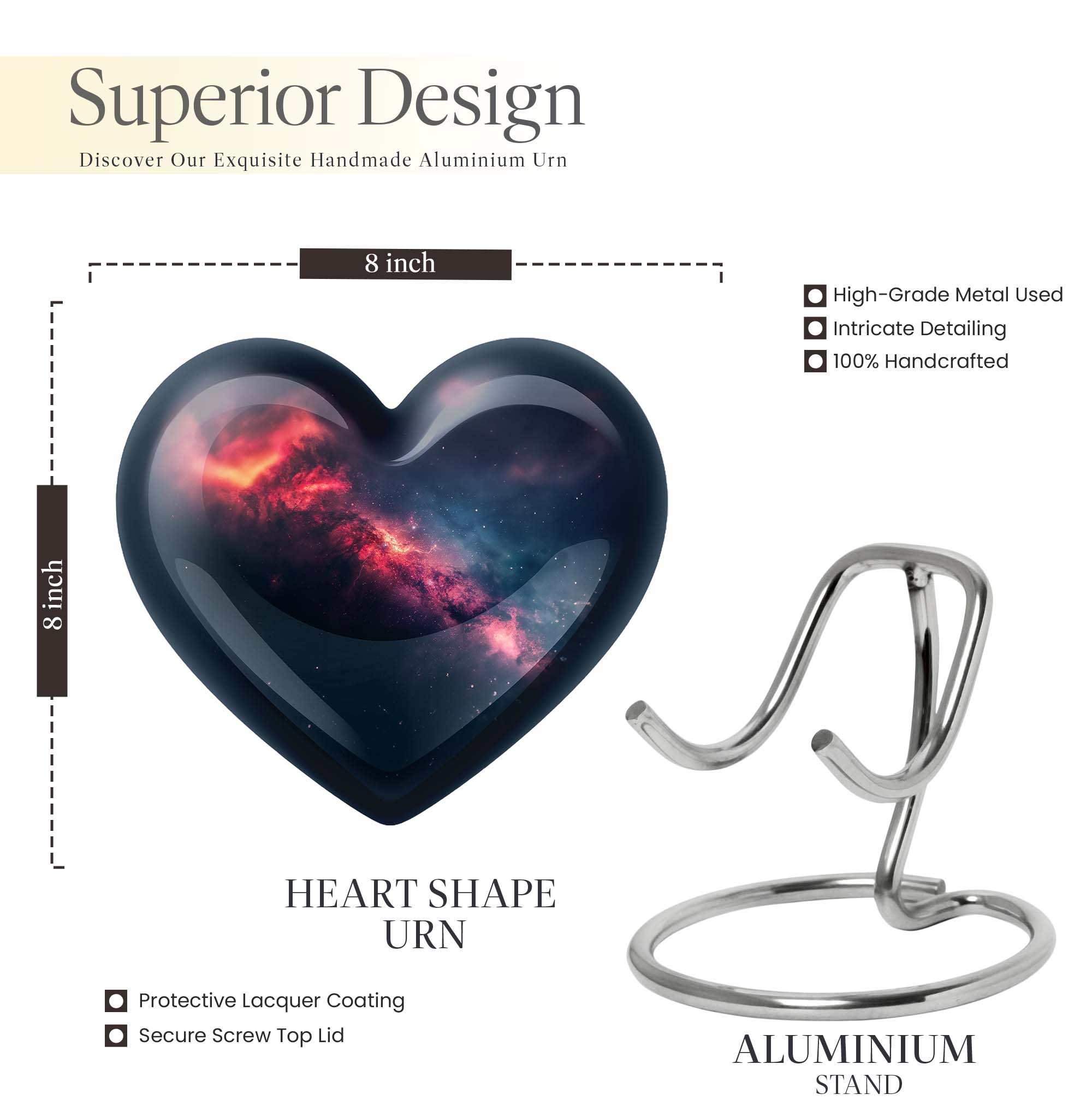 Hold dear the remembrance of your loved one with this exquisite 'Purple Meadow' themed 'Heart Urn', a uniquely heartwarming piece from our collection of memorial urns. Crafted from durable aluminium material, it manifests an excellent balance between elegance and longevity. This large urn stands about 10 inches tall and has a substantial capacity of 200 cubic inches. The weight of 3.3 pounds adds a substantial feel to its presence, symbolizing the irreplaceable weight of the memories it holds. Customizable with engraved names, it lets you create a truly personal tribute to your dearly departed. This dignified burial cremation urn comes with a velvet pouch to safely contain ashes. The 'Purple Meadow' theme renders a soothing touch to the overall design, making it a serene addition to your memorial ceremony supplies. Remember to look up 'glaaxy Urn' on your search for premium cremation options. This specifically crafted urn is ideal for the discerning adult female, turning the porcelain and metal urn options a run for their money.