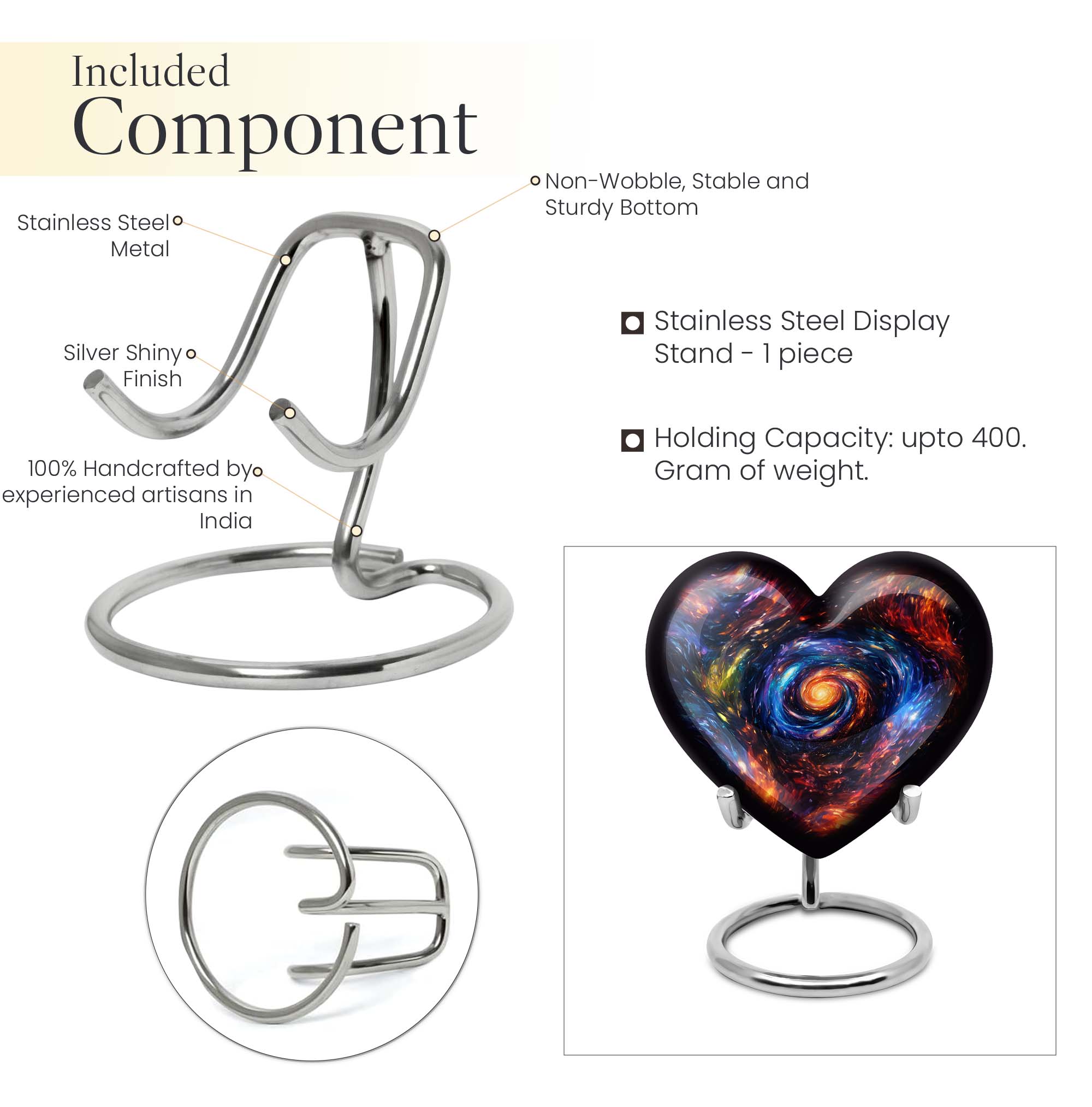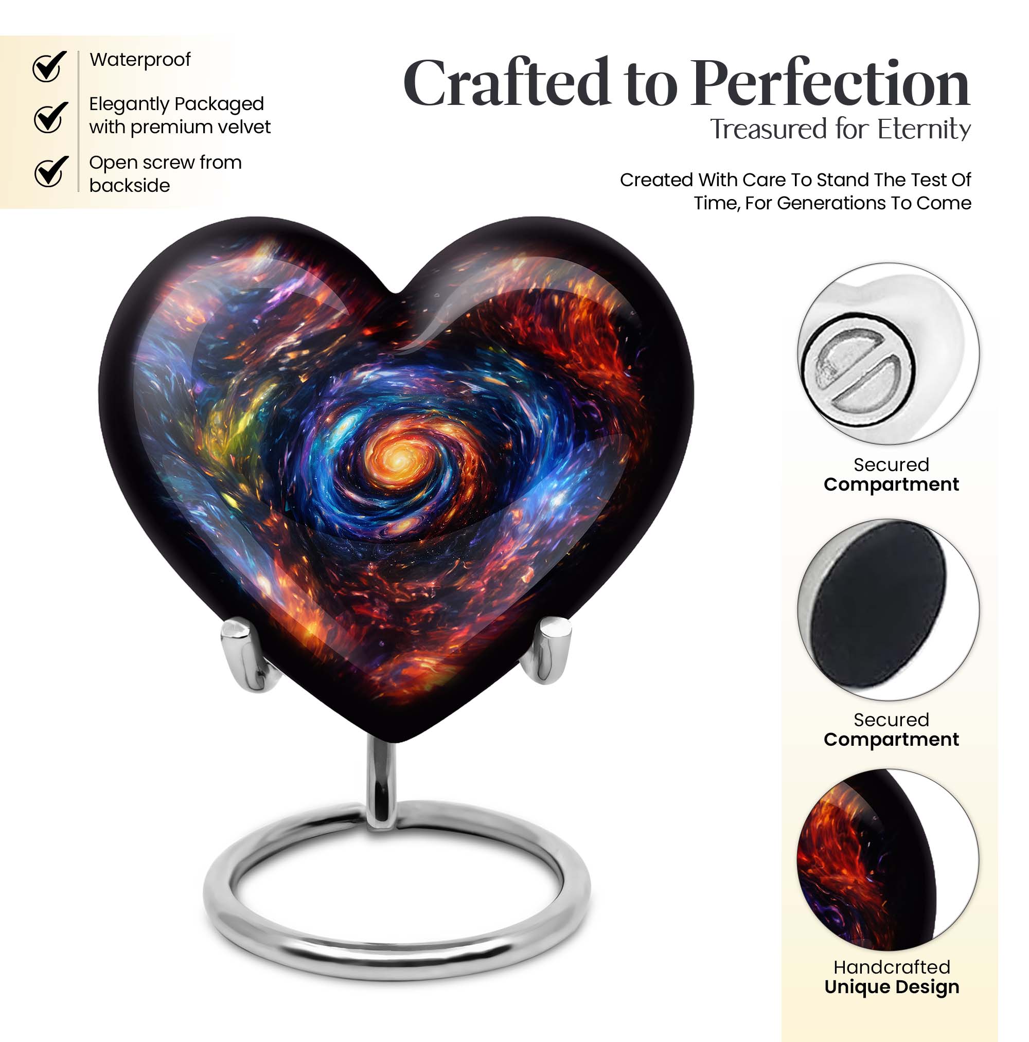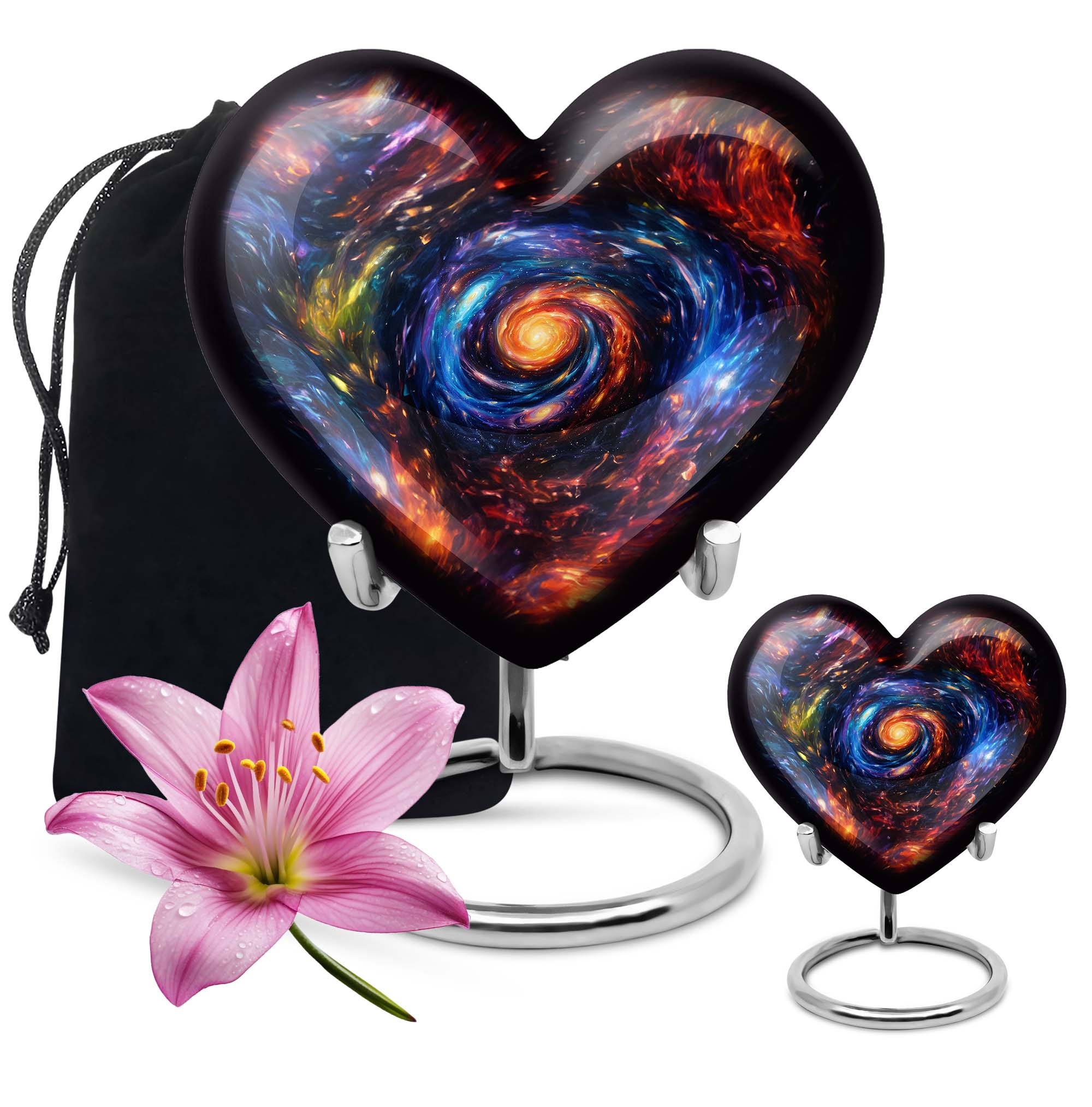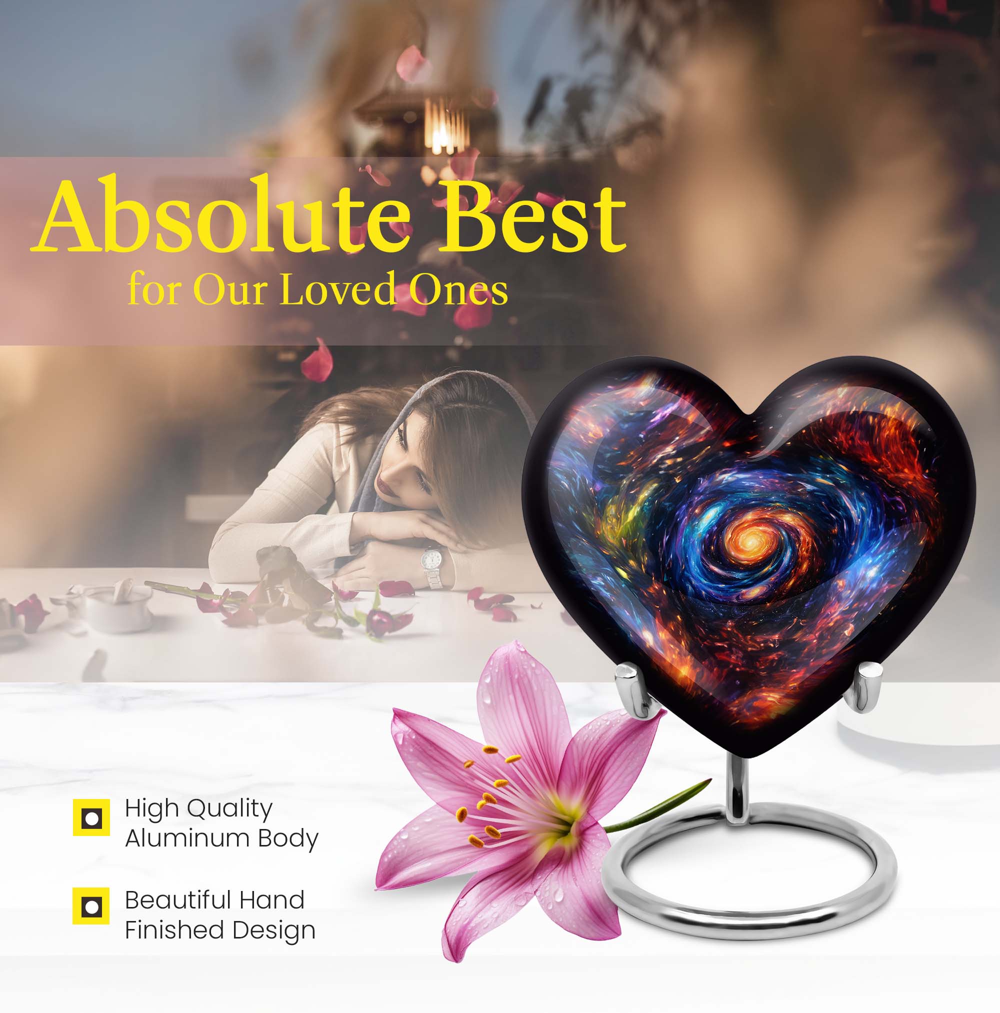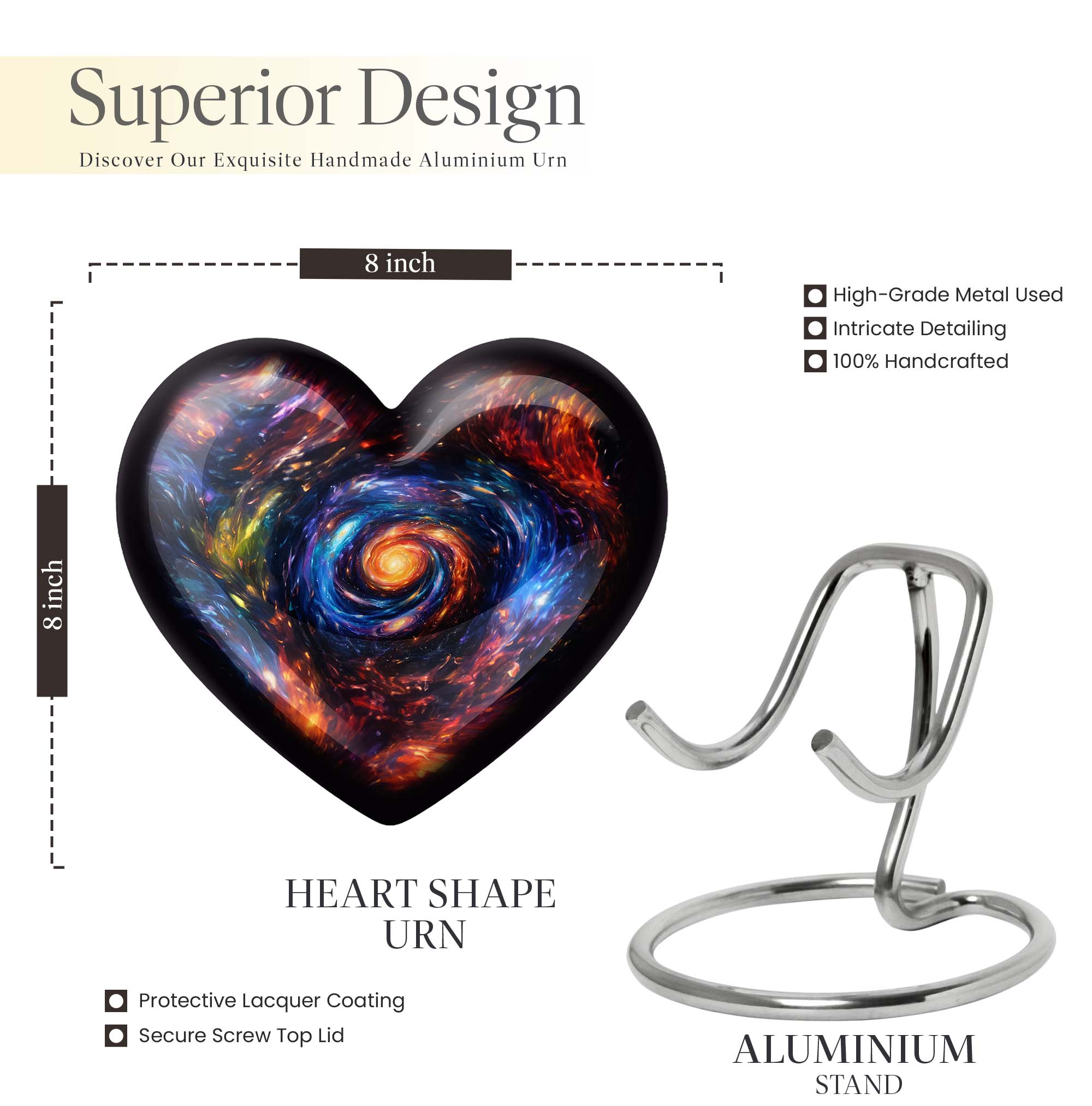 Cherish the memory of your loved ones with the `glaaxy urn`, a beautiful addition to the `burial urns` family designed for cremation ashes, specially crafted for the mother you held dear. This `Large Urn`, themed `Purple Meadow` is distinctly elegant with an iconic `Heart Urn` structure, symbolizing everlasting love. Expertly crafted from premium quality `Aluminium`, it is lightweight yet durable and measuring about `10 inches in height`, this urn can comfortably accommodate `200 cubic inches` of cremation ashes. This `memorial urn` supremely balances aesthetics and functionality, rendering it an optimal choice for `Urban Homes`. Not just a cremation accessory but a decorative element too, adorning your space with utmost grace. Comes bundled with a `velvet pouch` for the safe containment of ashes. Additionally, it offers an opportunity to personalize with `engraved names`, adding a bespoke touch to the remembrance. Though petite in form, this `Compact Urn` remarkably epitomizes 'always in our heart' sentiment, making it a significant keepsake for both men and women.