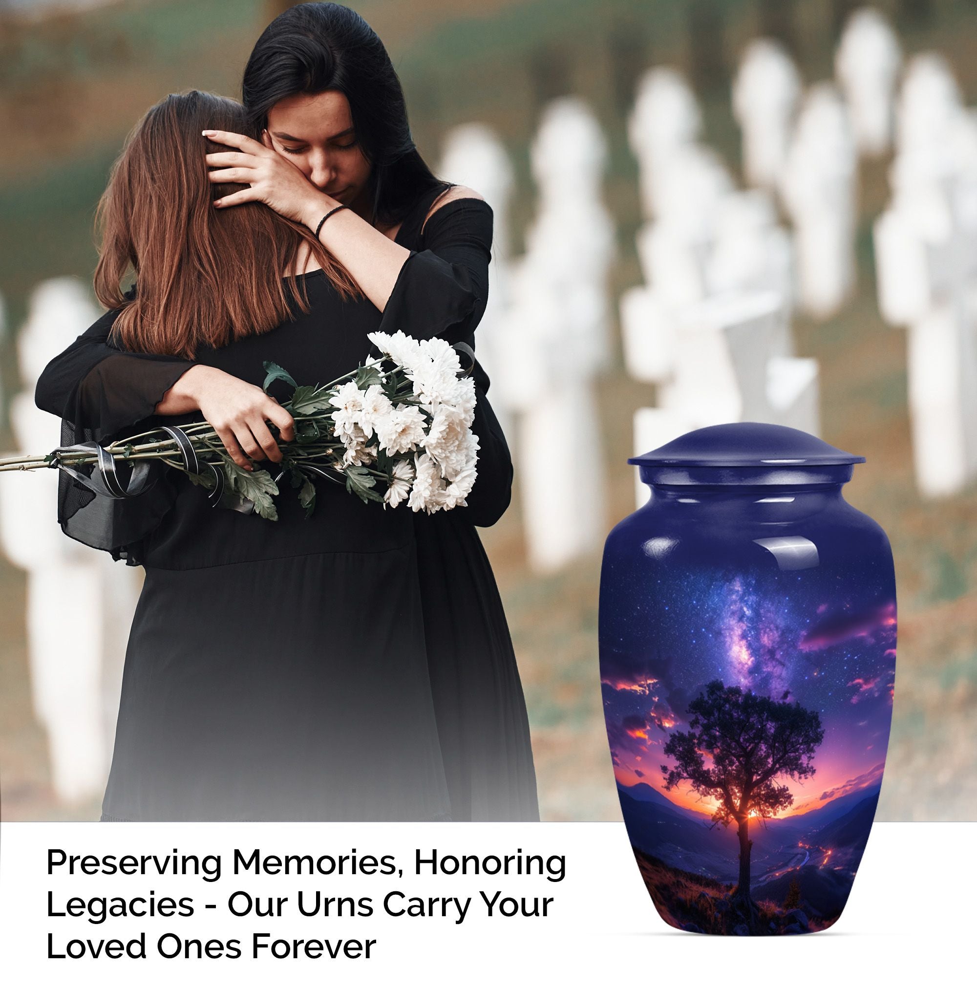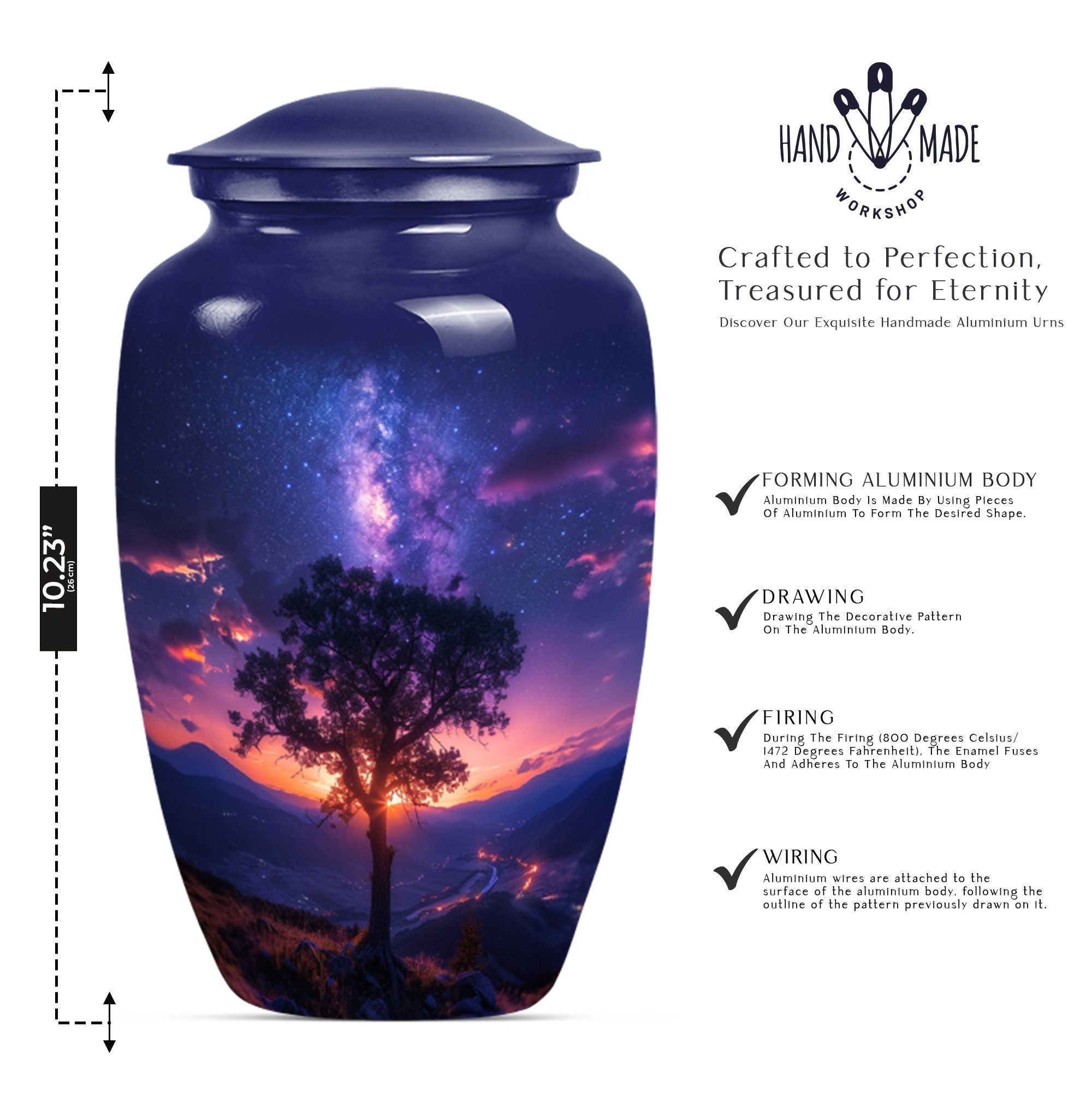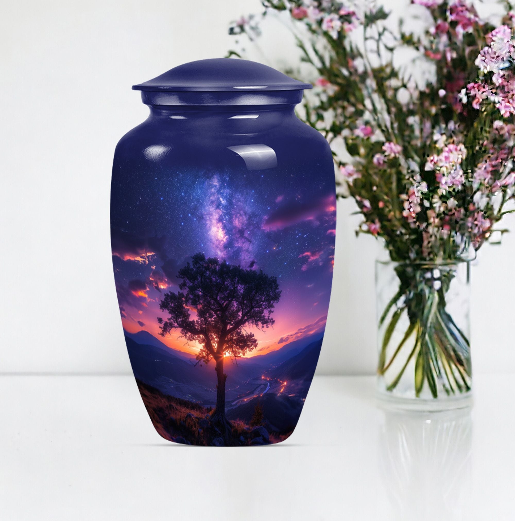 This large cremation urn showcases a stunning galaxy-inspired design that symbolizes eternity, peace, and the infinite universe. Made from durable aluminium, it ensures strength and longevity, making it a reliable resting place. Designed as one of the most elegant cremation urns large, it offers secure placement with a screw-top lid, while its decorative style makes it suitable for display in the home or for ceremonial use. This piece is not only a vessel but also a beautiful statement of remembrance, perfect among urns for human ashes large.