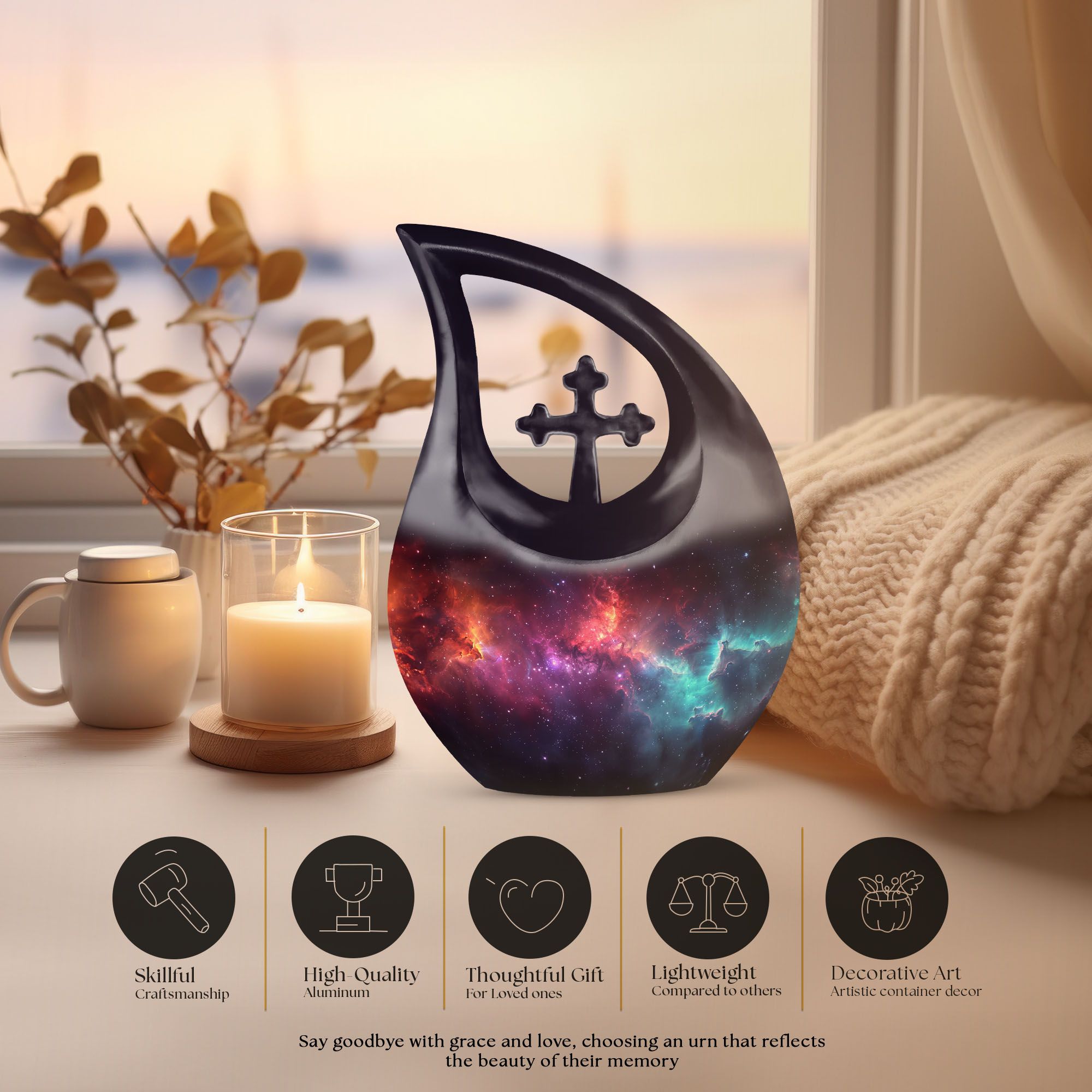 Handcrafted from durable aluminium, this 10-inch urn features a stunning galaxy-inspired finish, blending deep blues, purples, and cosmic shimmer. Its secure screw-top lid ensures dependable protection, making it ideal as a cremation urn for adults, cremation urn mom, or cremation urns for adult ashes. Families looking for urns for cremation ashes or cremation urns for ashes will appreciate its artistry and strength. It also pairs beautifully with small urns for cremation ashes, mini cremation urns, or cremation keepsake urns for human ashes adult when shared remembrance pieces are desired.