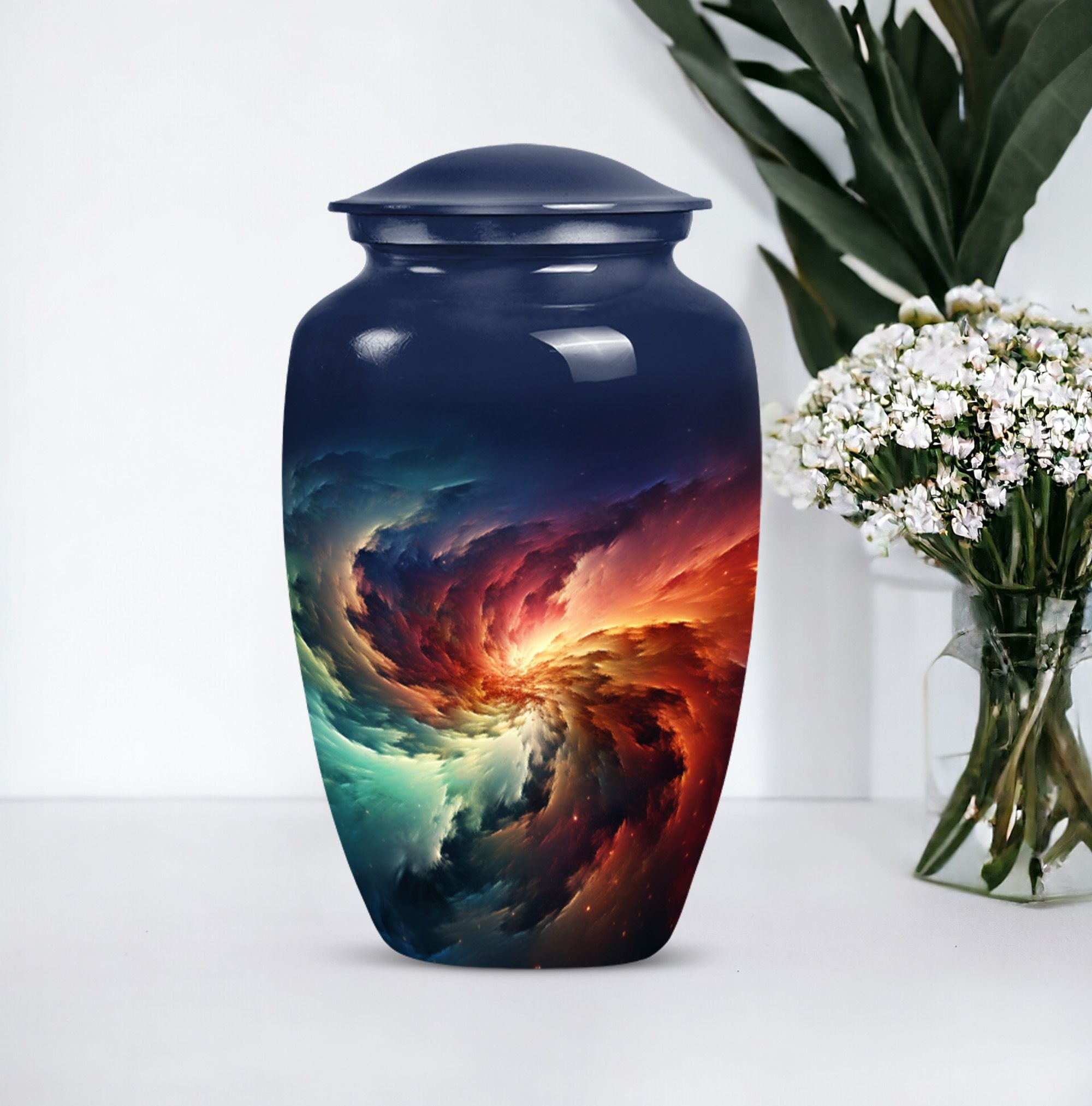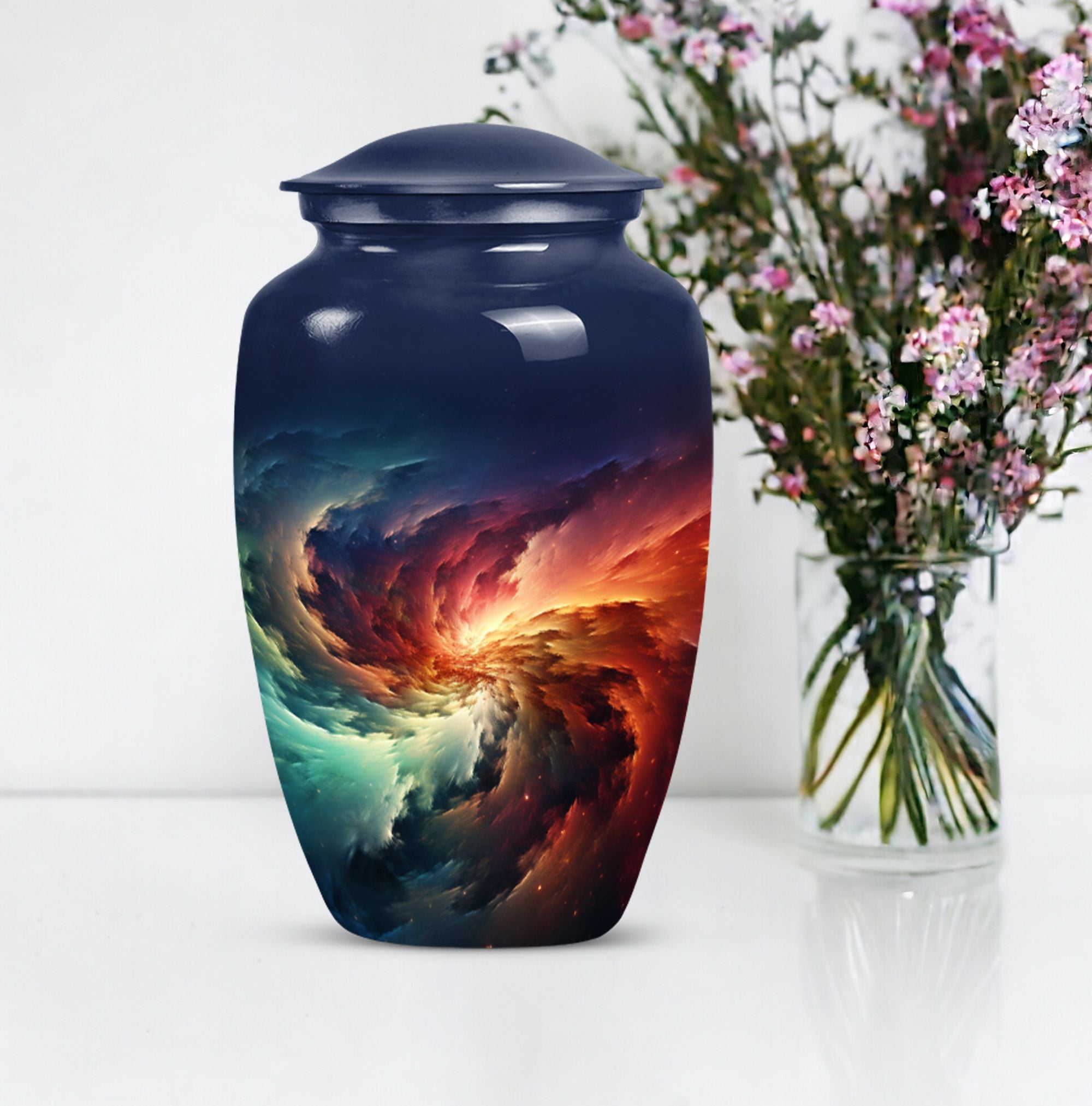 Relive the fond memories of your cherished ones with our 'Galaxy Urn,' a 10-inch funeral urn thoughtfully designed for precious memorials. This classic urn, featuring a mesmerizing 'Purple Meadow' theme, brings a comforting presence while complementing any decor. Our urn is a sizable vessel offering a capacity of 200 cubic inches, suitable for both men and women, distinguishing it from standard memorial urns. It weighs a secure 3.3 pounds and is made of resilient aluminium, promising lasting durability. The package provides a plush velvet pouch for the respectful containment of ashes. Personalize and pay your unique tribute by engraving names on it. This product positions itself as an exquisite part of the memorial ceremony supplies that add eternal value to your heartfelt commemoration. It stands as a beautifully shaped tribute to the unforgettable memories cherished. Please note, our 'Glaaxy Urn,' is not just an urn, it’s a respectful homage enfolded in an elegant and timeless design.