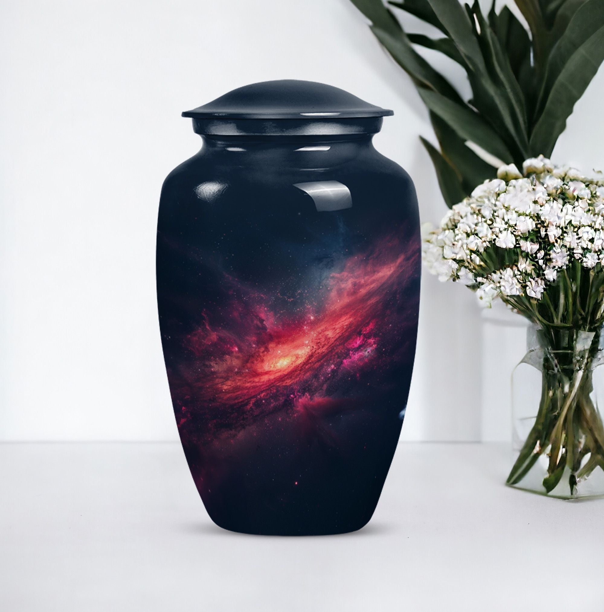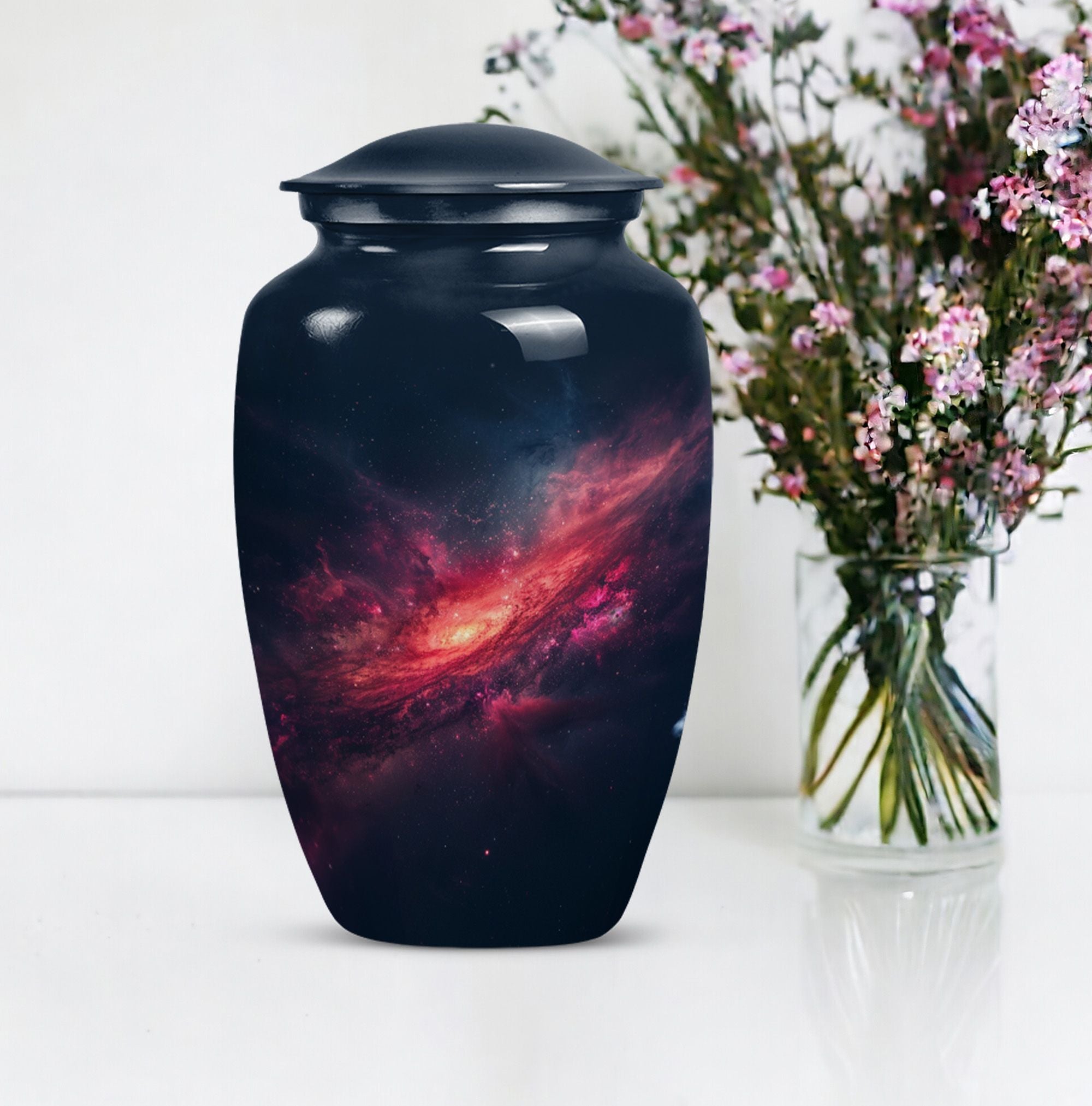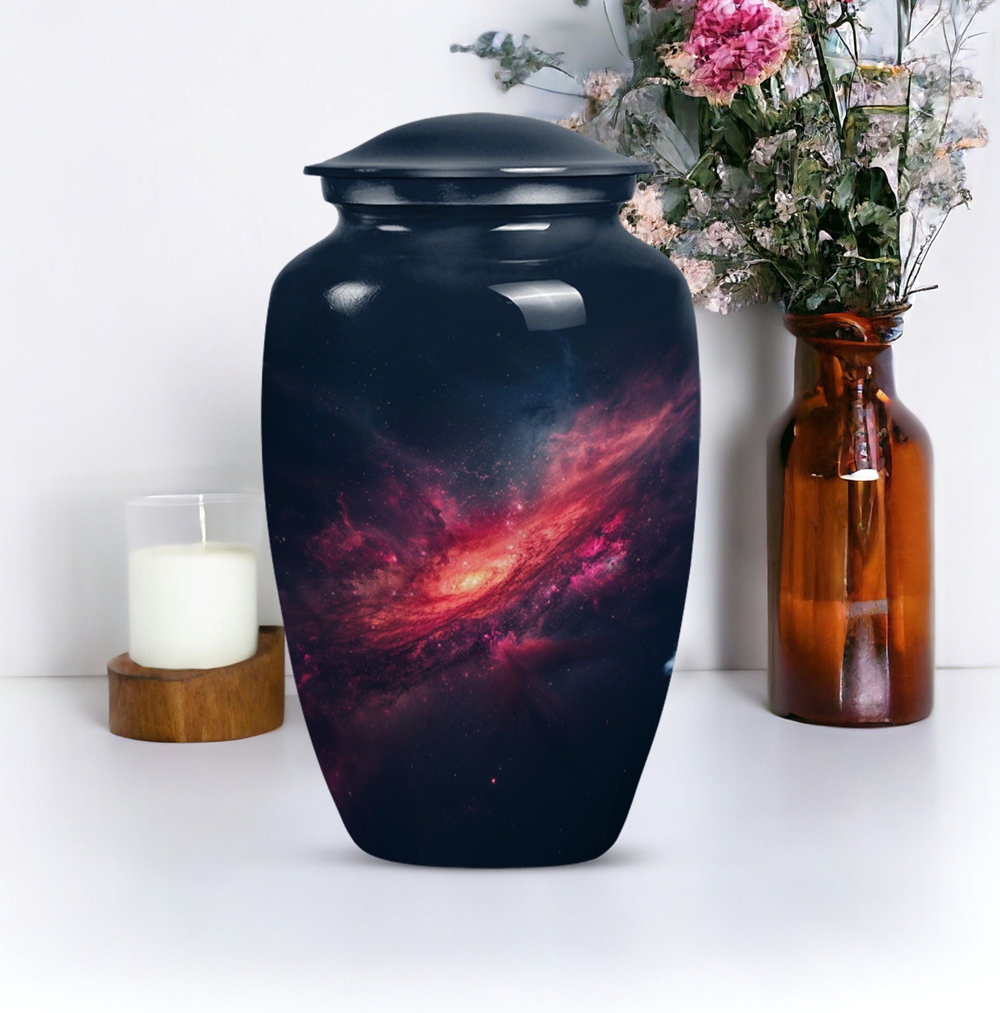 Journey into eternal peace and serenity with the 10-inch Galaxy Urn, a beautiful aluminum memorial urn designed to hold up to 200 cubic inches of cherished remains. This urn is more than a resting place; it's a testament to the beauty of life carried forwards. Delicately rendered from premium quality aluminium and weighted at a solace-inducing 3.3 pounds, the robust construction ensures long-lasting durability. Its 'Purple Meadow' theme provides a tranquil, calming presence, signifying rebirth and eternity. Contrasting the Hidebound, the urn comes encased in an included velvet pouch, making it a respectful and dignified vessel for your loved ones. This Large Urn offers customization options, providing the opportunity to personalize it with engraved names, enhancing its significance. Reflect in the memory of your loved one with this Timeless Stone urn, rendering a unique touch to your ceremonial needs. It effortlessly blends functionality and elegance, proving to be more than just funeral urns for human ashes; it's a monument of everlasting memories.