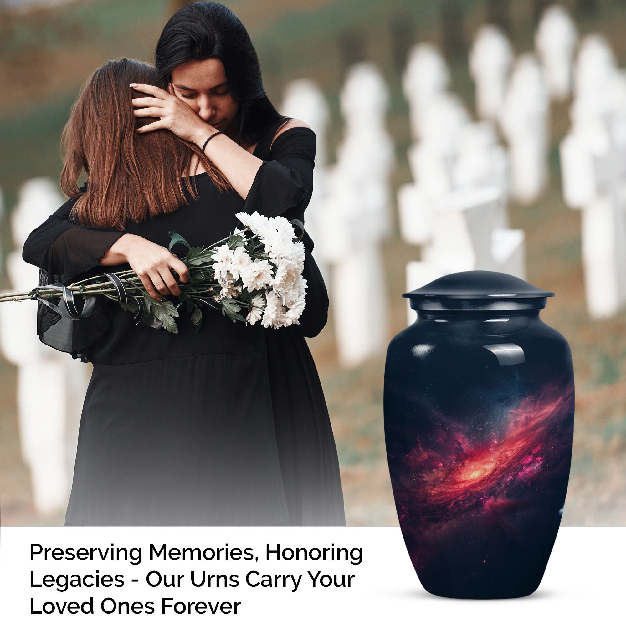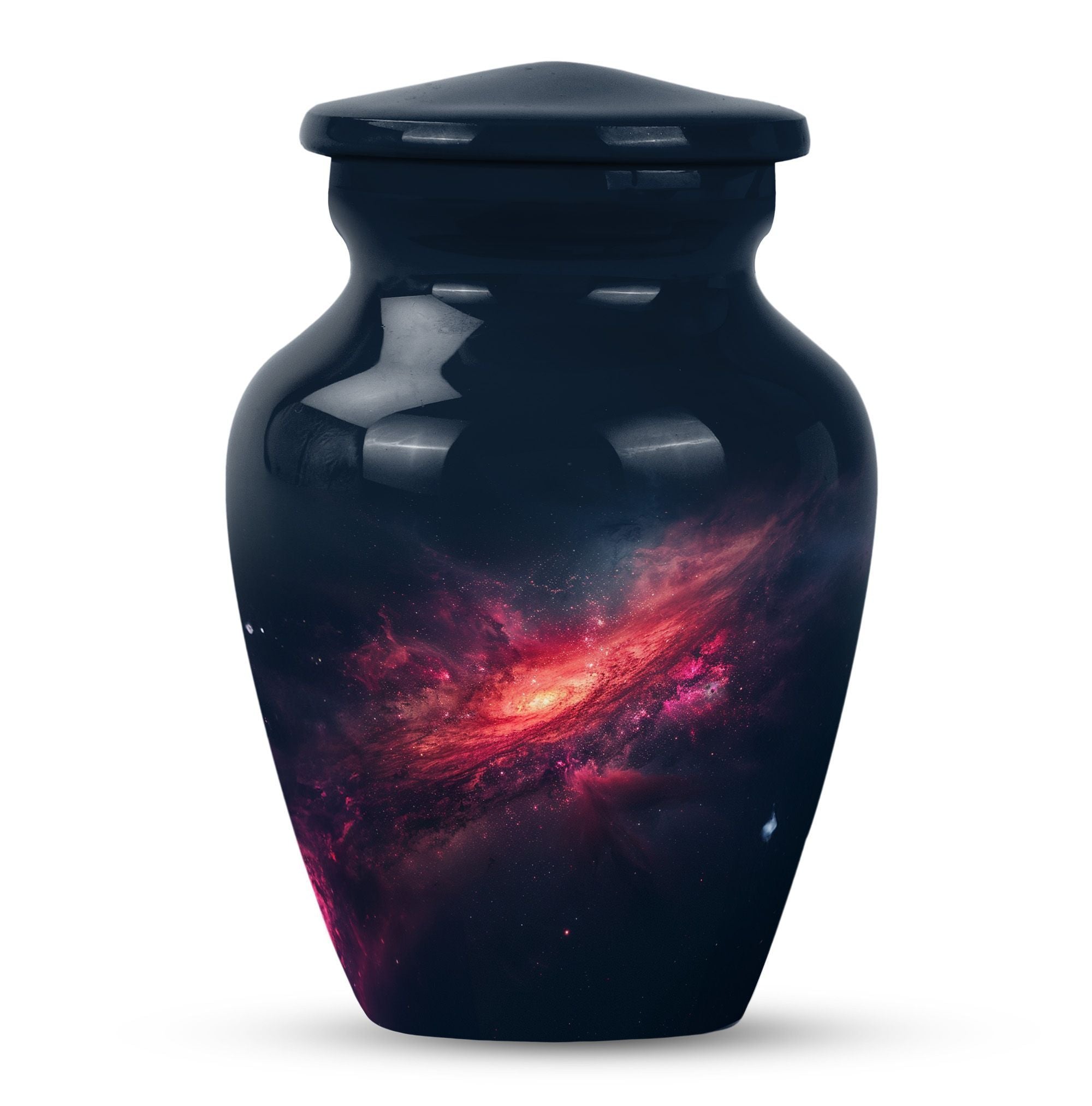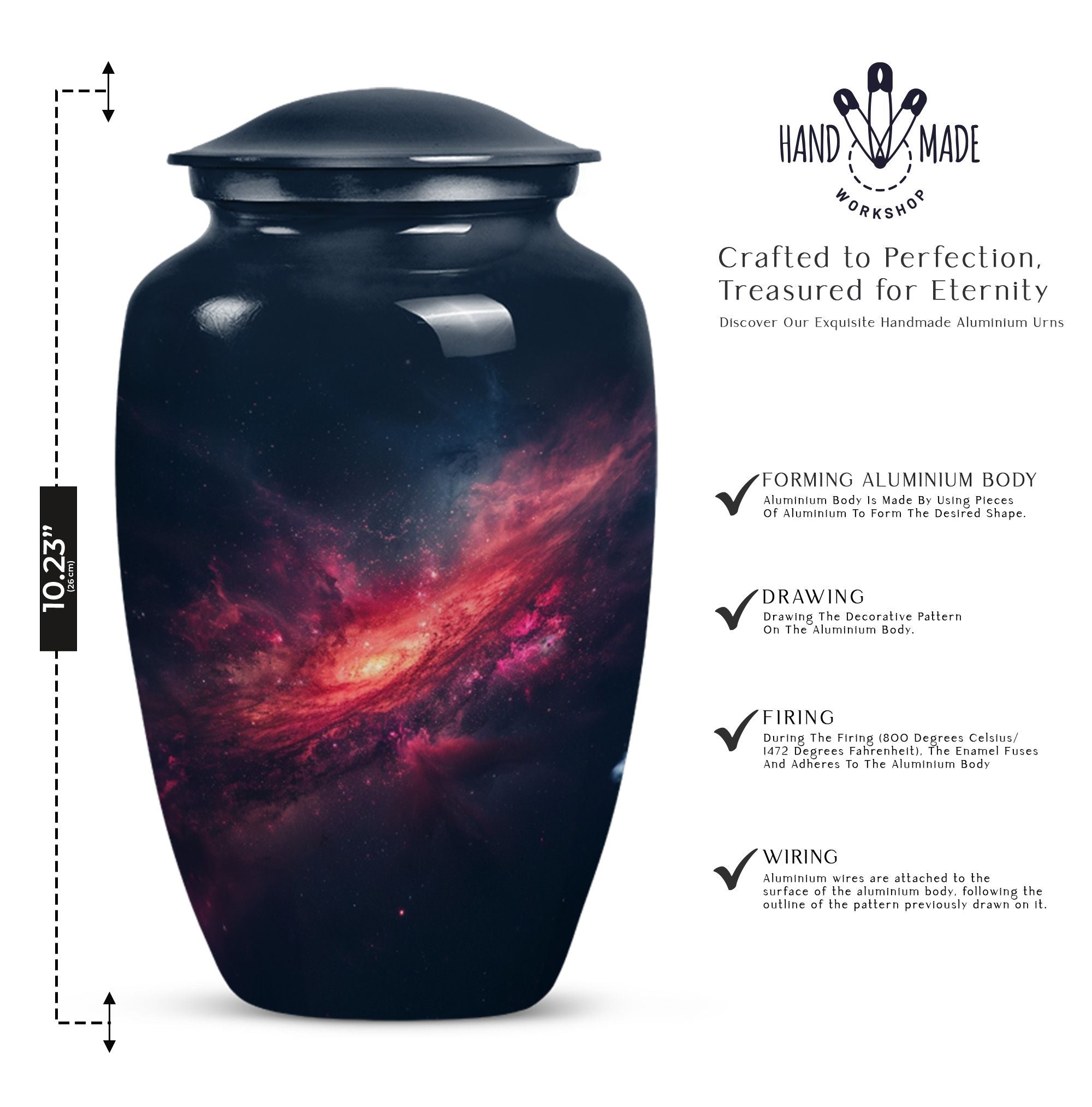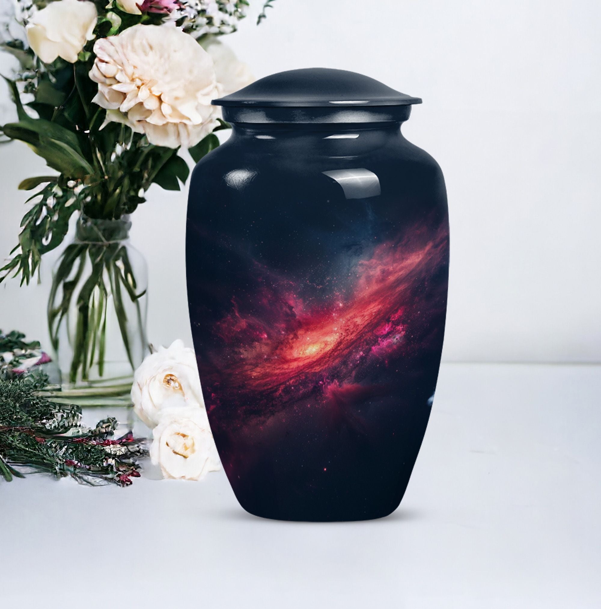 Journey into eternal peace and serenity with the 10-inch Galaxy Urn, a beautiful aluminum memorial urn designed to hold up to 200 cubic inches of cherished remains. This urn is more than a resting place; it's a testament to the beauty of life carried forwards. Delicately rendered from premium quality aluminium and weighted at a solace-inducing 3.3 pounds, the robust construction ensures long-lasting durability. Its 'Purple Meadow' theme provides a tranquil, calming presence, signifying rebirth and eternity. Contrasting the Hidebound, the urn comes encased in an included velvet pouch, making it a respectful and dignified vessel for your loved ones. This Large Urn offers customization options, providing the opportunity to personalize it with engraved names, enhancing its significance. Reflect in the memory of your loved one with this Timeless Stone urn, rendering a unique touch to your ceremonial needs. It effortlessly blends functionality and elegance, proving to be more than just funeral urns for human ashes; it's a monument of everlasting memories.