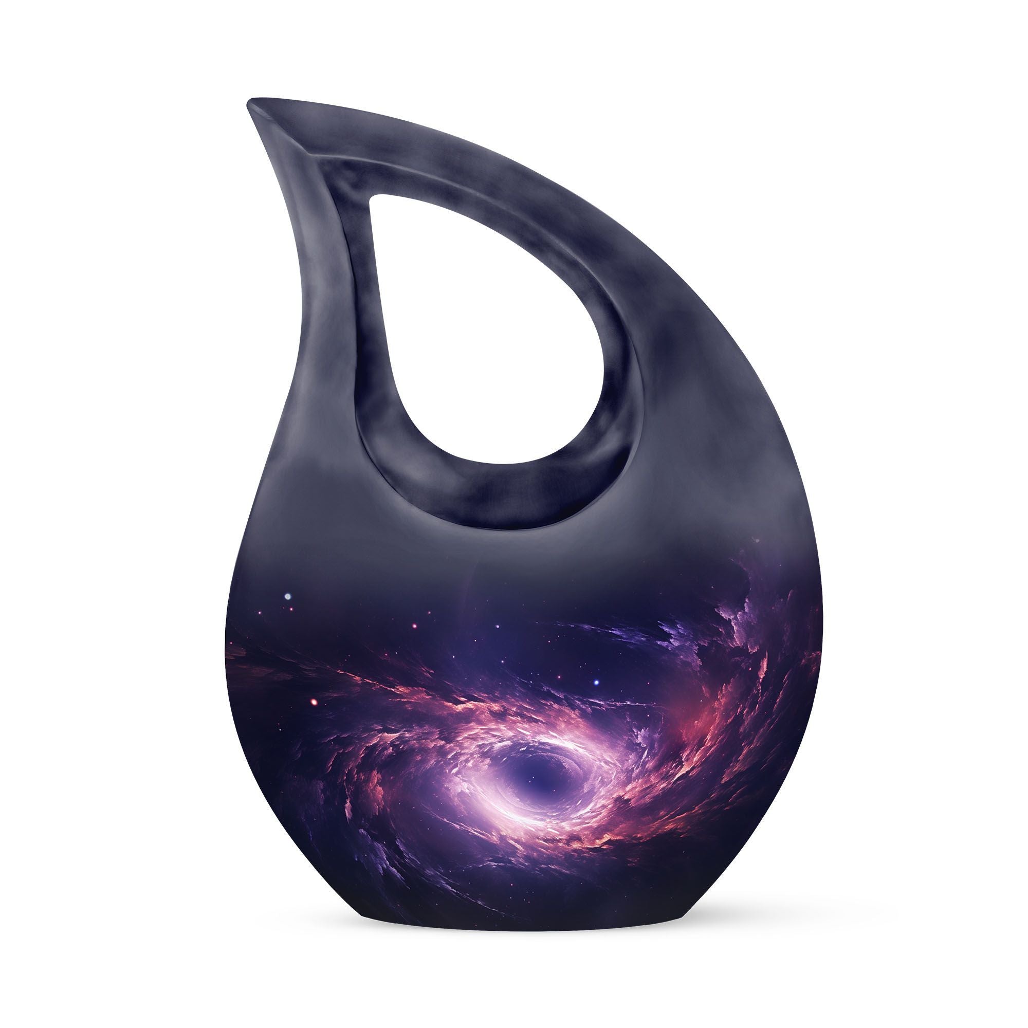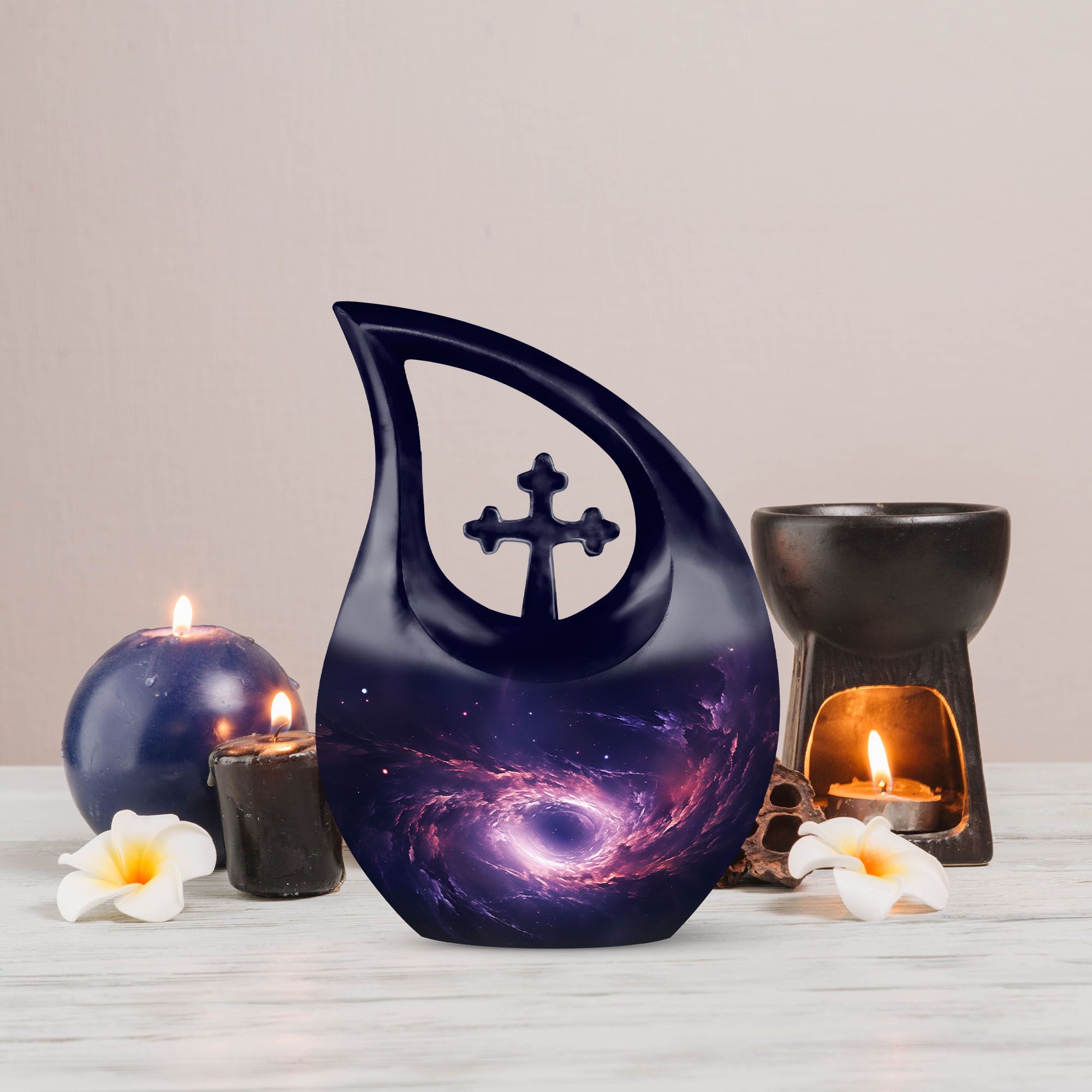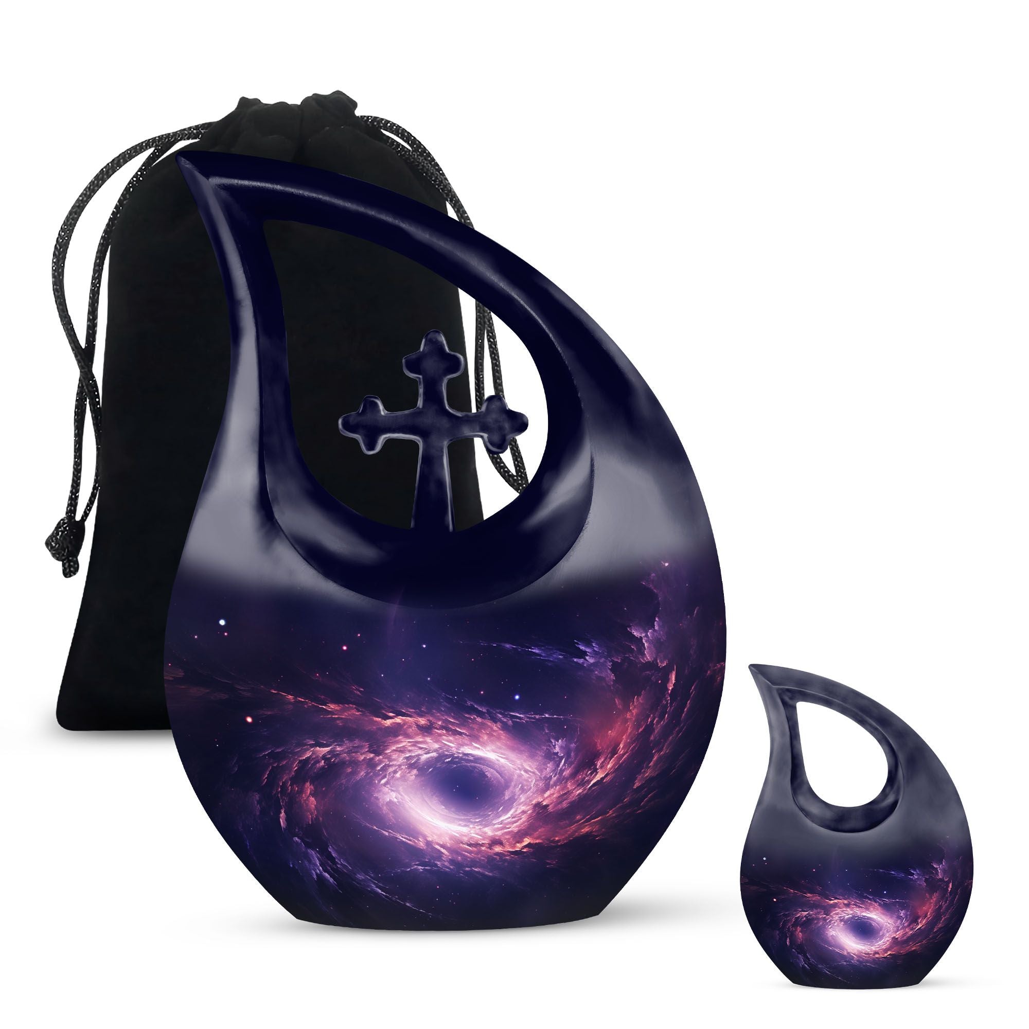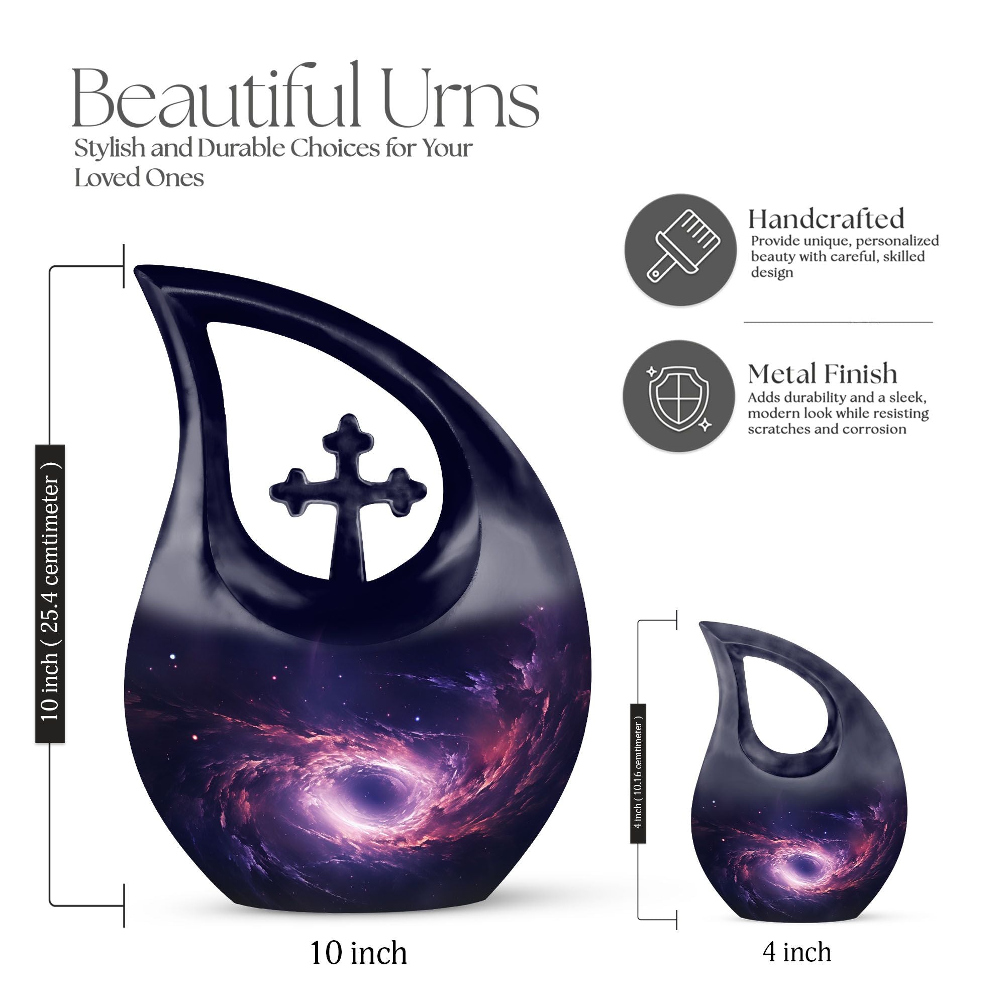 Honor the memory of your beloved one with the exquisite Galaxy Urn, fittingly sized at 10 inches and weighing 3.3 pounds. This large urn, delicately crafted from durable aluminium, presents a compelling Cross Drop design nestled within a celestial Galaxy theme, gracefully reflecting life's transcendental journey. It offers a generous capacity of 200 cubic inches, accommodating a significant portion or all ashes of adults or seniors. Our package also provides a velvet pouch, safeguarding the preserved remains of your loved one. For a more personal touch, take advantage of our customization feature, allowing the engraving of names, fostering a truly unique keepsake. While being large in dimension, it is still a practical option for those searching for smaller 'Mini Urns' or 'Mini Urns For Ashes'. Our Galaxy Urn is a magnificent blend of aesthetics and functionality, defining a new standard for 'Memorial Urns' and 'Cremation Keepsakes', providing solace during times of remembrance.