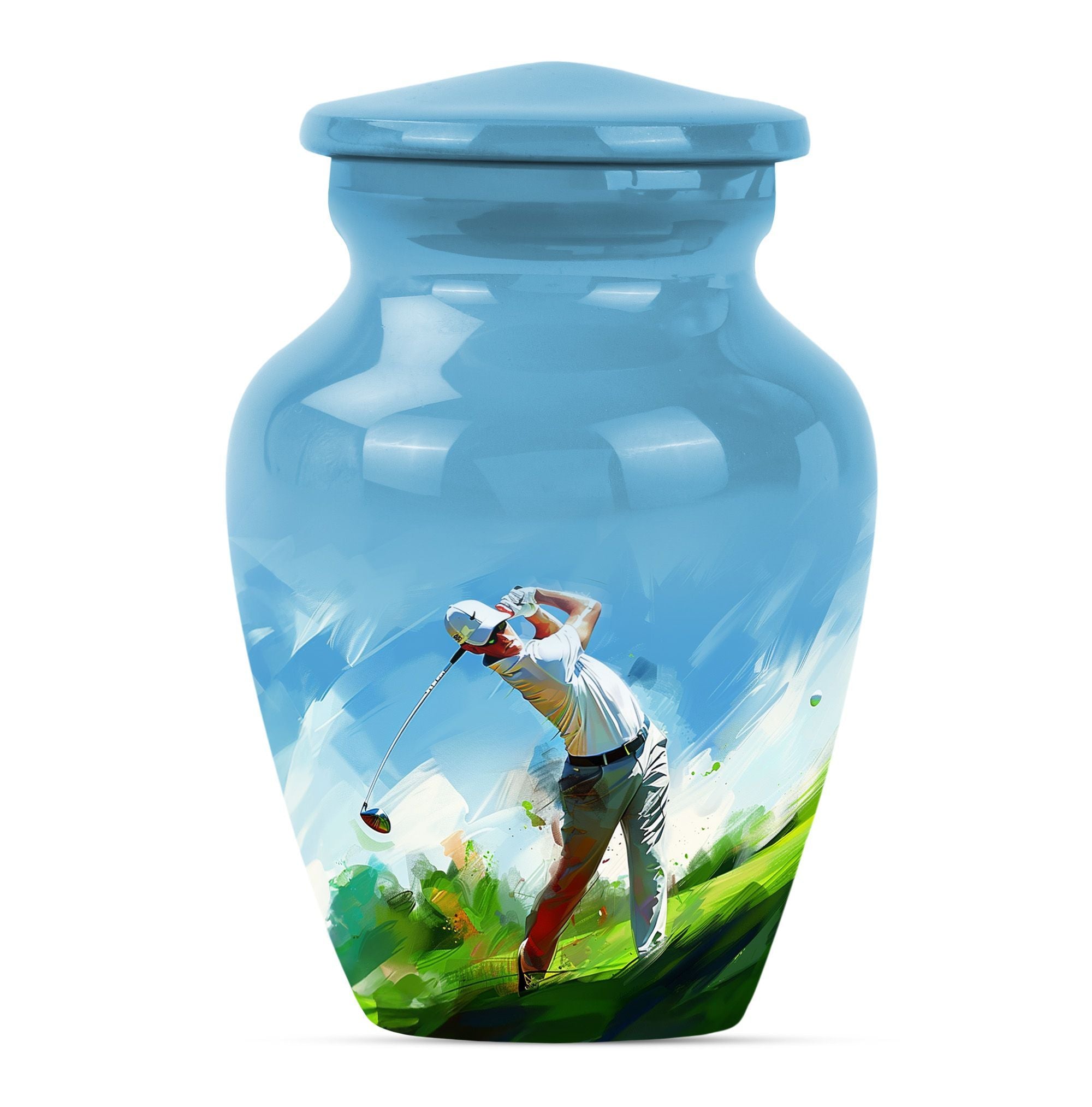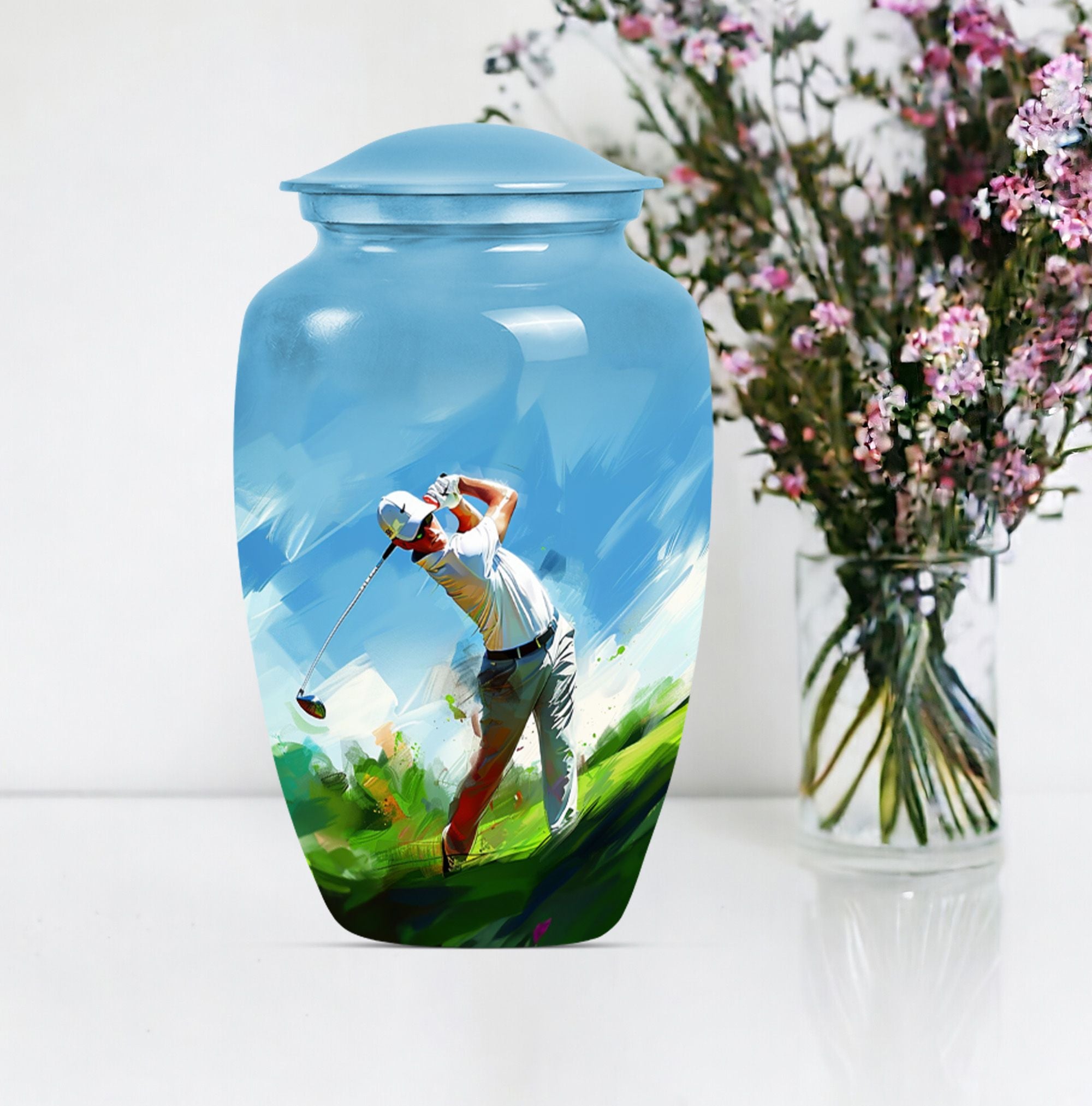 Crafted from durable aluminum with expert attention to detail, this cremation urn for ashes combines artistry and strength. Its golf-inspired design reflects both elegance and personal legacy, making it ideal as a centerpiece for memorial display. With a secure screw-top lid, it ensures ashes remain safely protected, while its size makes it a reliable choice among adult cremation urns. Whether chosen for display, memorial services, or as one of the burial urns for ground, it balances beauty with practicality.