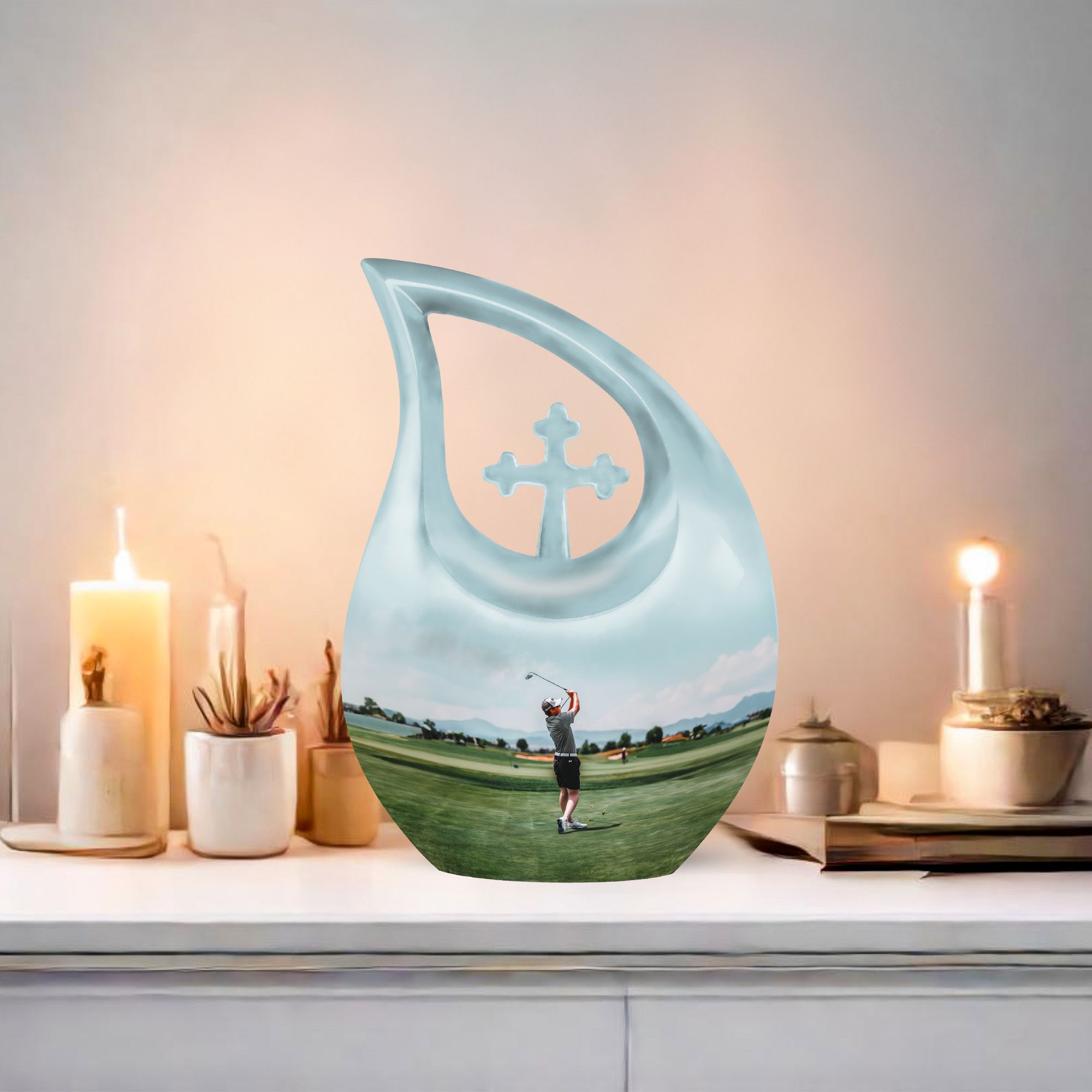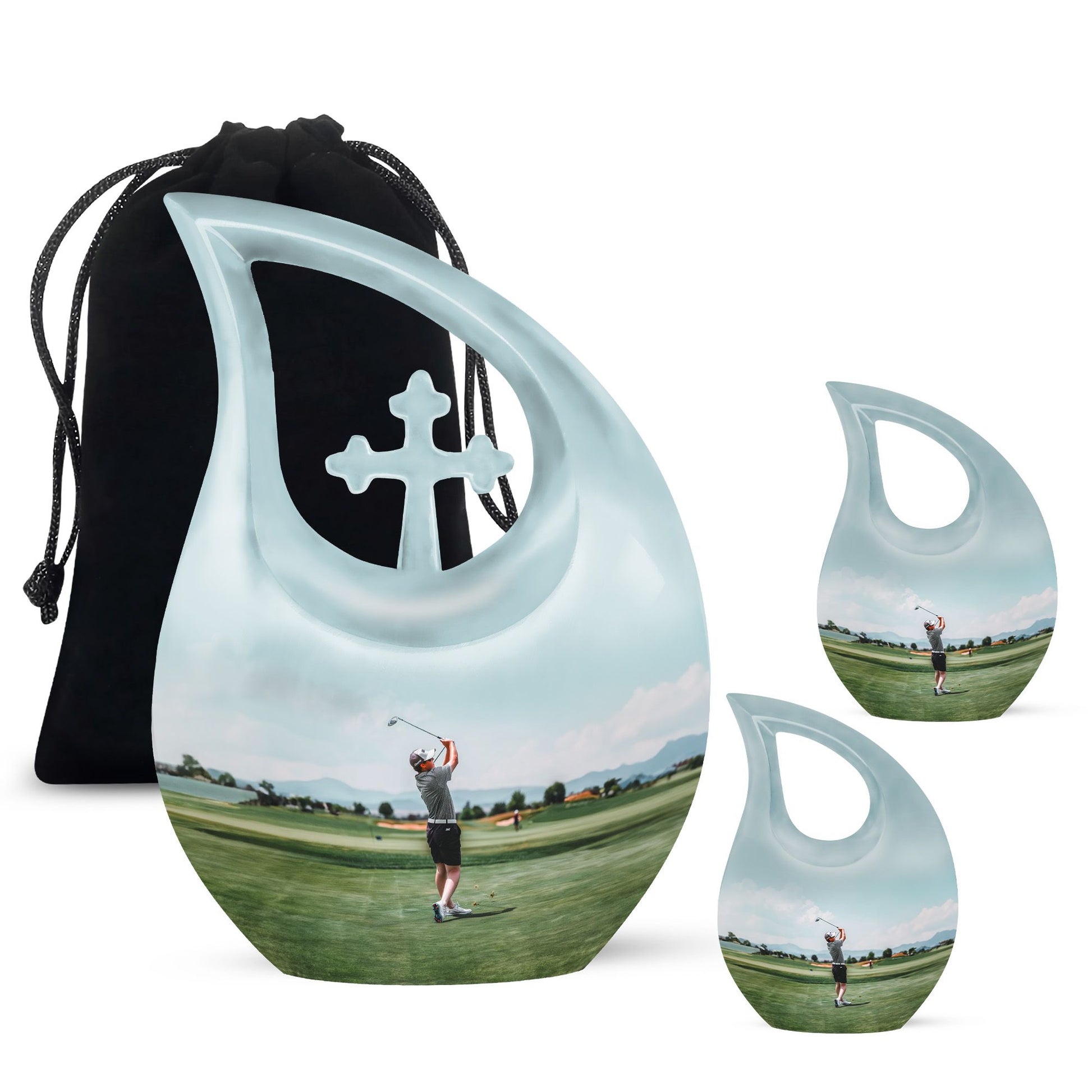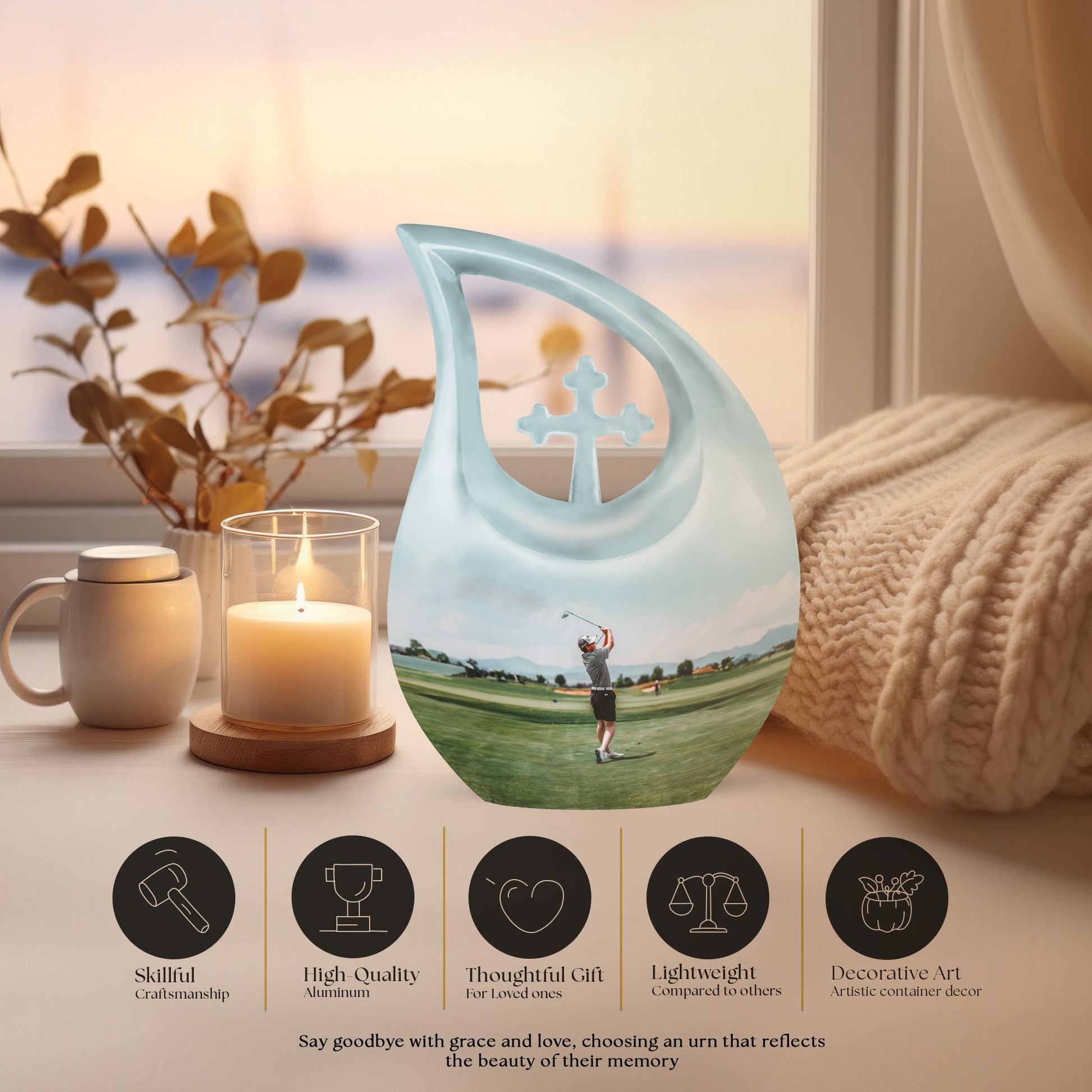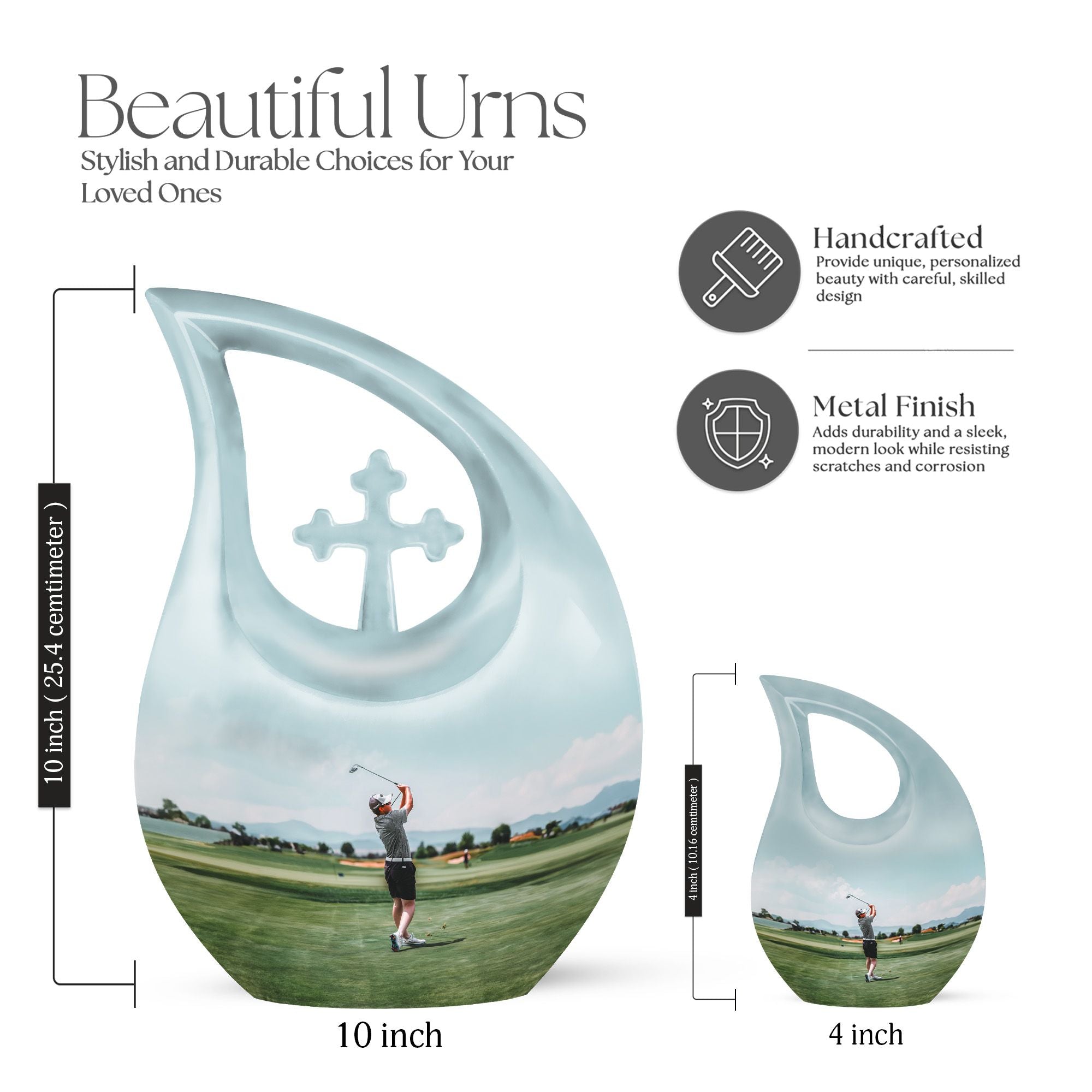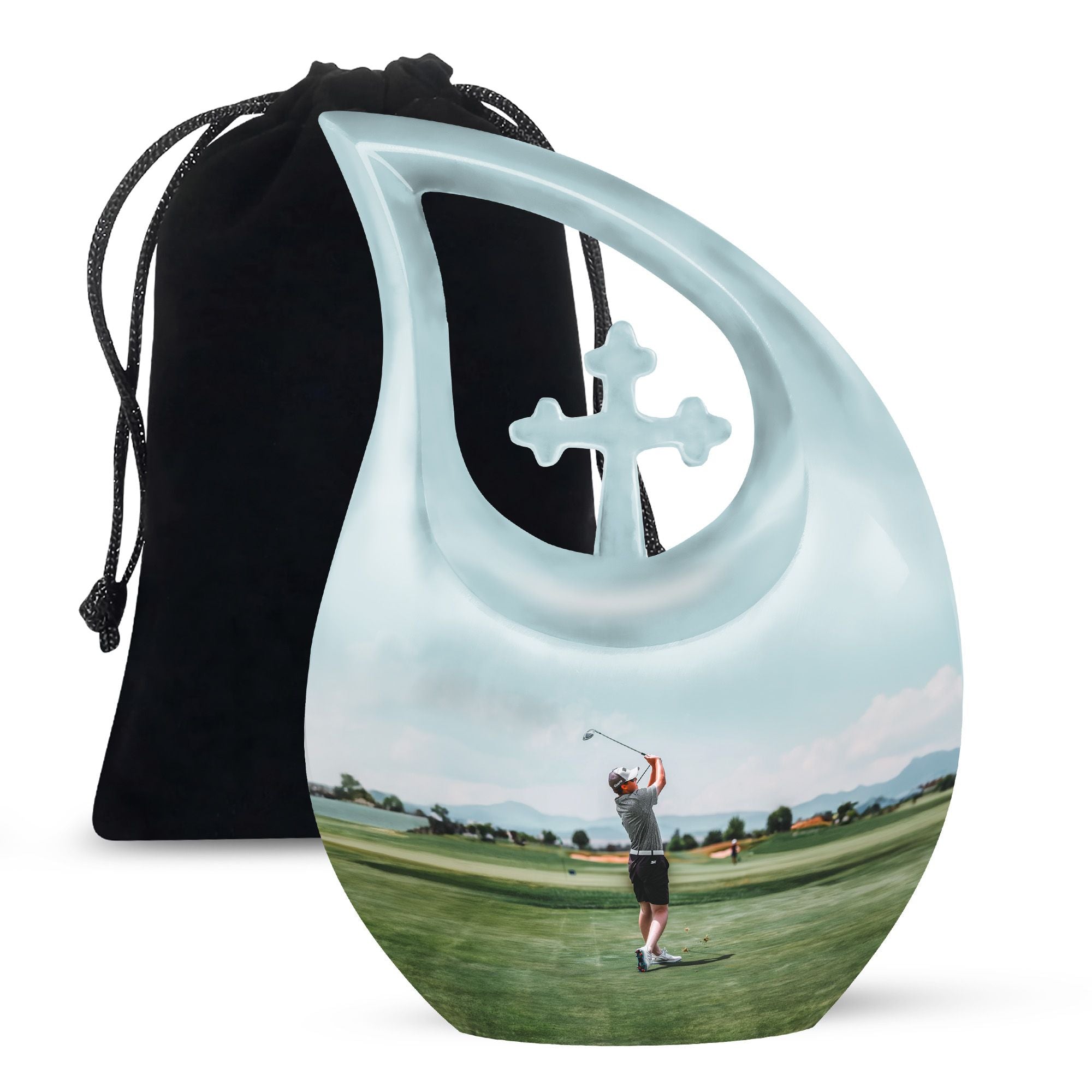 Introducing our highly-regarded Golf Urn, an exquisite double urn that gracefully pays homage to those who had an unending love for the game. Made from high-quality aluminium, this 3.3-pound urn strikes an imposing figure, standing at 10 inches in height with room to accommodate up to 200 cubic inches of cremated remains. Its unique 'Cross Drop' theme adds a distinct spiritual touch, vividly connecting golf with eternal repose. The urn comes with a velvet pouch that ensures respectful containment of ashes. A standout feature to cherish is its customization. Personalize the urn with the names of your loved ones, in a silent expression of longing and remembrance. Our Golf Urn brings together the beauty of urns for memorial ceremonies with golf passion, a harmonious fusion that replicates the jubilance of one's journey on the golf course. So, opt for this large urn which is not just a mourning accessory, but a testament to a loved one's fond memories. Not to be mistaken for outdoor urns, its beautiful elegance is best showcased indoors.