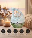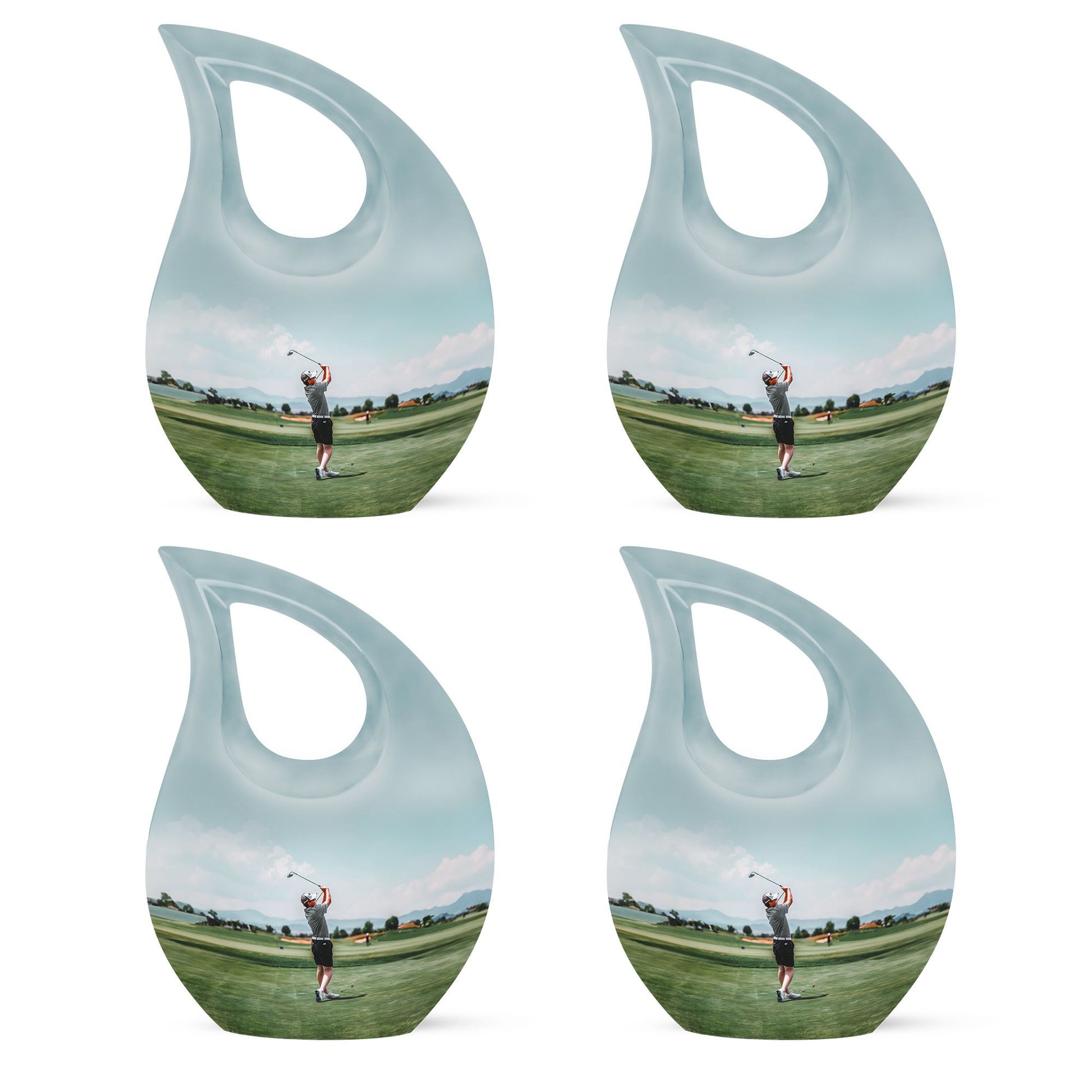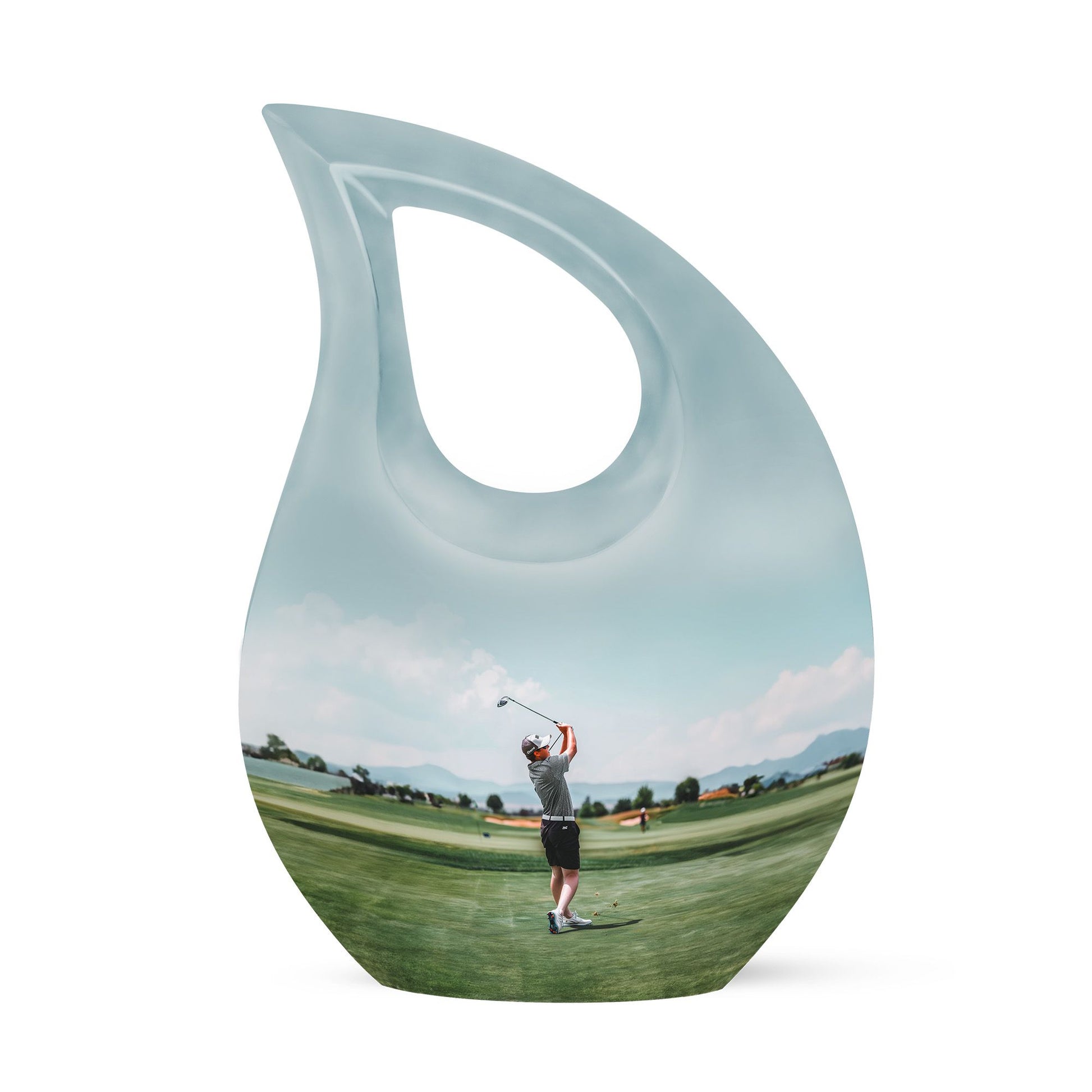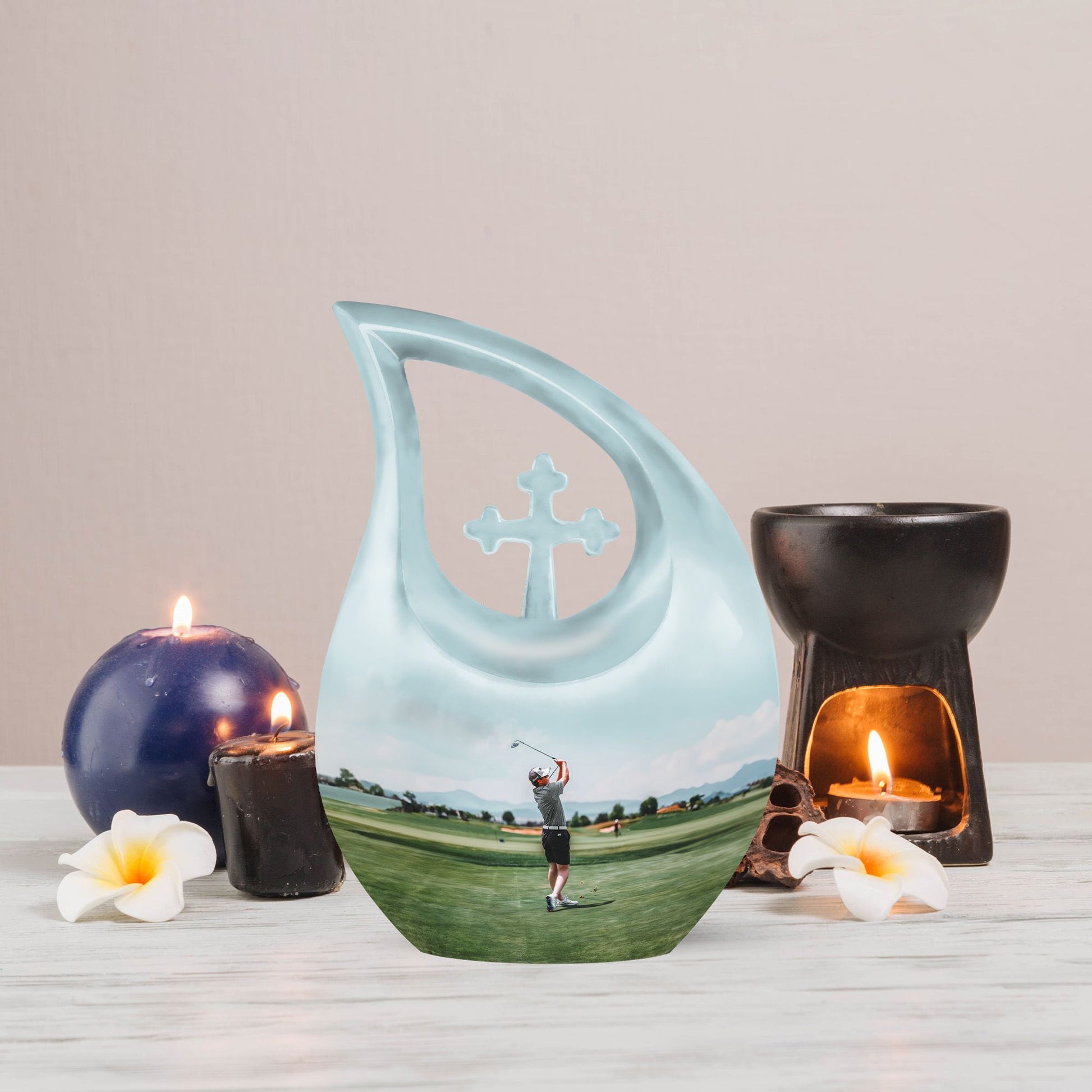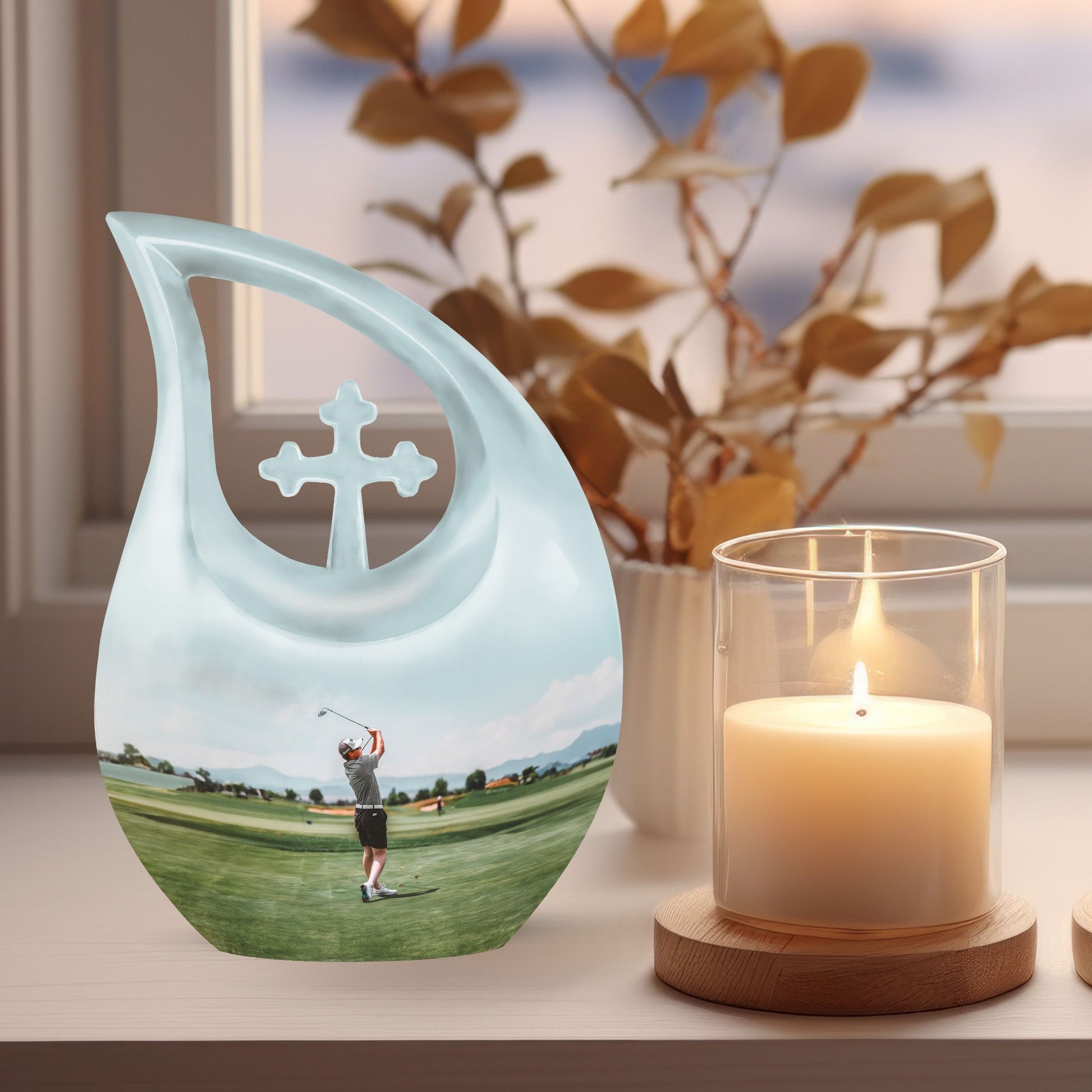 Introducing our highly-regarded Golf Urn, an exquisite double urn that gracefully pays homage to those who had an unending love for the game. Made from high-quality aluminium, this 3.3-pound urn strikes an imposing figure, standing at 10 inches in height with room to accommodate up to 200 cubic inches of cremated remains. Its unique 'Cross Drop' theme adds a distinct spiritual touch, vividly connecting golf with eternal repose. The urn comes with a velvet pouch that ensures respectful containment of ashes. A standout feature to cherish is its customization. Personalize the urn with the names of your loved ones, in a silent expression of longing and remembrance. Our Golf Urn brings together the beauty of urns for memorial ceremonies with golf passion, a harmonious fusion that replicates the jubilance of one's journey on the golf course. So, opt for this large urn which is not just a mourning accessory, but a testament to a loved one's fond memories. Not to be mistaken for outdoor urns, its beautiful elegance is best showcased indoors.